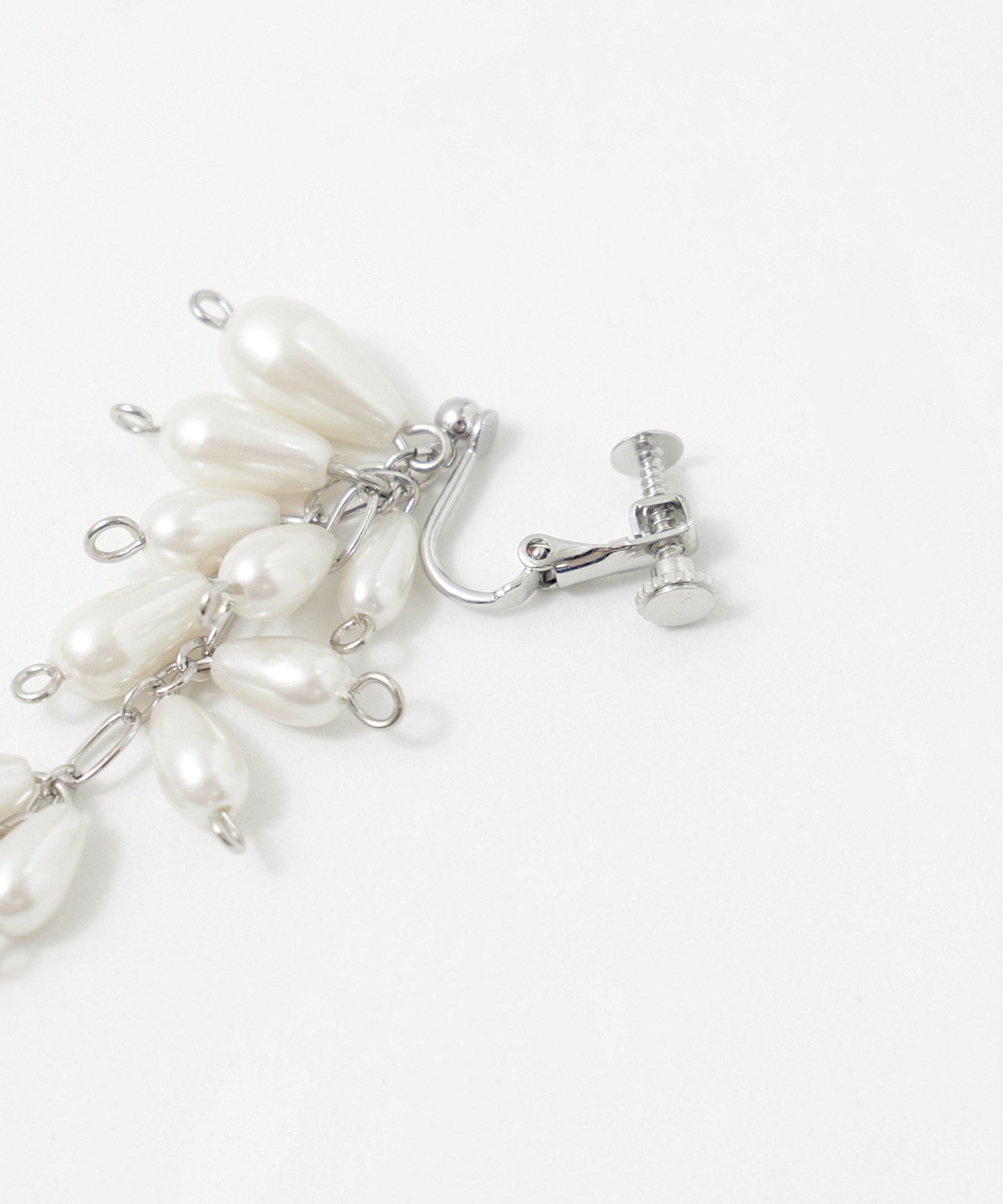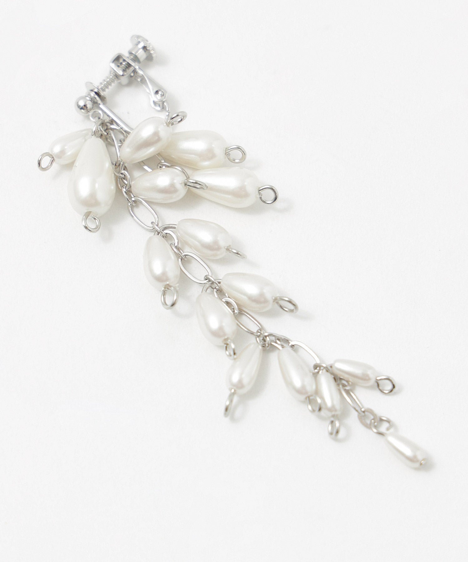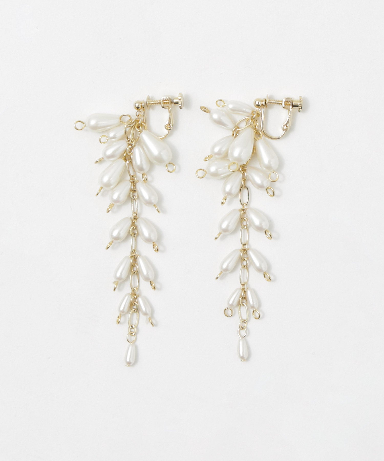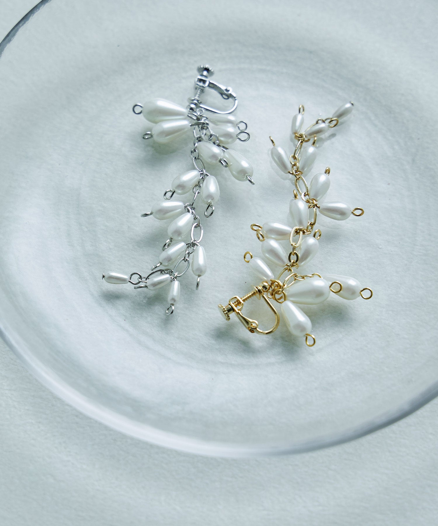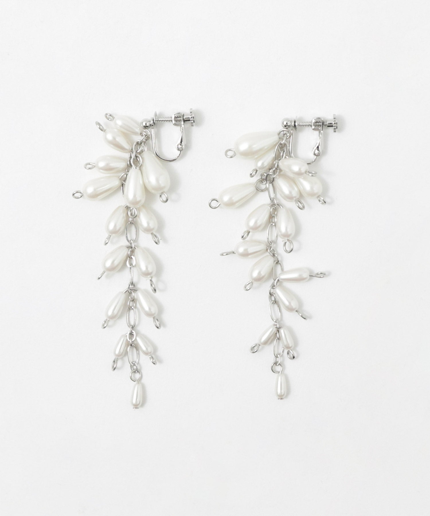 大きさの異なるパールがゆらゆら揺れるロングイヤリング。