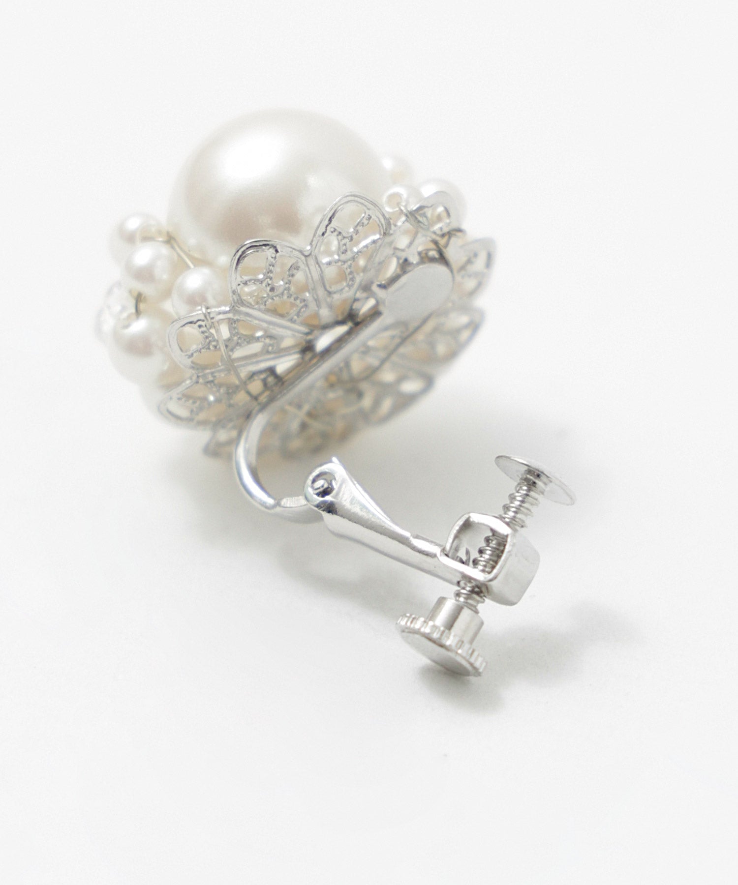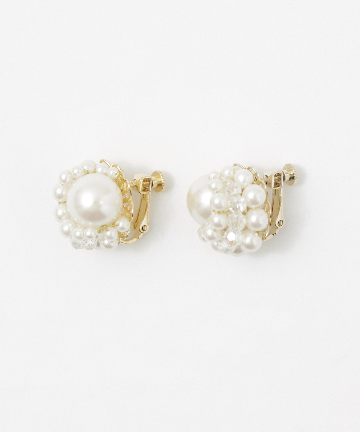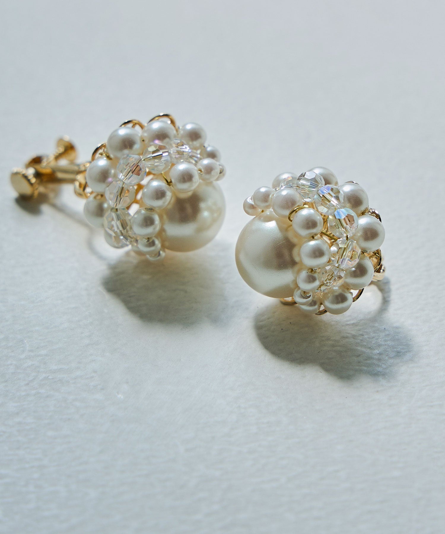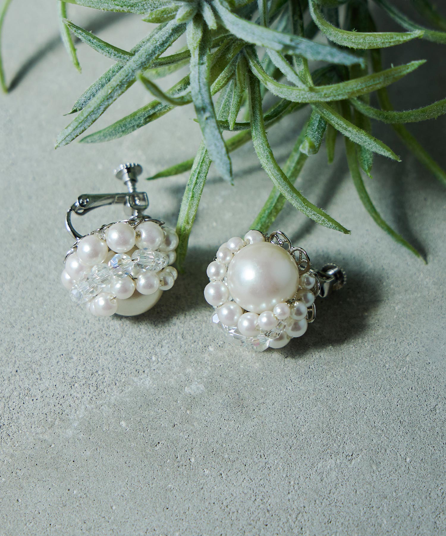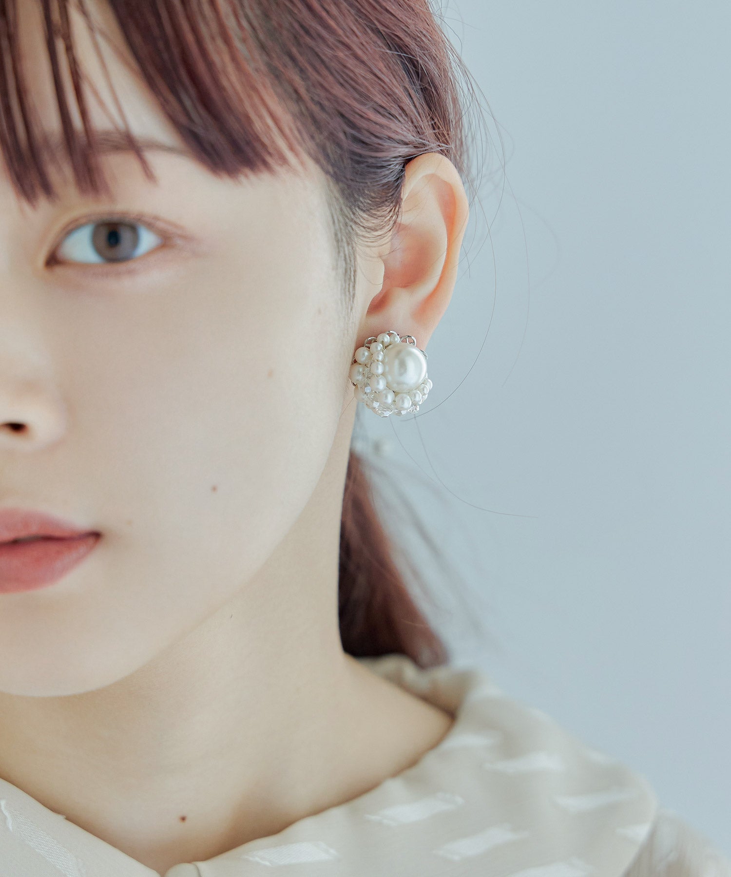 存在感のある大粒パールを小粒パールとビーズで囲ったイヤリング。