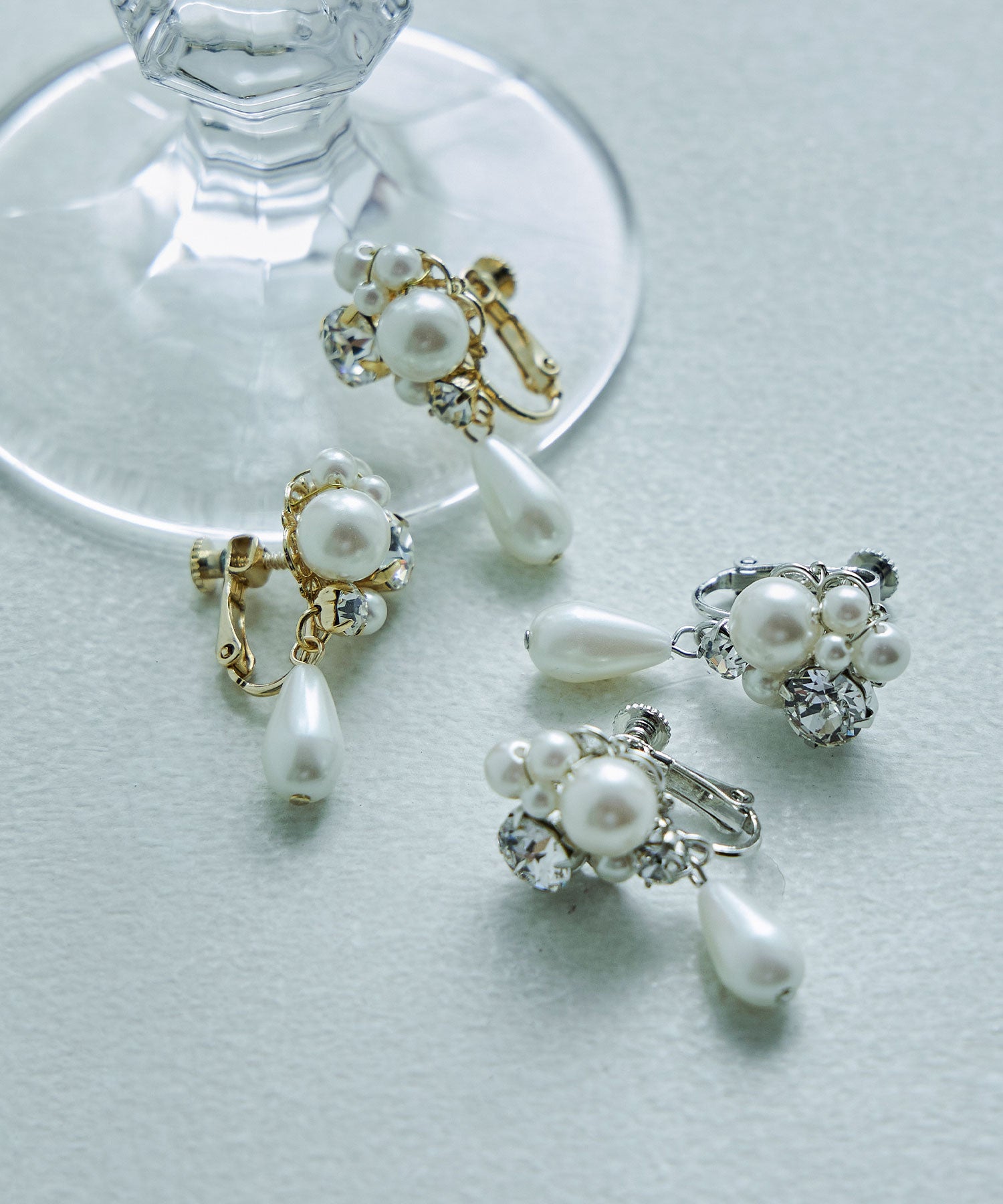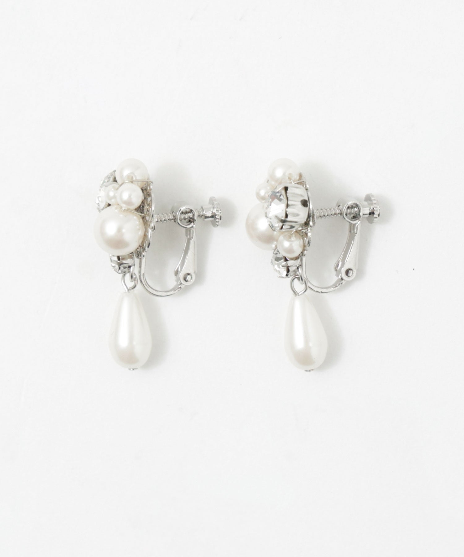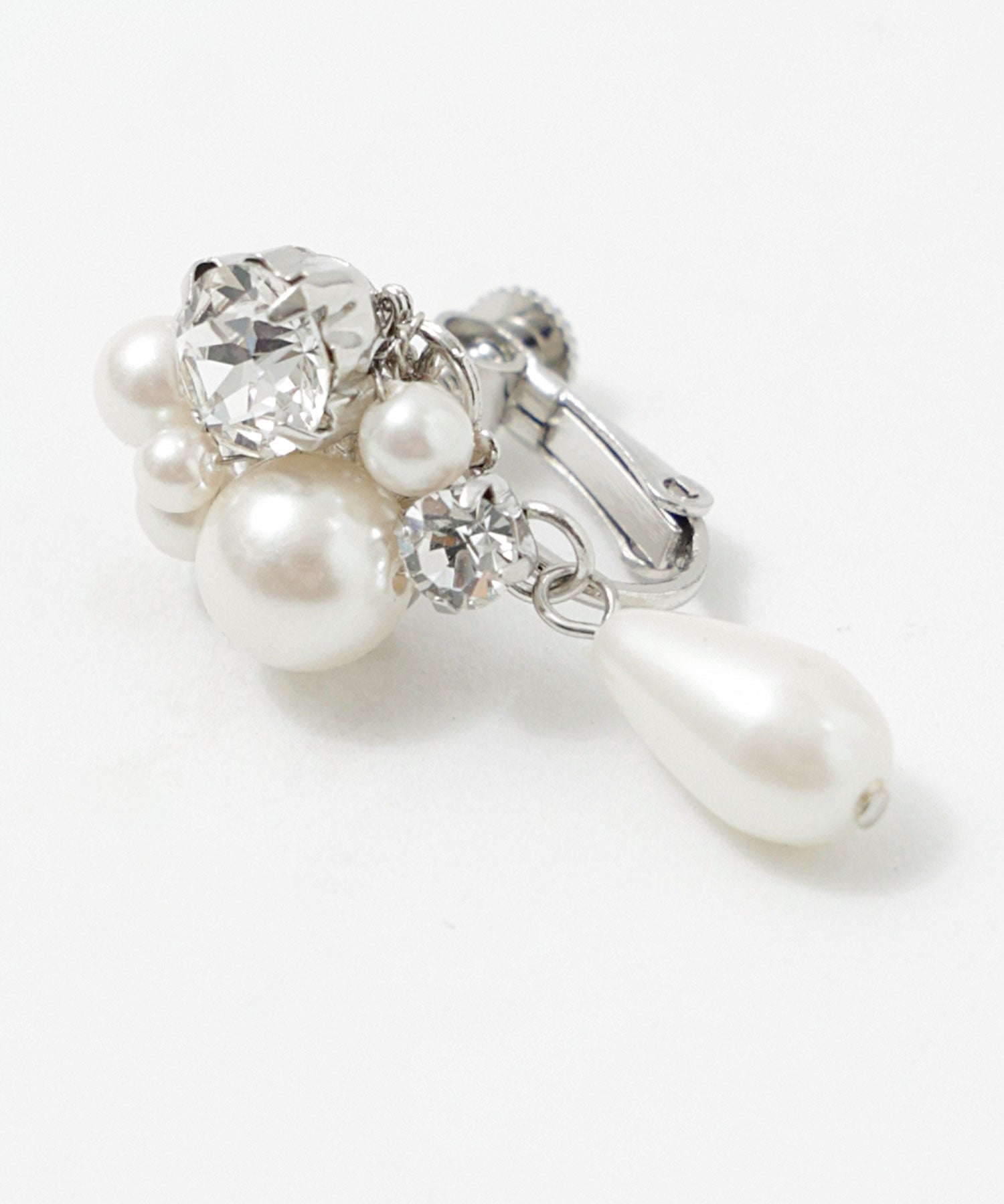 輝くビジューと大きさの異なるパールが美しいイヤリング。