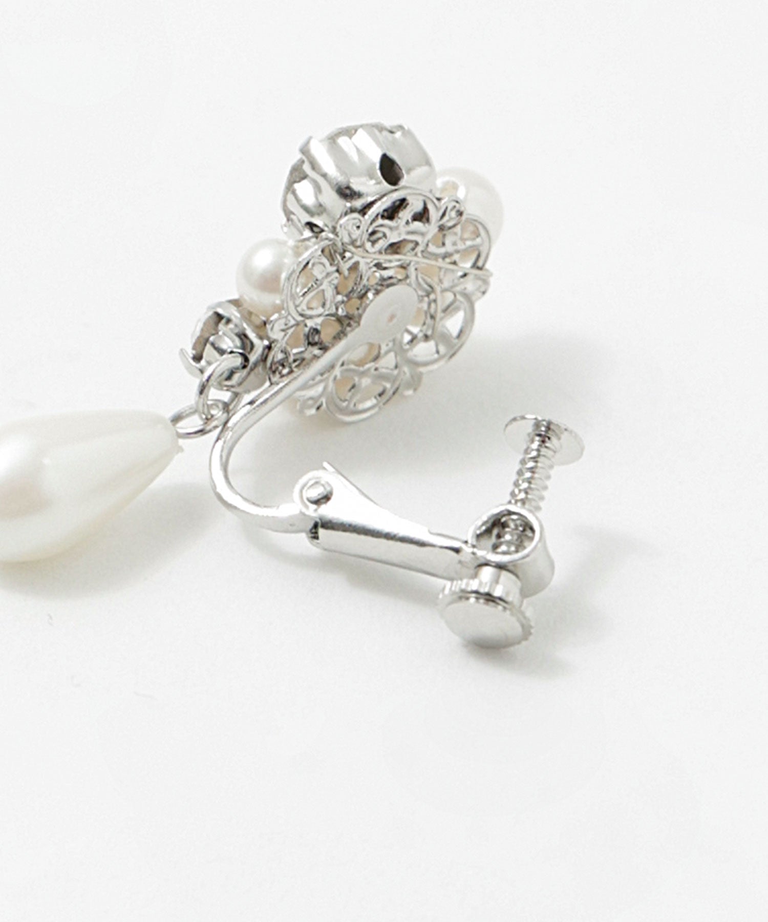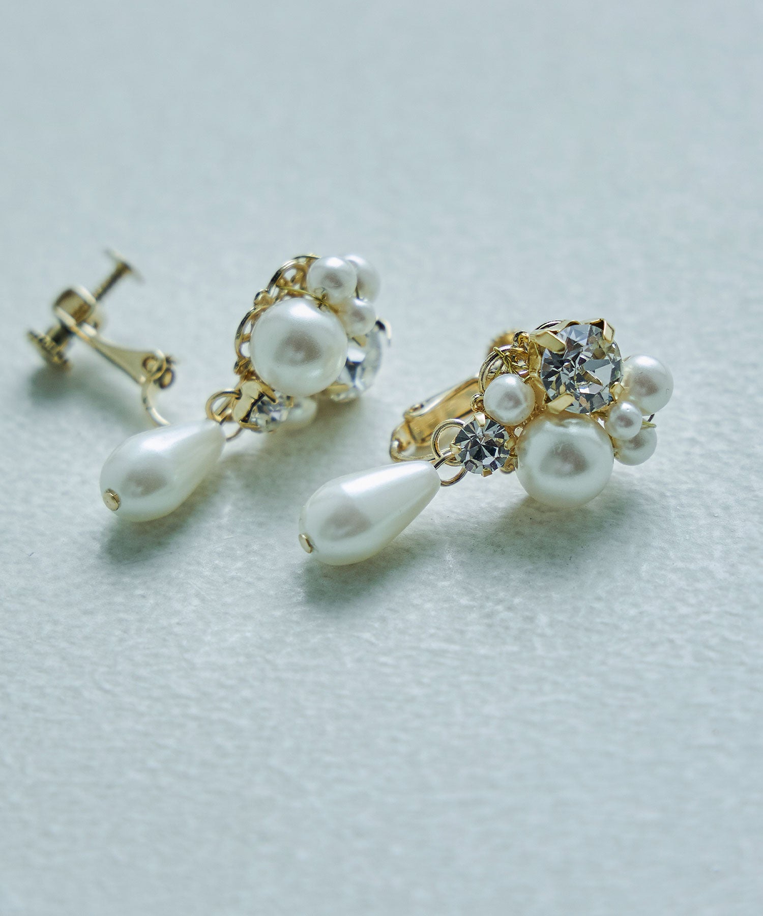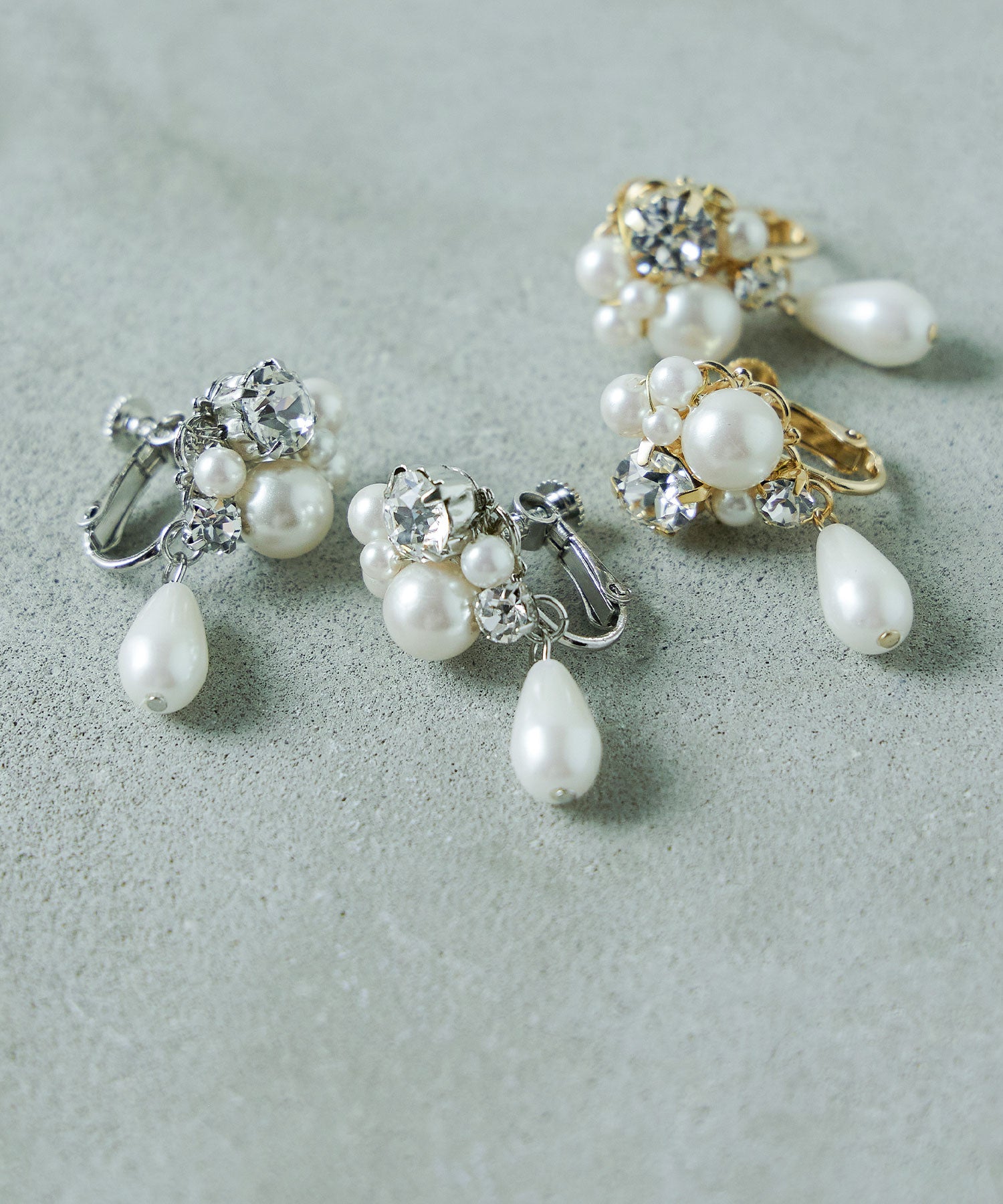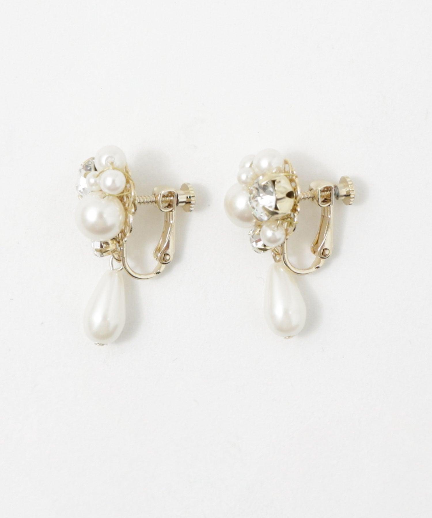 輝くビジューと大きさの異なるパールが美しいイヤリング。