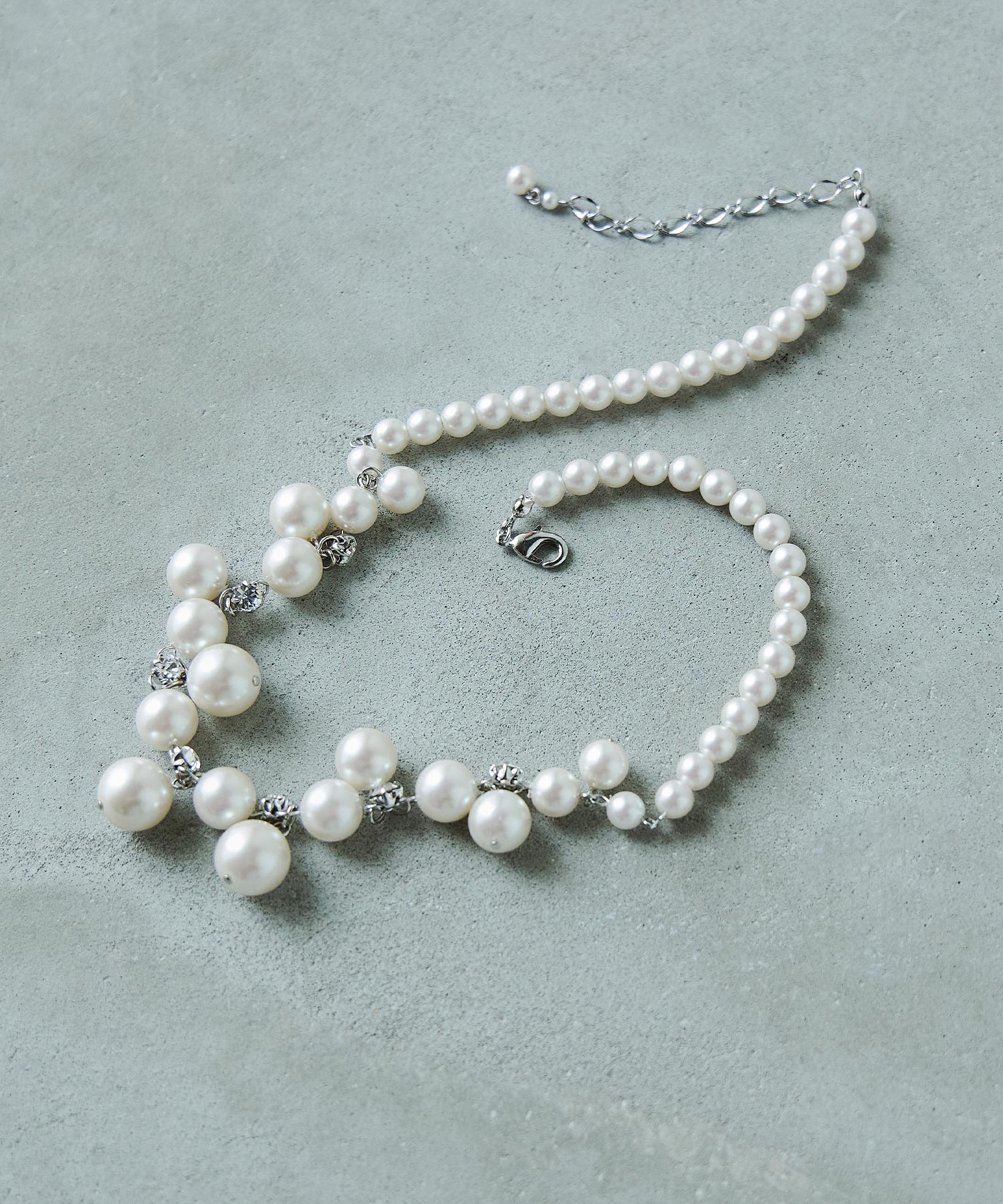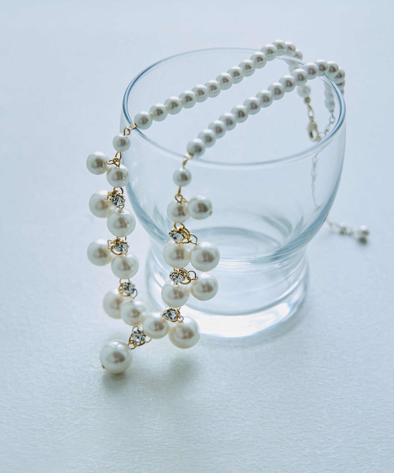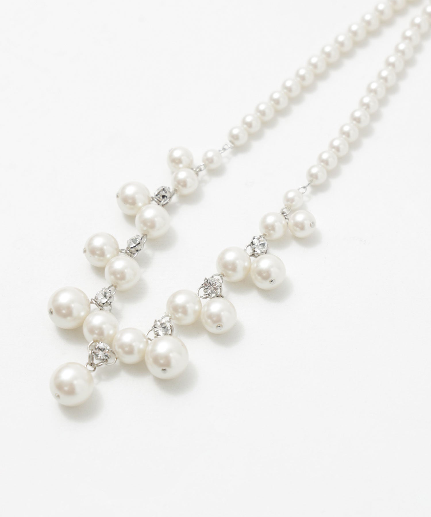 パールの間には煌めくビジューを連ねたネックレス。