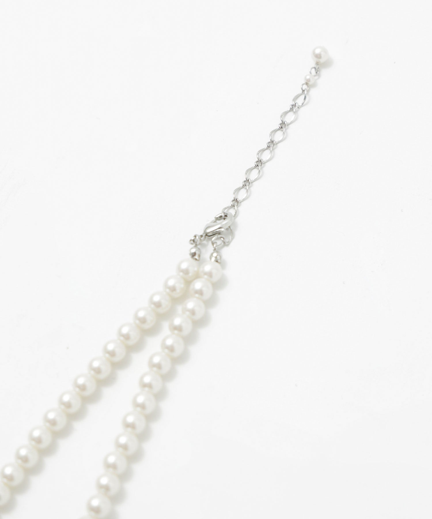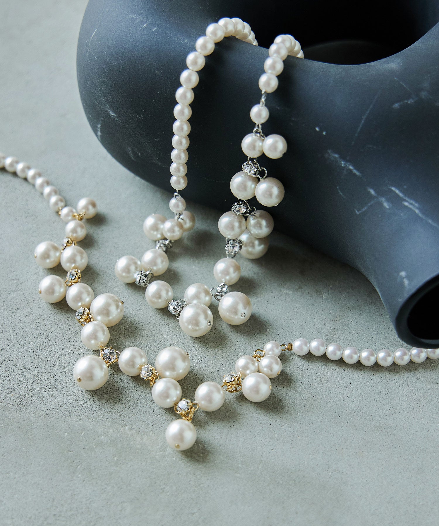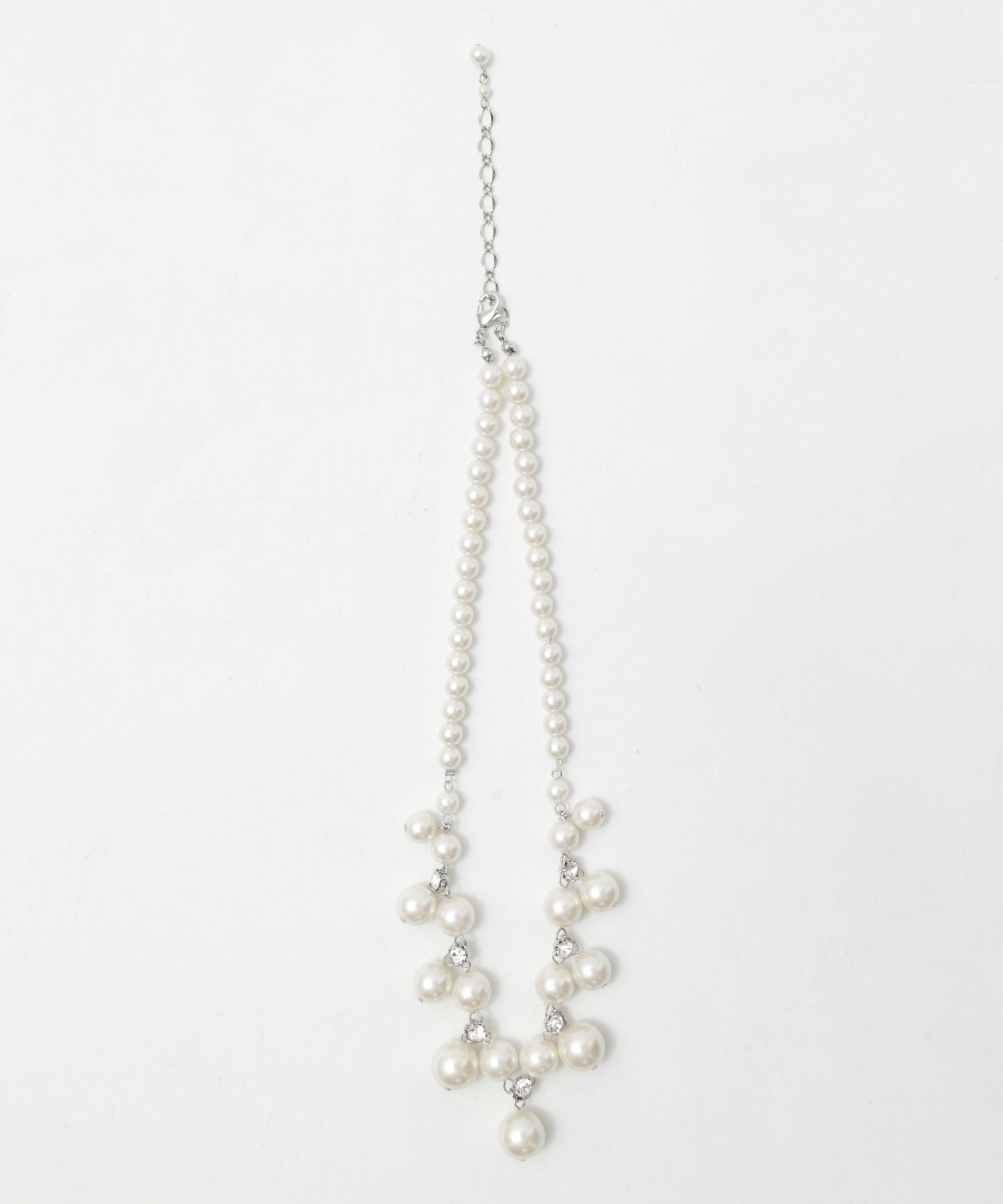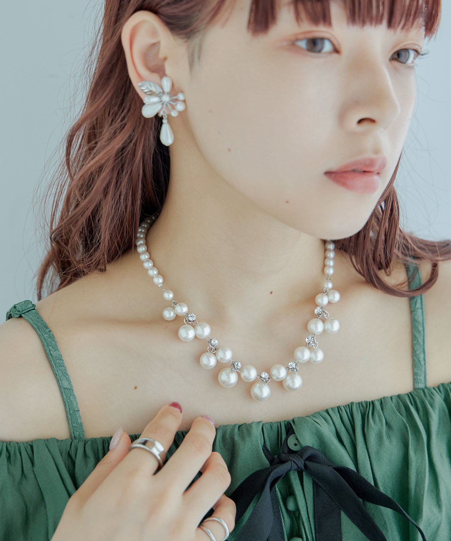 パールの間には煌めくビジューを連ねたネックレス。