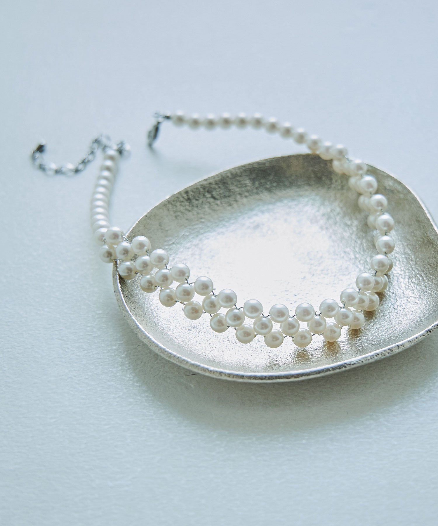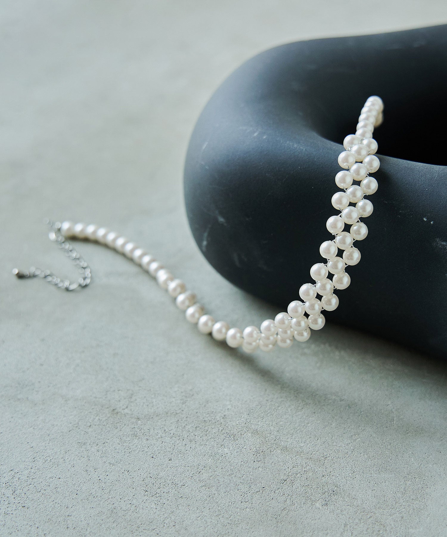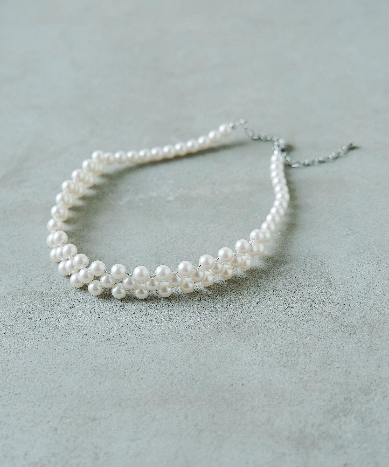 首元に綺麗に沿うパールの編み込みチョーカーネックレス。