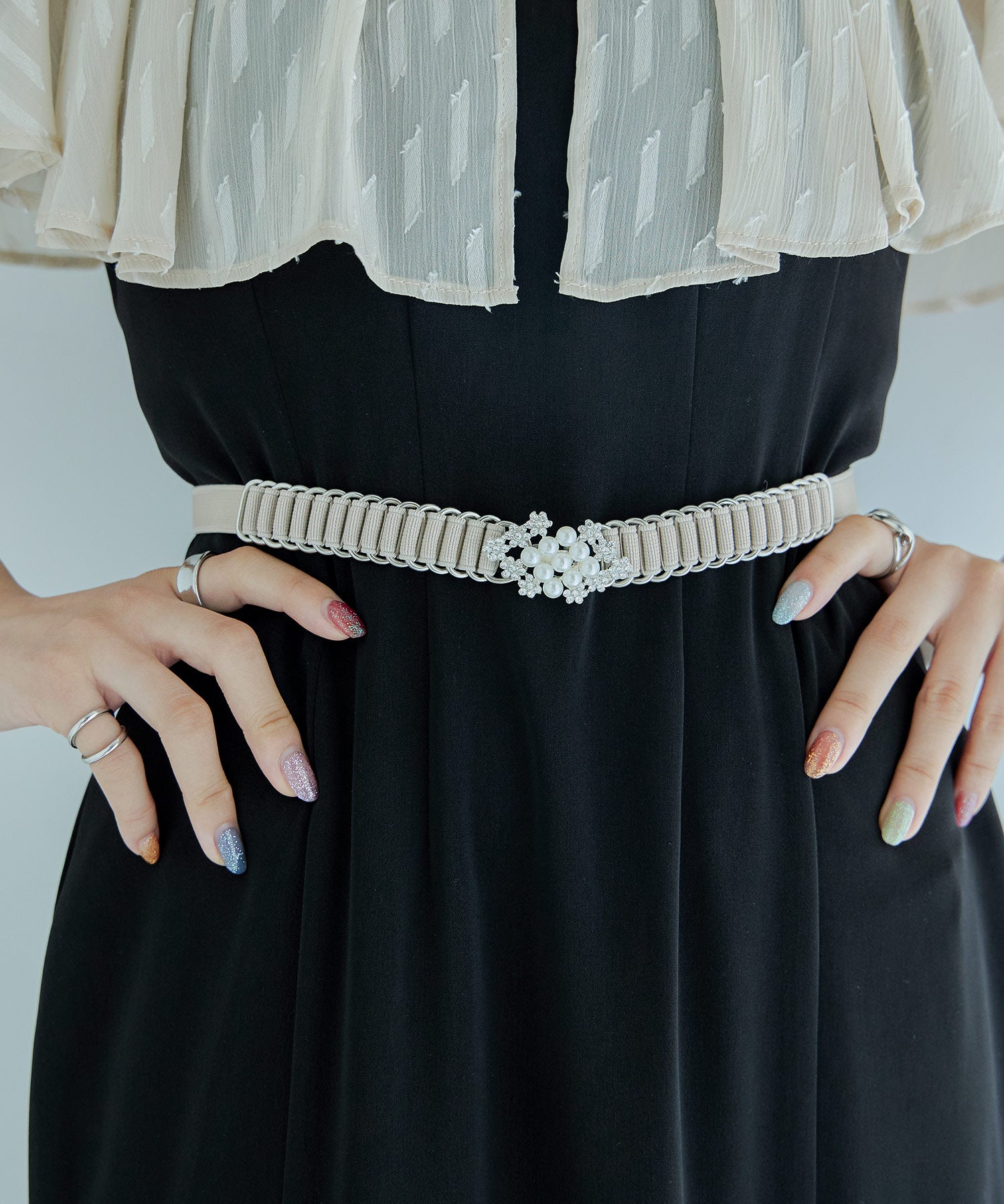 Rname パール ビジュー ベルト ゴムベルト ドレス レディース ゴム 細ベルト ウエストマーク パーティードレス 結婚式 二次会 披露宴 謝恩会 卒業式 入学式 同窓会 セレモニー オケージョン お呼ばれ パーティー ブラック ベージュ シルバー