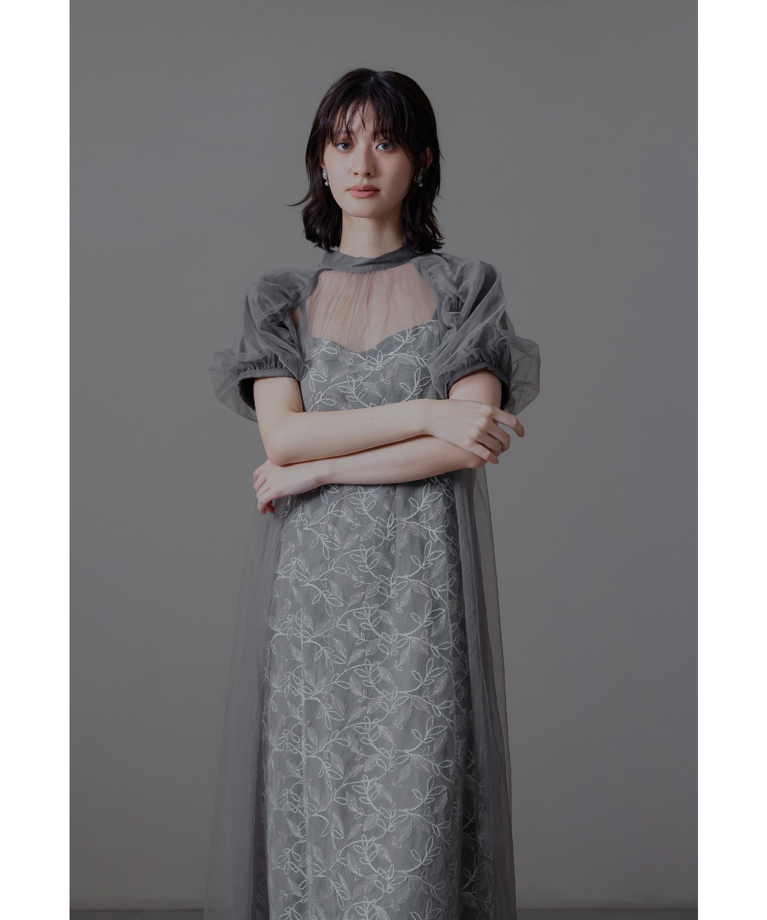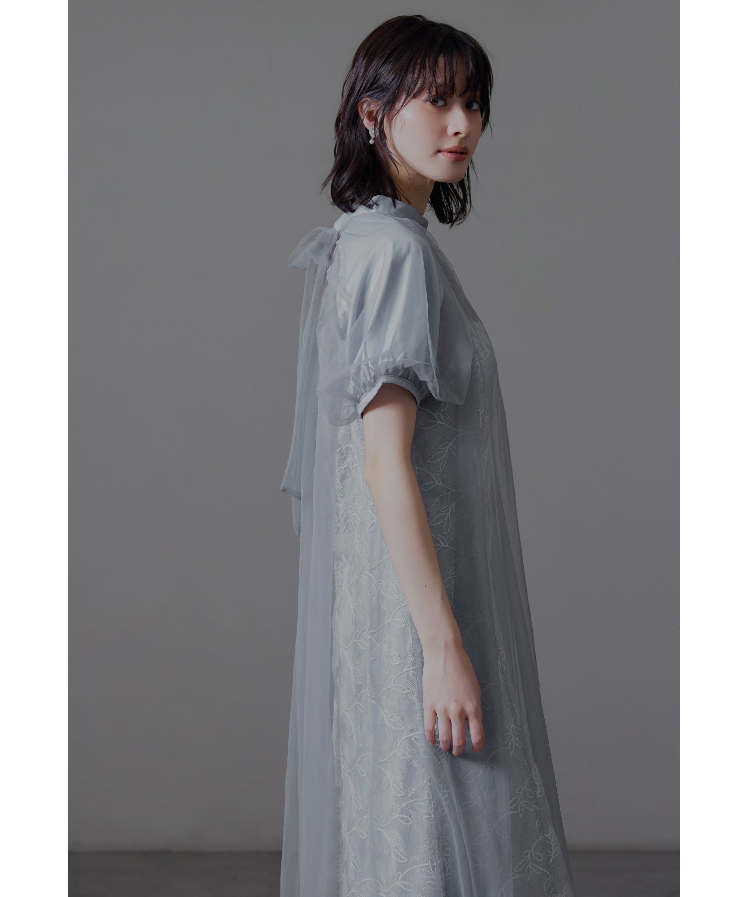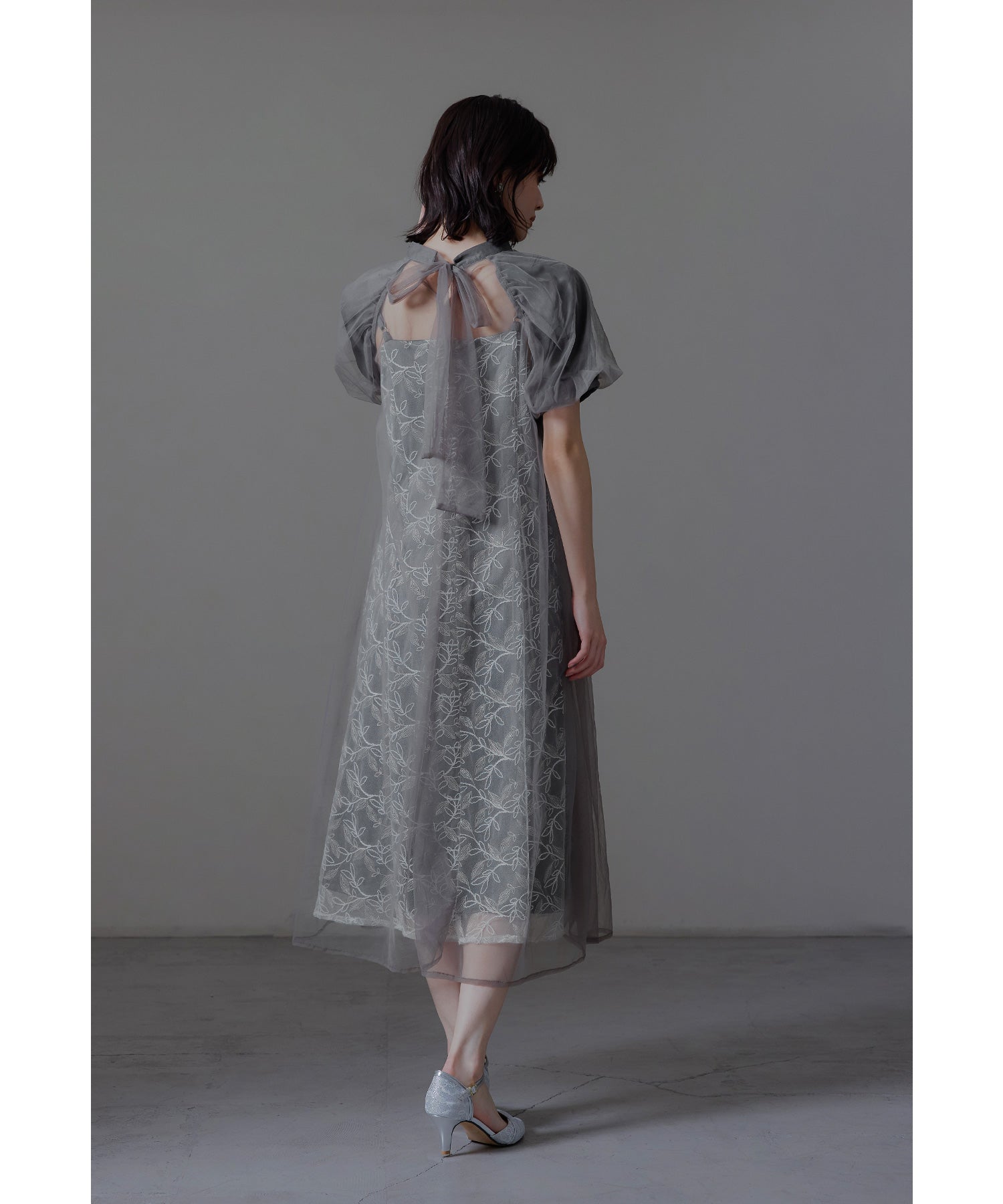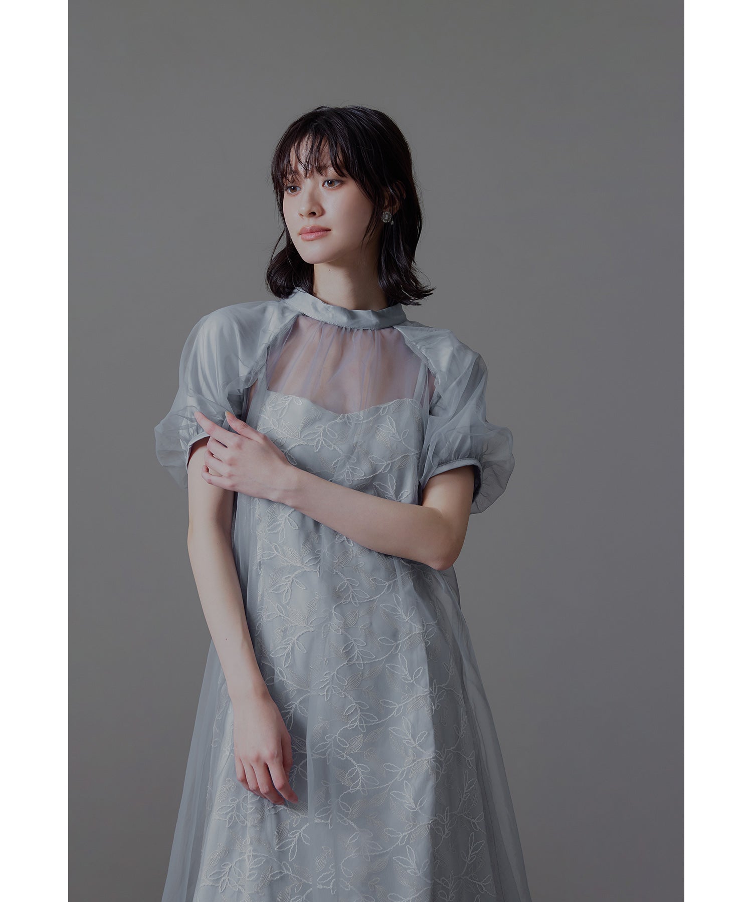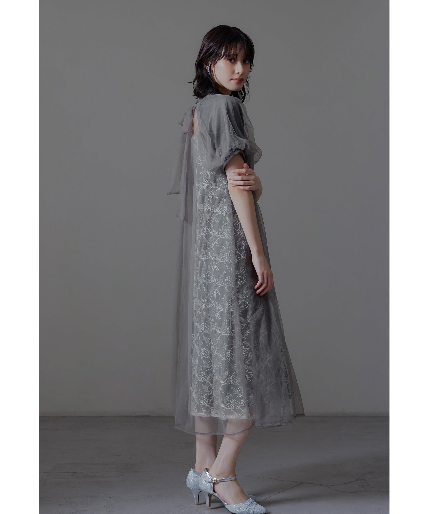 ふんわりとしたパフスリーブは肩から腕を優しく包み込み、女性らしい華奢さを引き立てます。