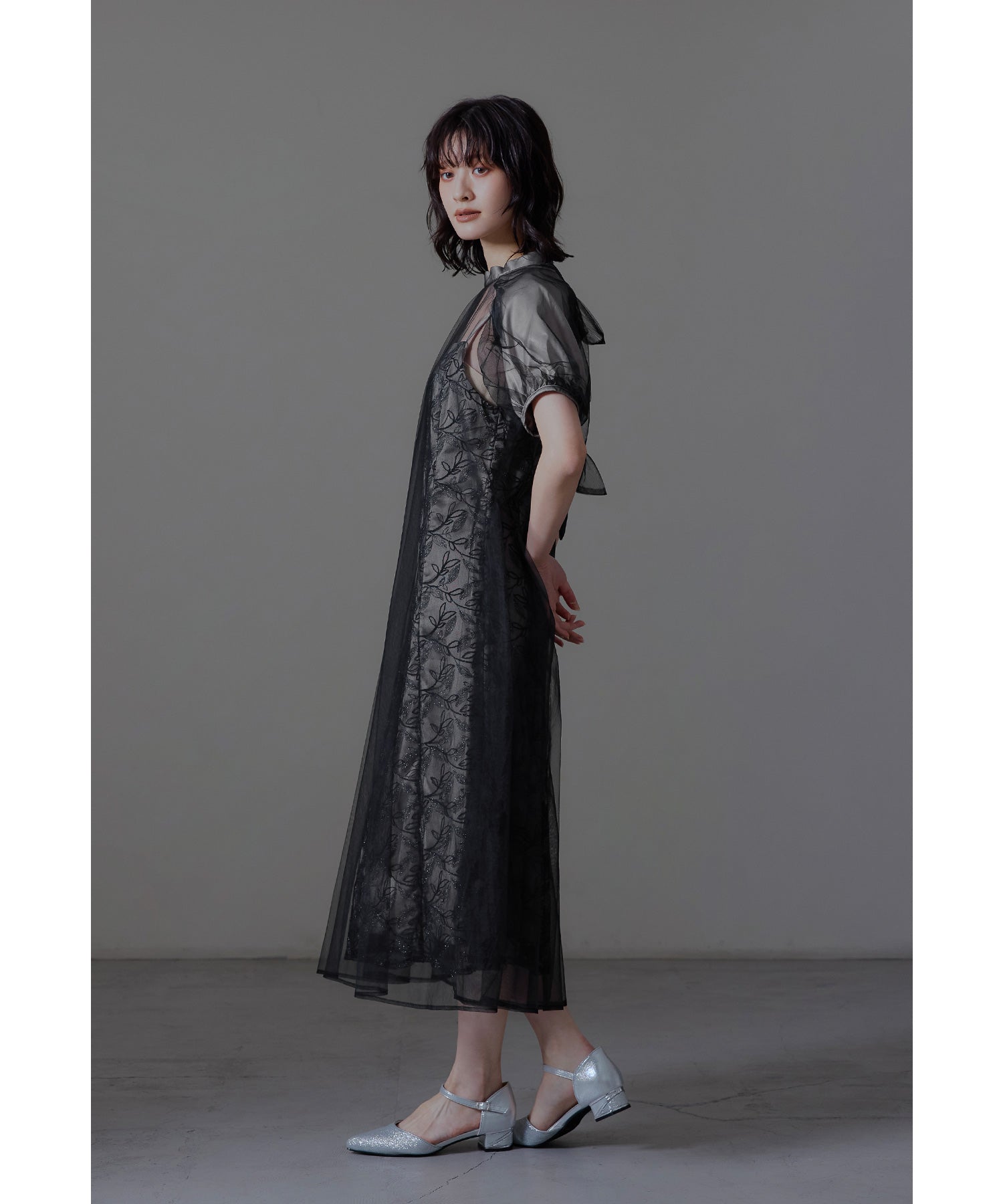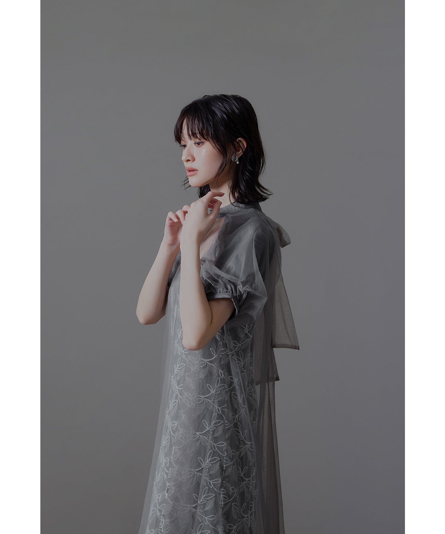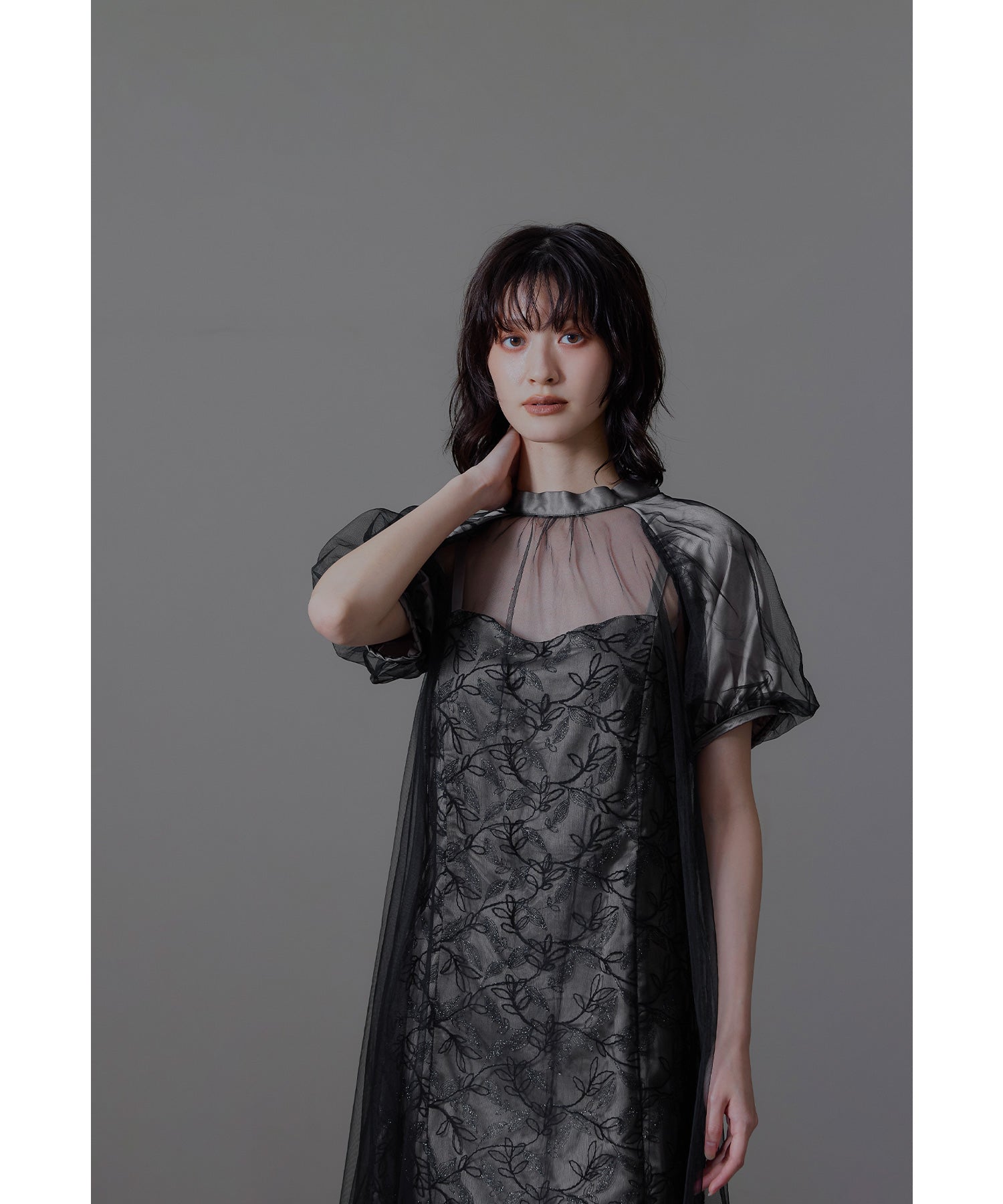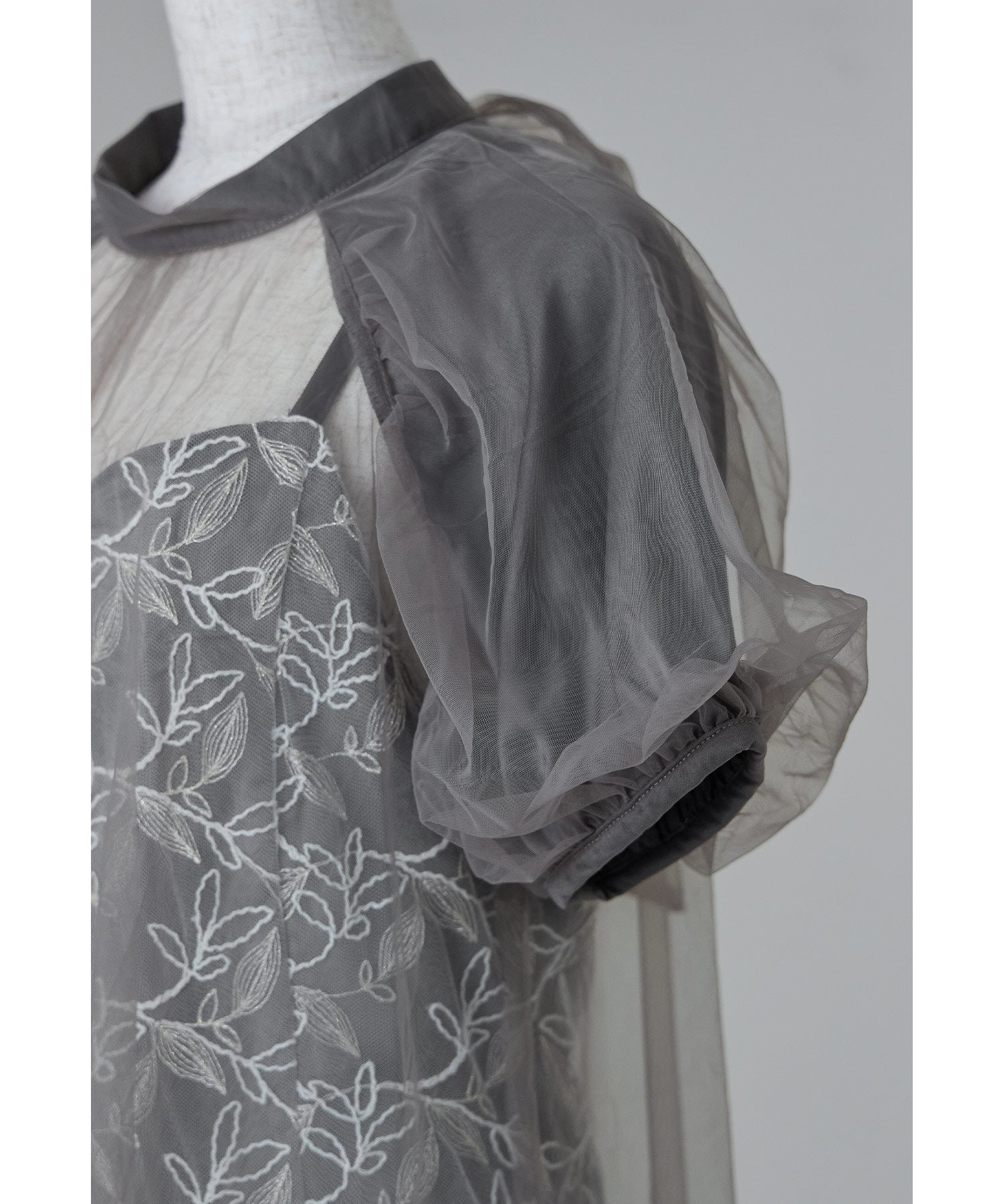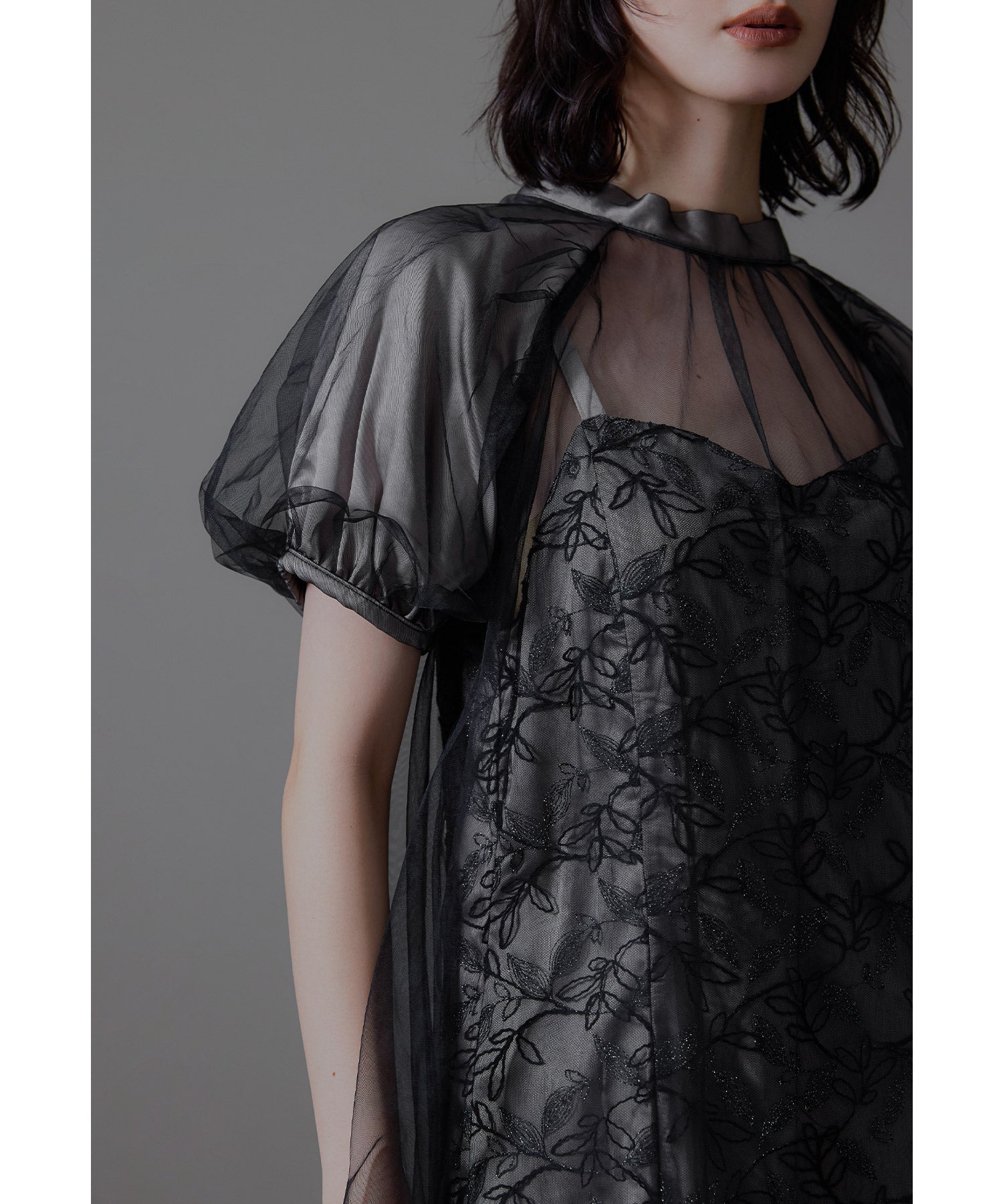 ふんわりとしたパフスリーブは肩から腕を優しく包み込み、女性らしい華奢さを引き立てます。