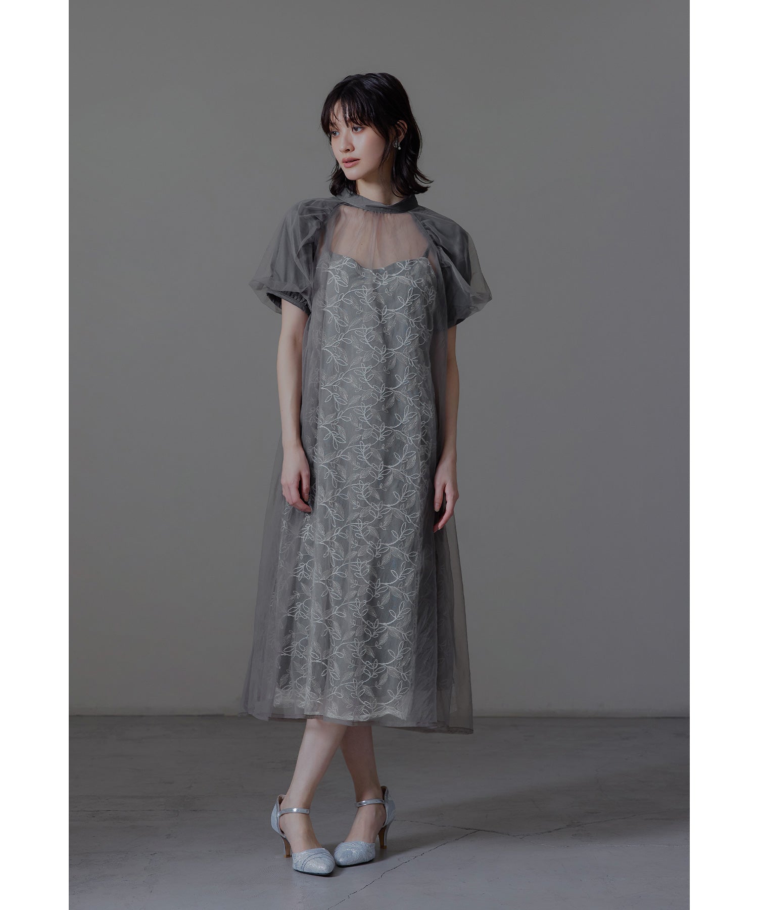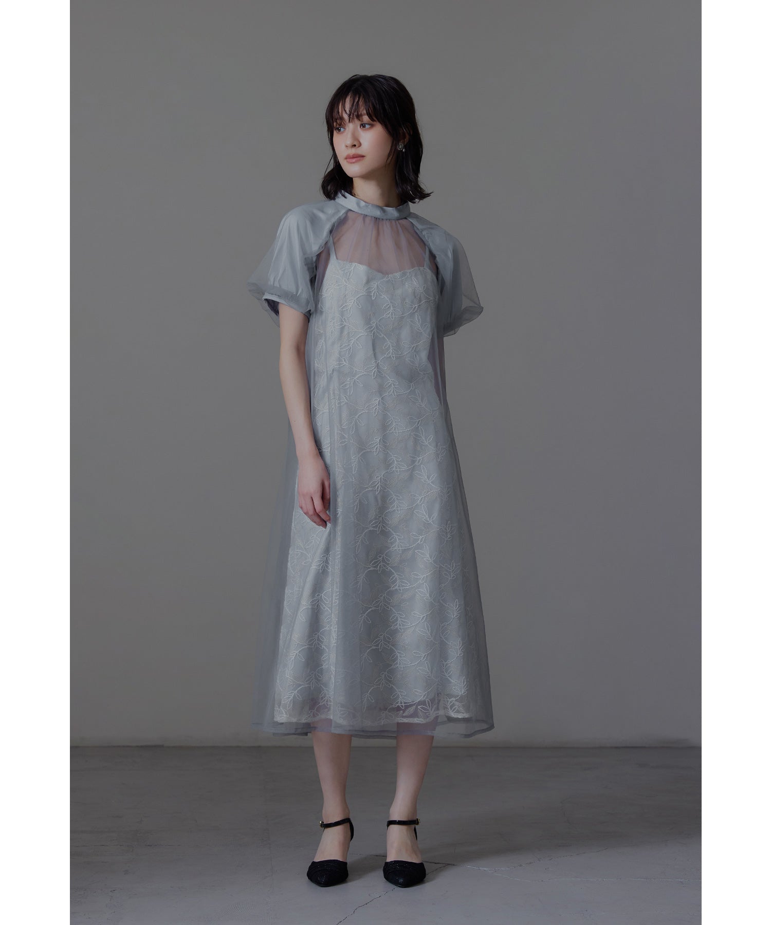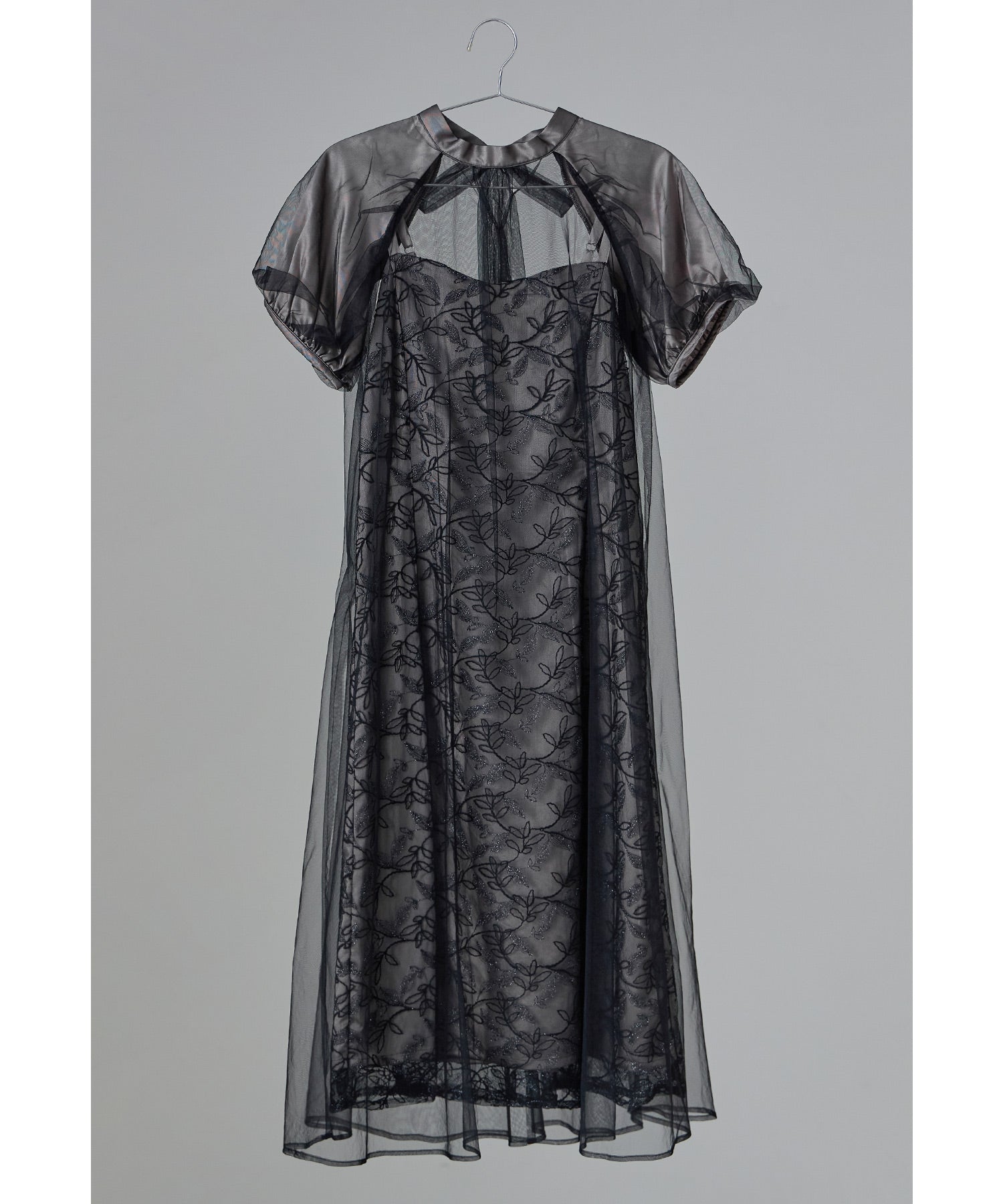 チュールワンピースはゆるやかに広がるAラインでインナーワンピースとの陰影も楽しんでいただけます。