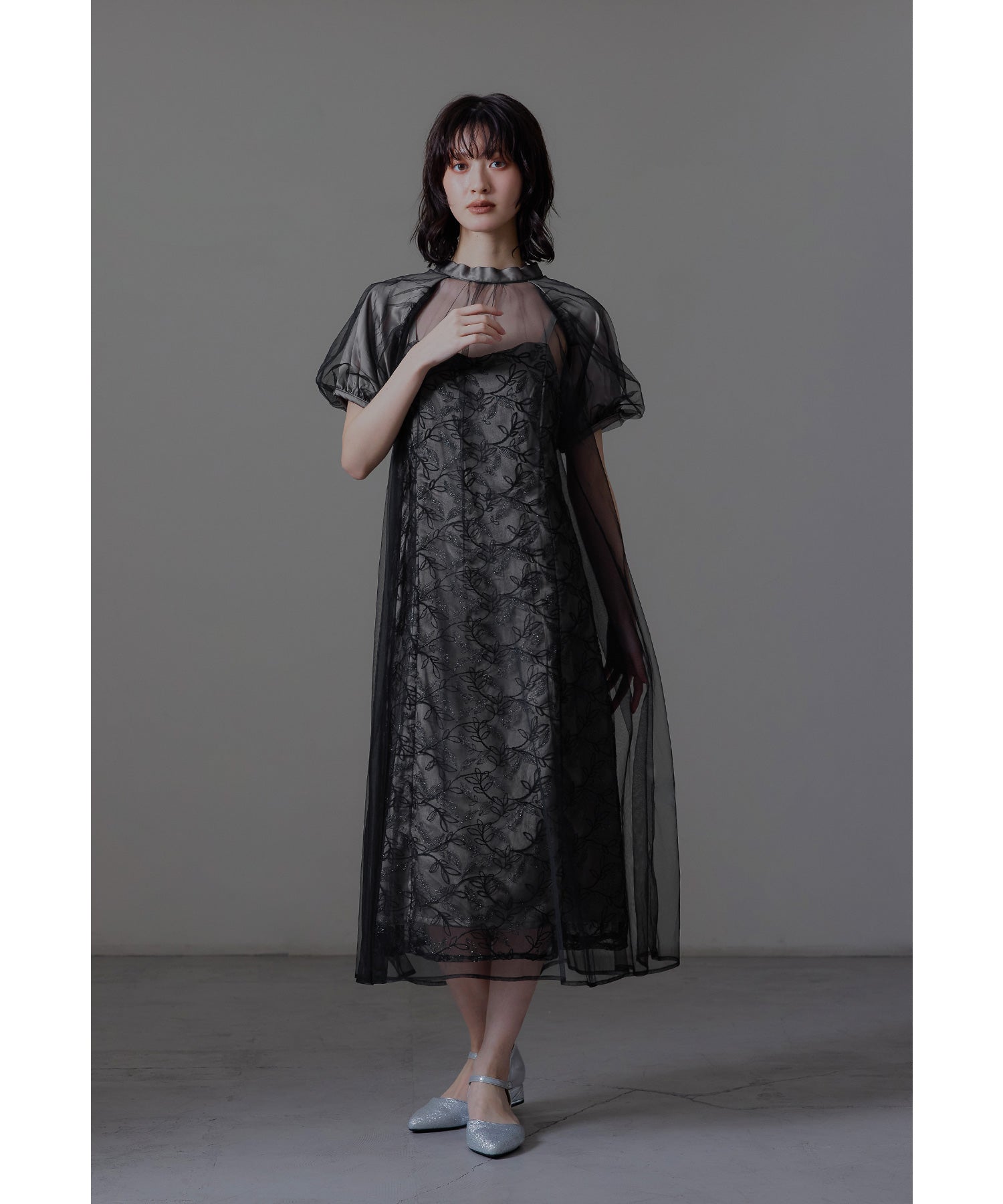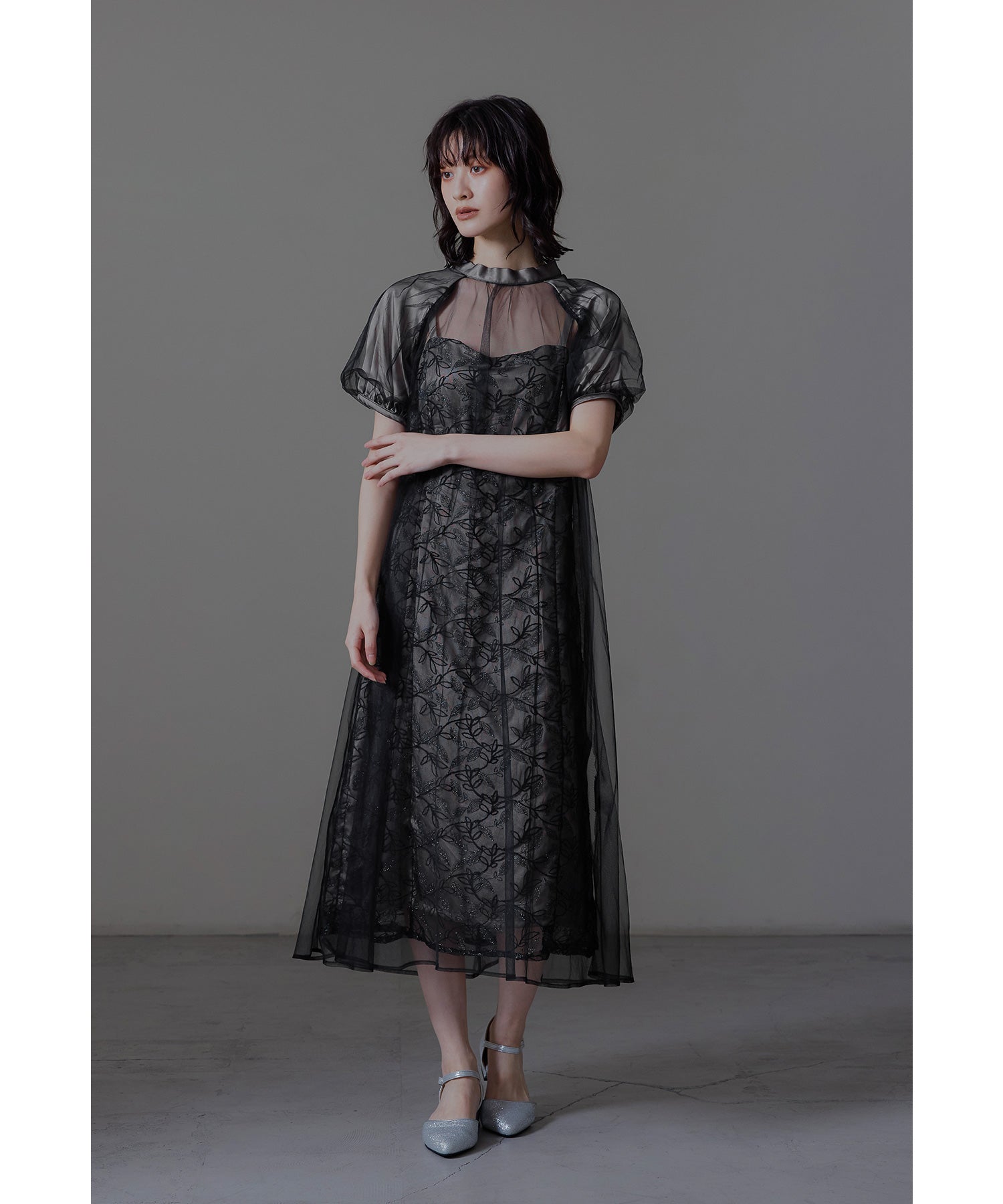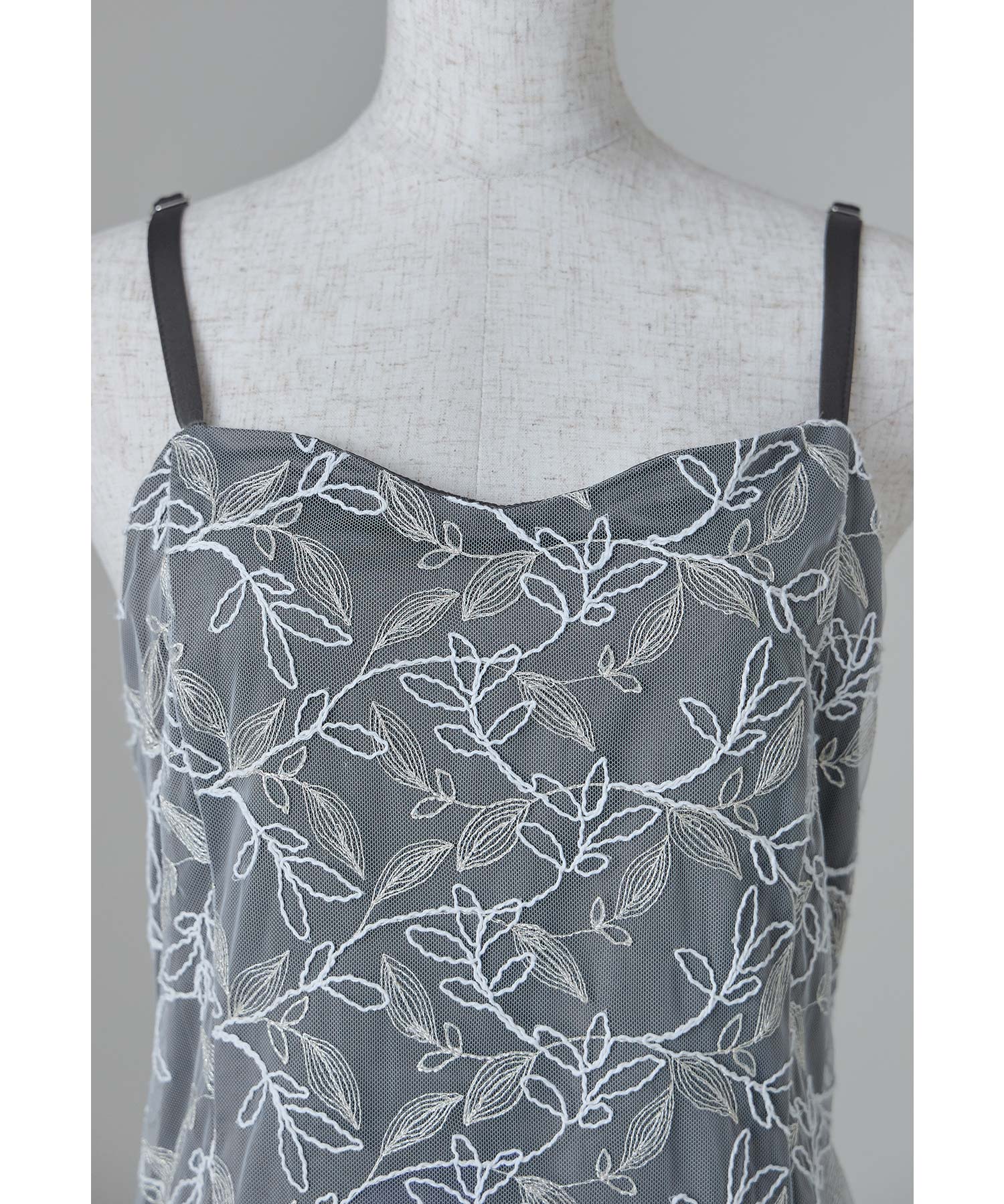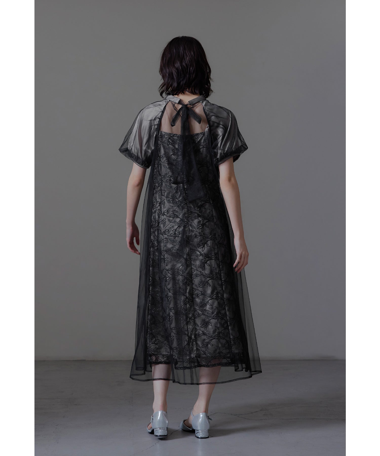 チュールワンピースはゆるやかに広がるAラインでインナーワンピースとの陰影も楽しんでいただけます。