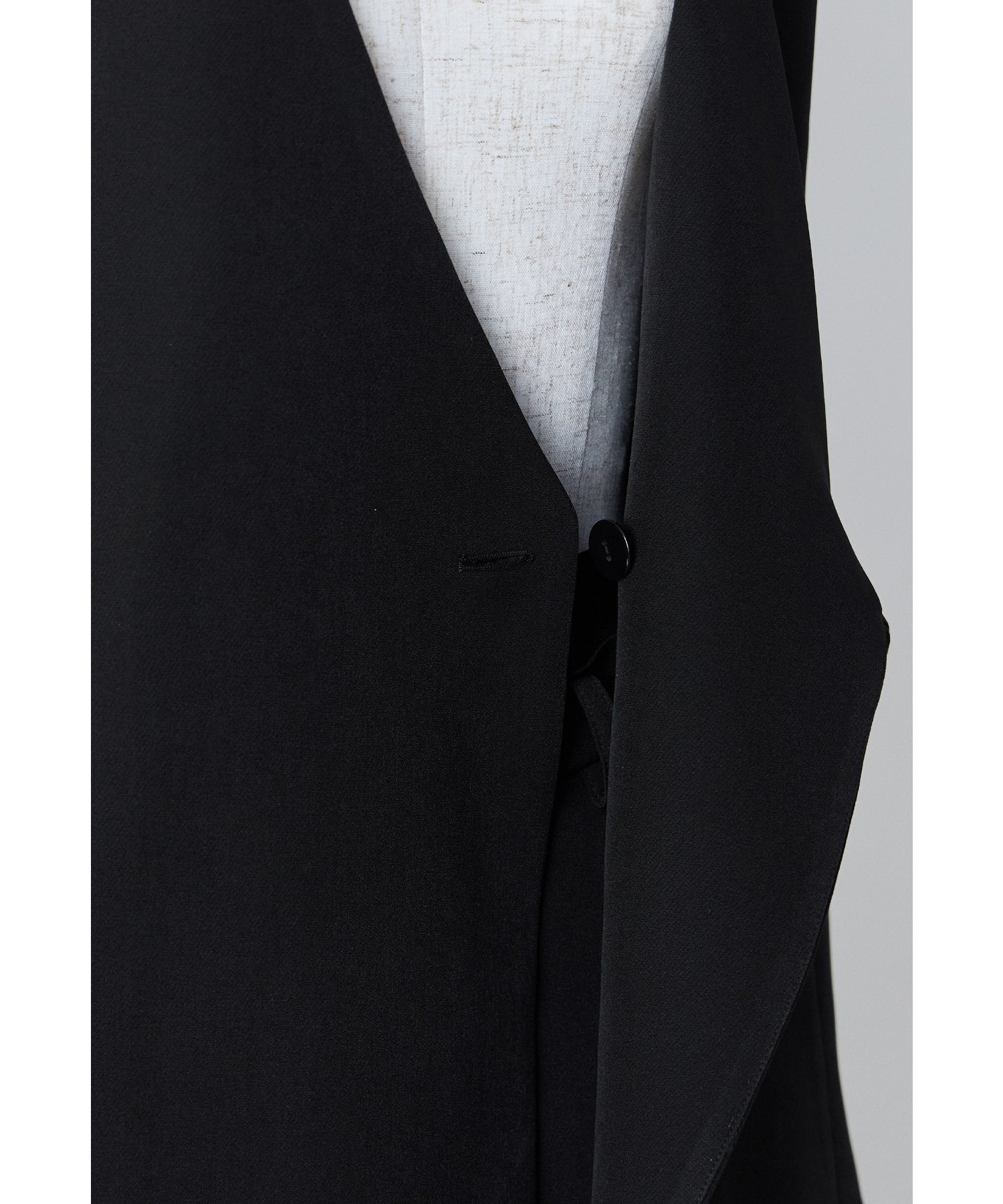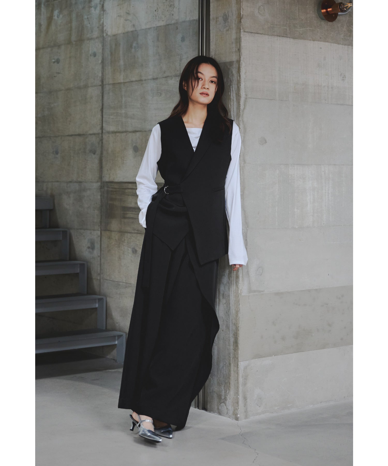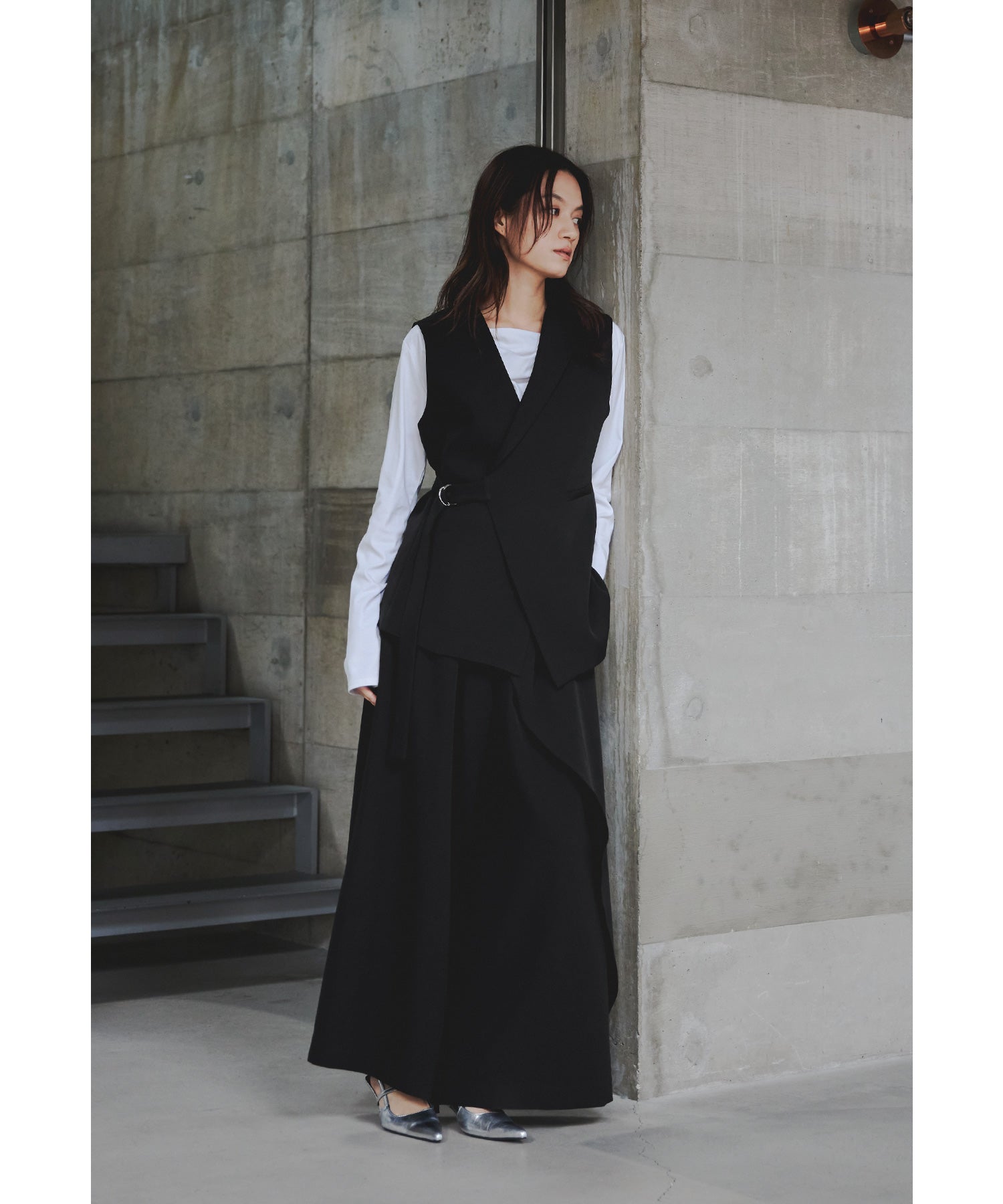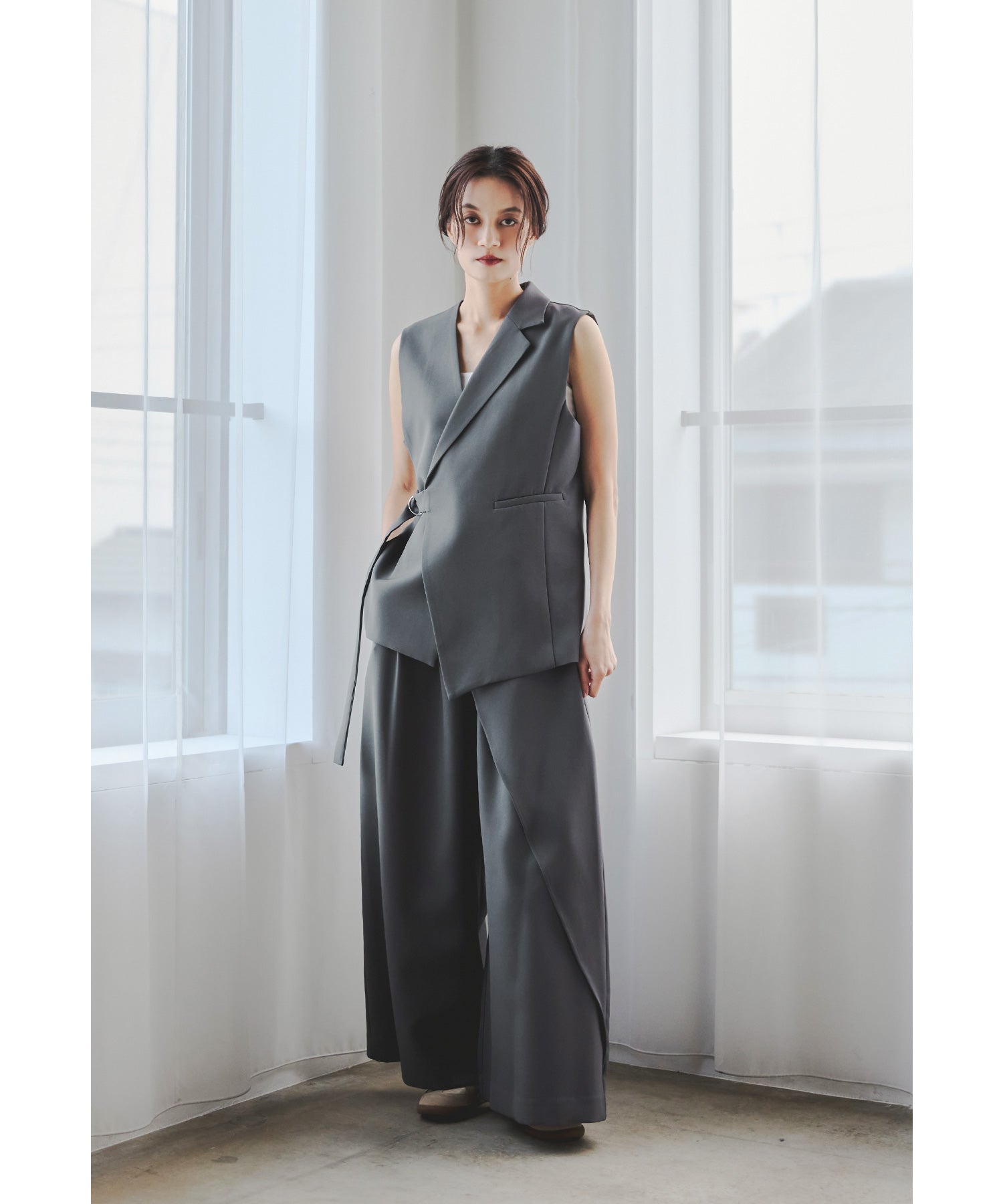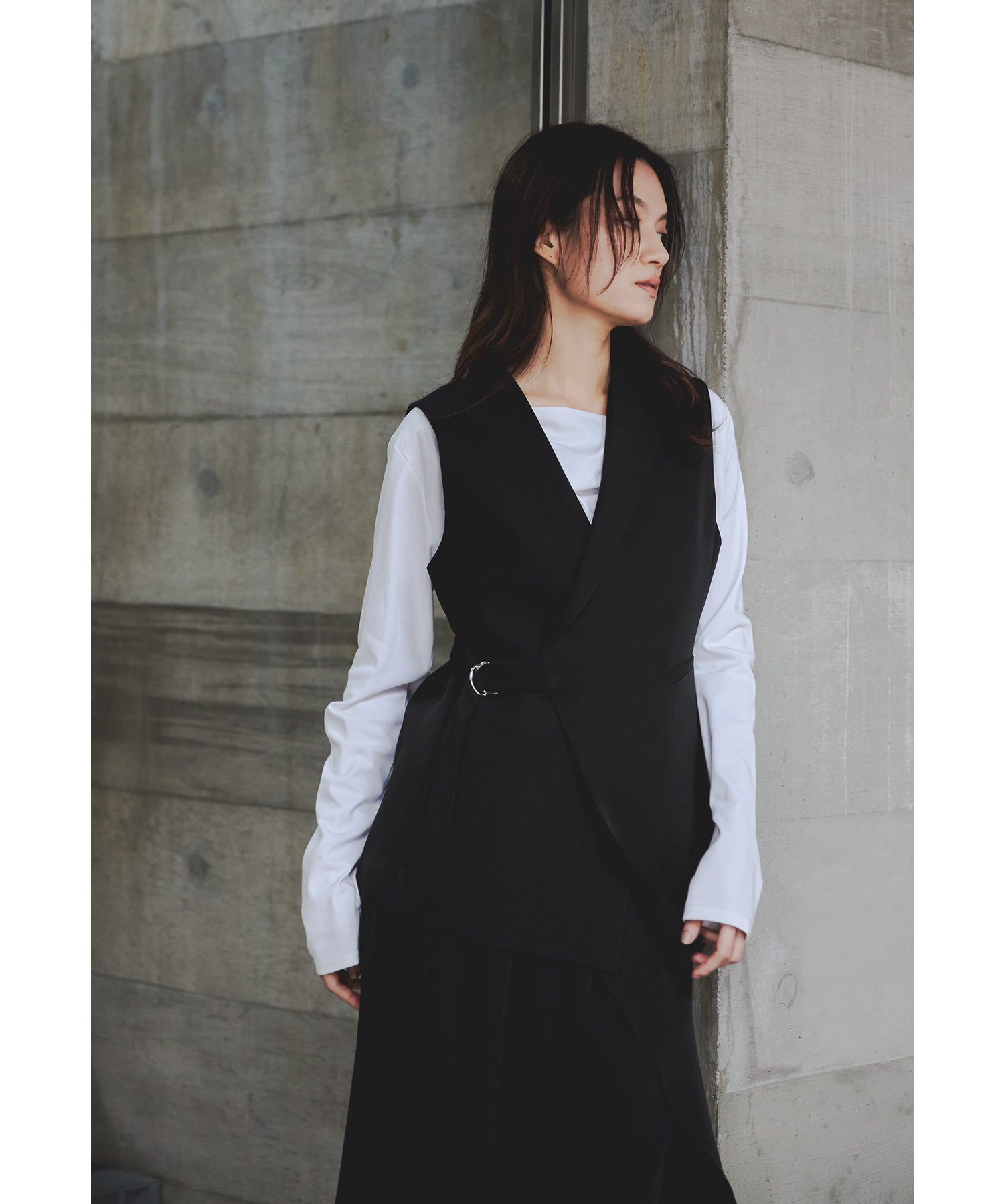 一際存在感を放つジレは、左右非対称のカッティングで独特のシルエットに仕上げました。
