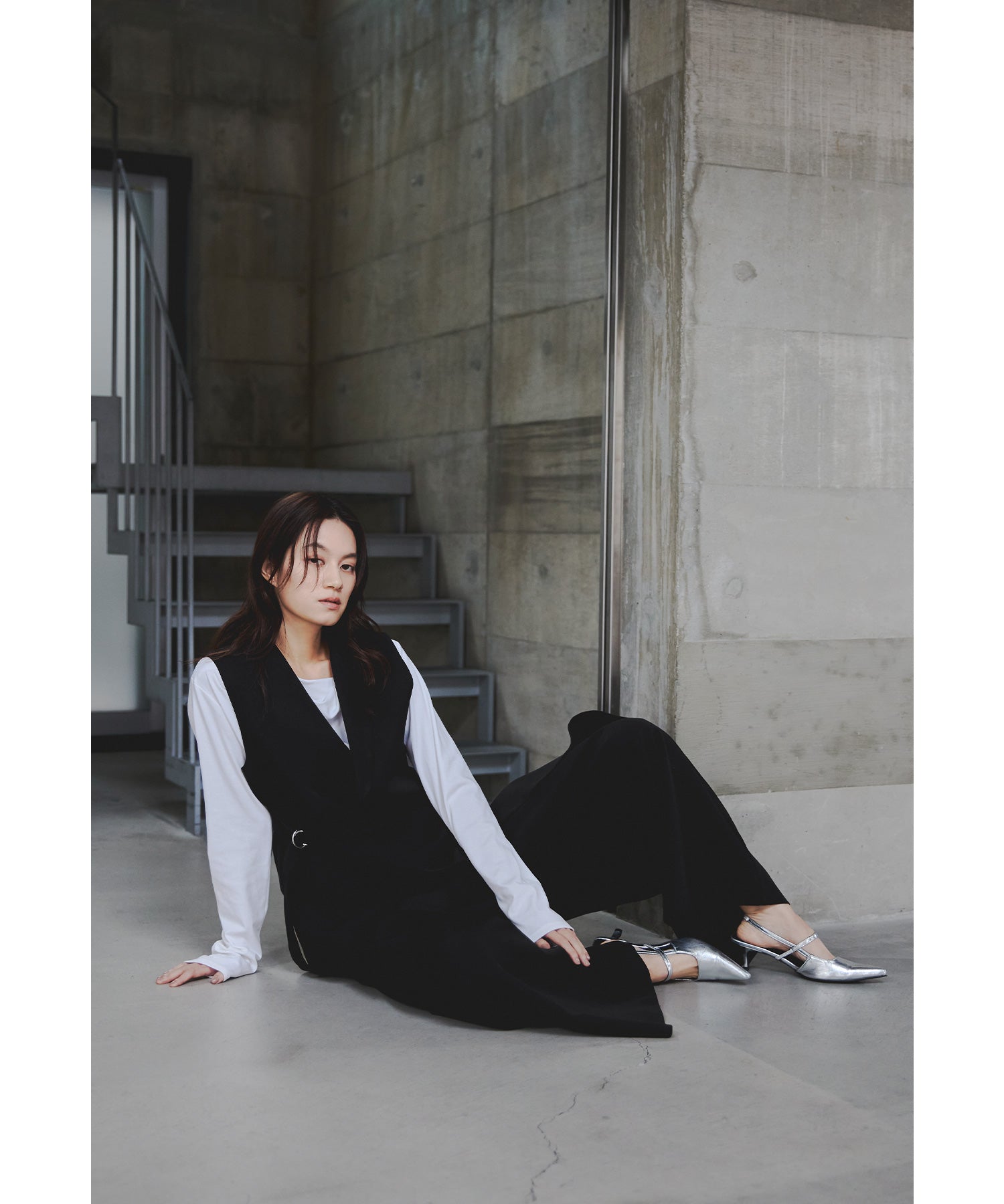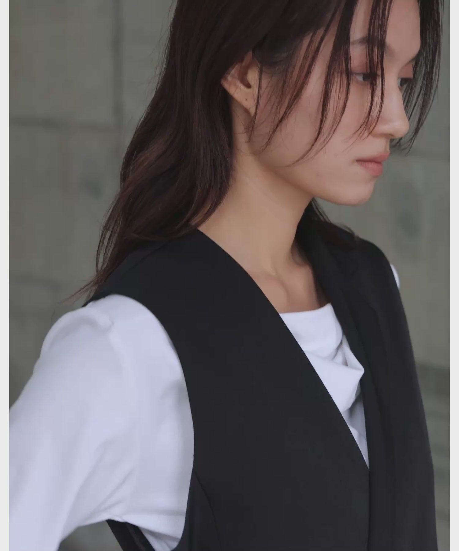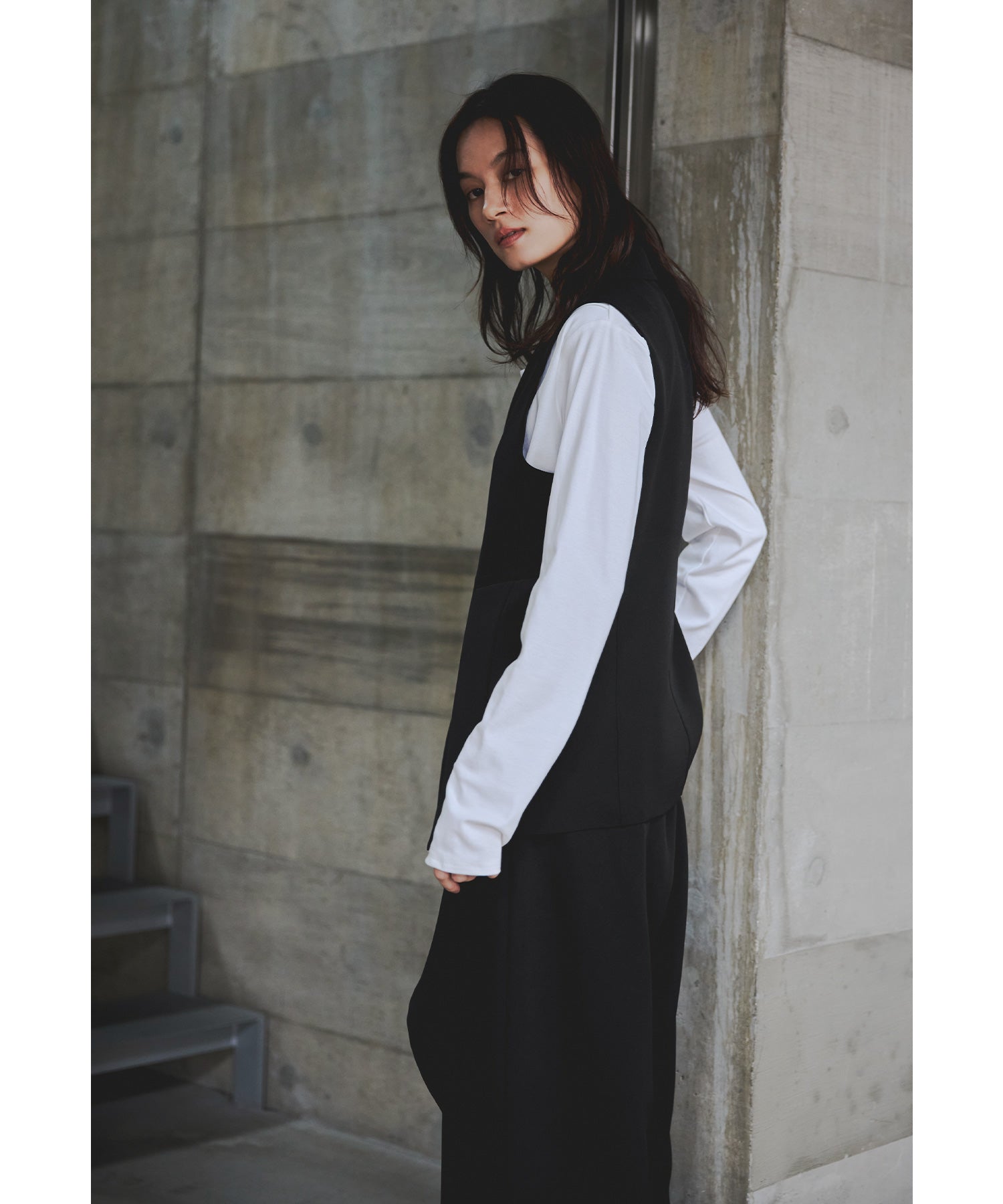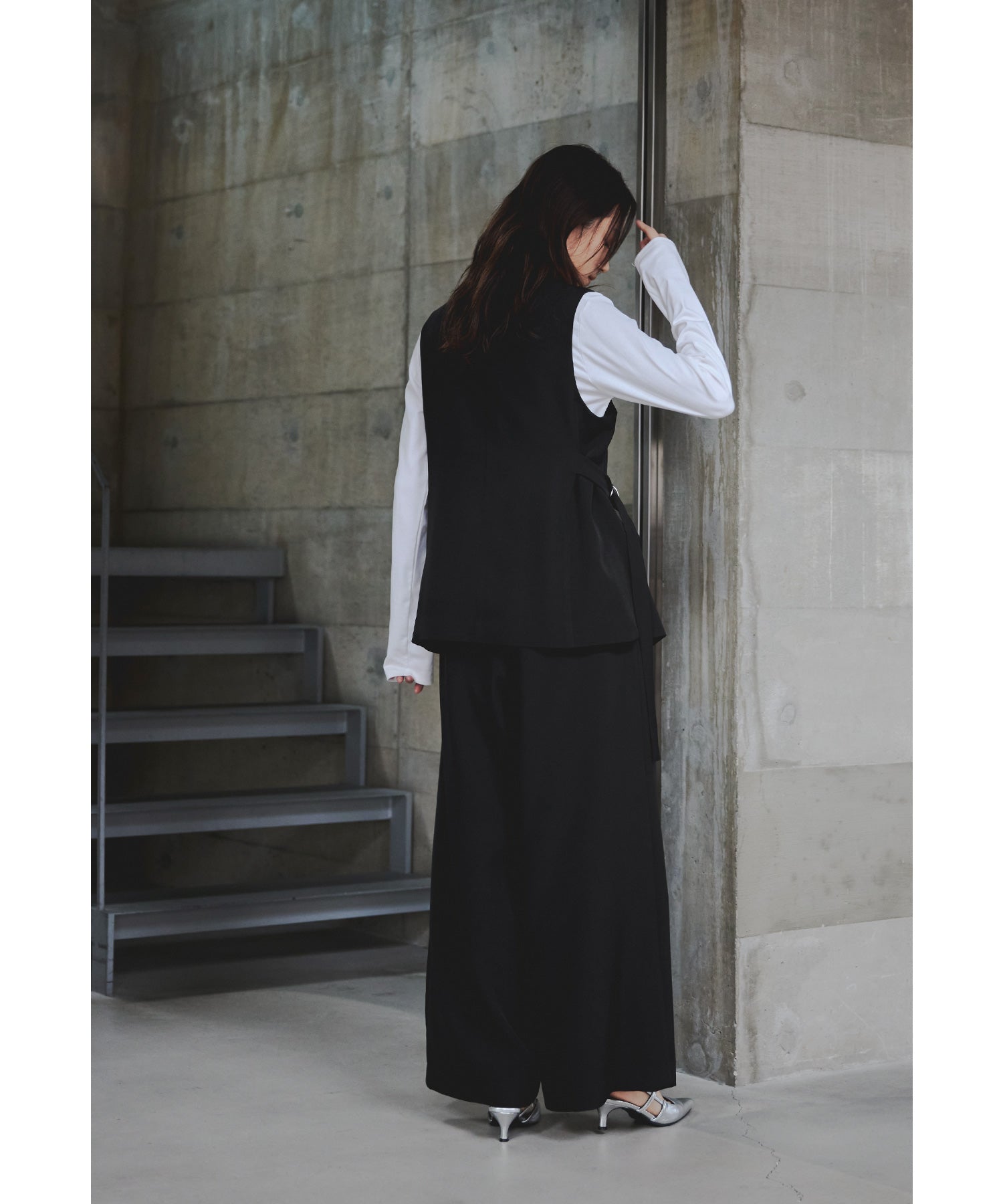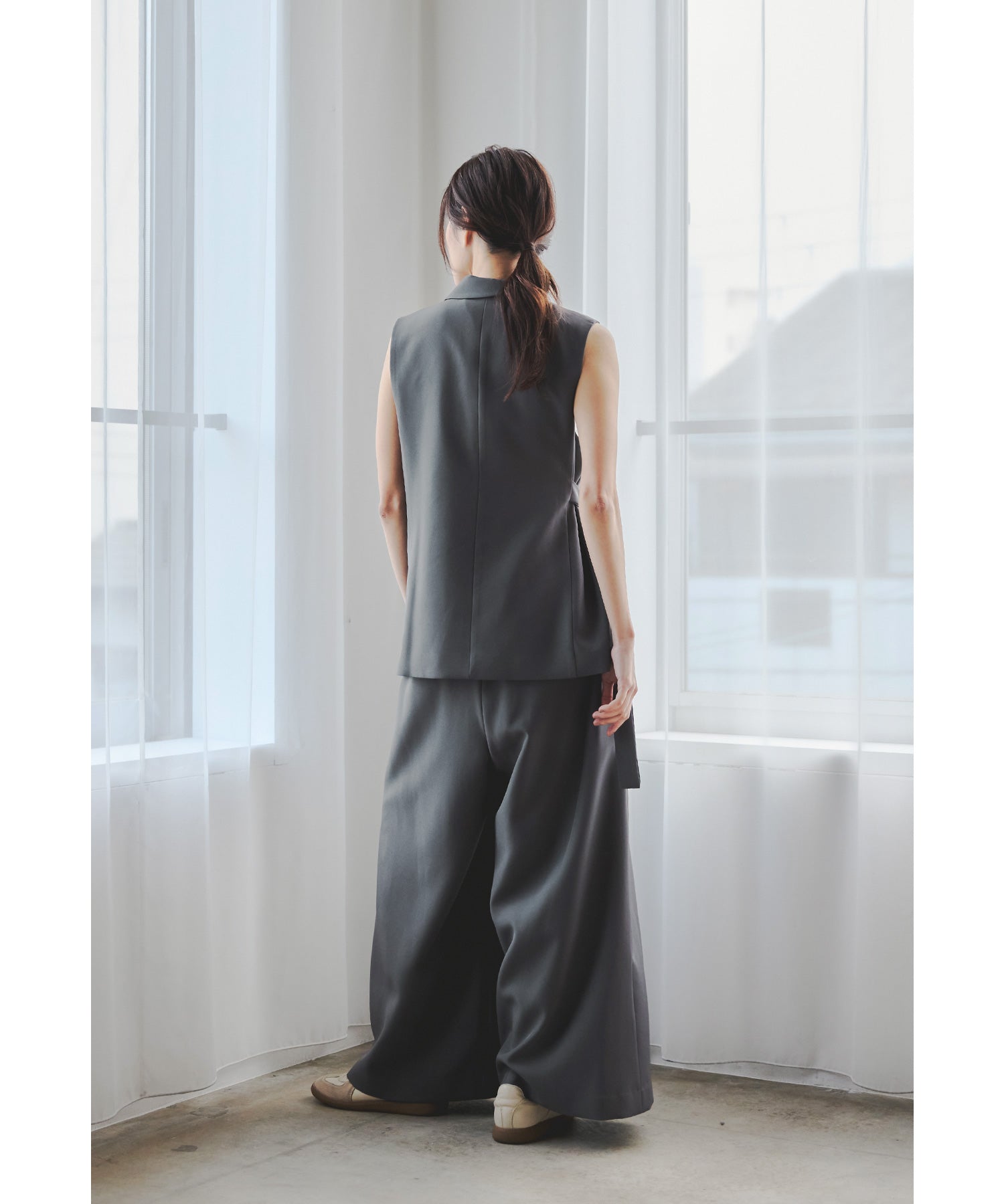 一際存在感を放つジレは、左右非対称のカッティングで独特のシルエットに仕上げました。