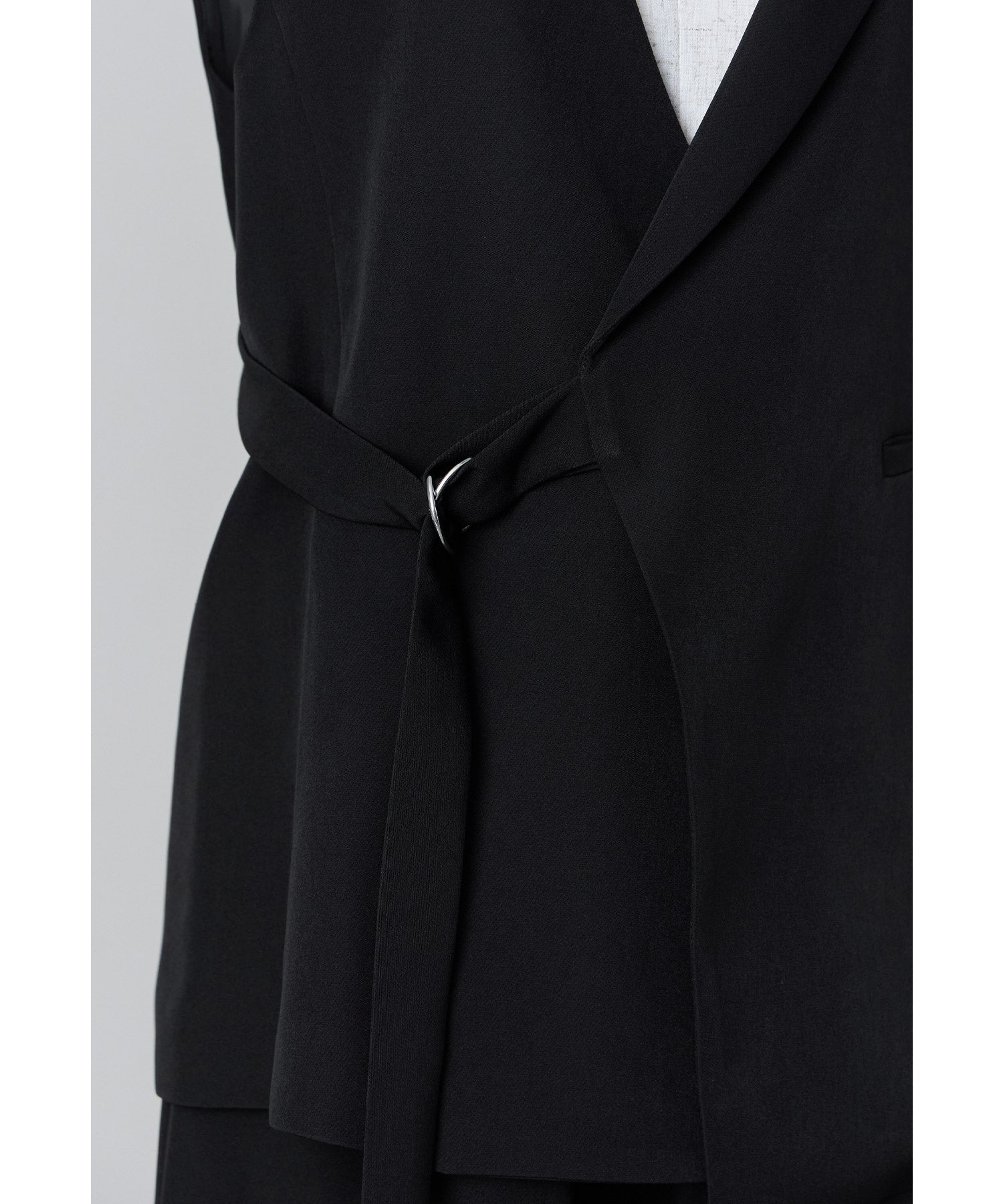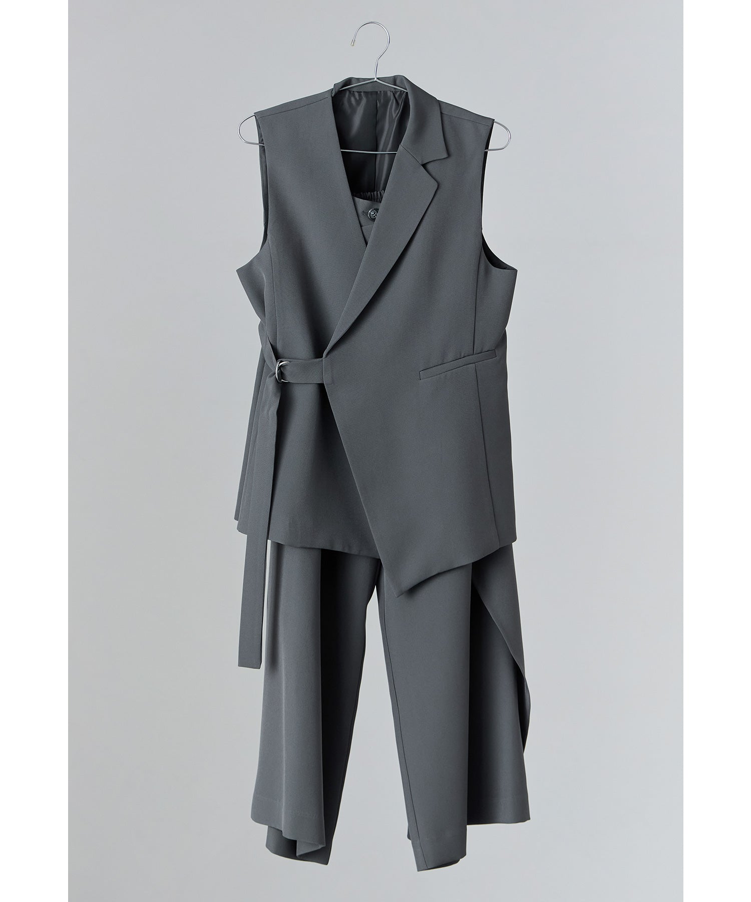 アシンメトリーデザインのサイドベルトジレとラップパンツのセレモニーセットアップ。