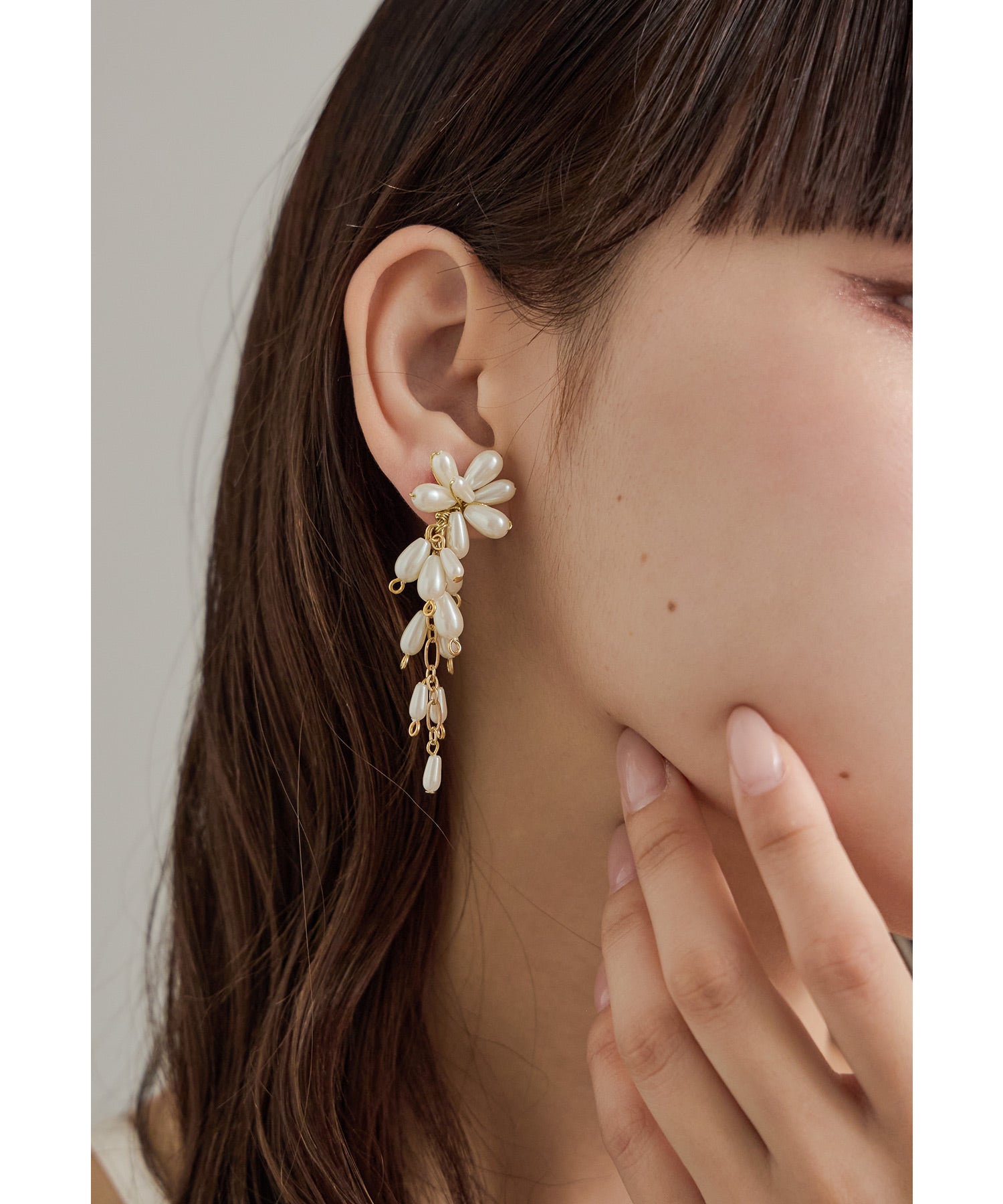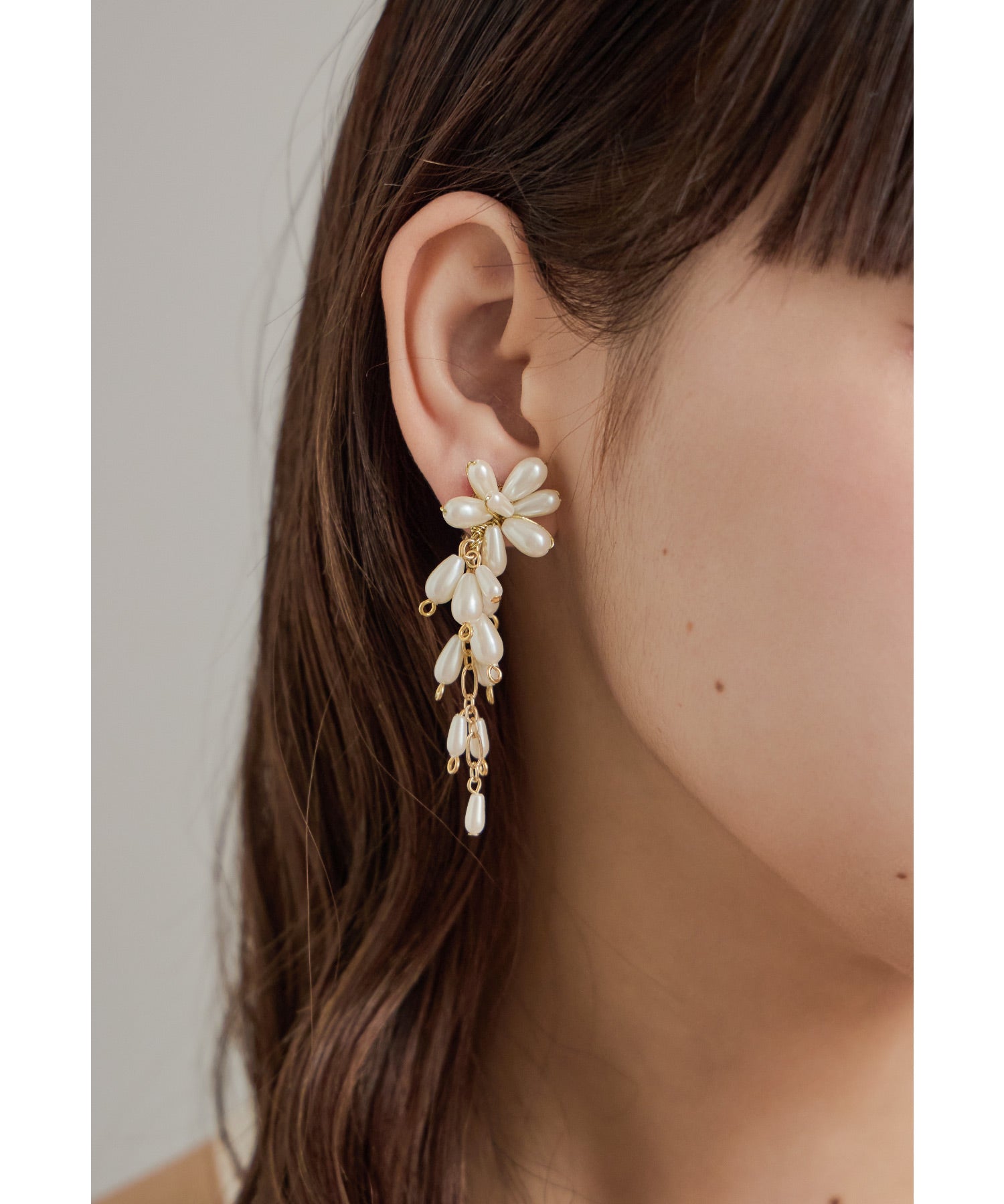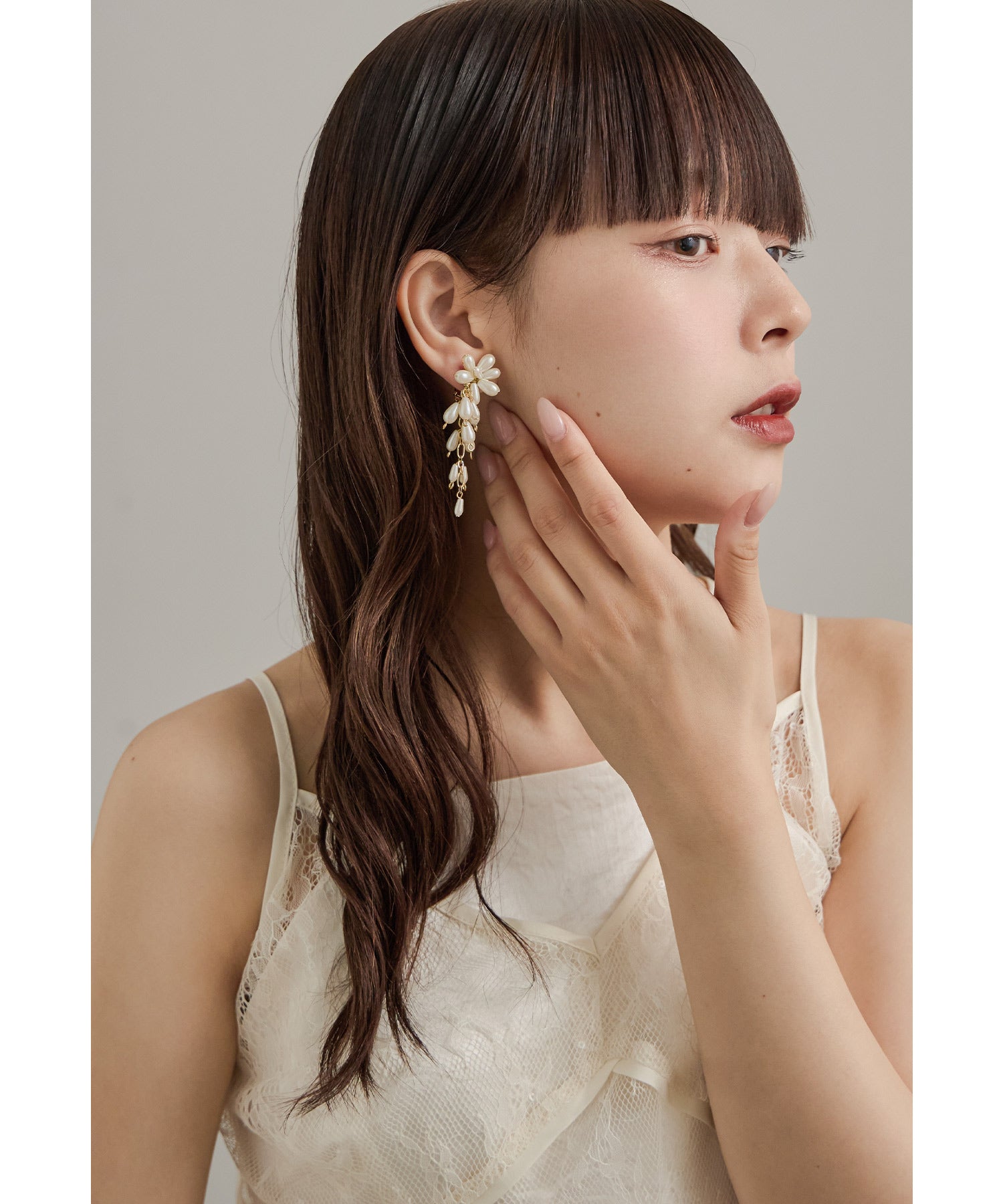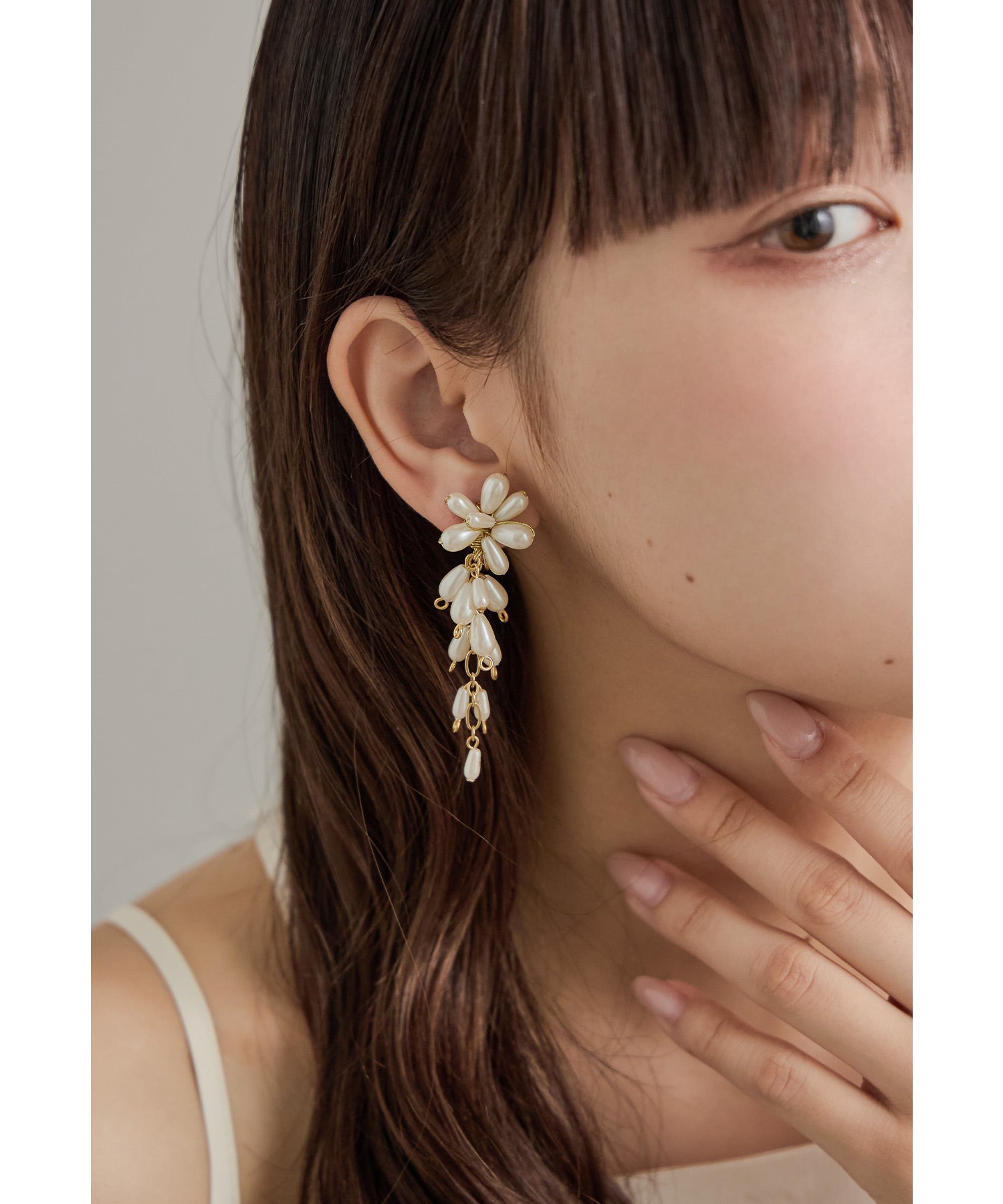 大きさの異なるドロップパールがゆらゆら揺れるロングイヤリング。