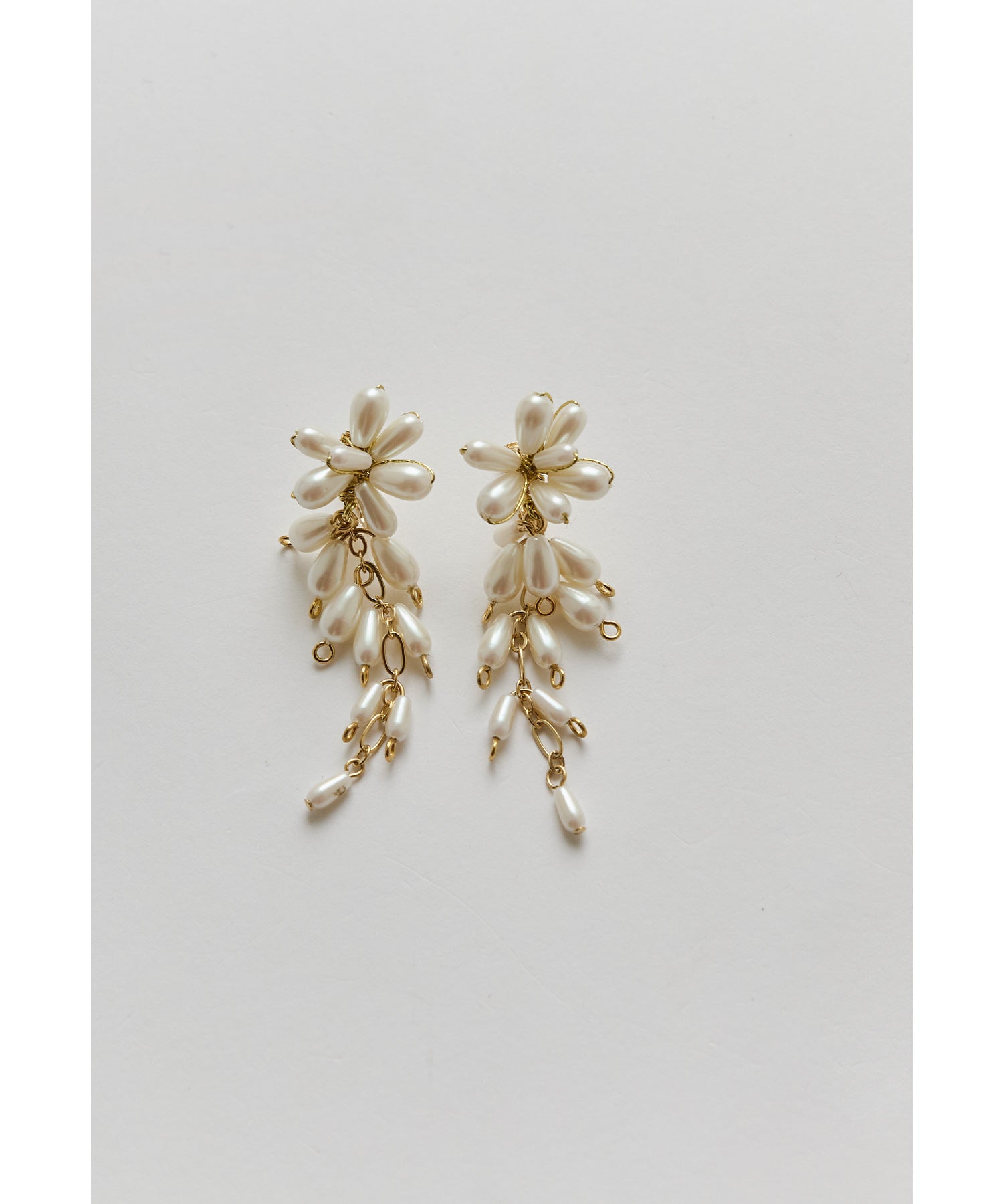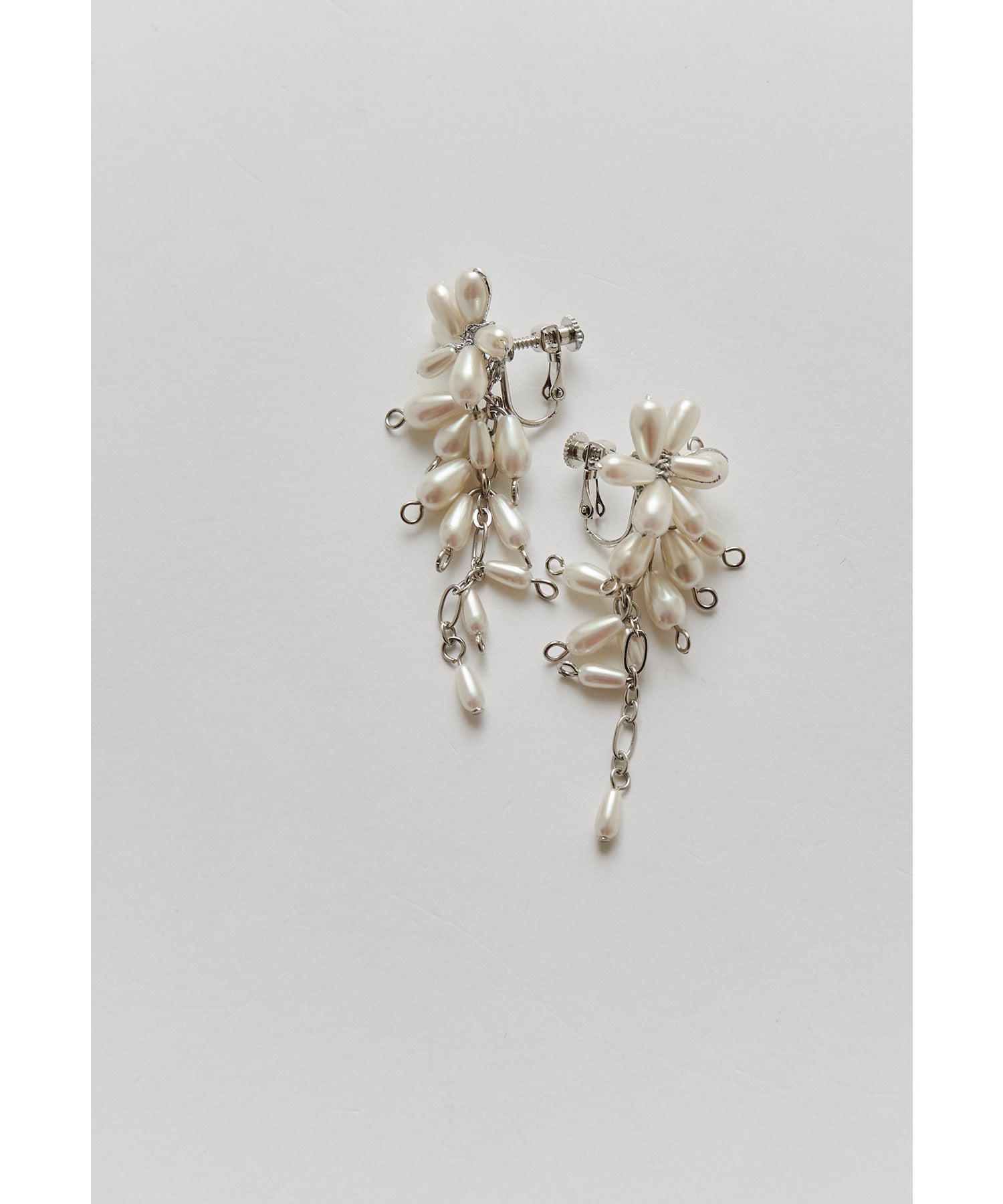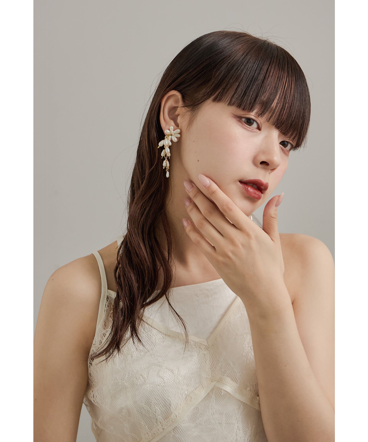 大きさの異なるドロップパールがゆらゆら揺れるロングイヤリング。