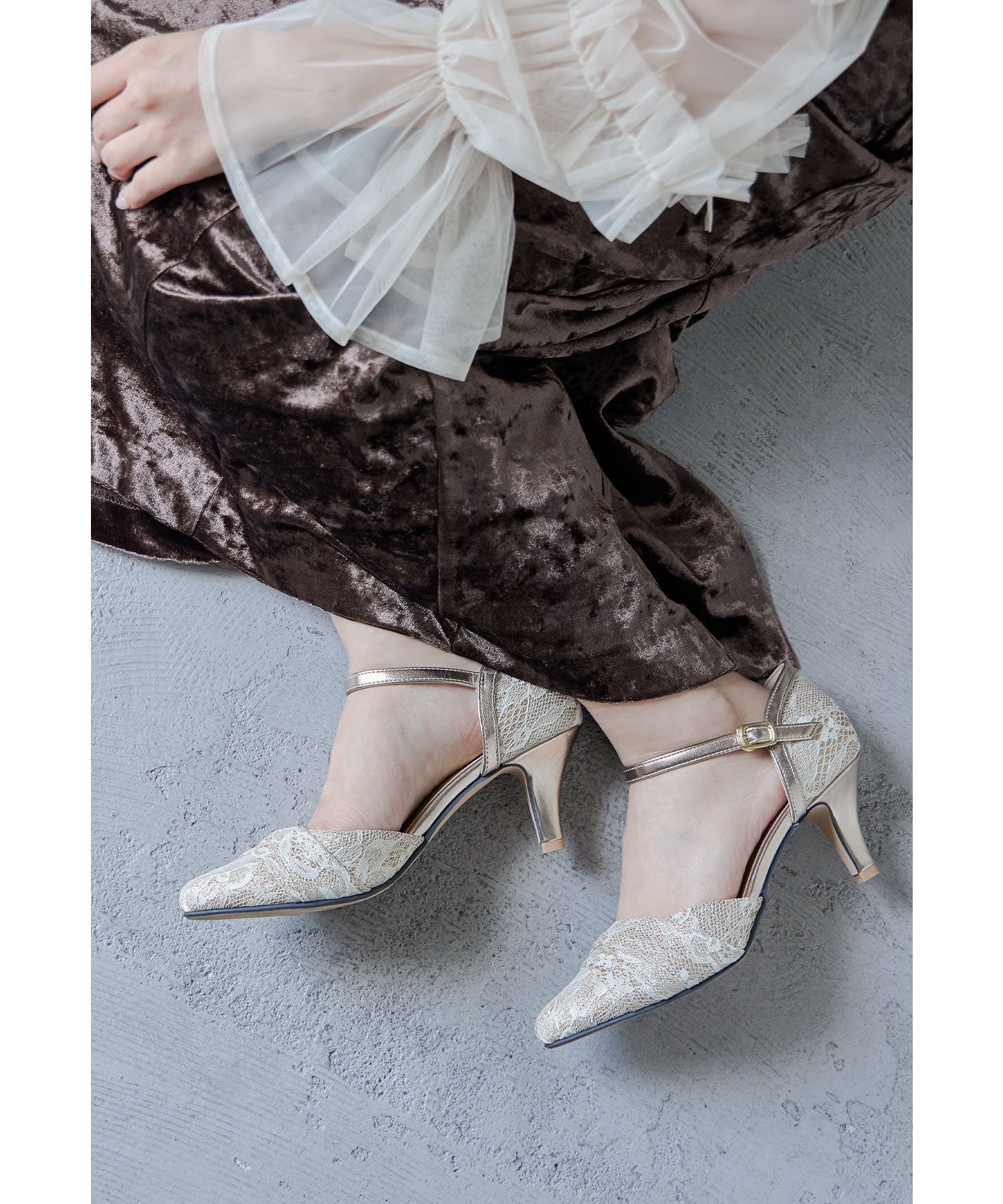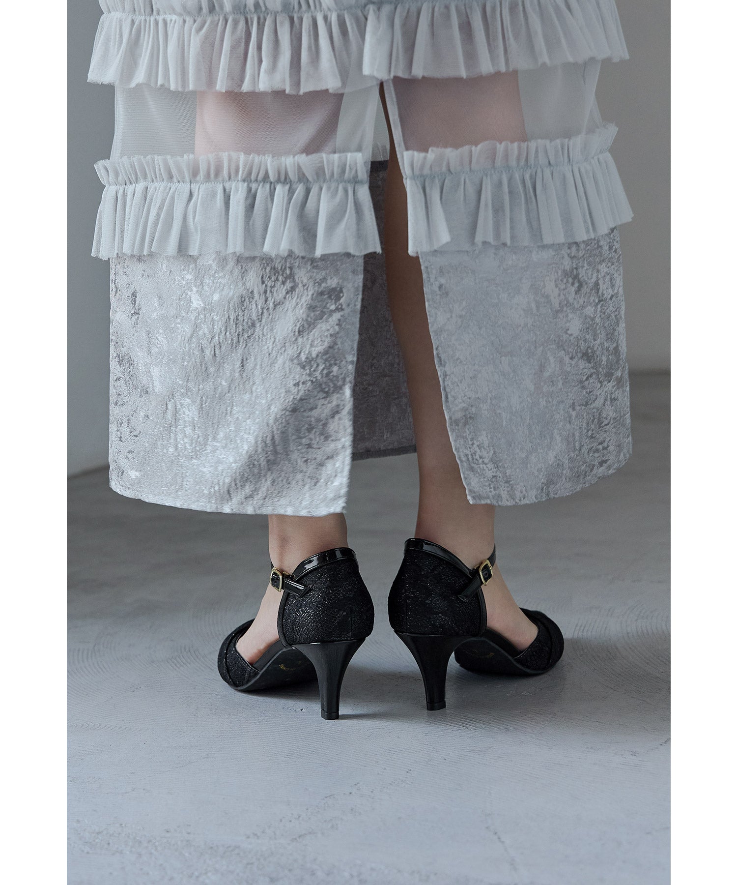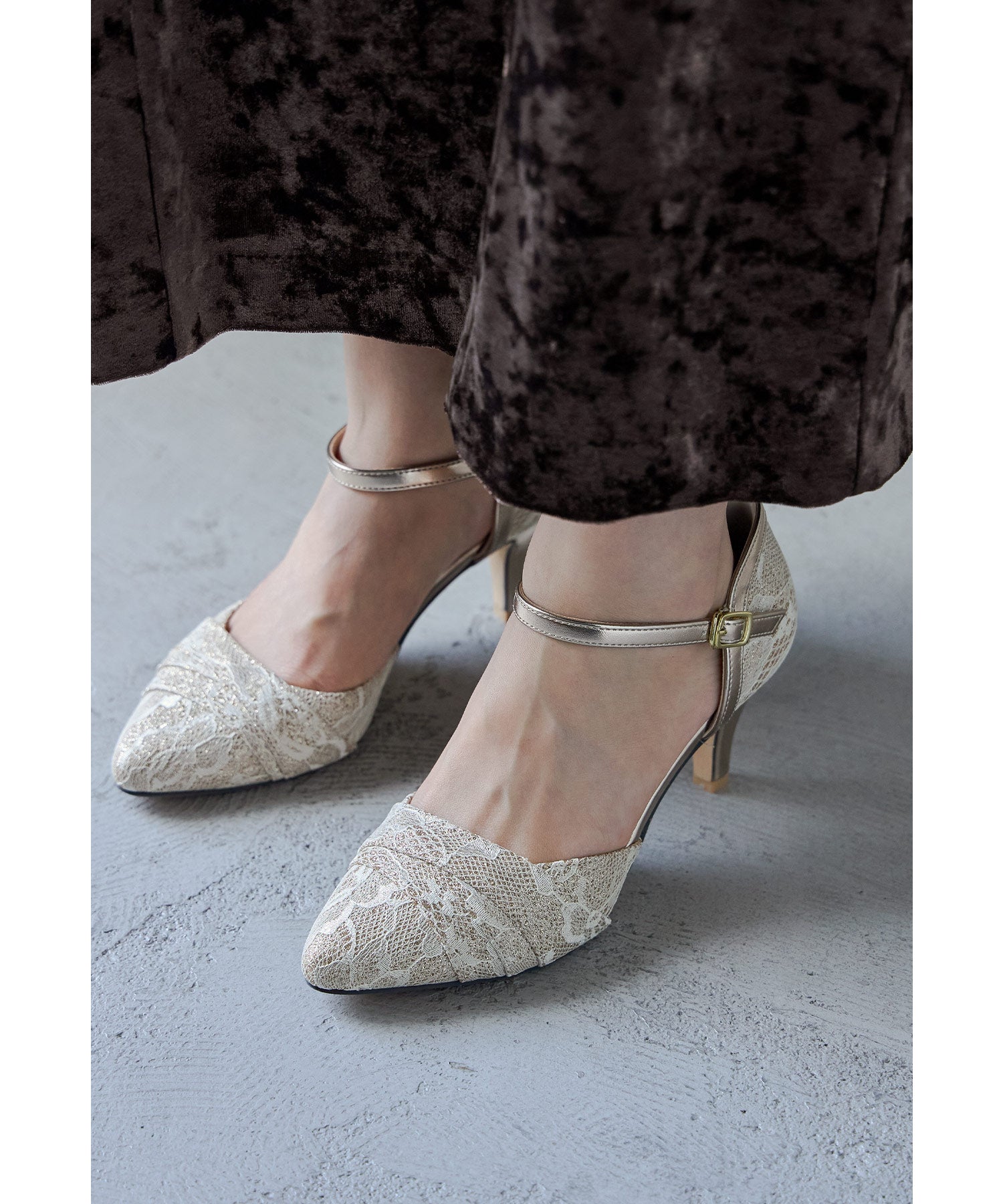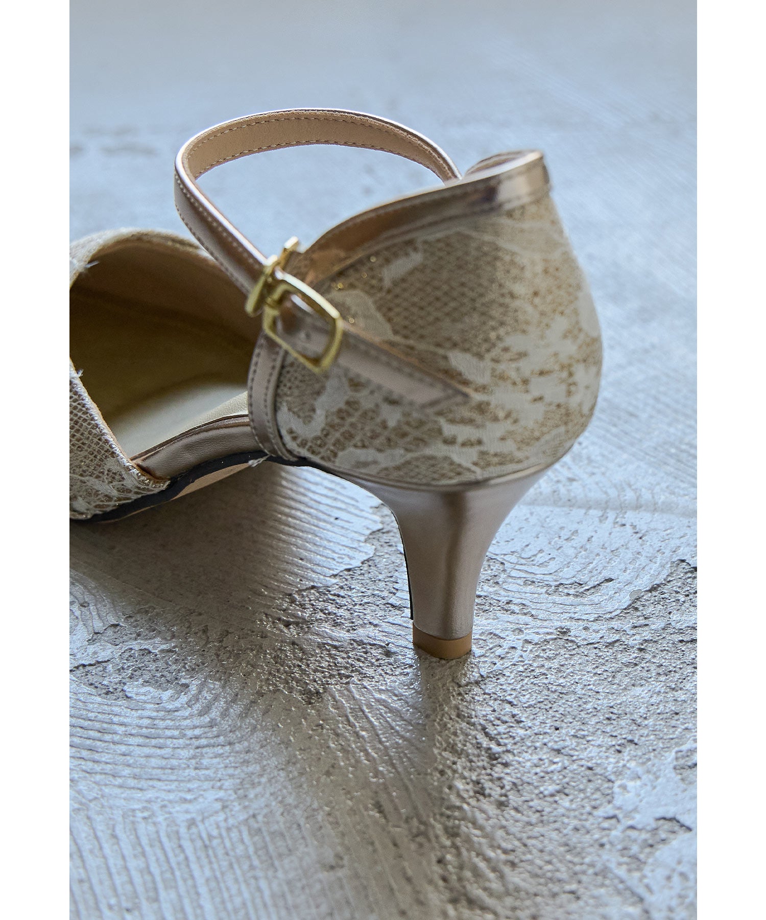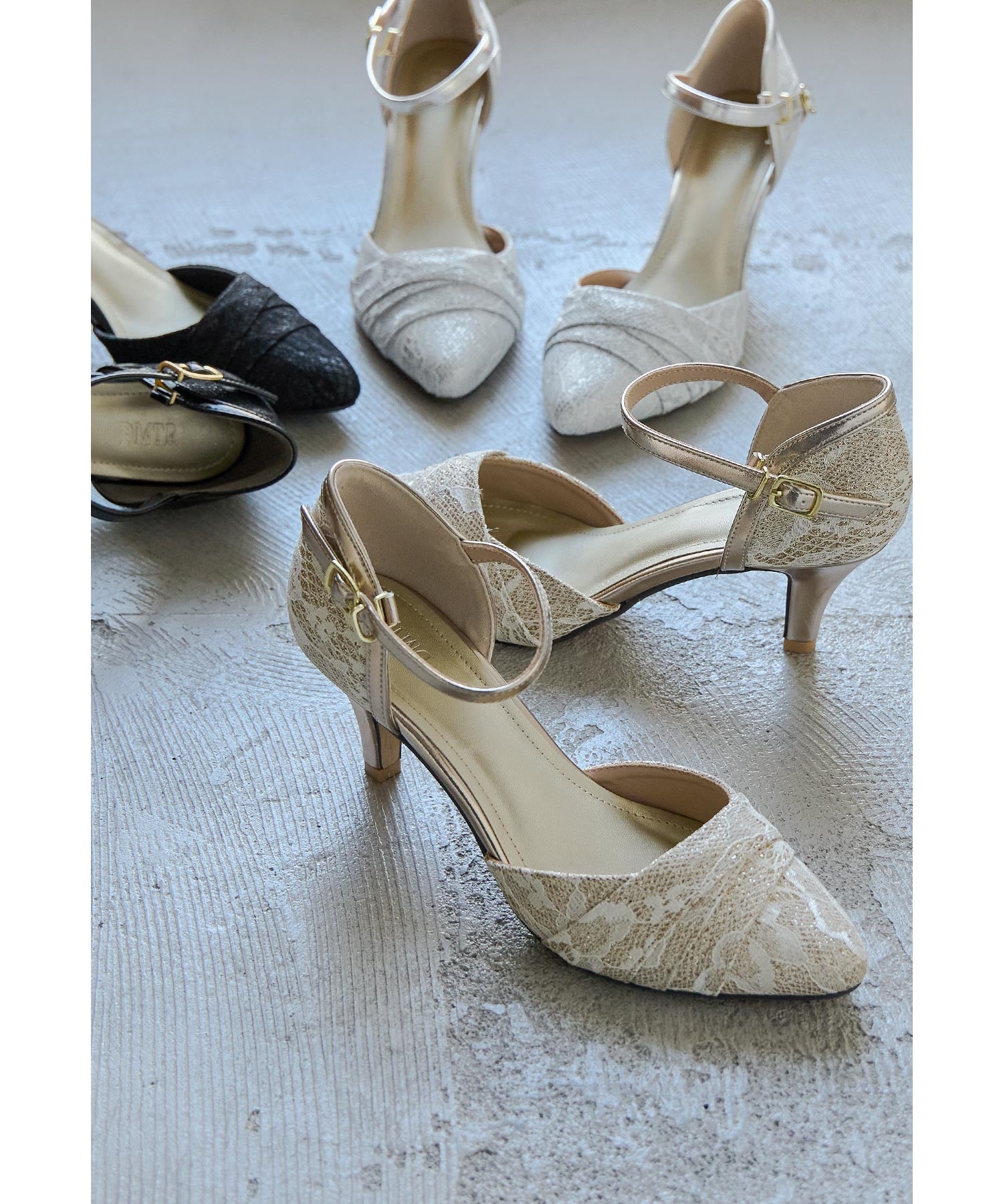 上品に煌めくラメ生地にレースを重ねたパーティーパンプス。