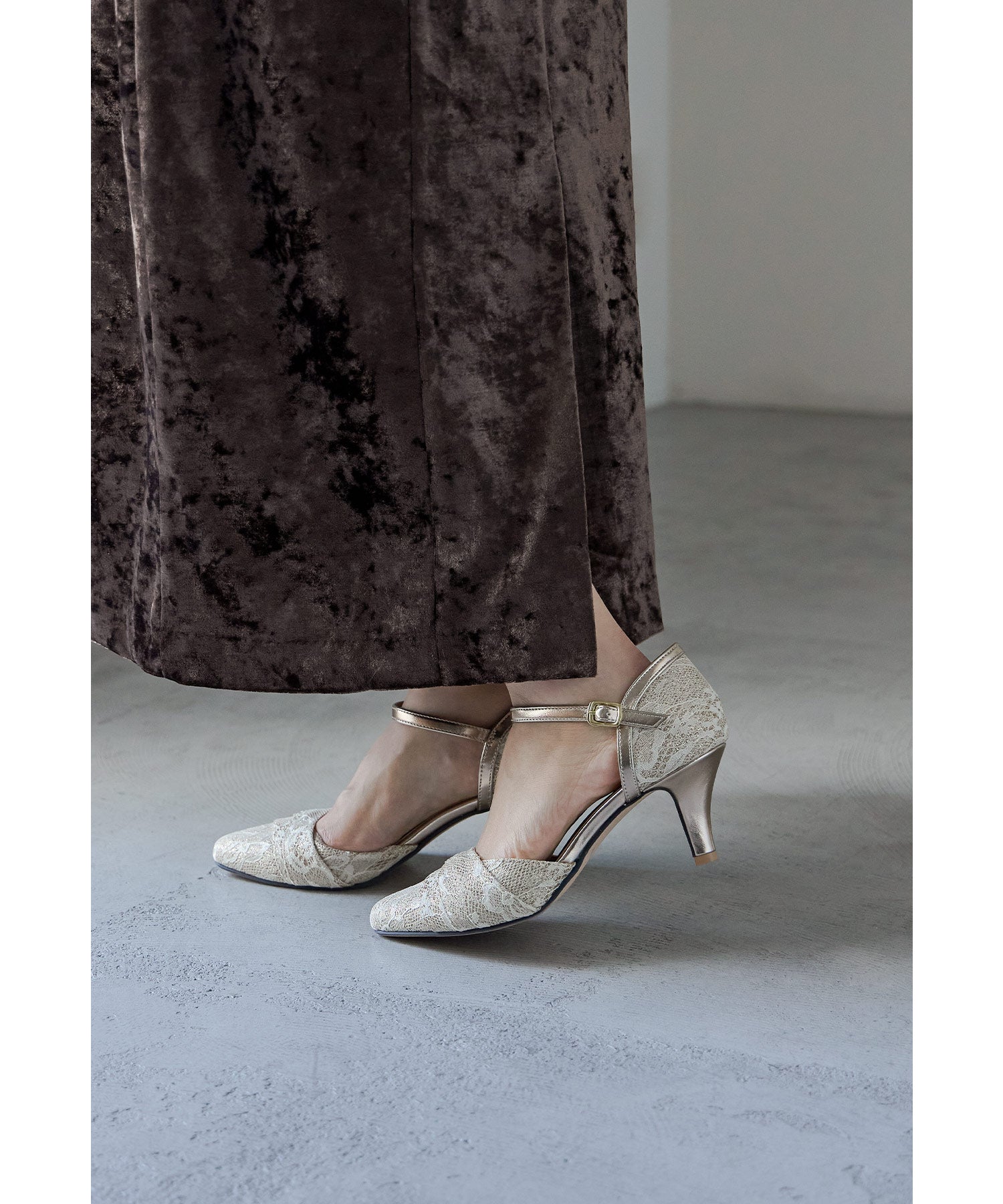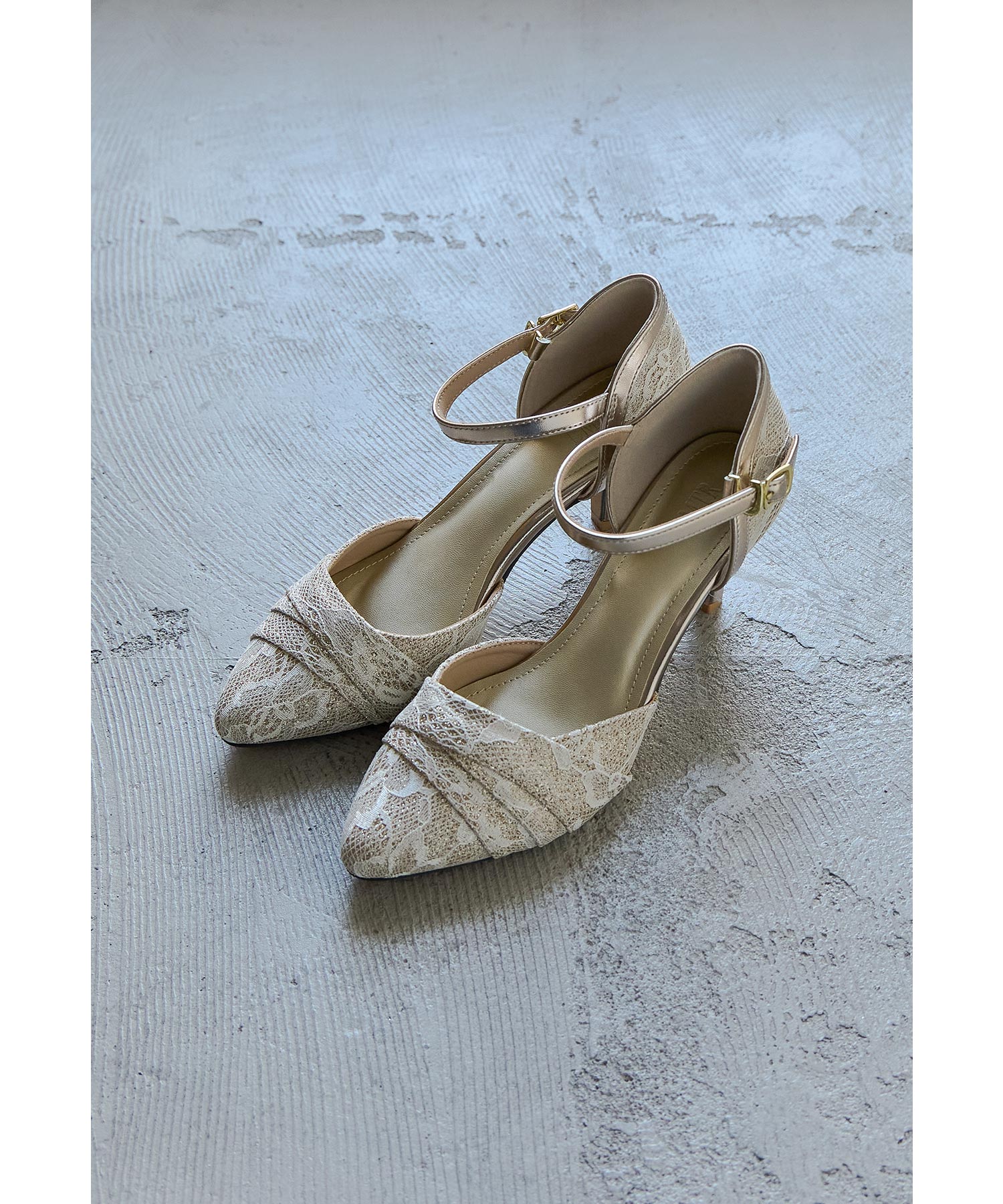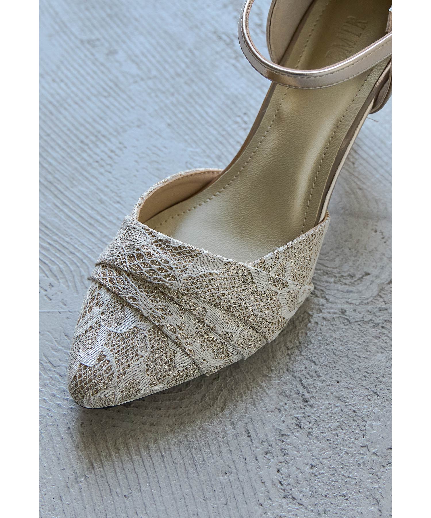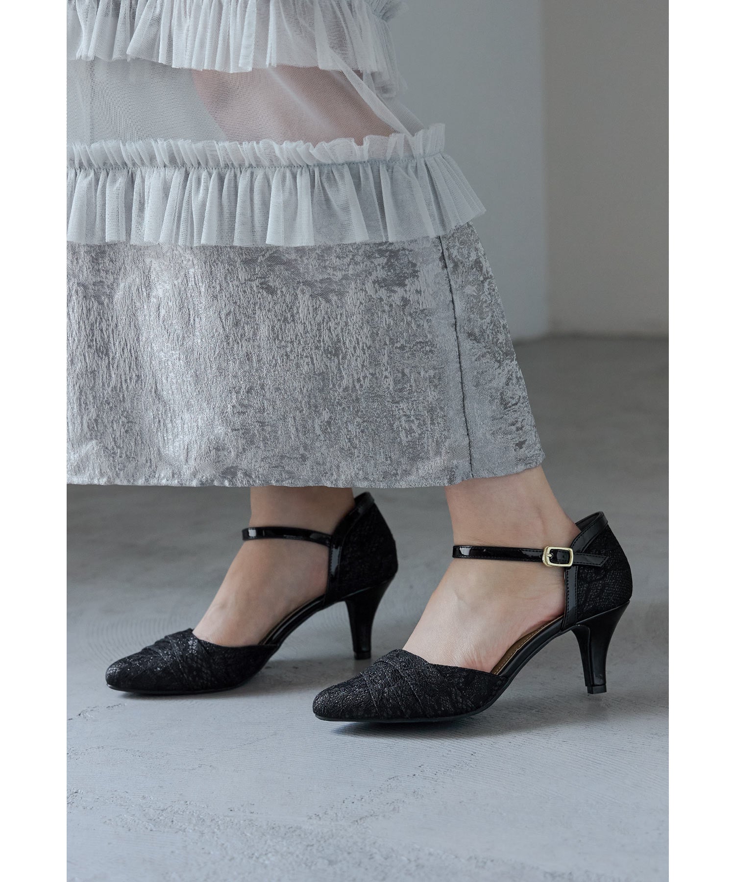 上品に煌めくラメ生地にレースを重ねたパーティーパンプス。