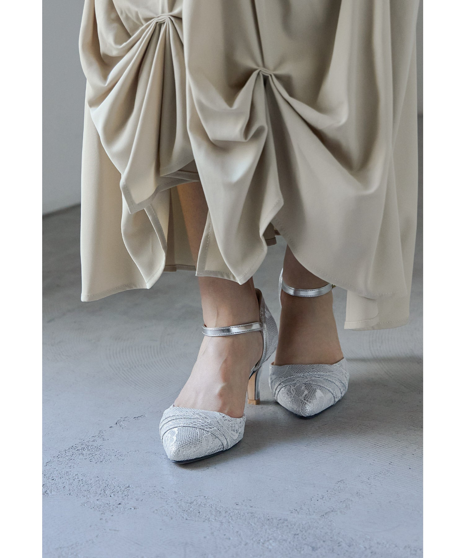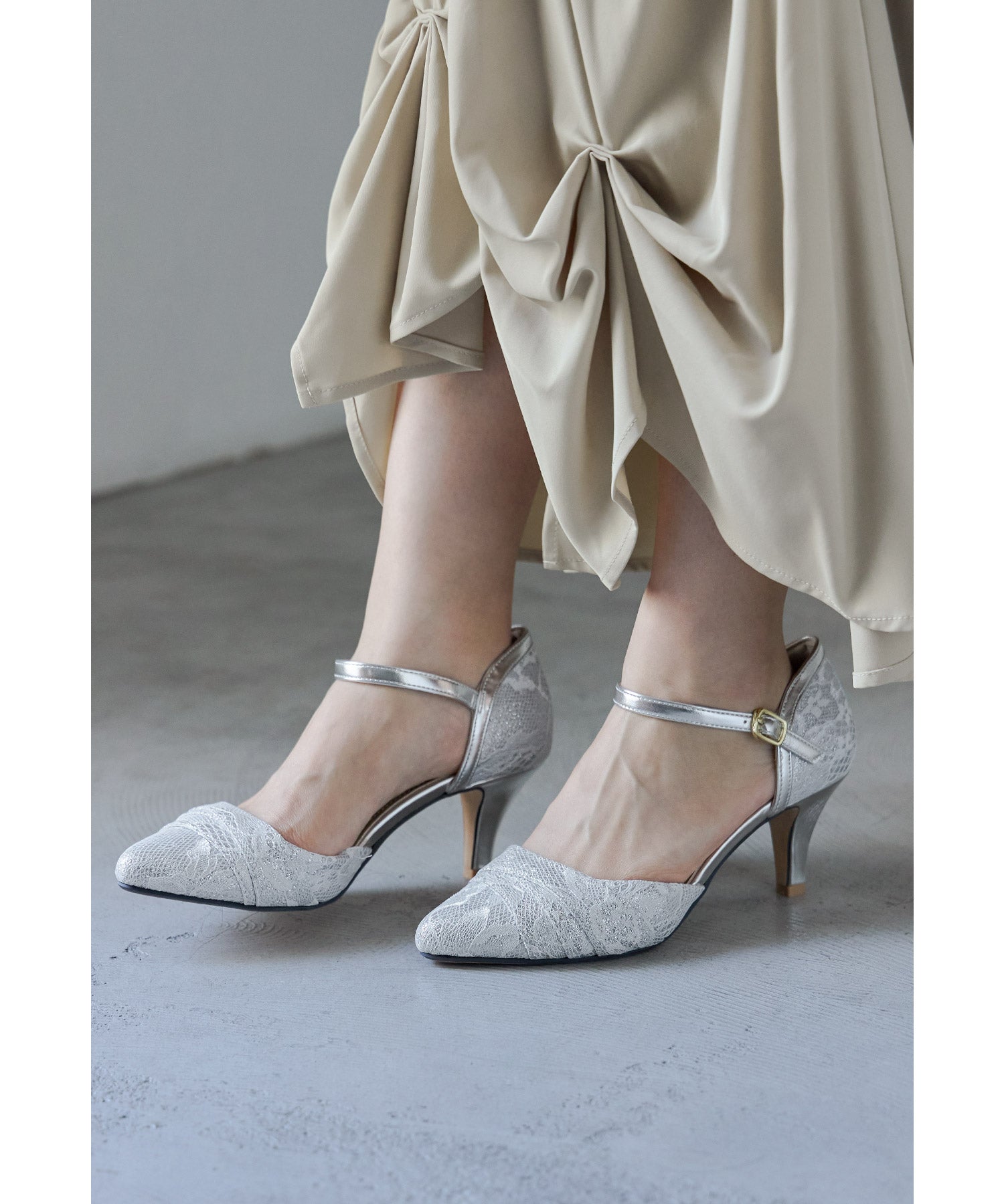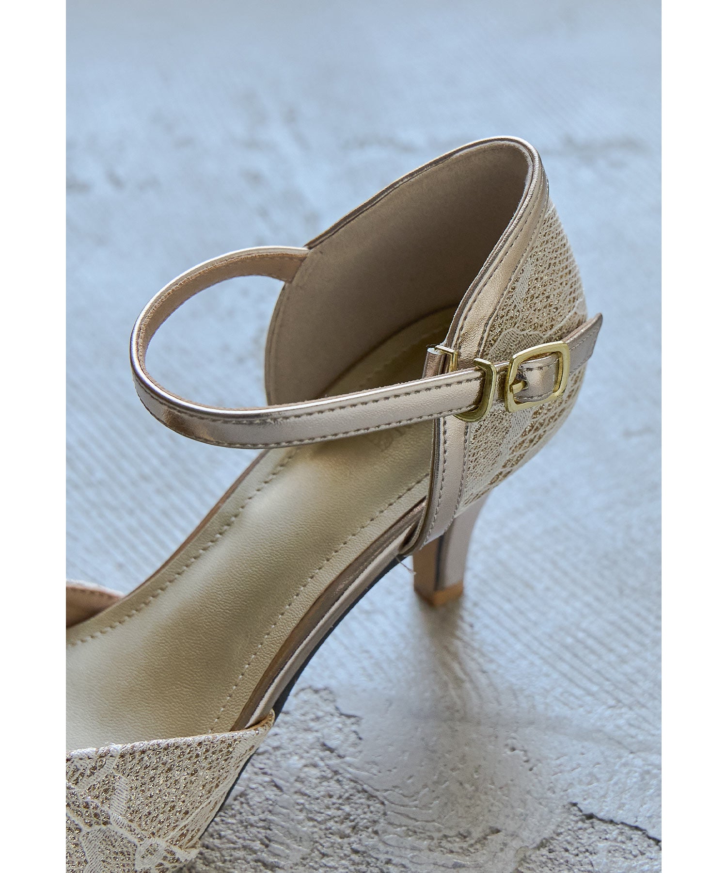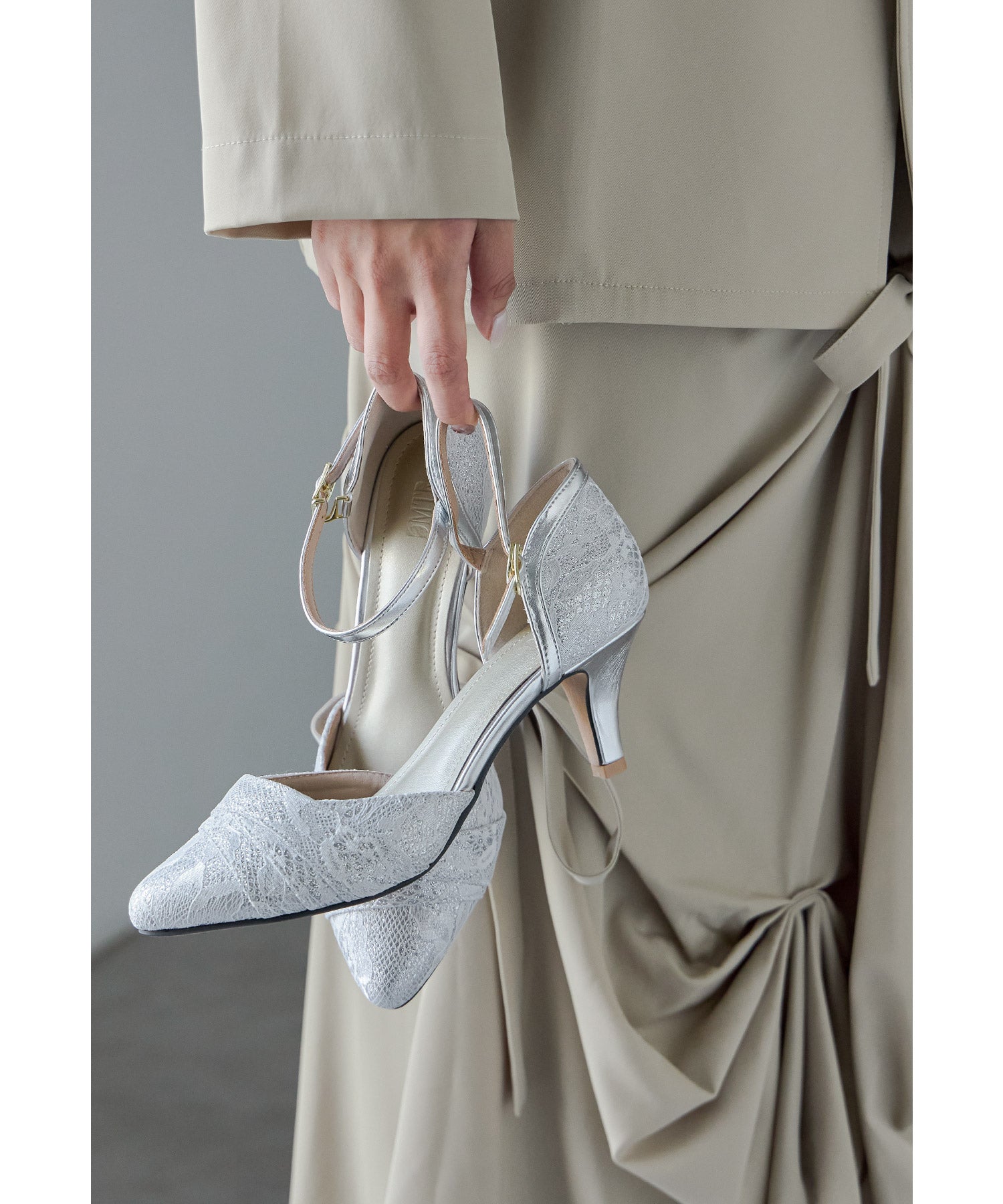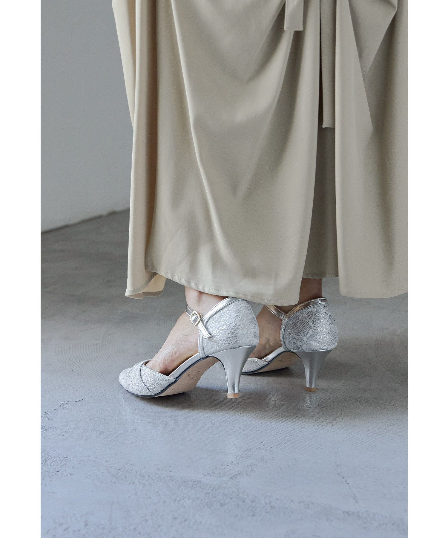 上品に煌めくラメ生地にレースを重ねたパーティーパンプス。