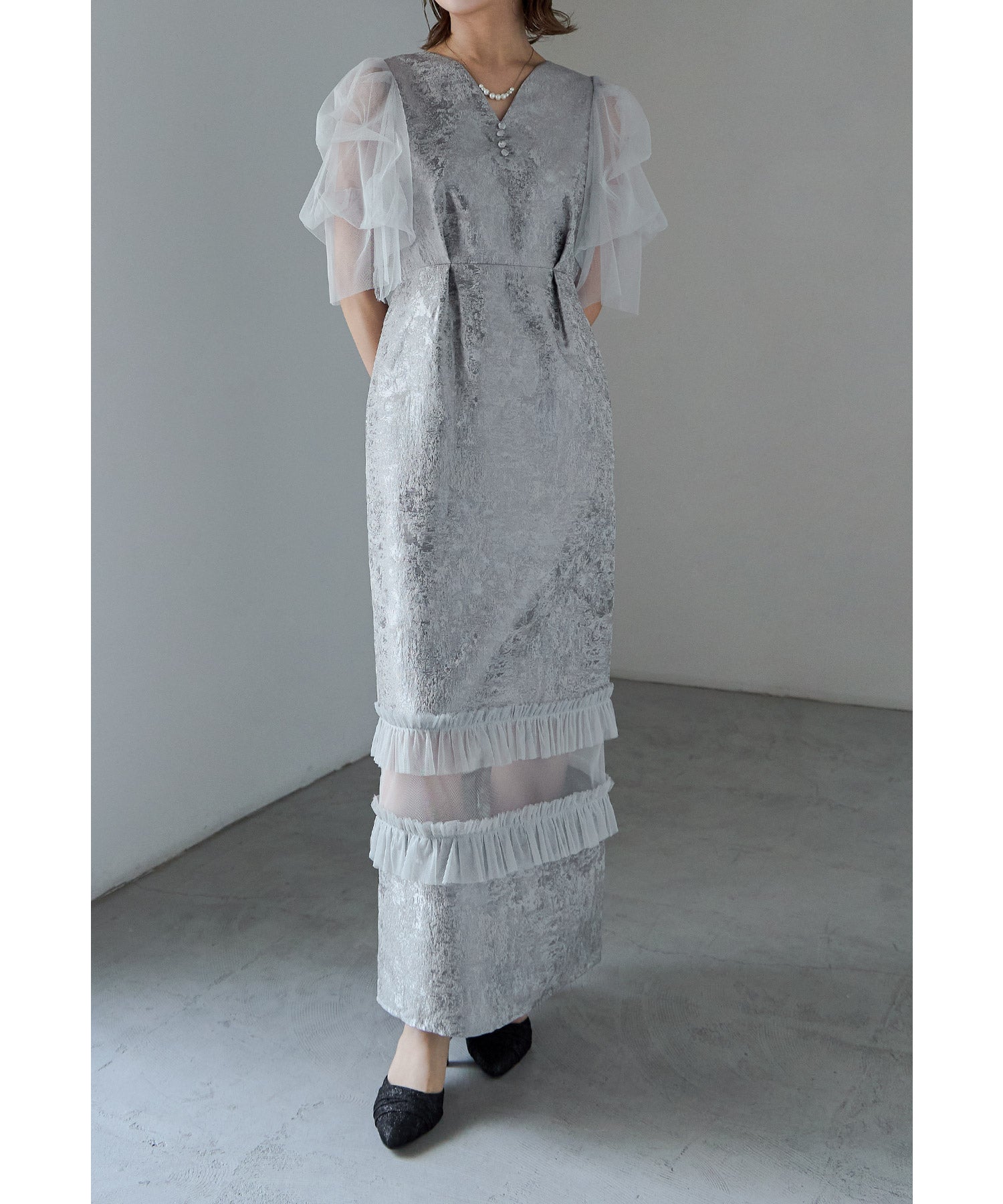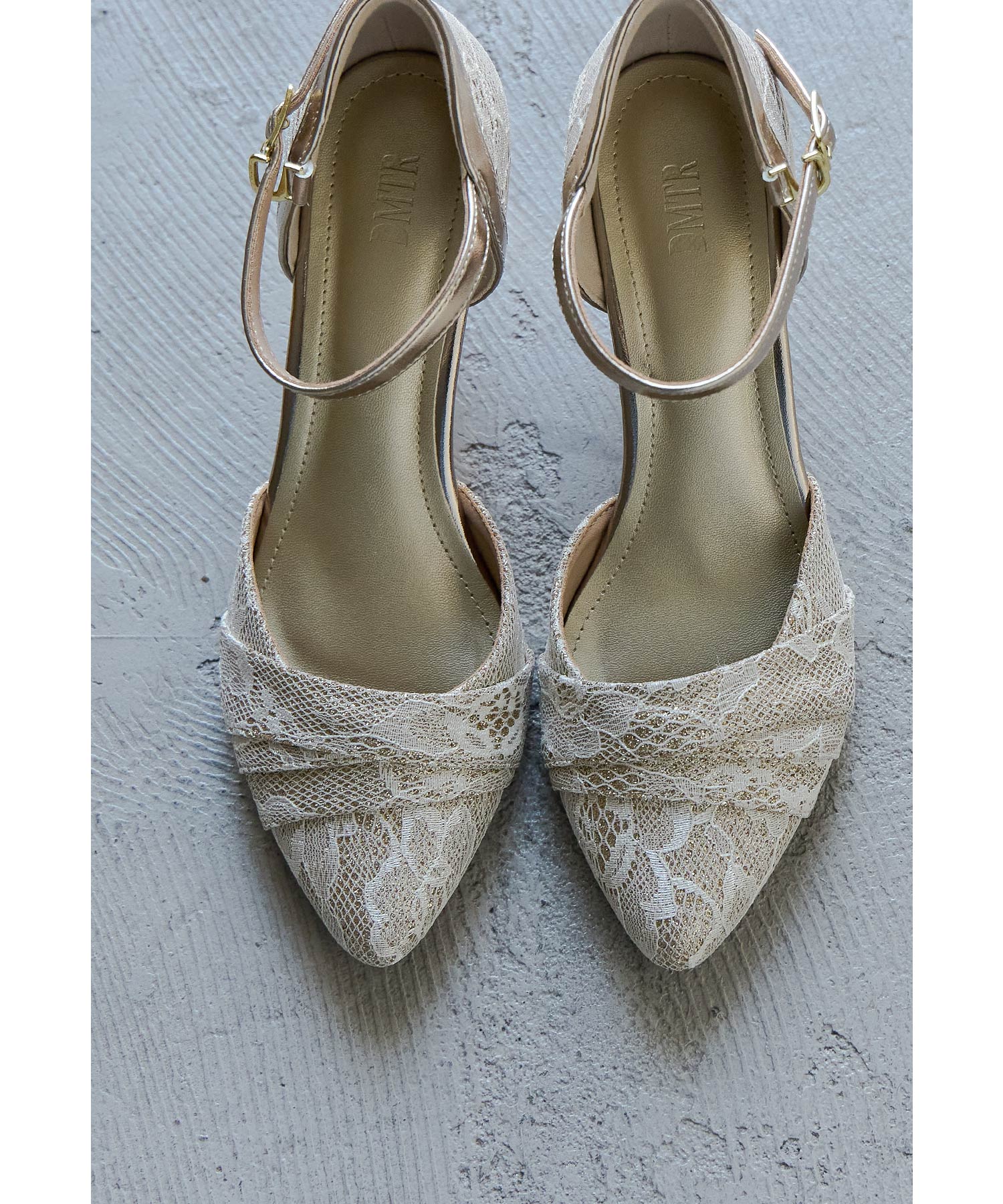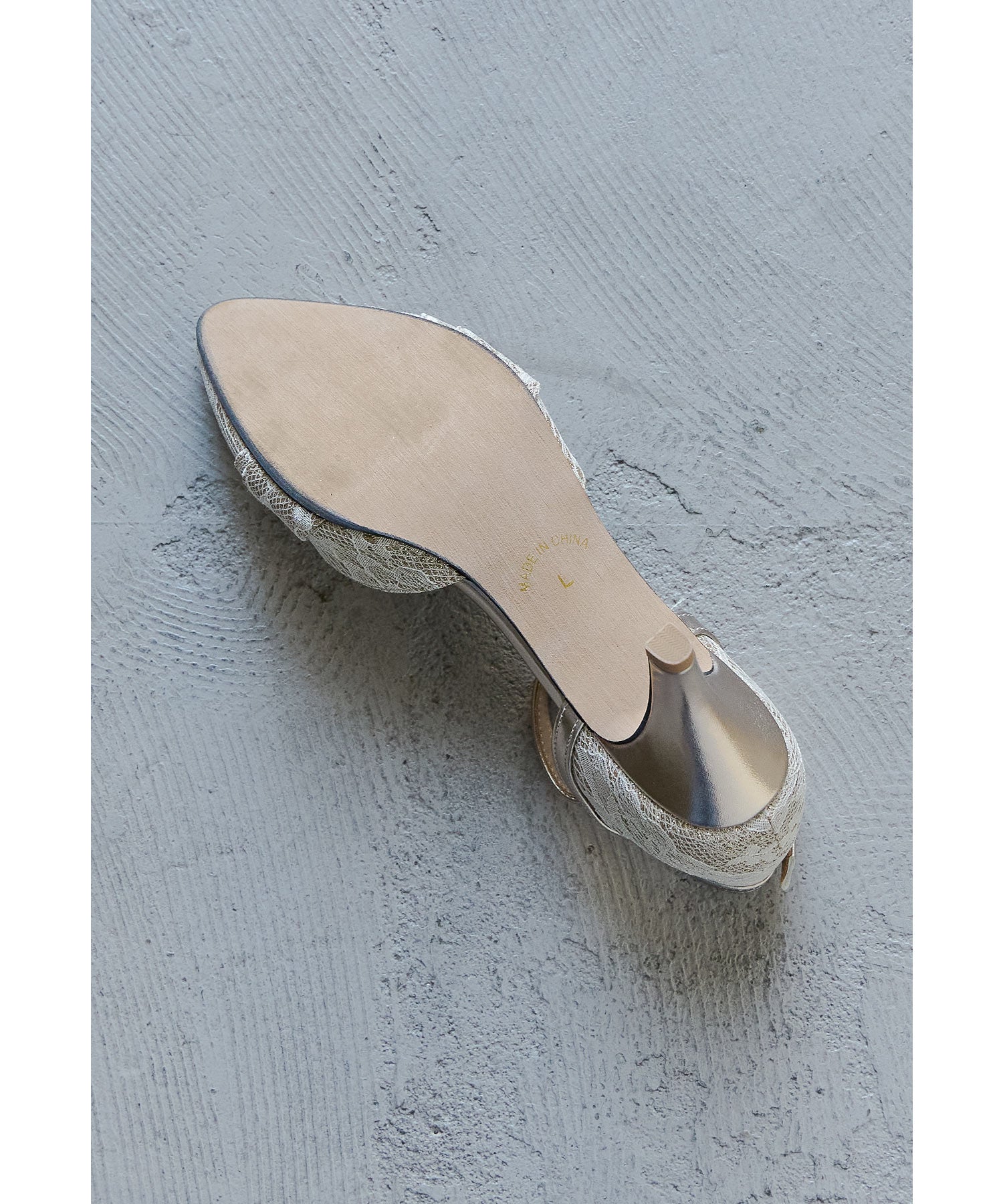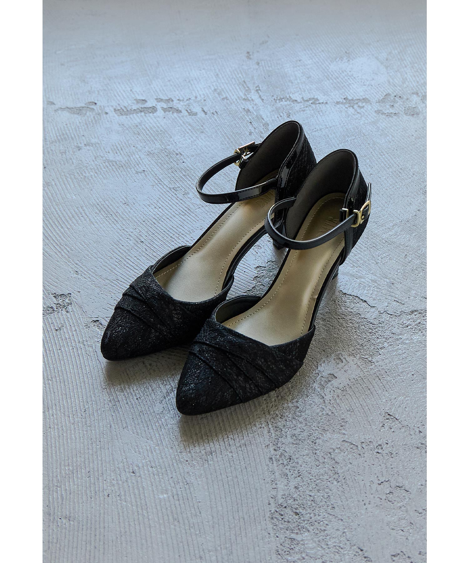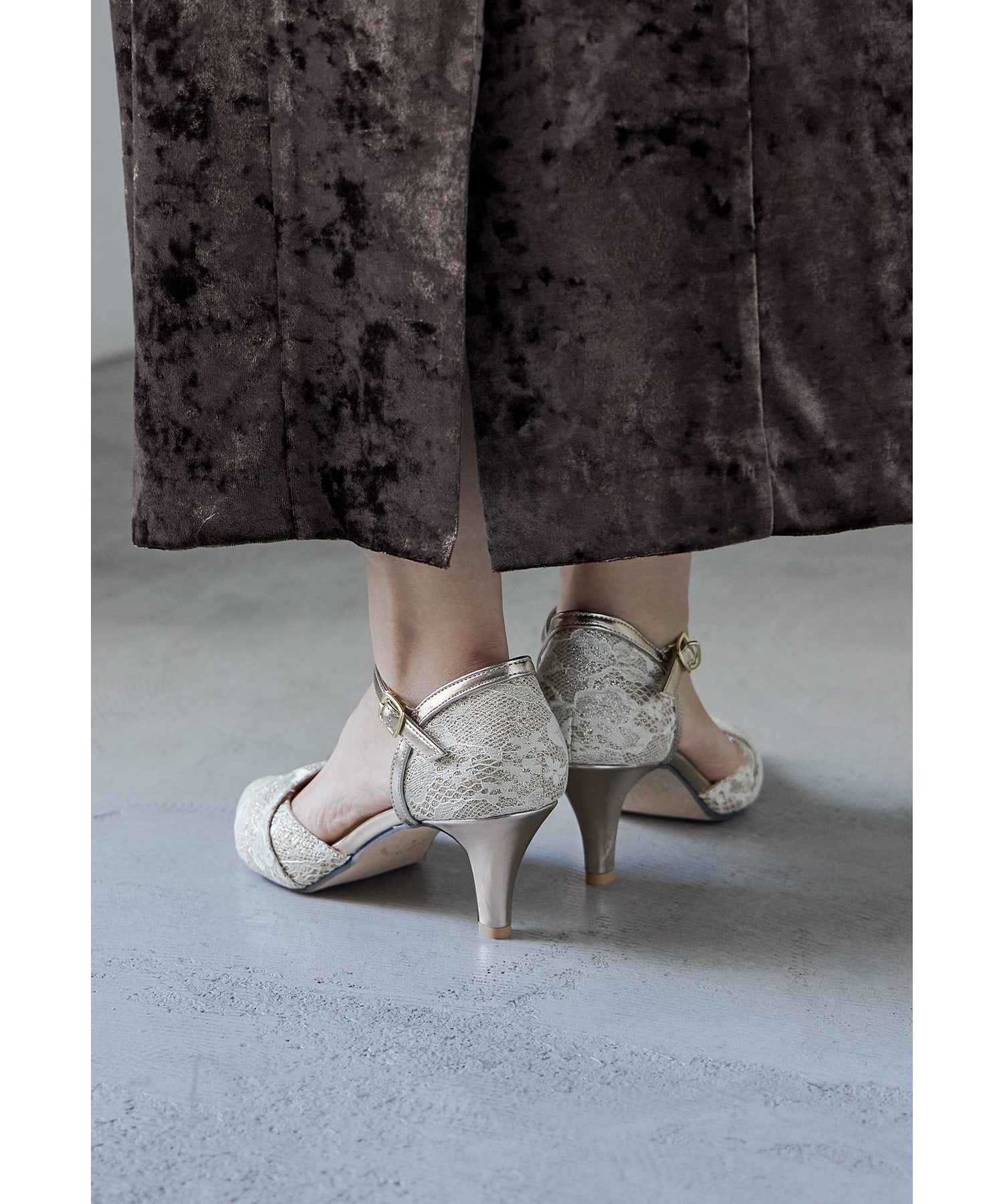 上品に煌めくラメ生地にレースを重ねたパーティーパンプス。