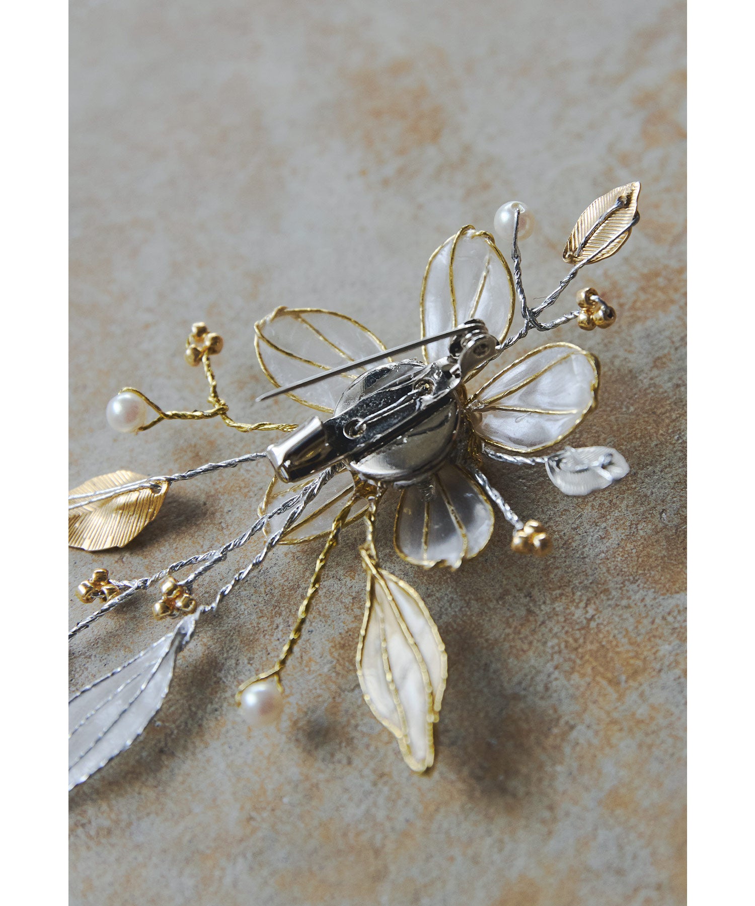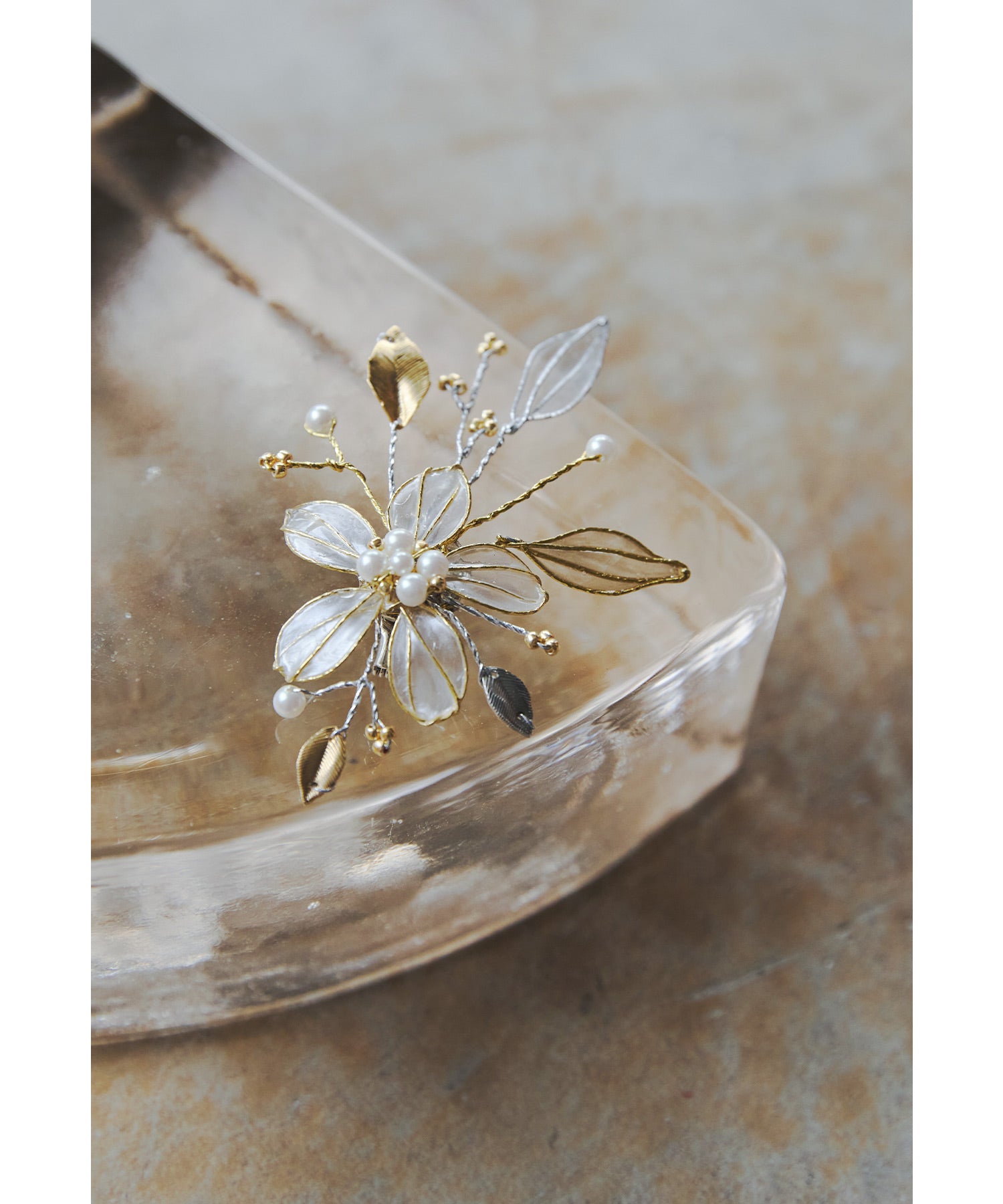 ガラス細工のような透明感のある繊細なアメリカンフラワーで作ったブローチ。