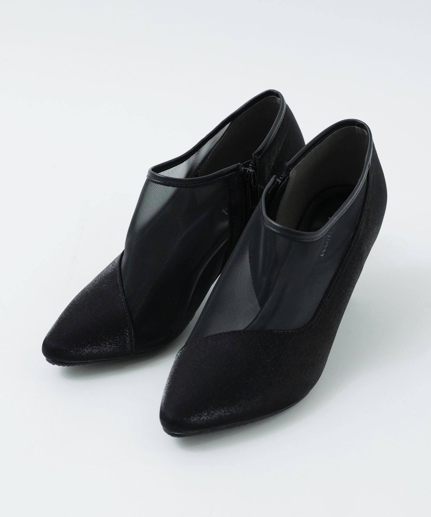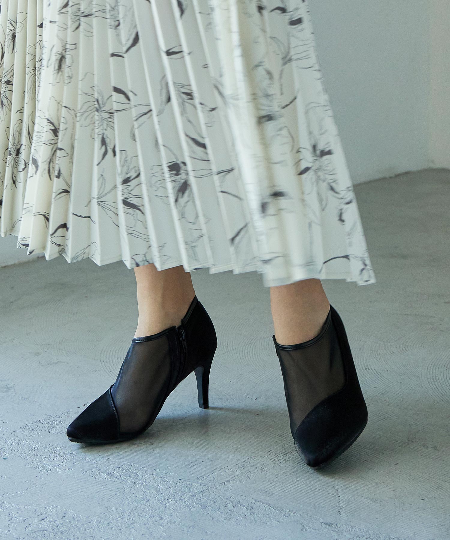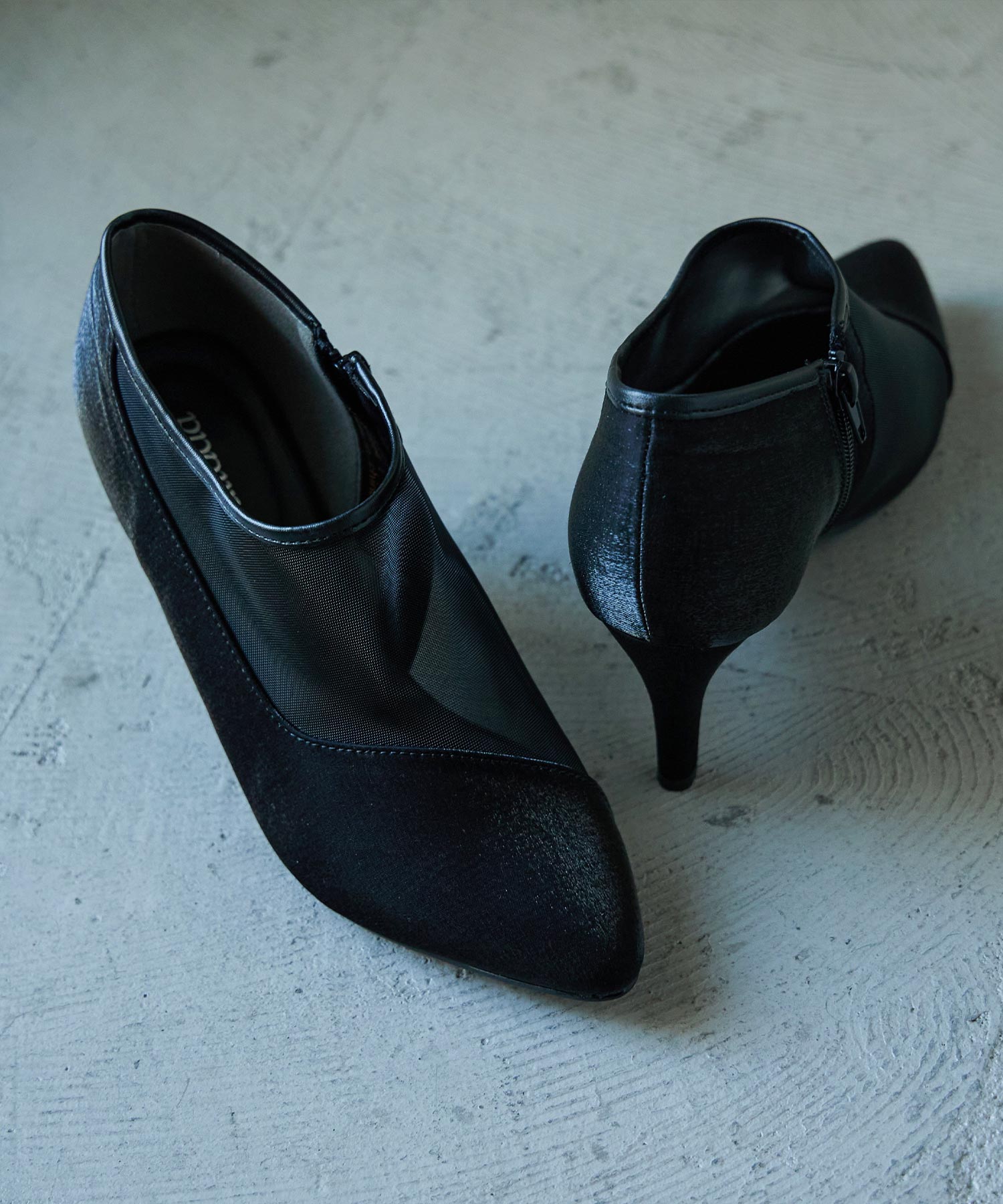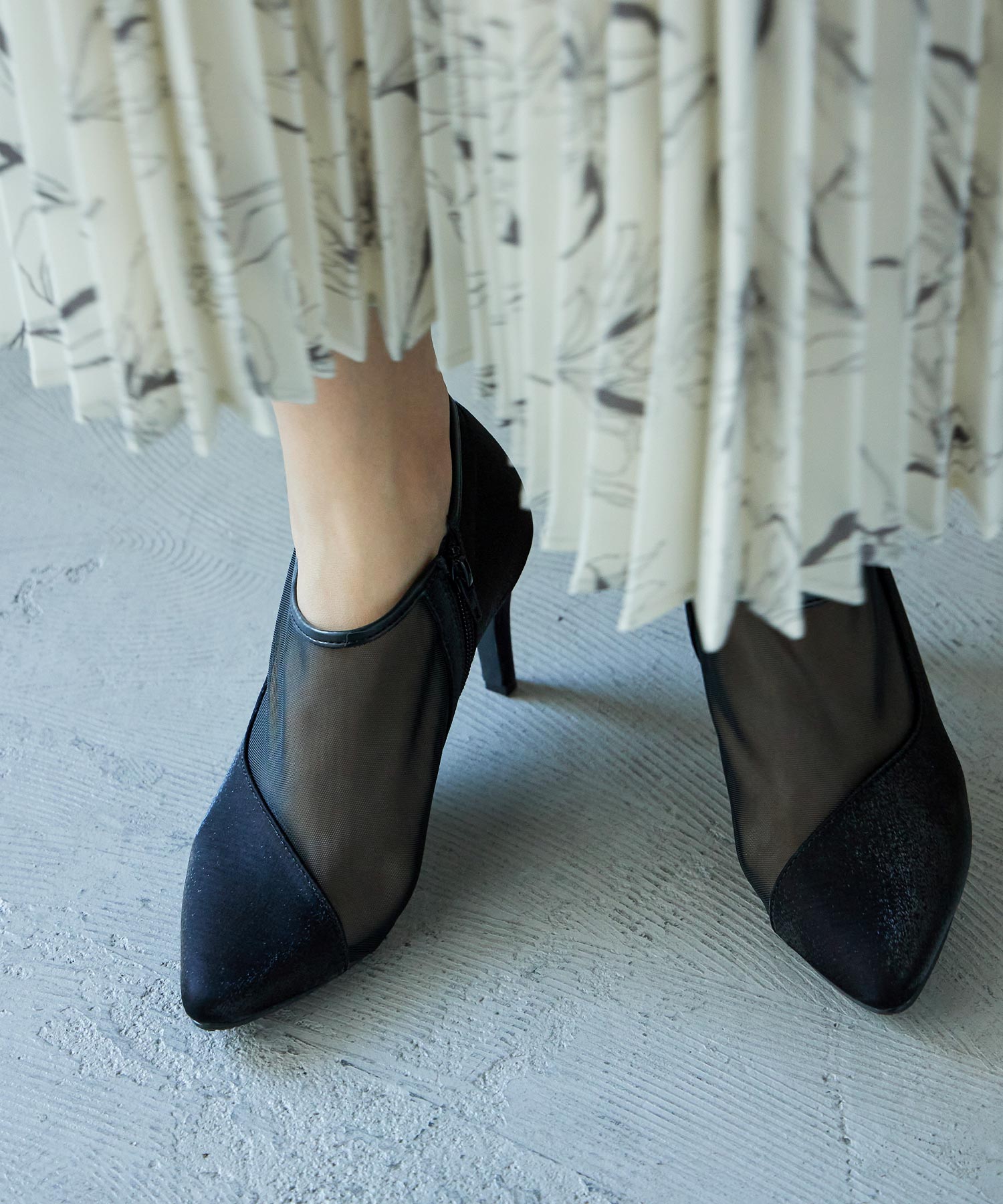 透け感が美しいメッシュ素材のブーティーパンプス。