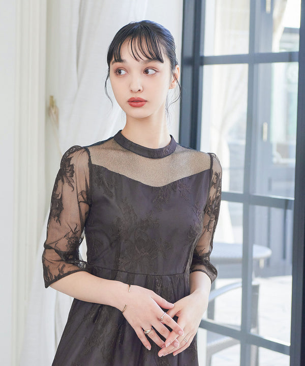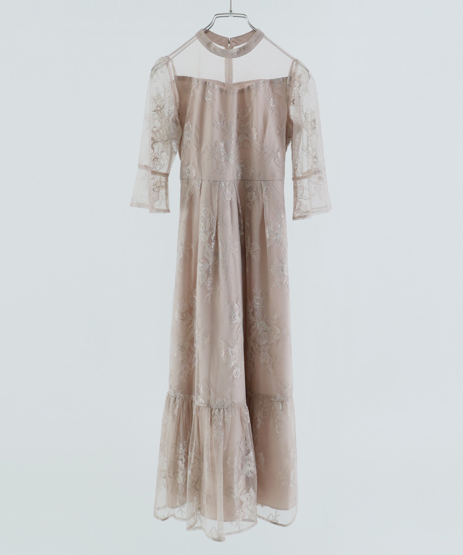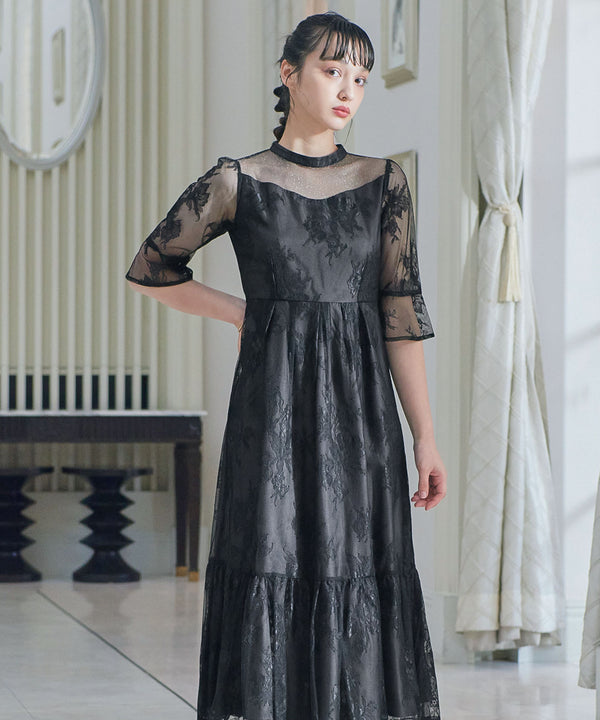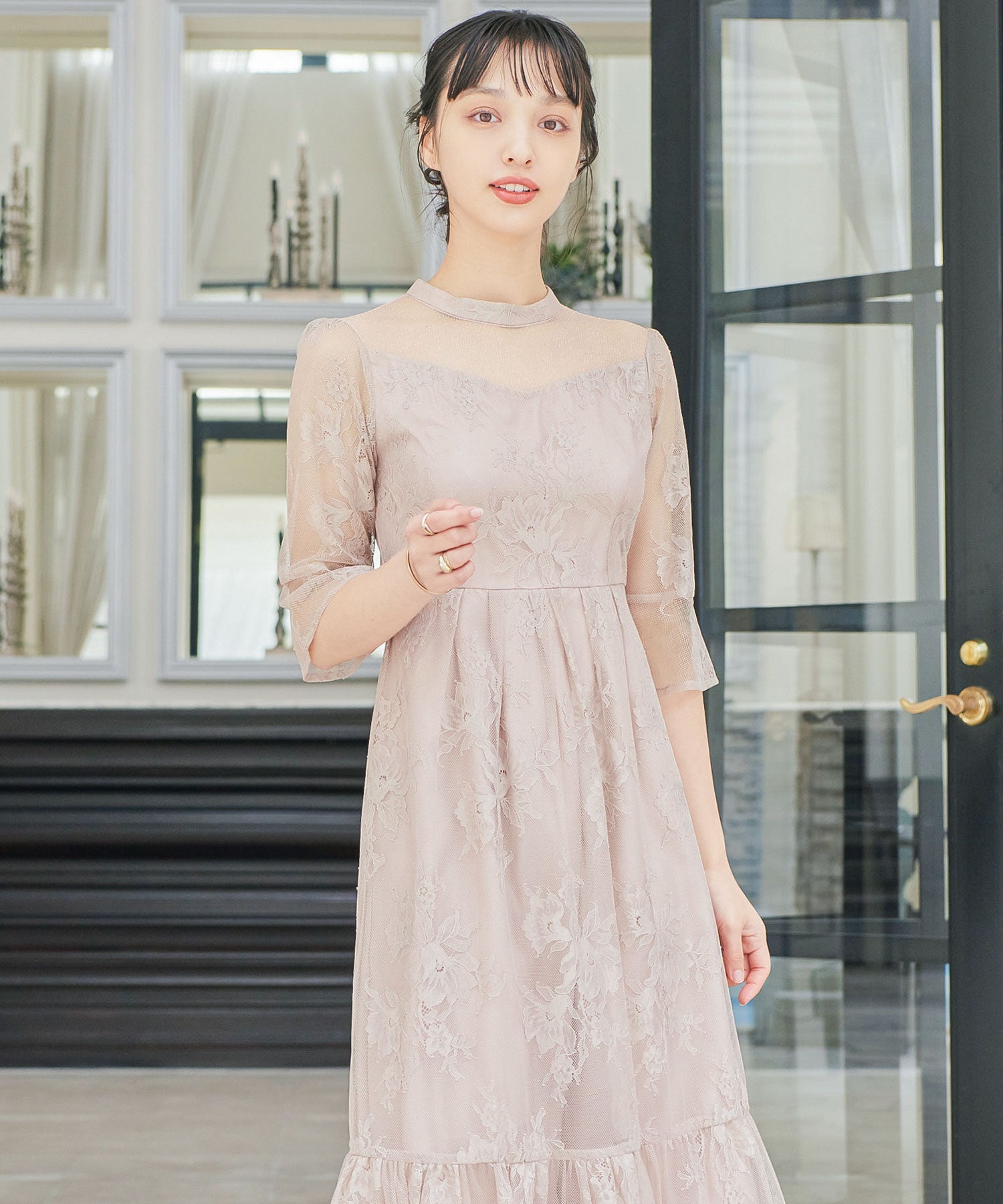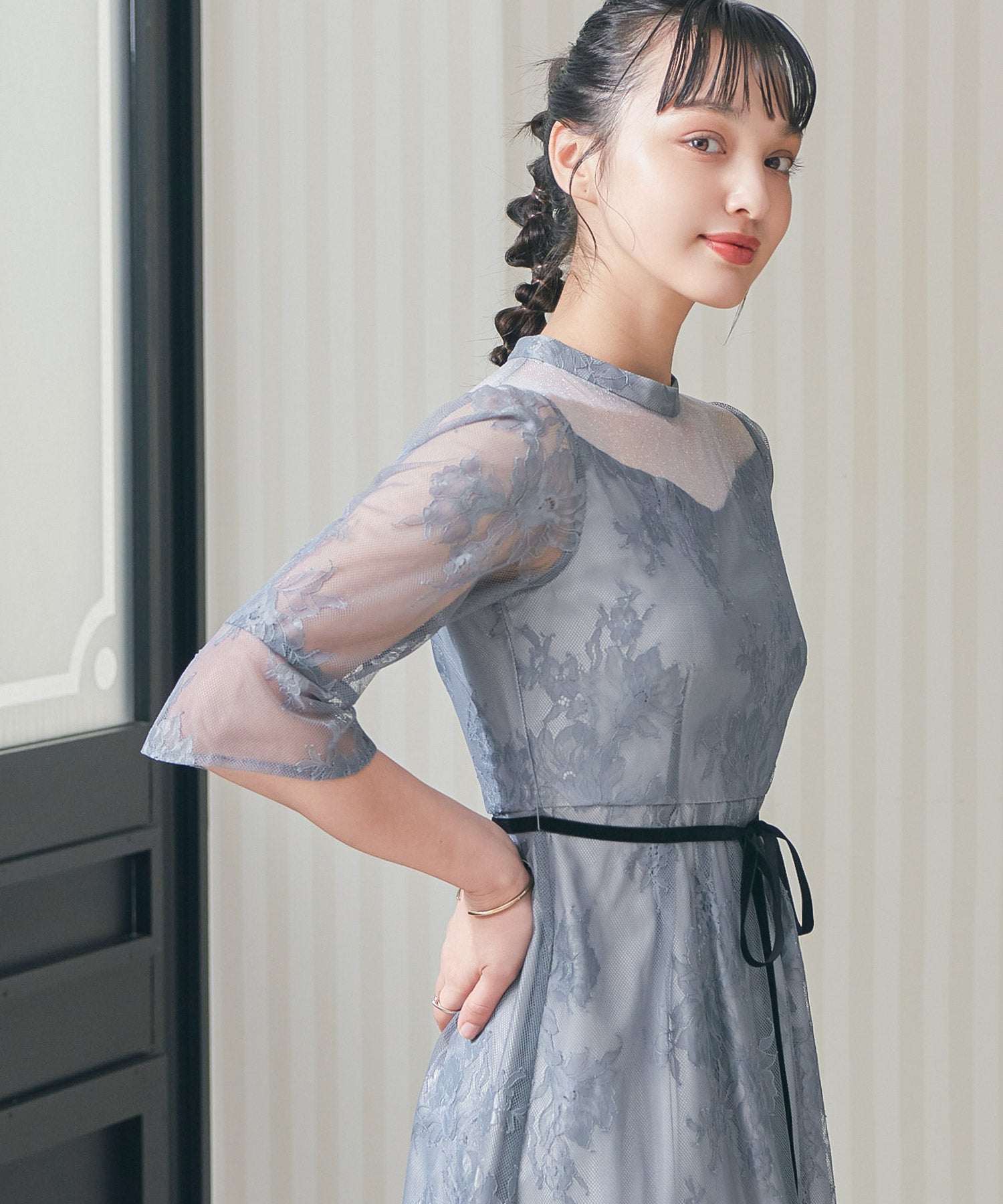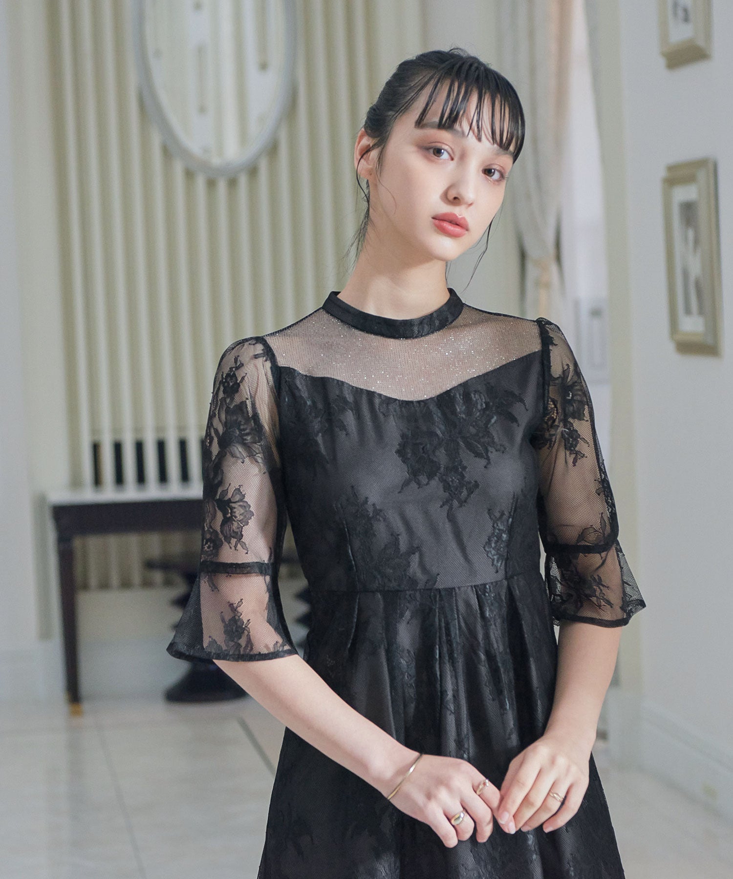 デコルテの透け感が美しいラメチュールとレースを組み合わせたワンピースドレス。