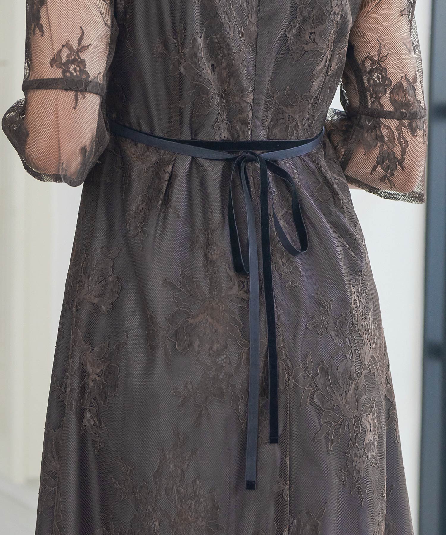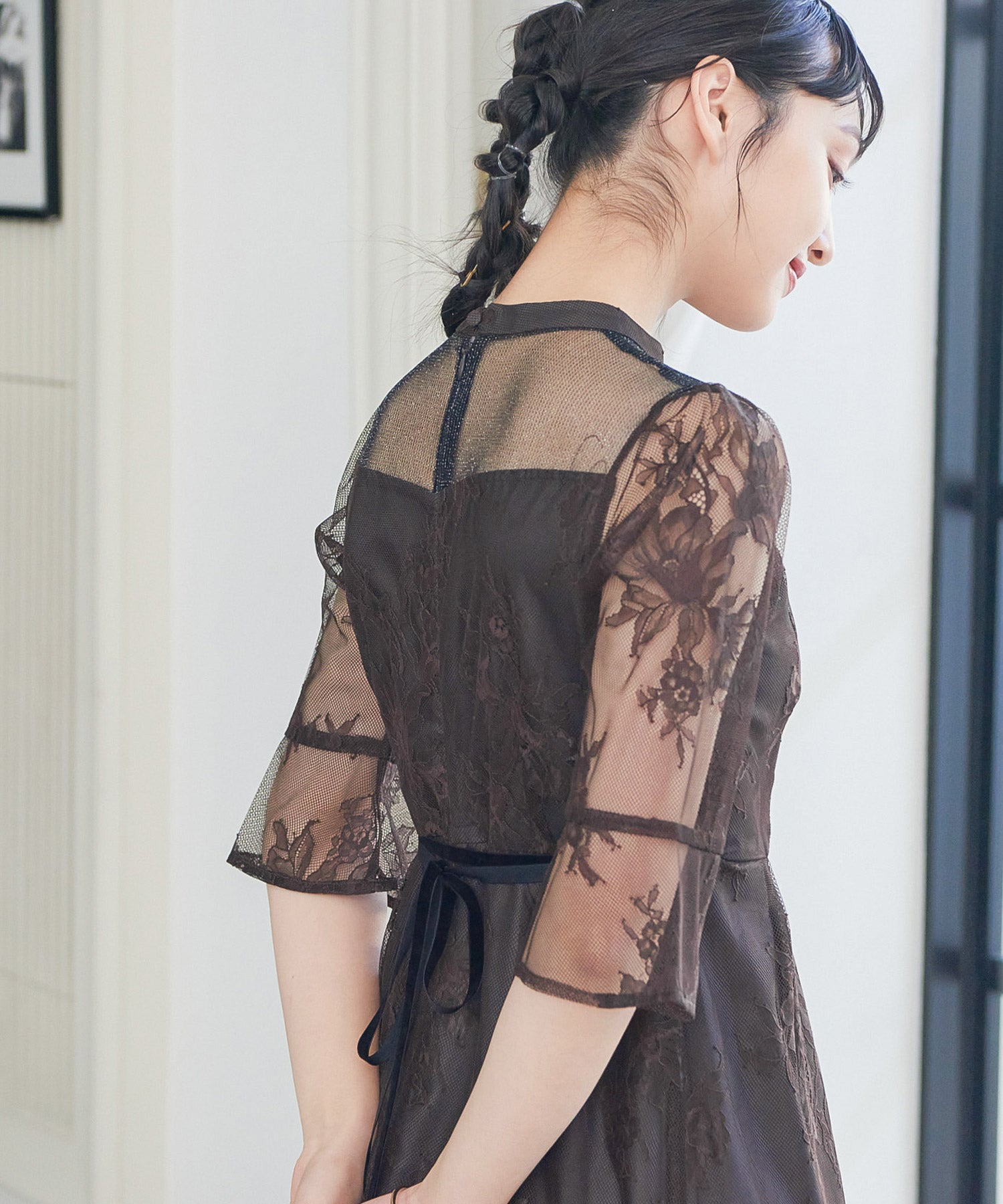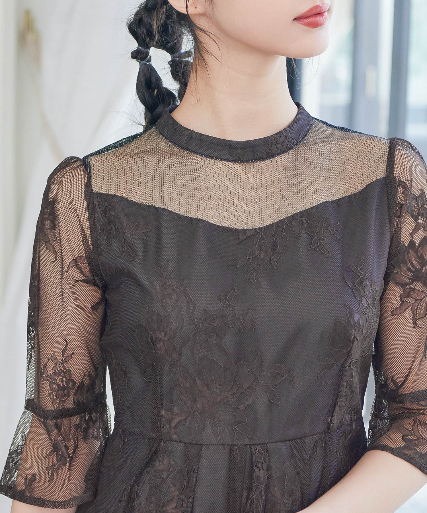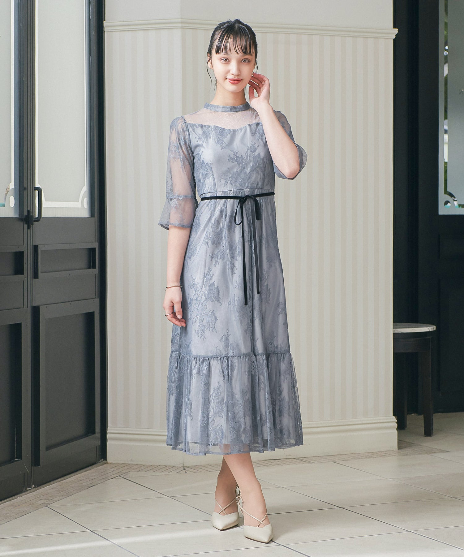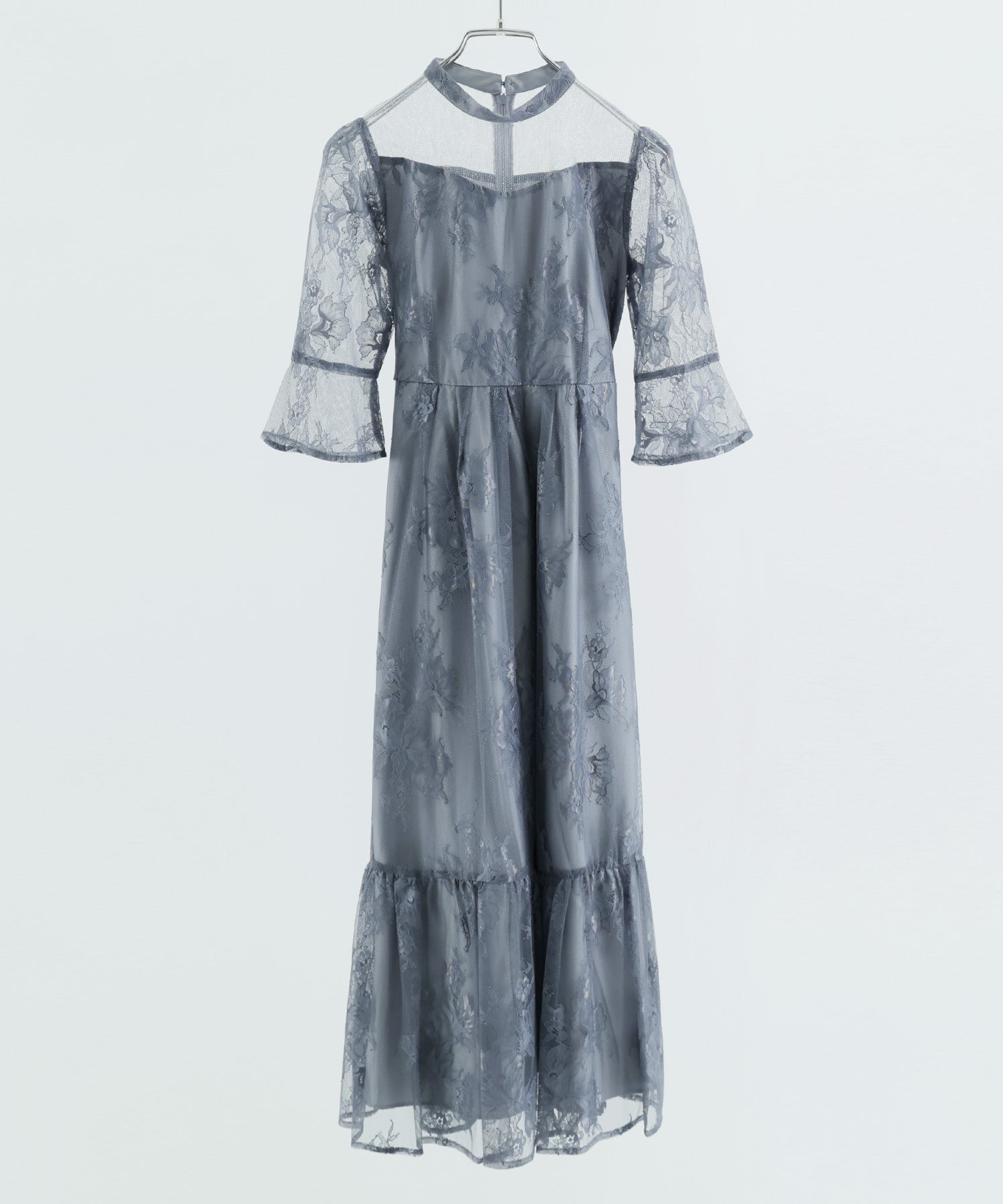 デコルテの透け感が美しいラメチュールとレースを組み合わせたワンピースドレス。
