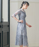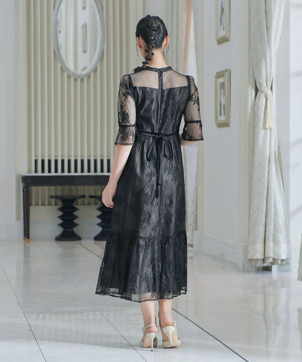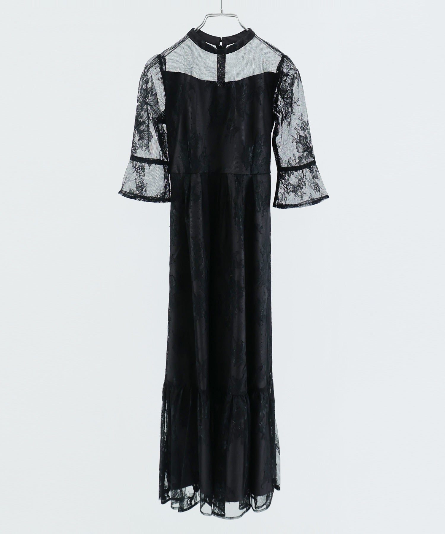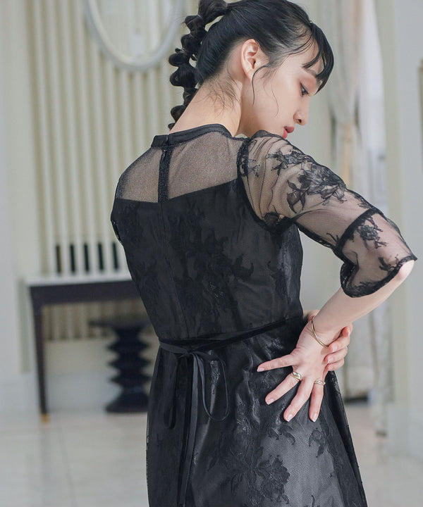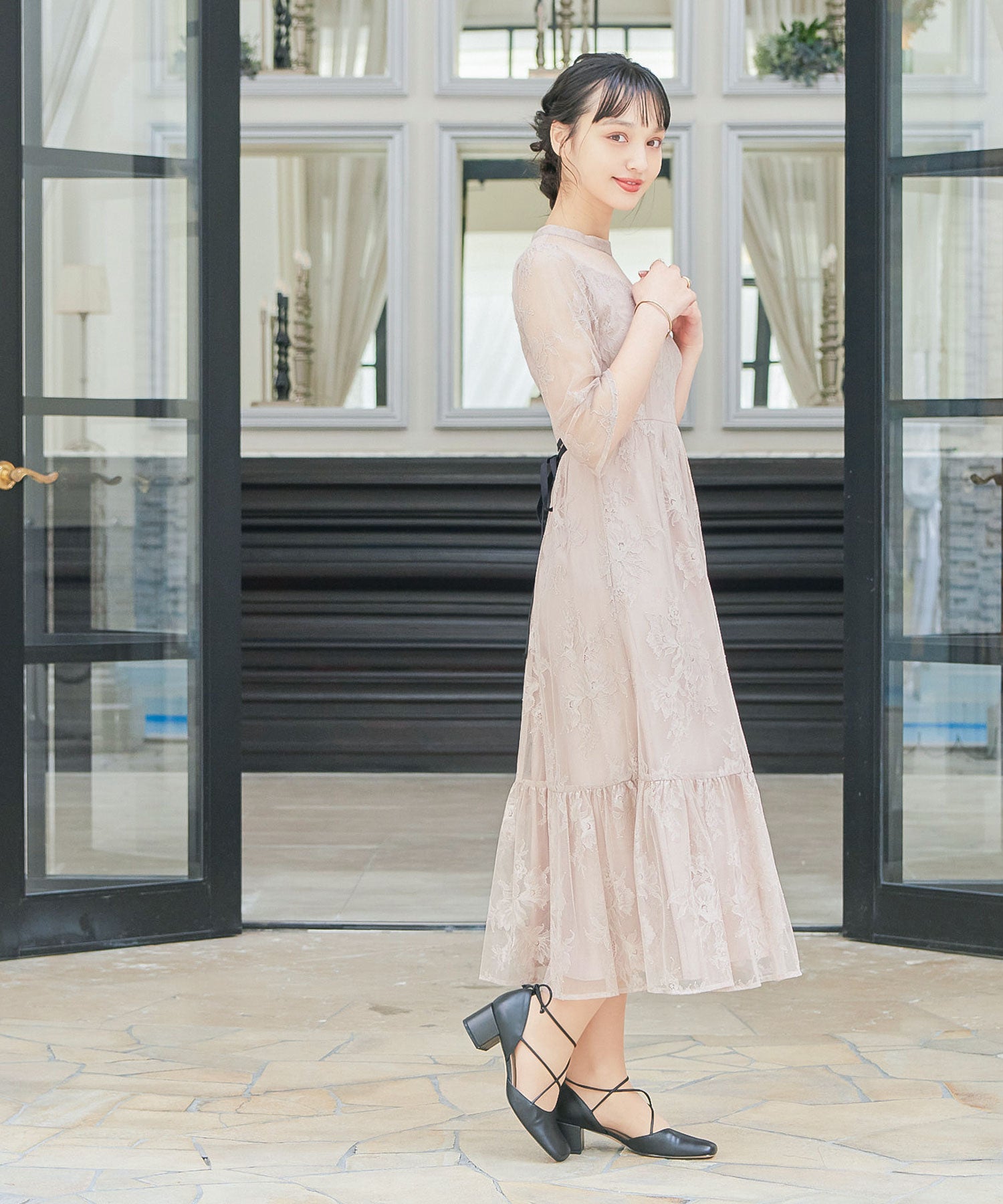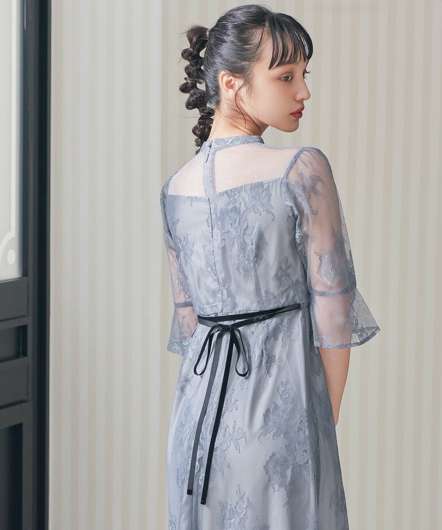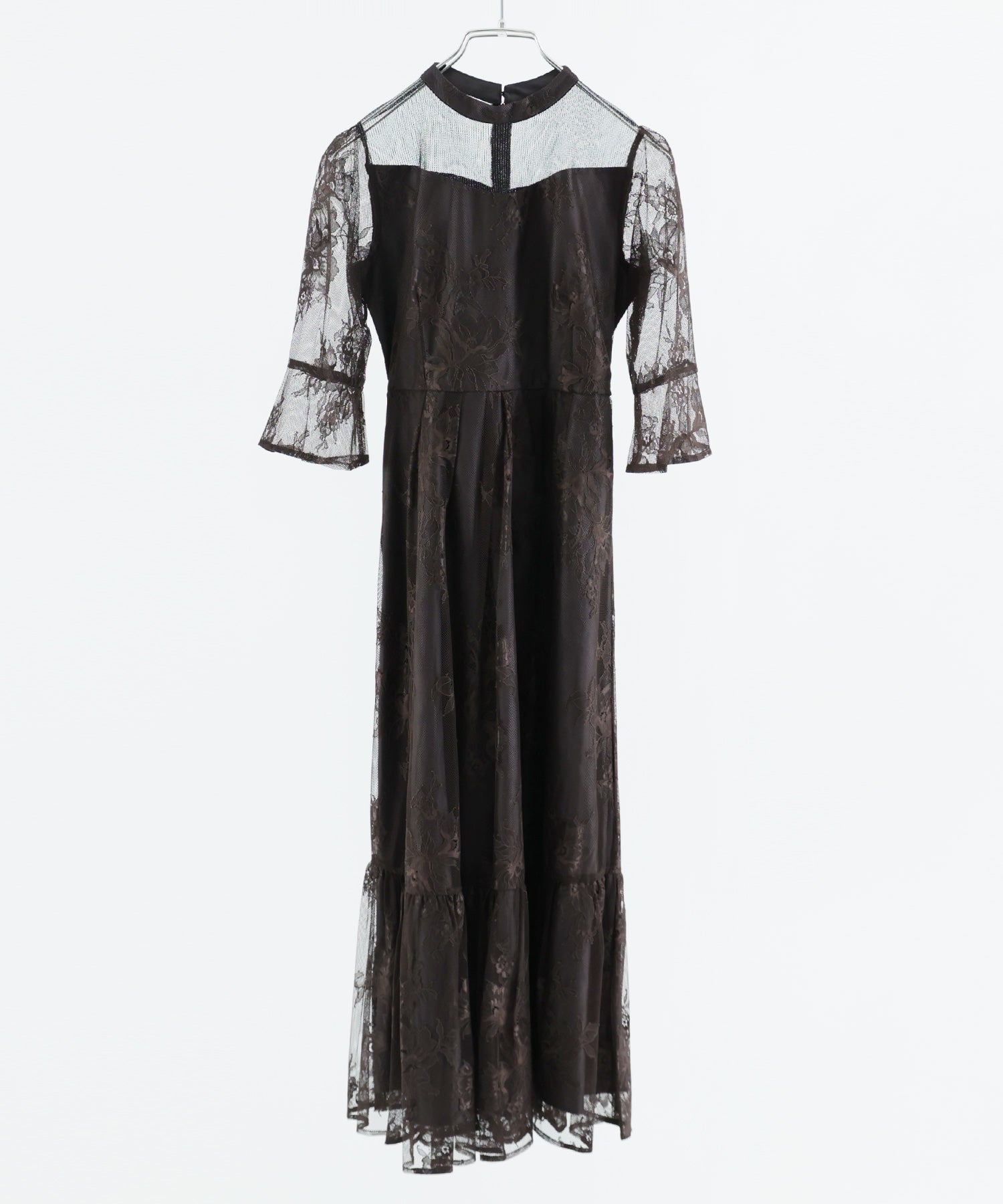 デコルテの透け感が美しいラメチュールとレースを組み合わせたワンピースドレス。
