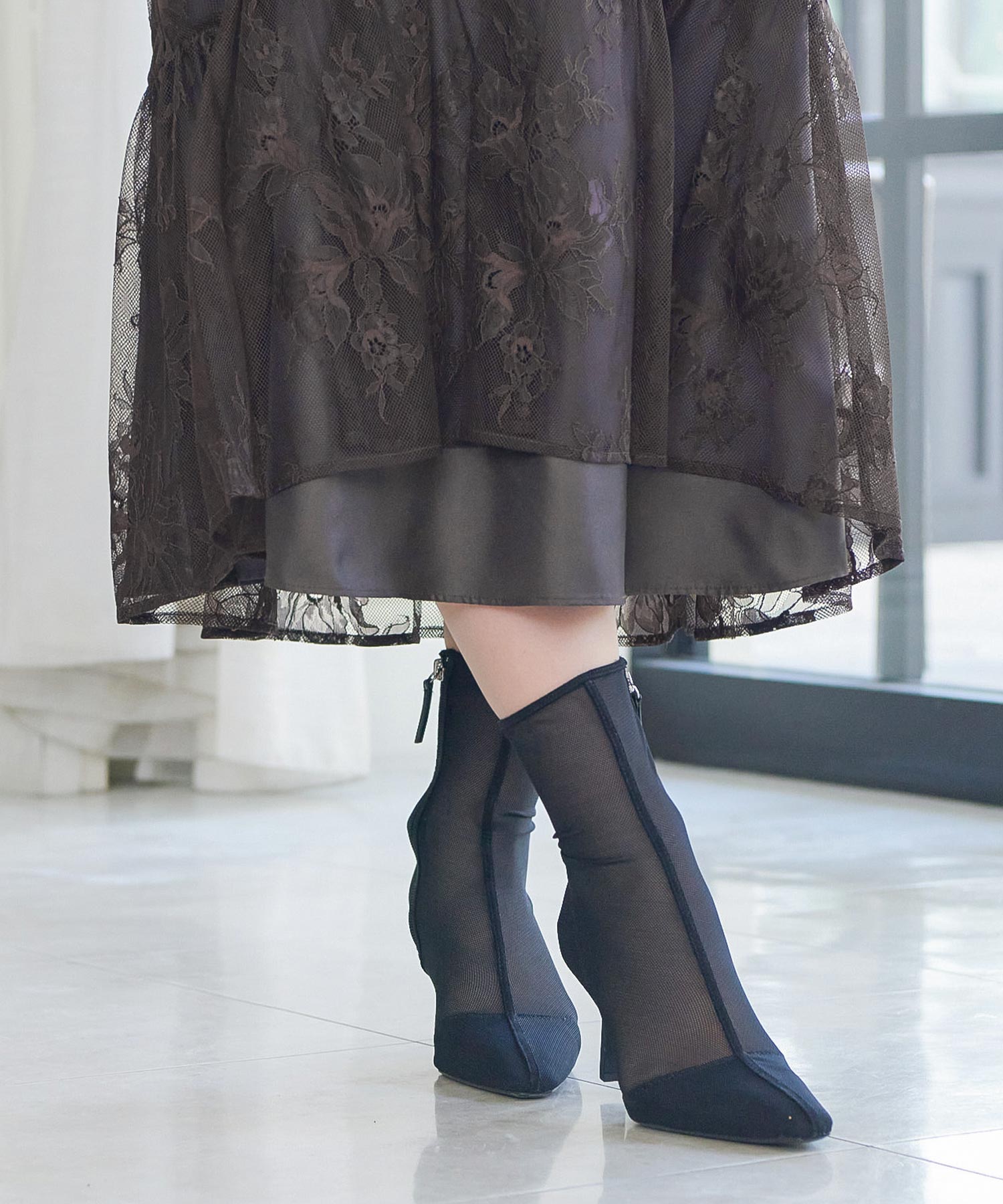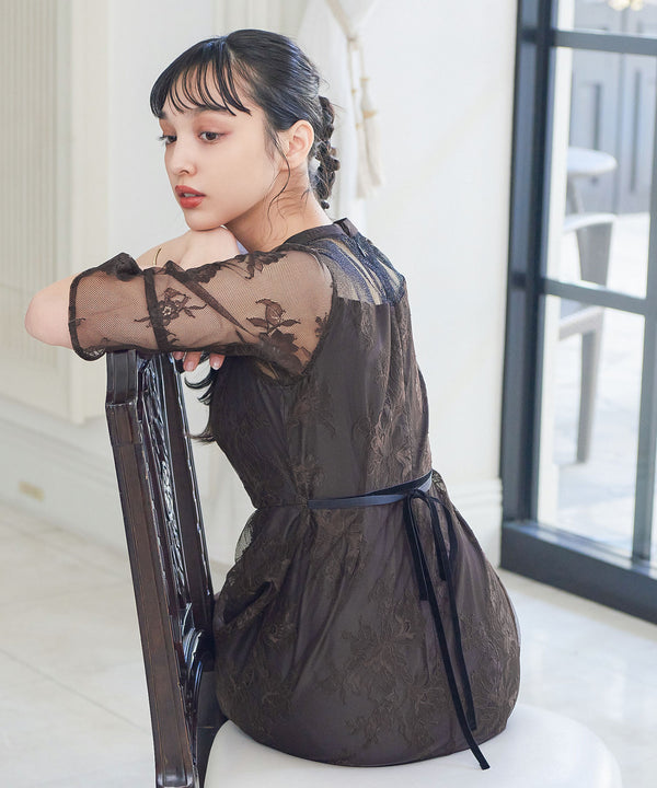 存在感ある大きめの花柄レースをまとい、上品な印象に。