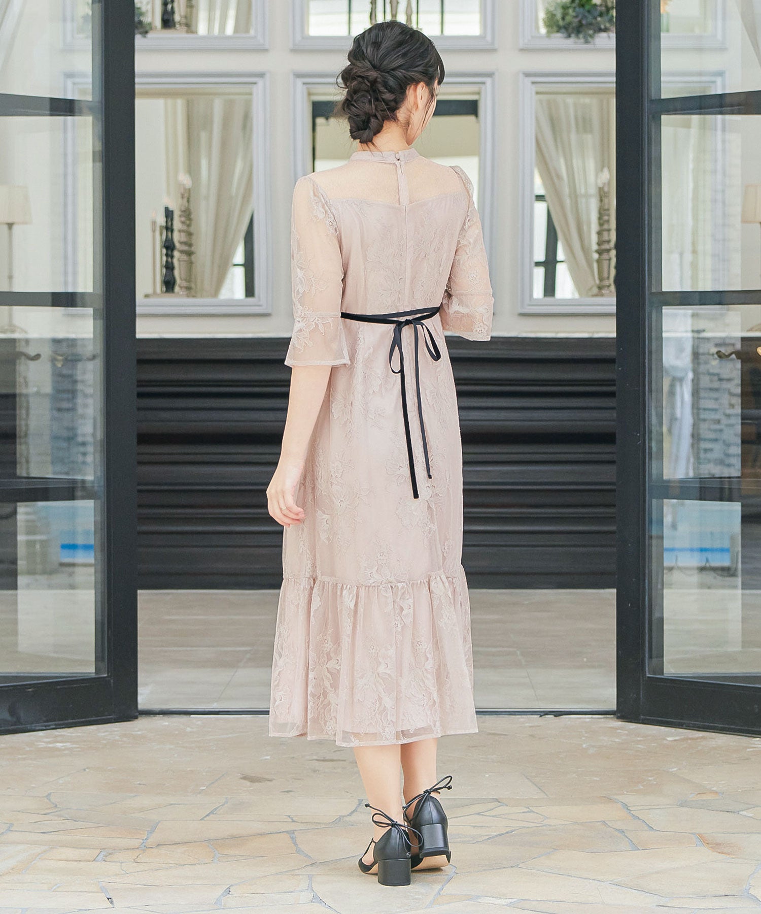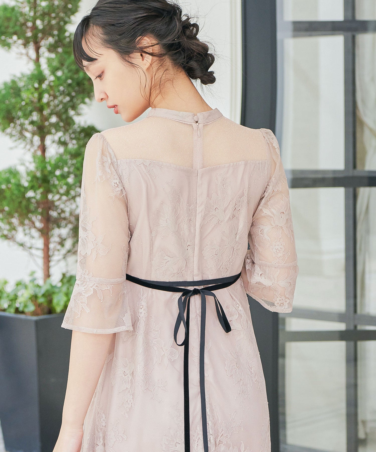 Rname 結婚式 ワンピース パーティードレス レース ラメチュール 切り替え ロング丈 袖あり 半袖 五分袖 花柄 総レース フレア ウエストリボン ロングドレス オケージョン 1.5次会 春夏 秋冬 二次会 謝恩会 成人式 同窓会 女子会 お呼ばれ 入学式 卒業式 おしゃれ かわいい