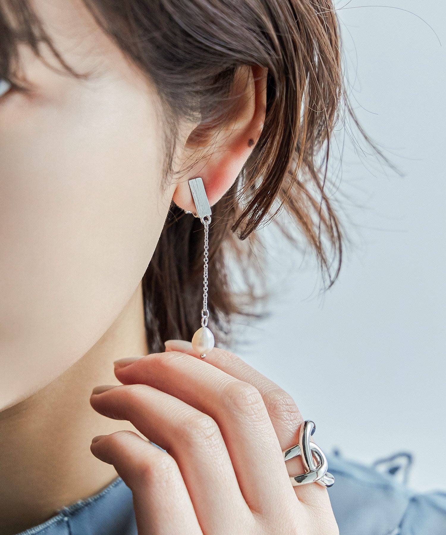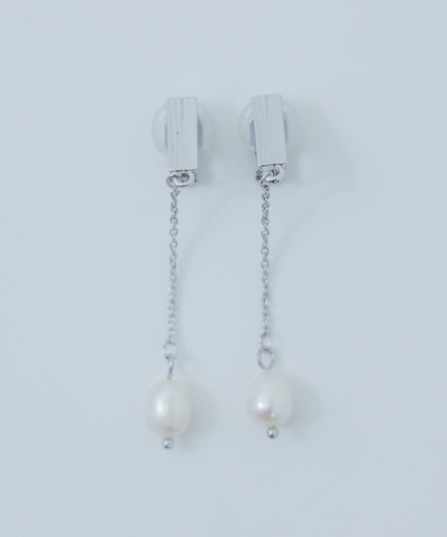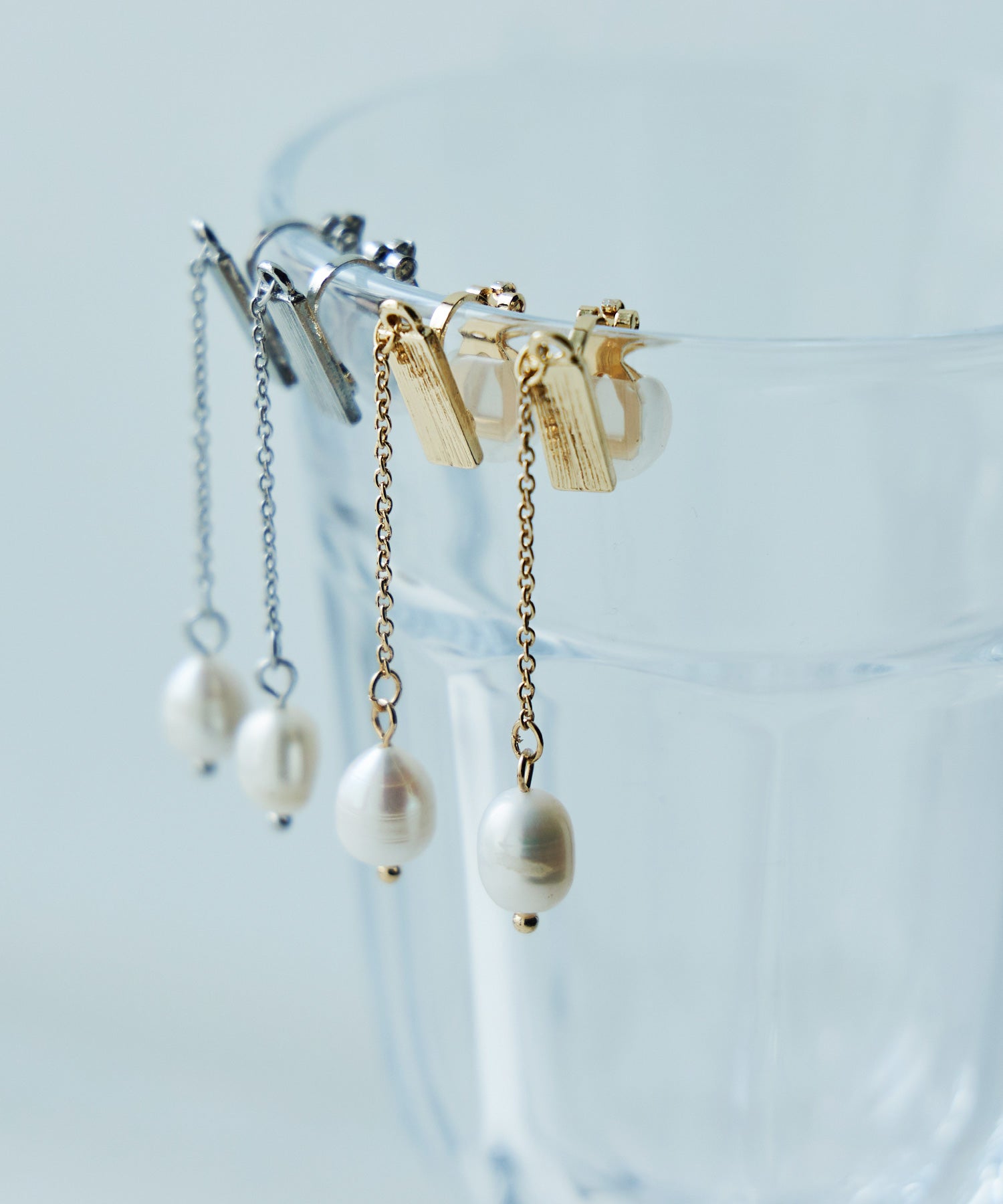 小さめのメタルプレートとゆらゆら揺れる淡水風パールを組み合わせたイヤリング。