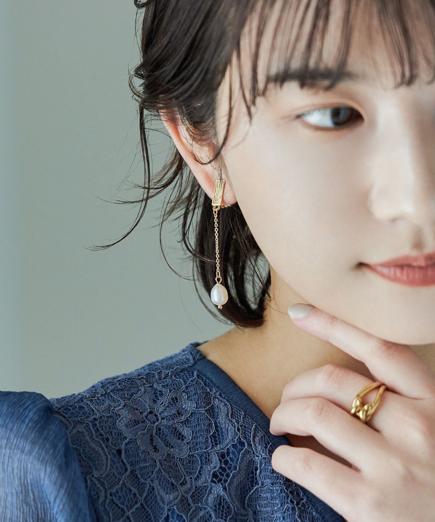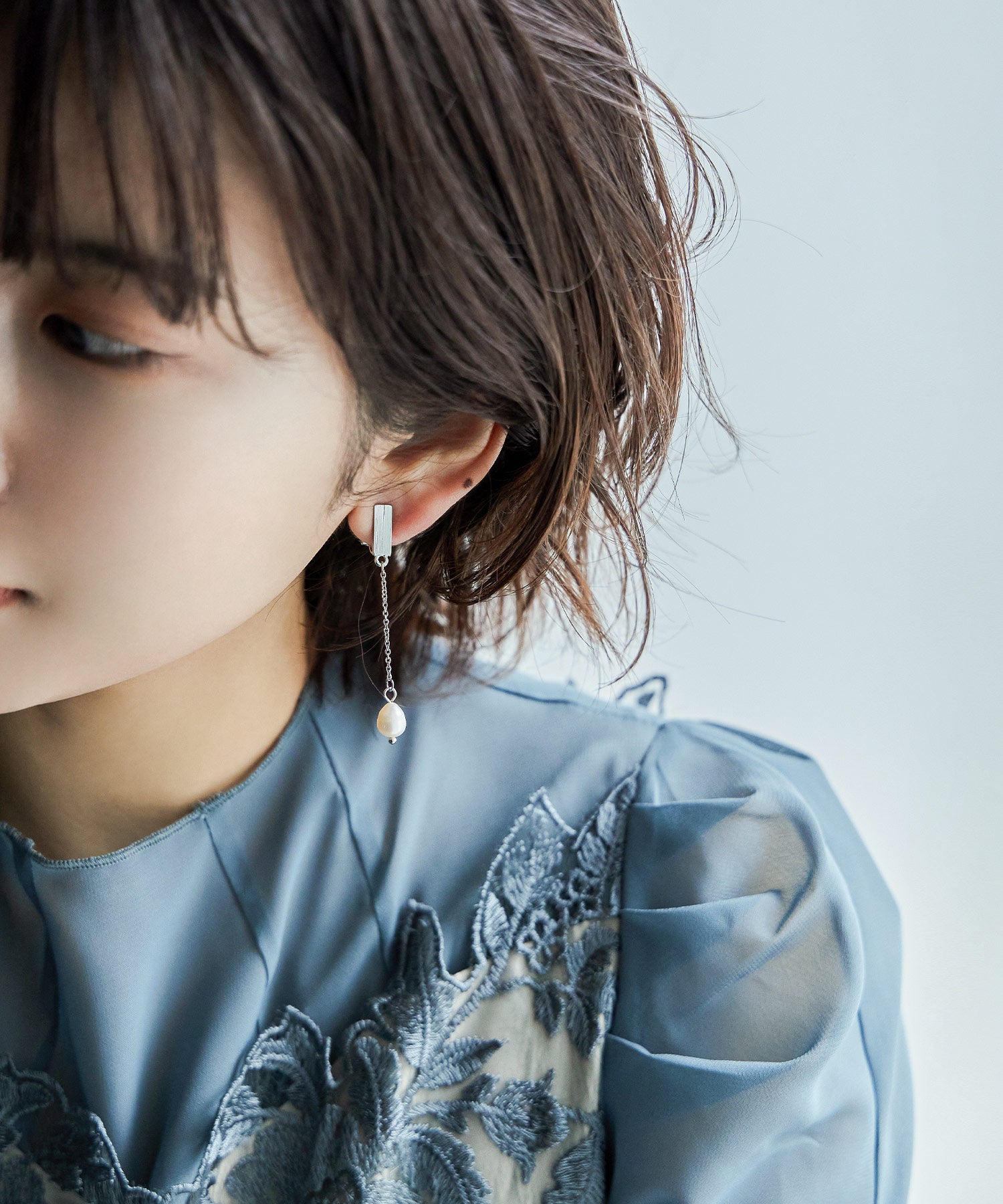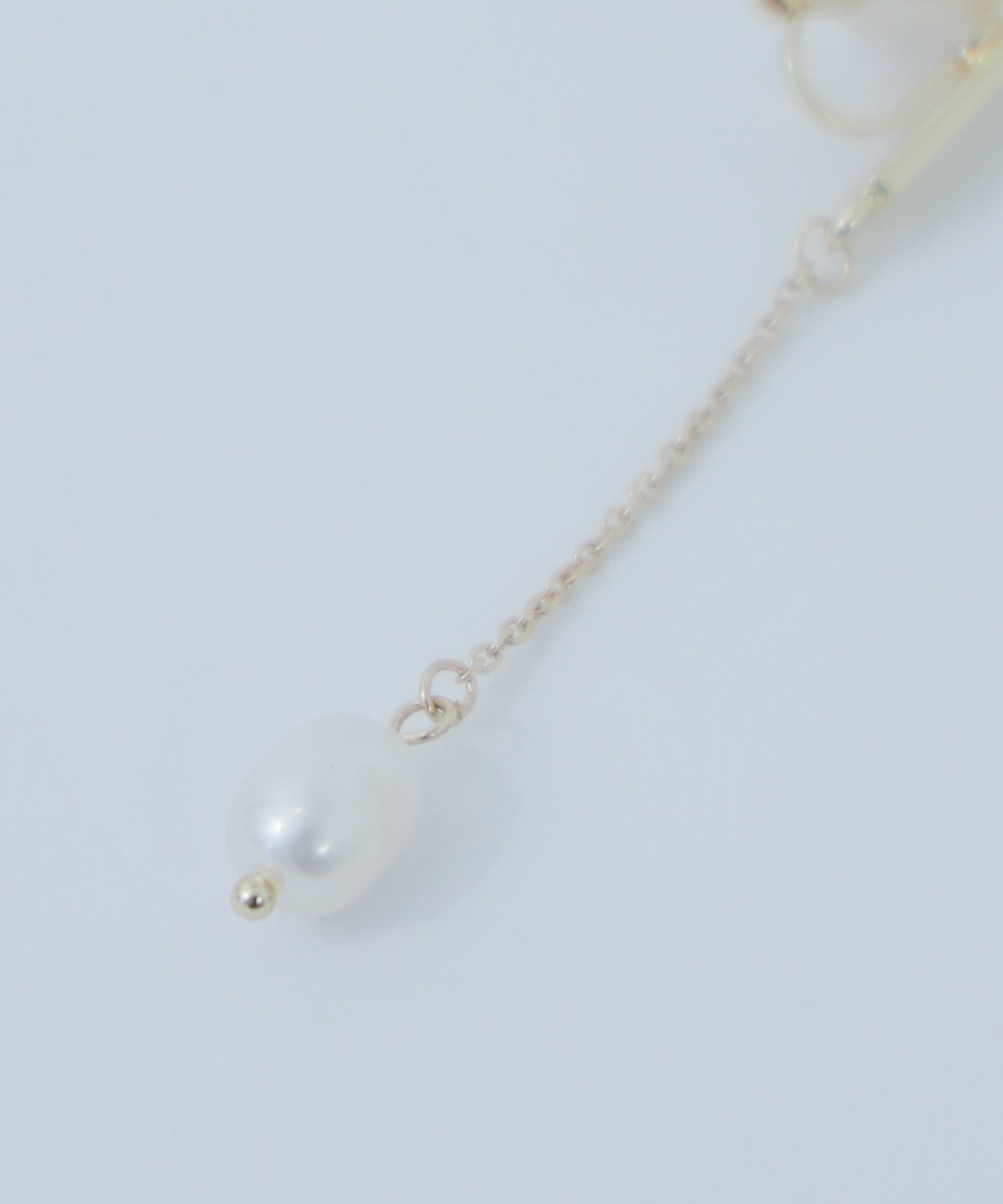 小さめのメタルプレートとゆらゆら揺れる淡水風パールを組み合わせたイヤリング。