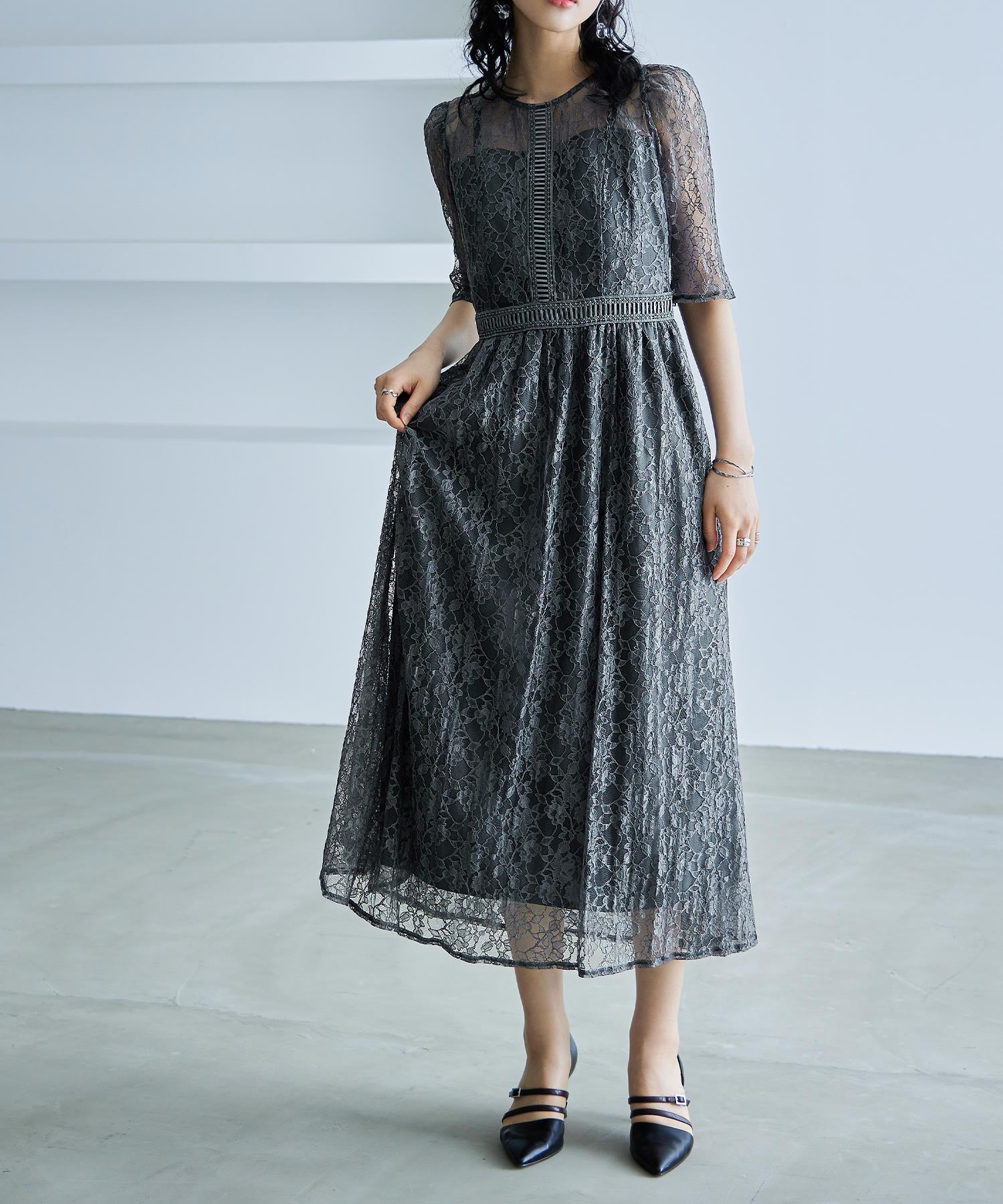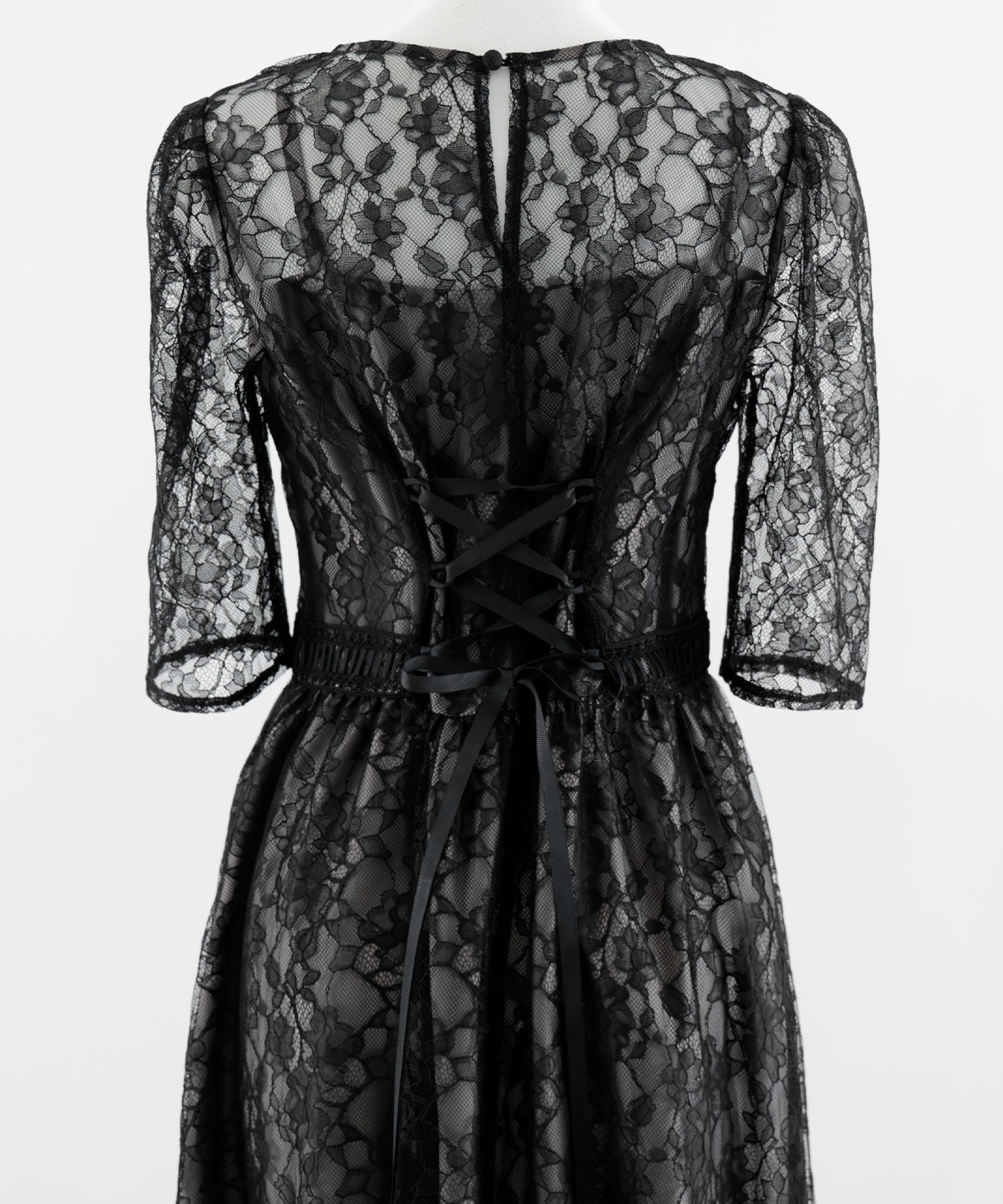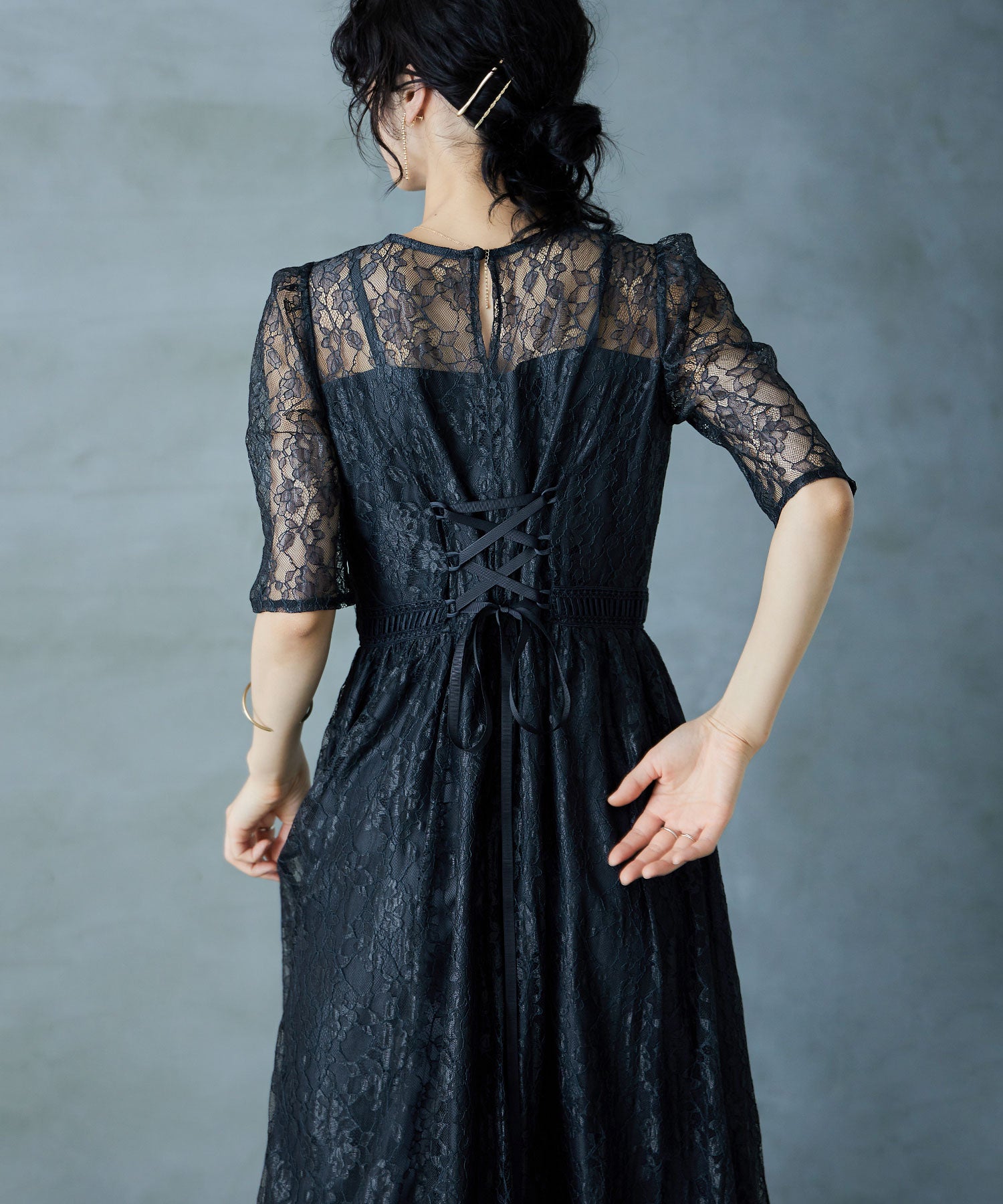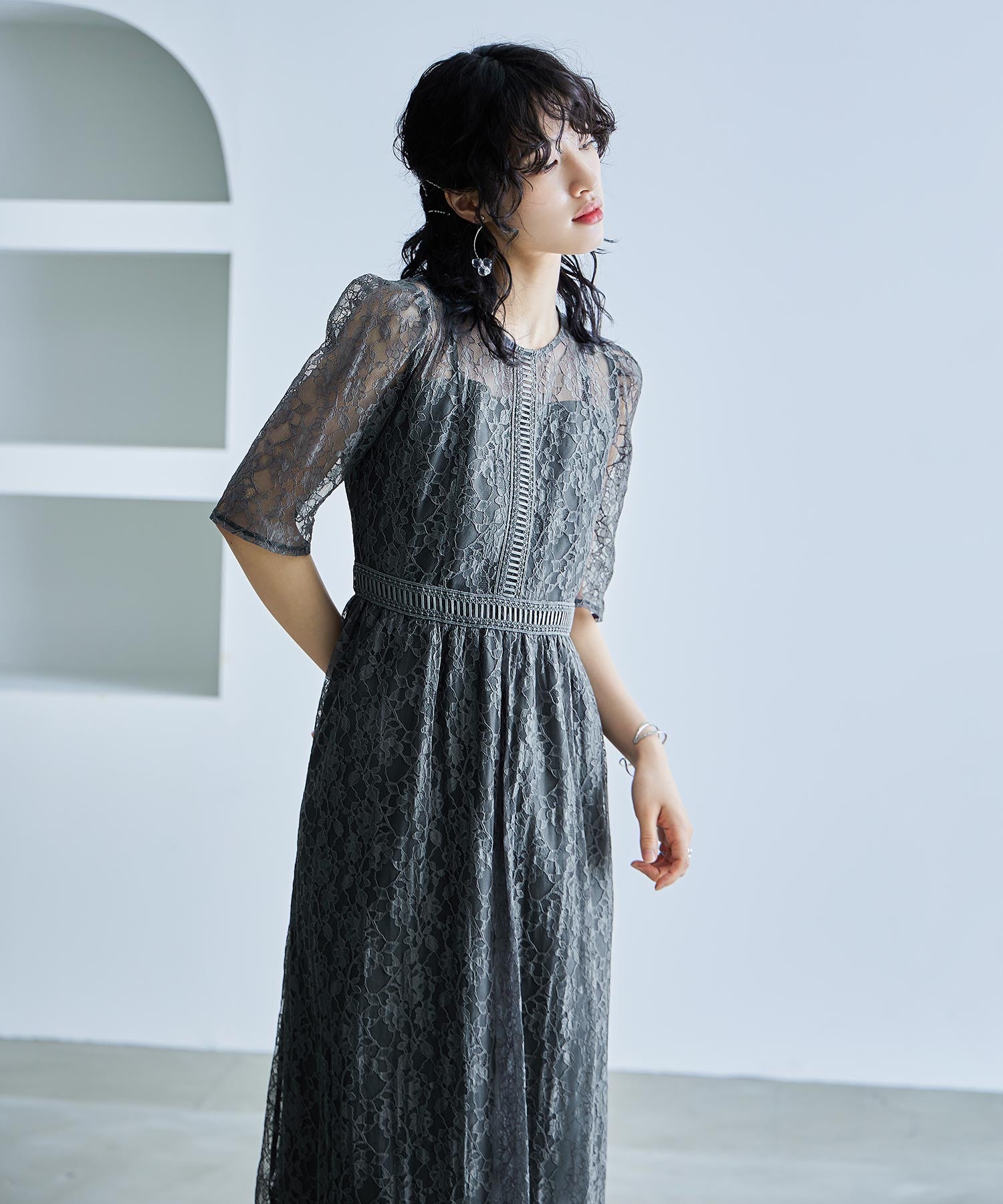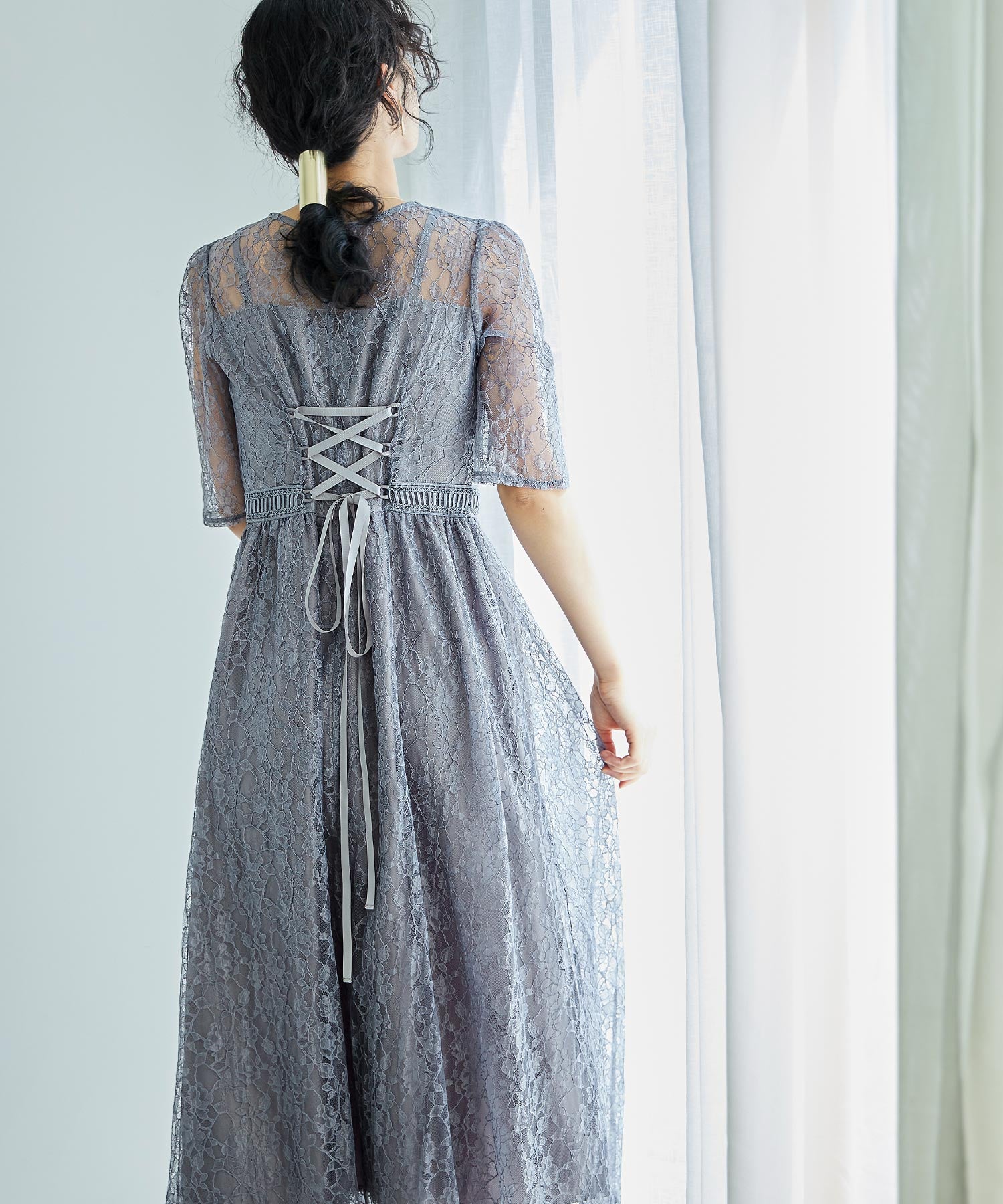 Rname 結婚式 ワンピース パーティードレス 総レース ハシゴレース 花柄 バックリボン ボリューム袖 ロング丈 ミモレ丈 袖あり 半袖 フレア ロングドレス オケージョン 1.5次会 春夏 秋冬 二次会 謝恩会 成人式 同窓会 女子会 お呼ばれ 入学式 卒業式 黒 ブルー グレー ネイビー