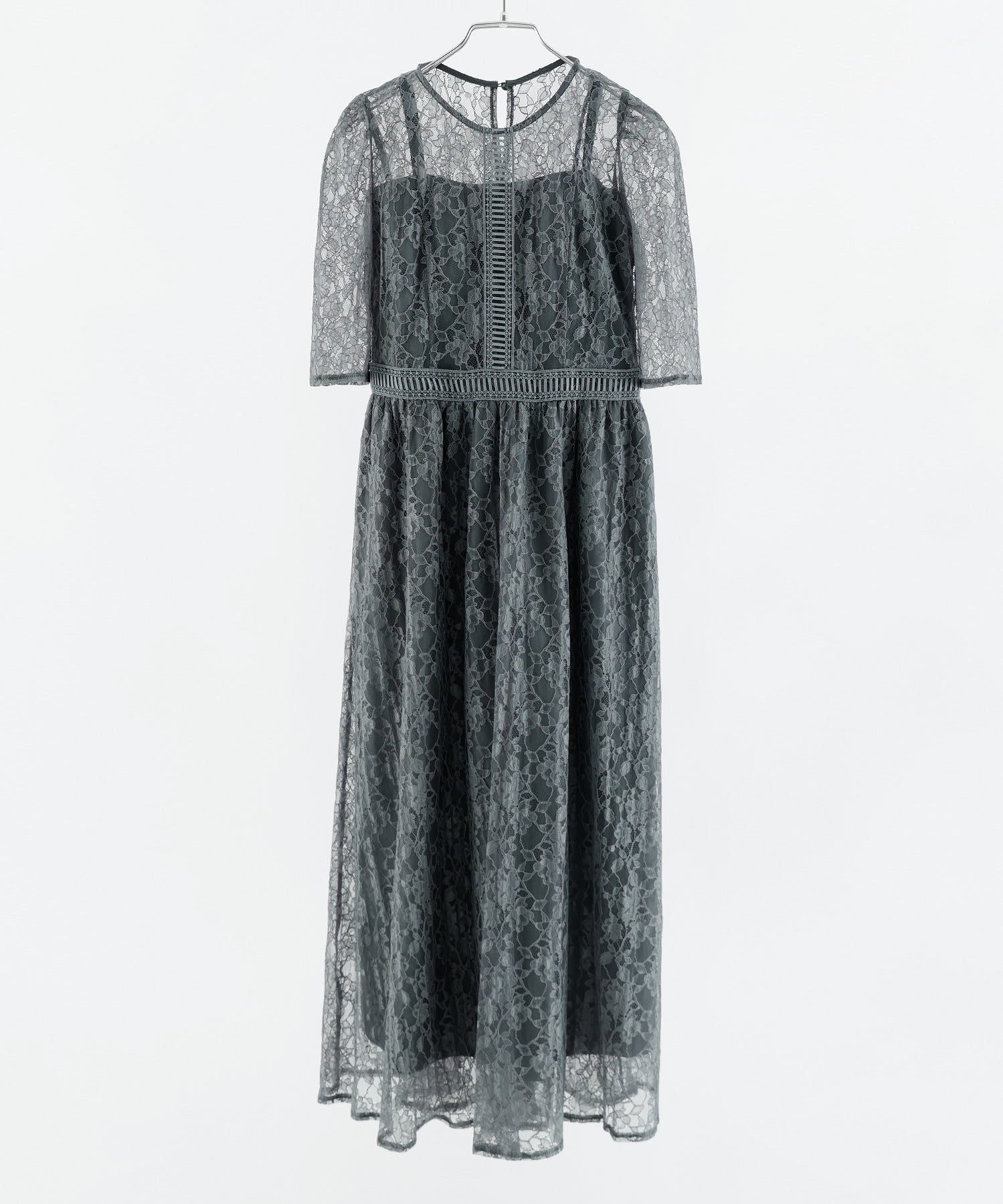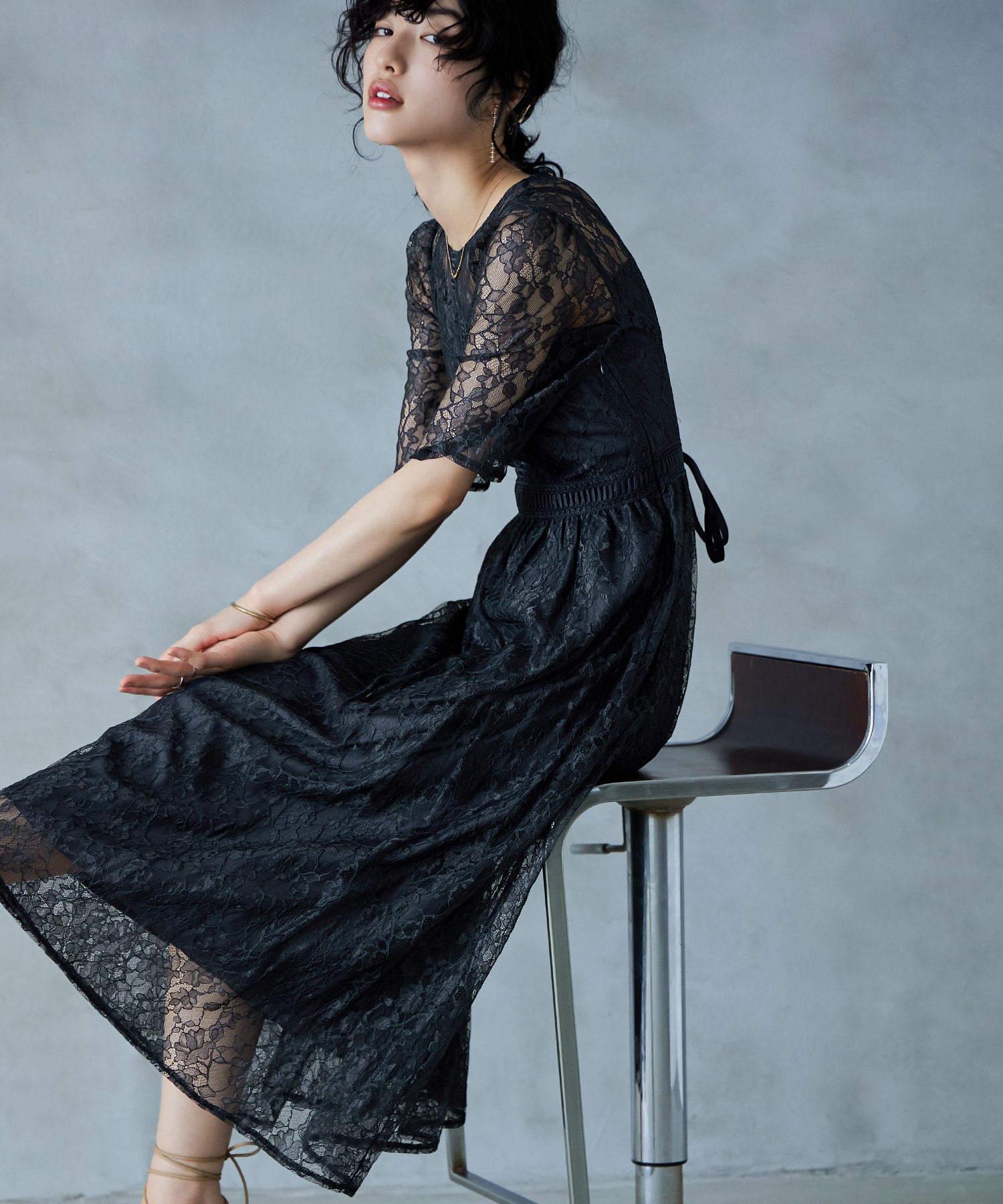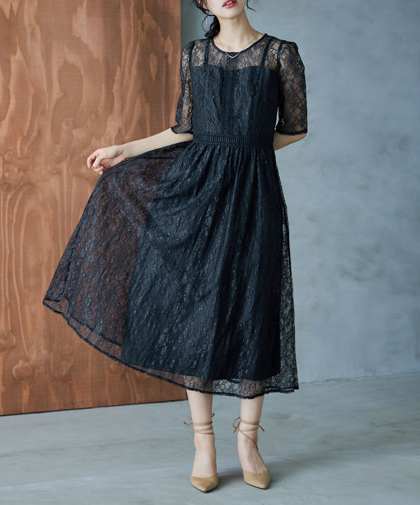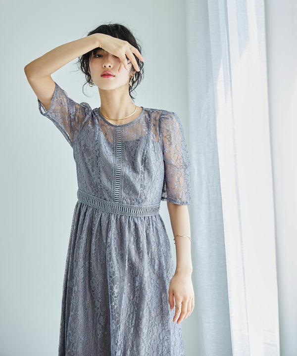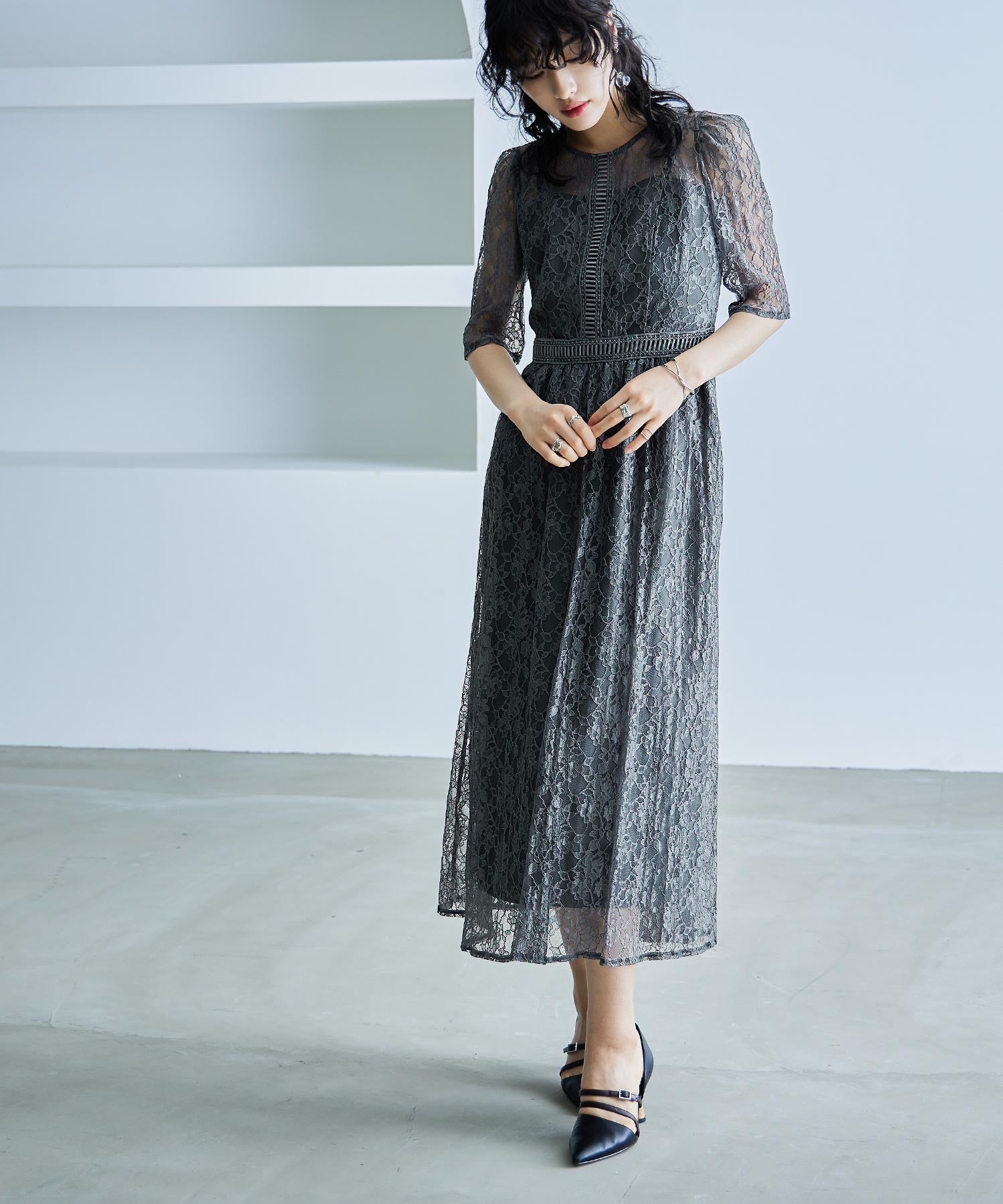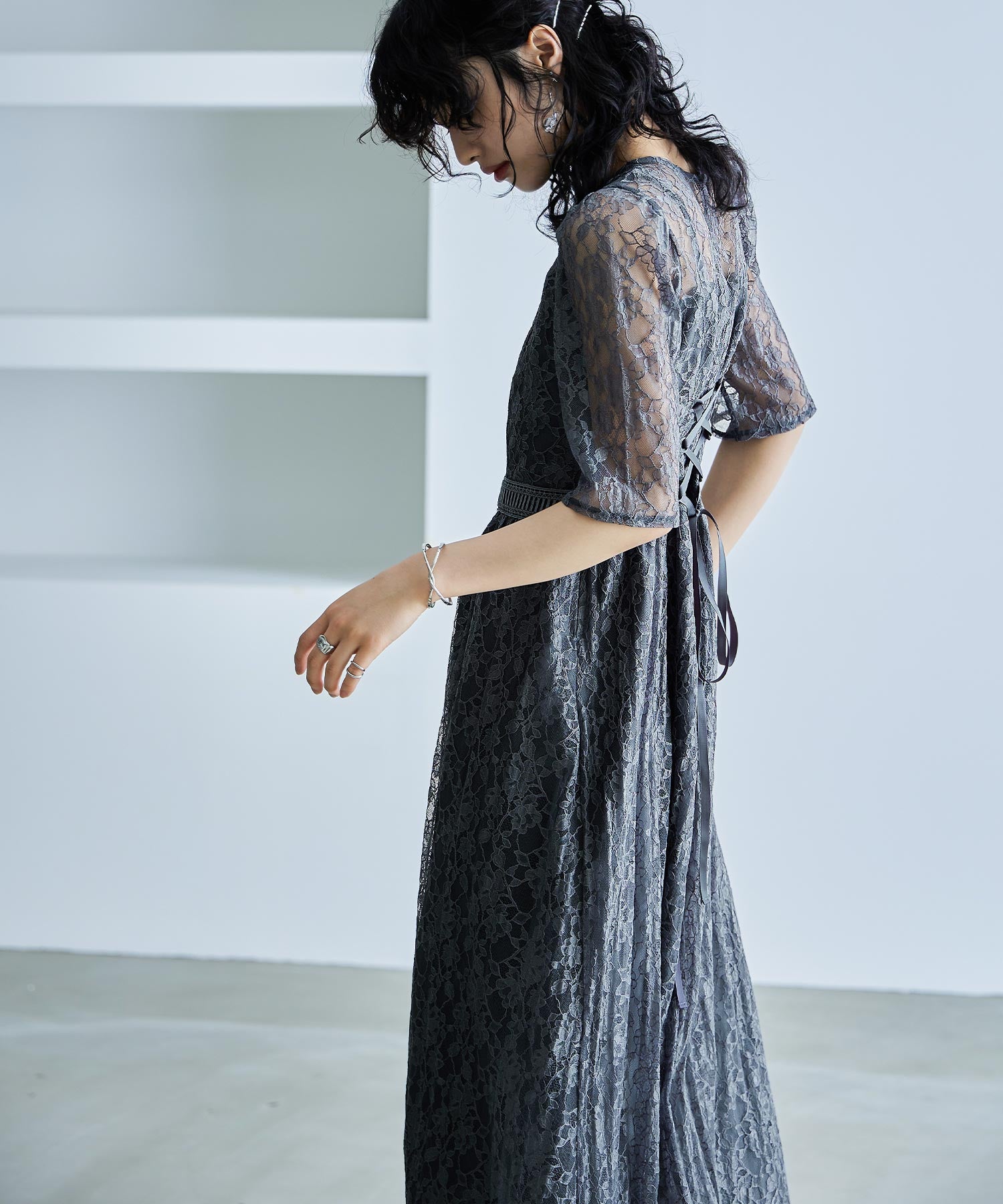 Rname 結婚式 ワンピース パーティードレス 総レース ハシゴレース 花柄 バックリボン ボリューム袖 ロング丈 ミモレ丈 袖あり 半袖 フレア ロングドレス オケージョン 1.5次会 春夏 秋冬 二次会 謝恩会 成人式 同窓会 女子会 お呼ばれ 入学式 卒業式 黒 ブルー グレー ネイビー