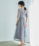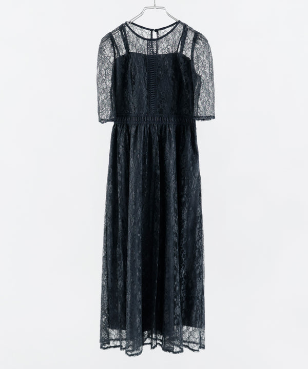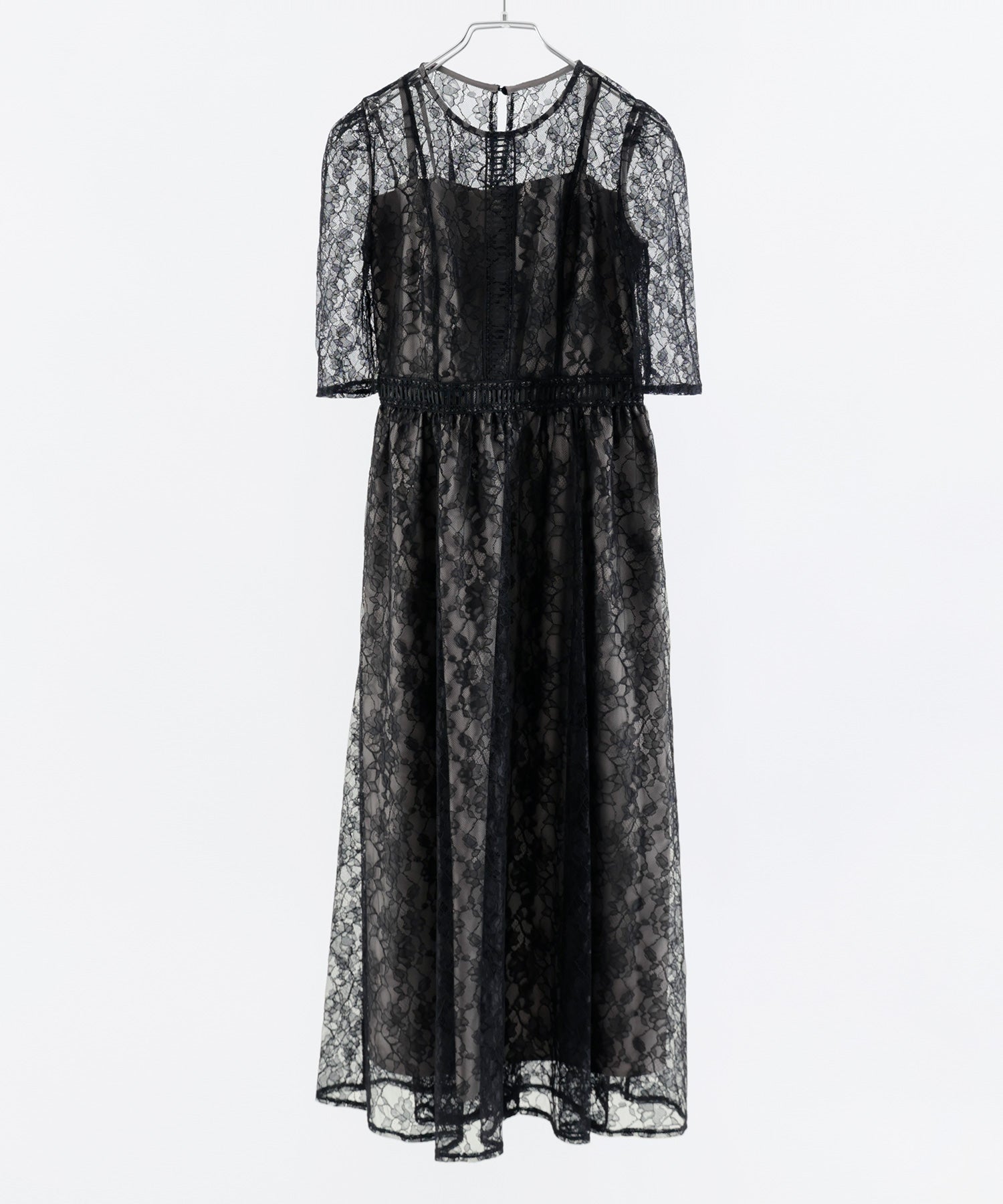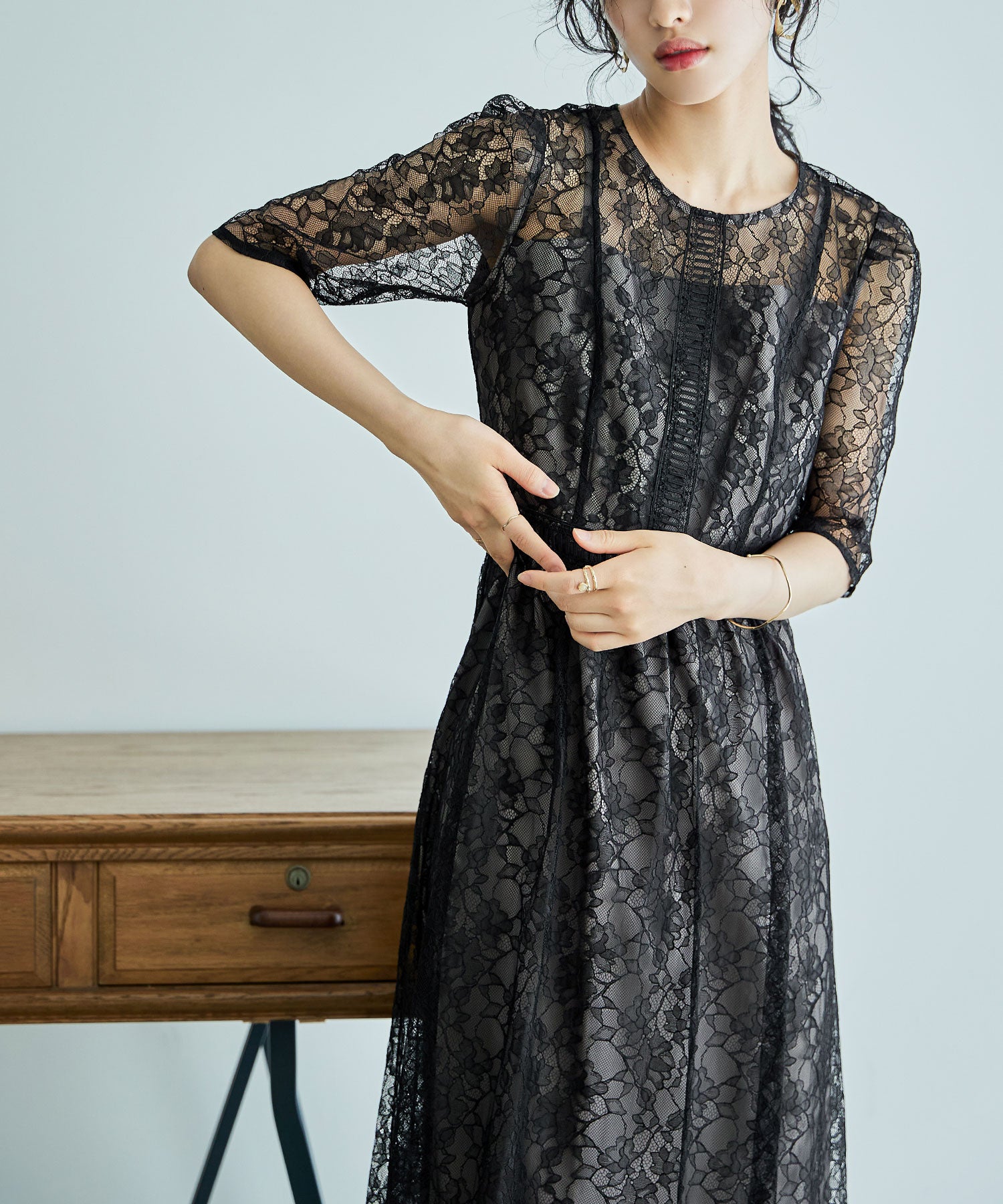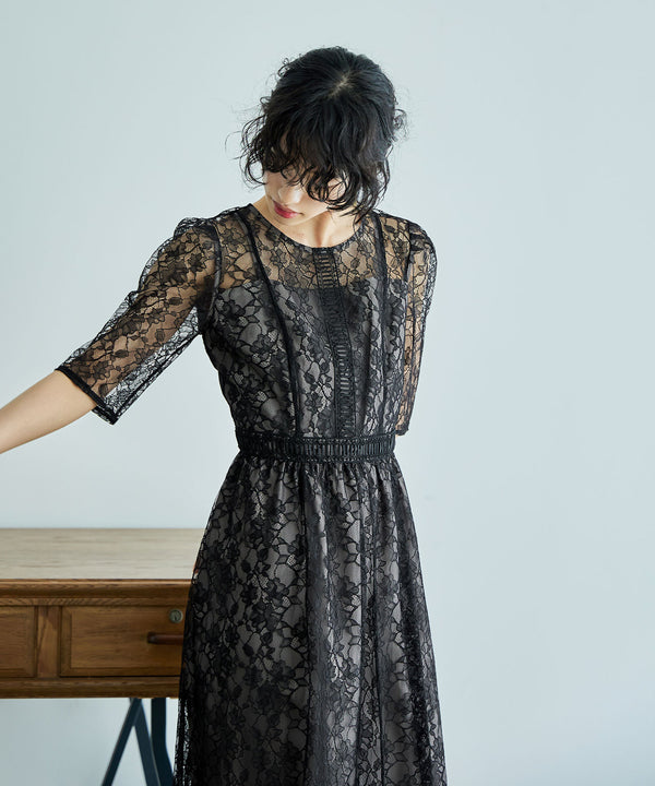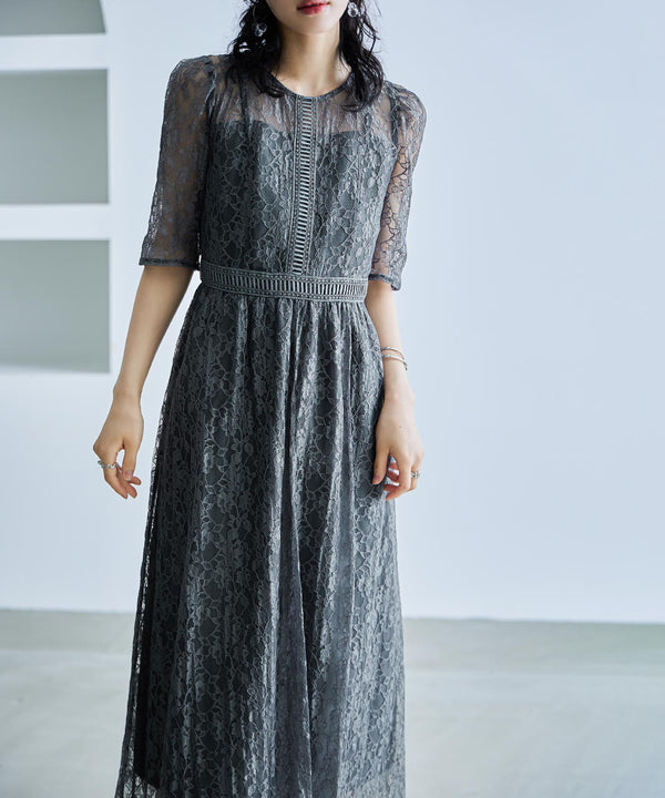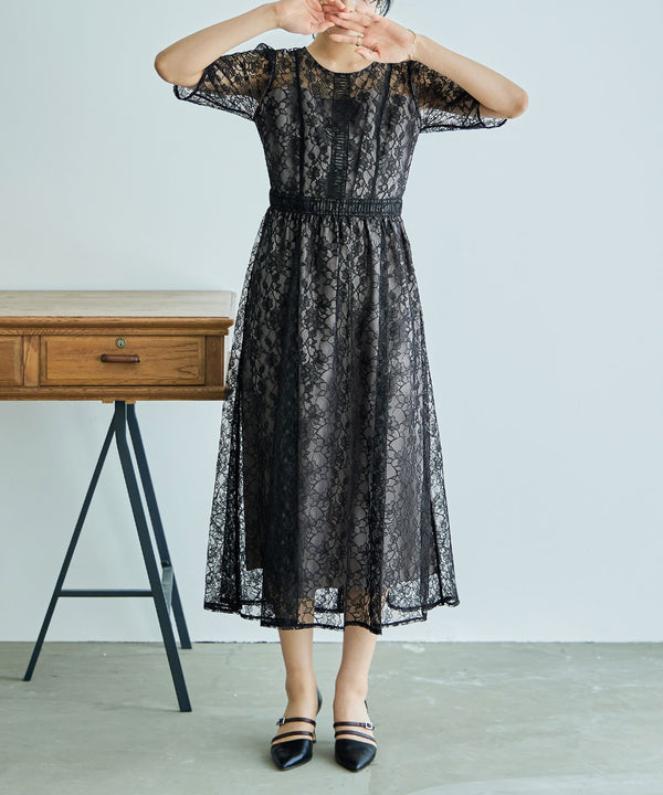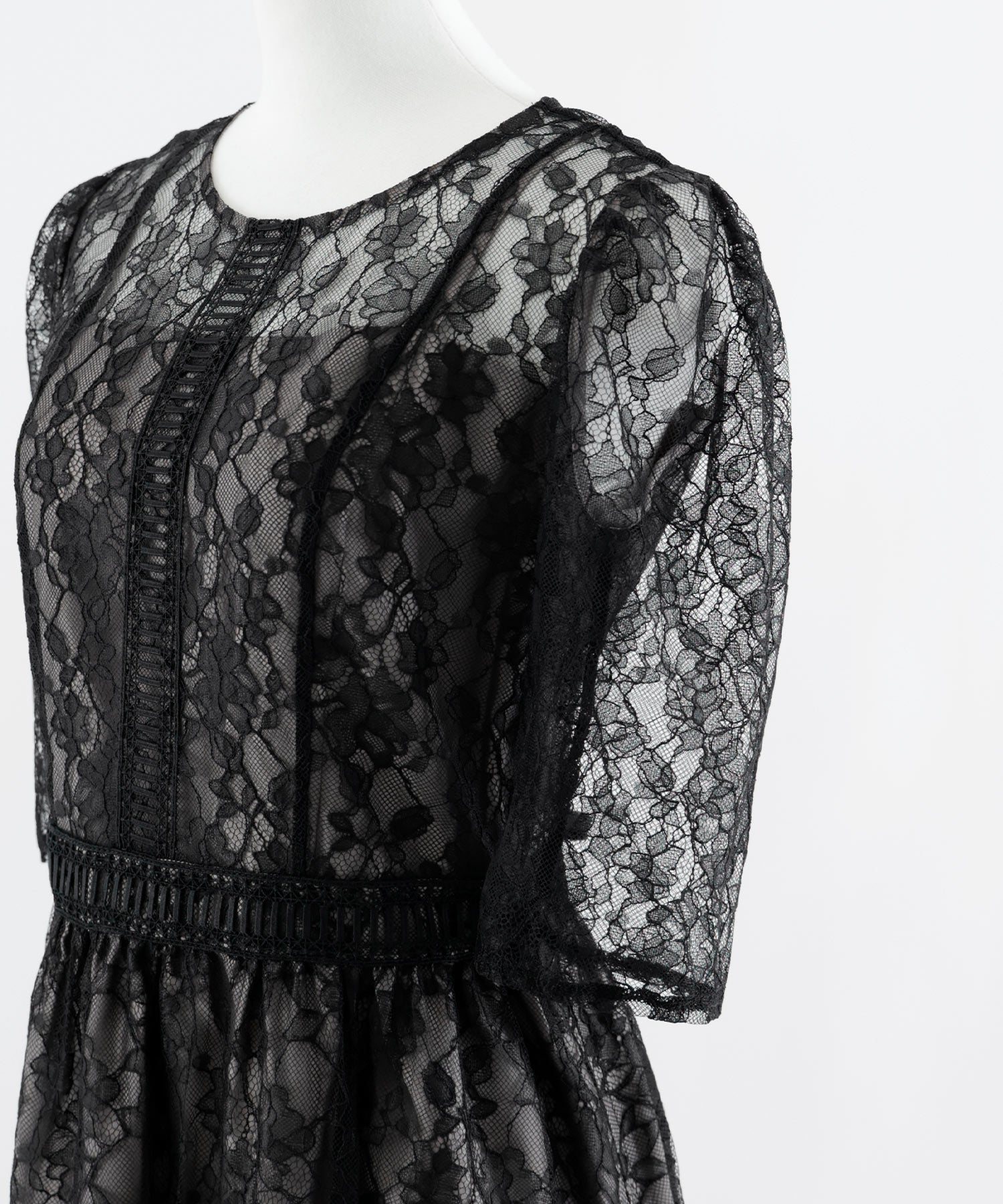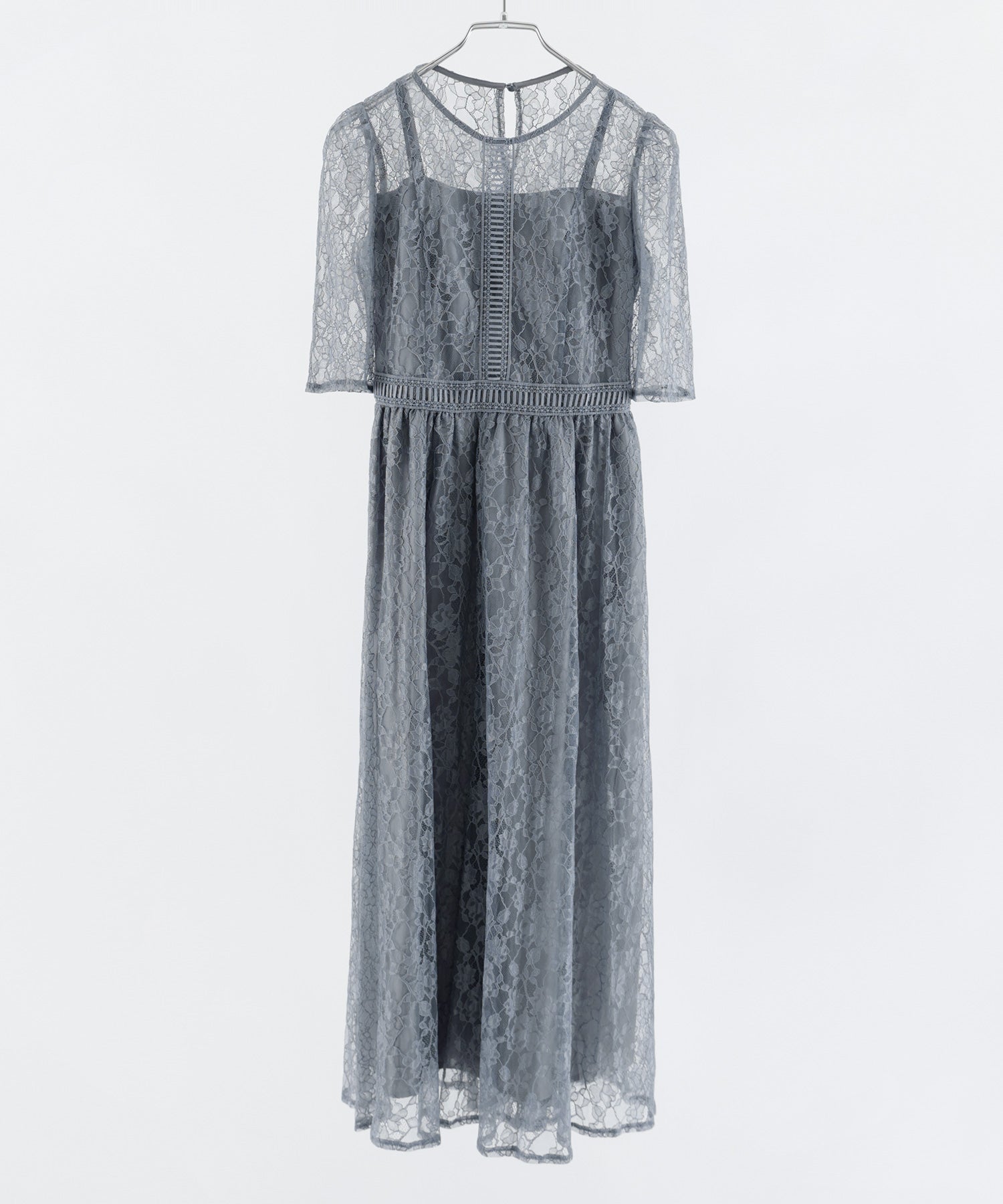 Rname 結婚式 ワンピース パーティードレス 総レース ハシゴレース 花柄 バックリボン ボリューム袖 ロング丈 ミモレ丈 袖あり 半袖 フレア ロングドレス オケージョン 1.5次会 春夏 秋冬 二次会 謝恩会 成人式 同窓会 女子会 お呼ばれ 入学式 卒業式 黒 ブルー グレー ネイビー