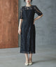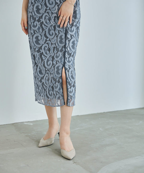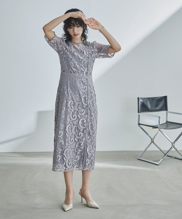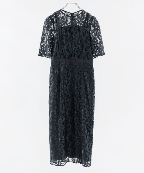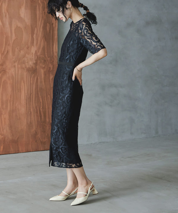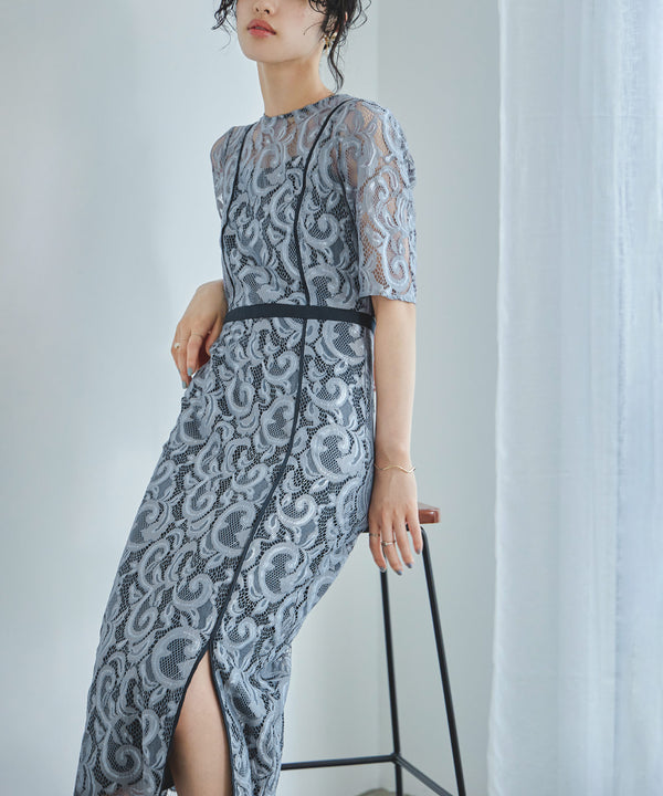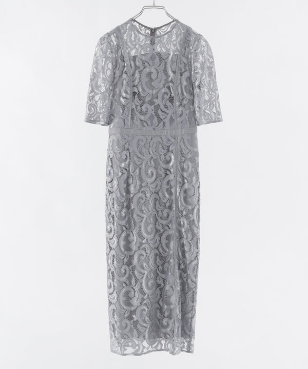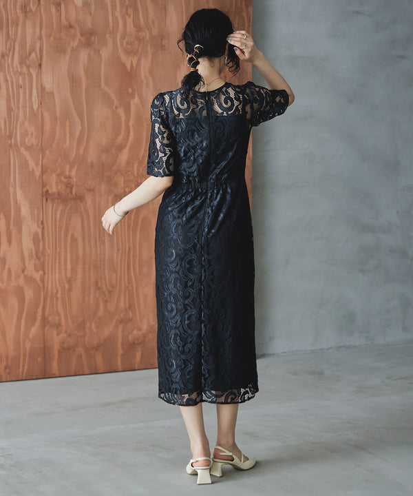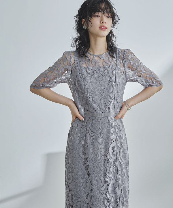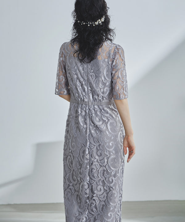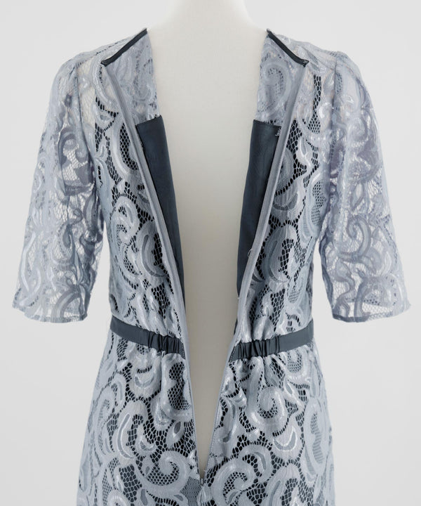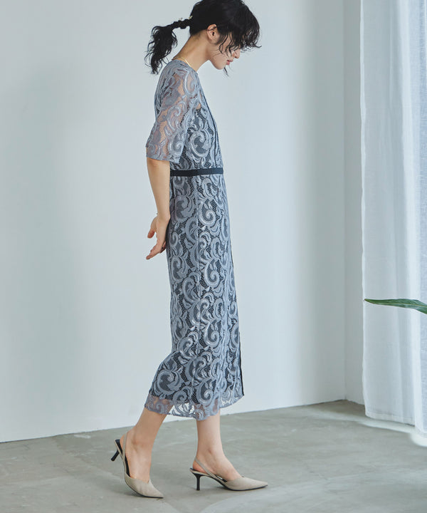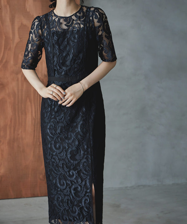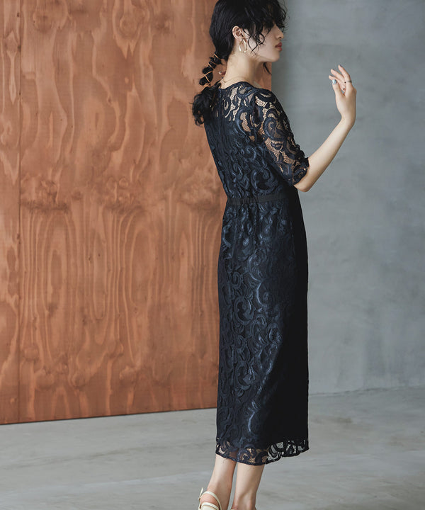 Rname 結婚式 ワンピース パーティードレス レース 総レース タイト レトロ ヴィンテージ ロング丈 ミモレ丈 袖あり 七分袖 他と被らない オケージョン 1.5次会 春夏秋冬 二次会 謝恩会 成人式 同窓会 女子会 お呼ばれ 二の腕カバー 入学式 卒業式 M L ネイビー ブルー グレー