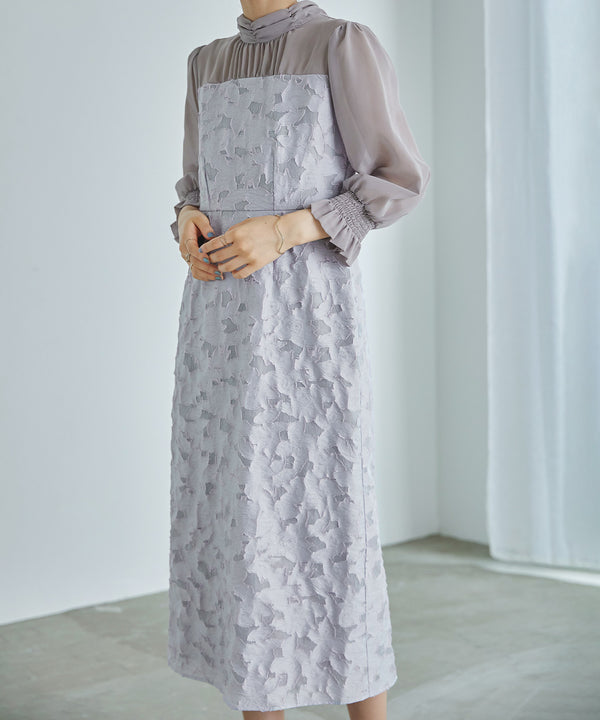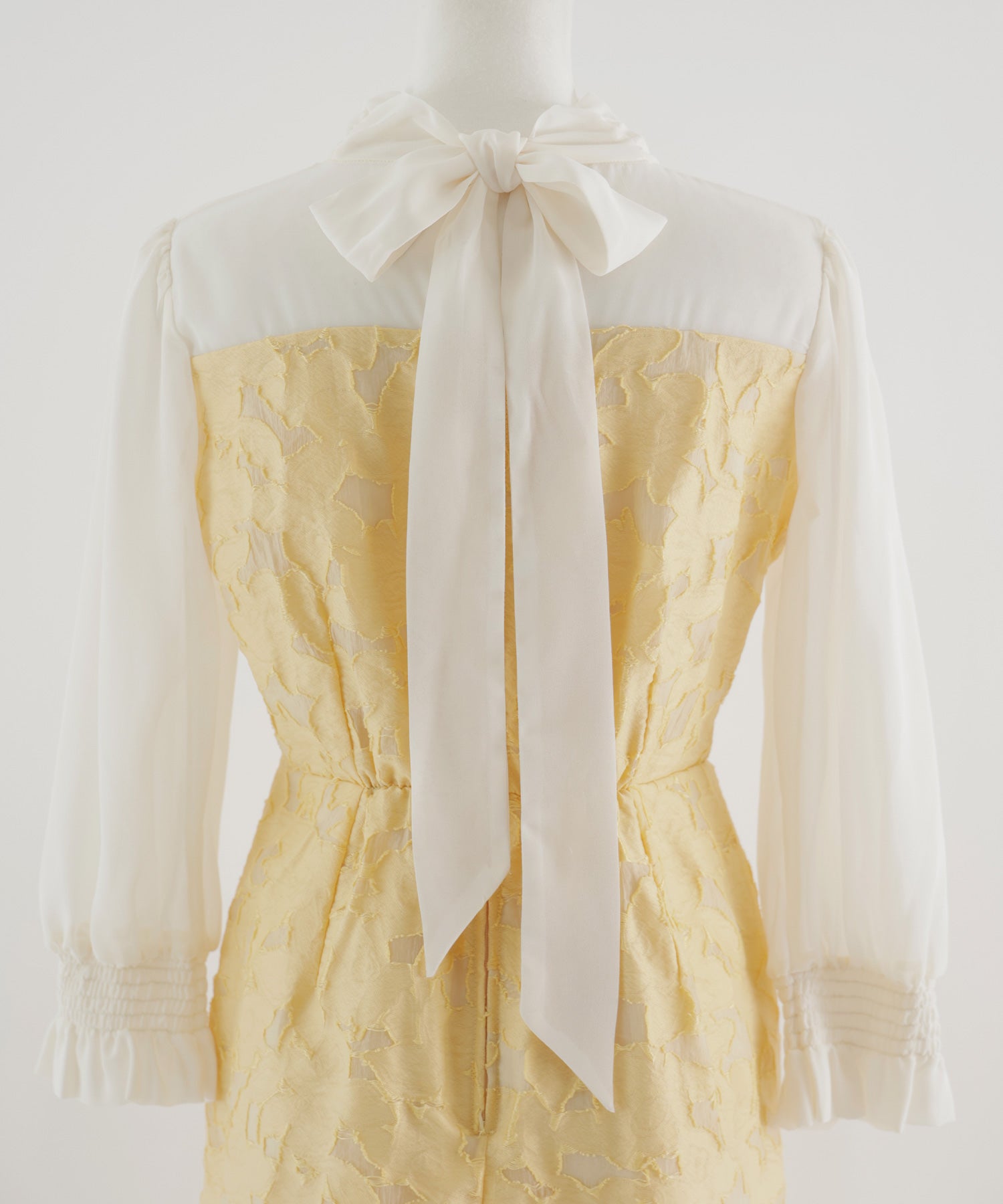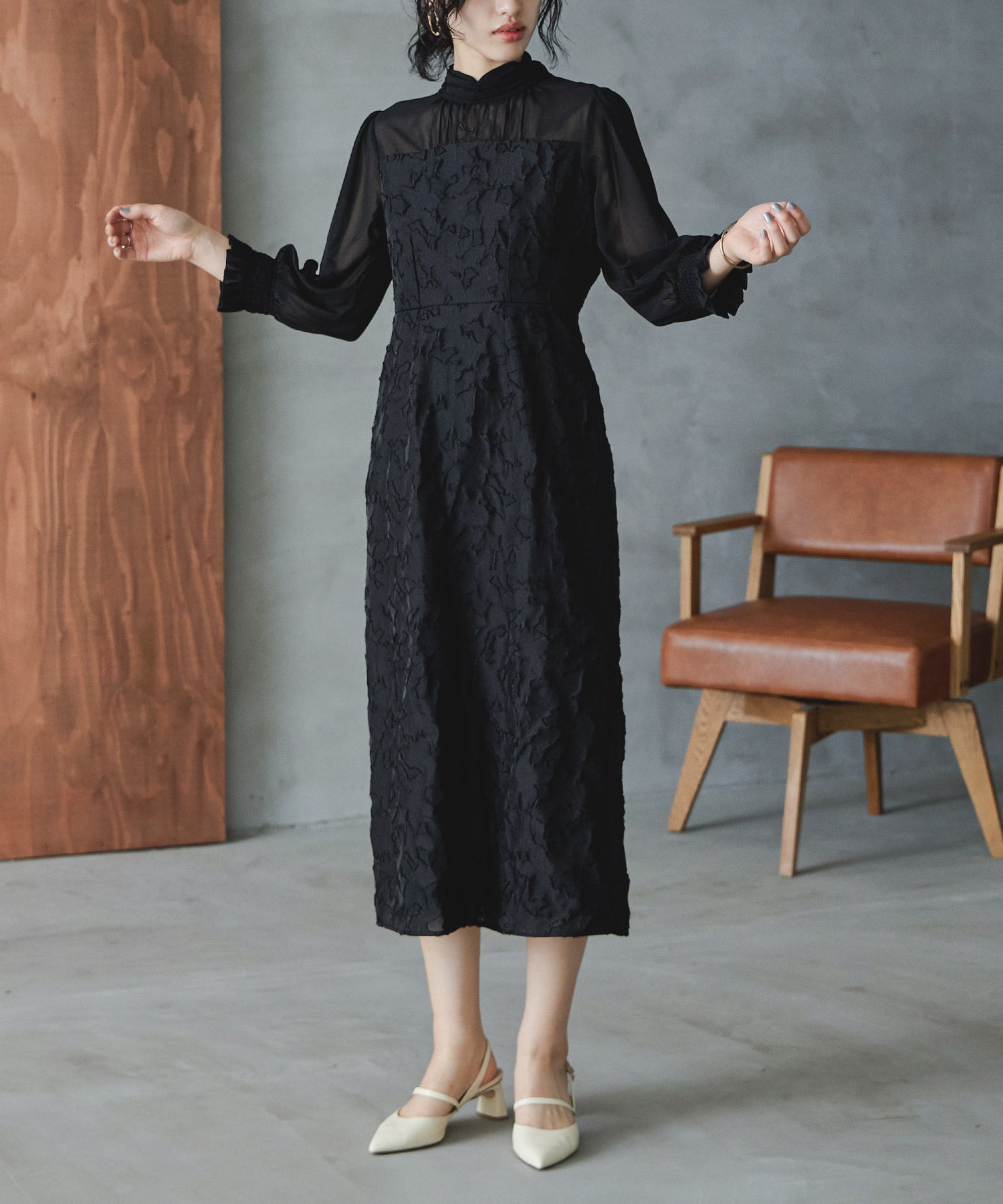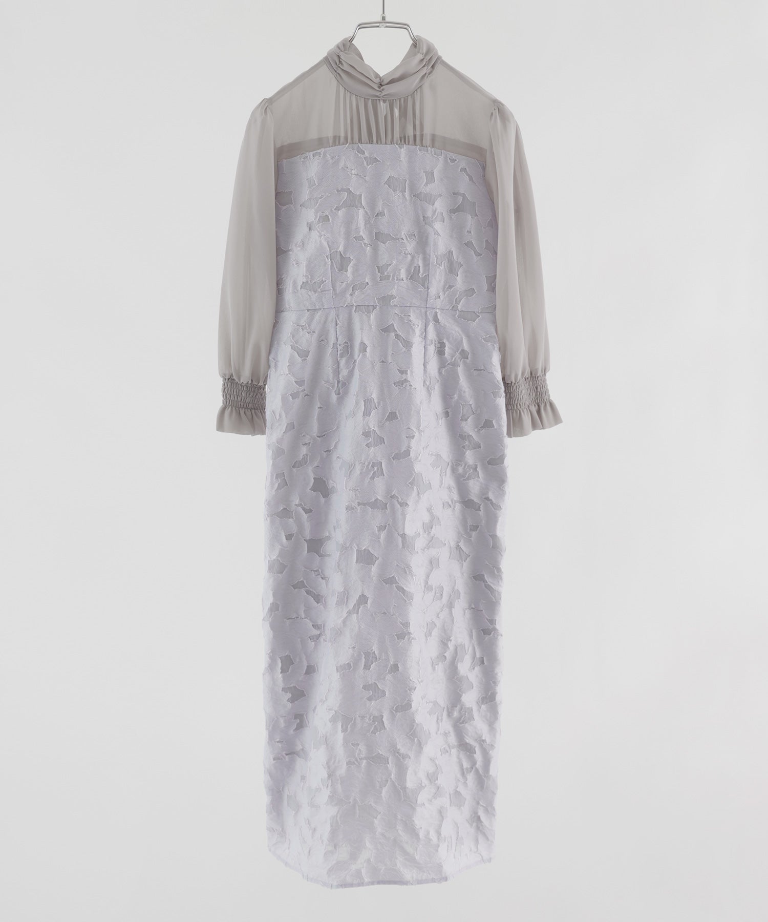 Rname 結婚式 ワンピース パーティードレス オパール ジャガード シアー Iライン バックリボン ロング丈 袖あり 長袖 ボリューム袖 ハイネック 柄 他と被らない オケージョン 1.5次会 春夏秋冬 二次会 謝恩会 成人式 同窓会 女子会 お呼ばれ 二の腕カバー 入学式 卒業式 デイリー