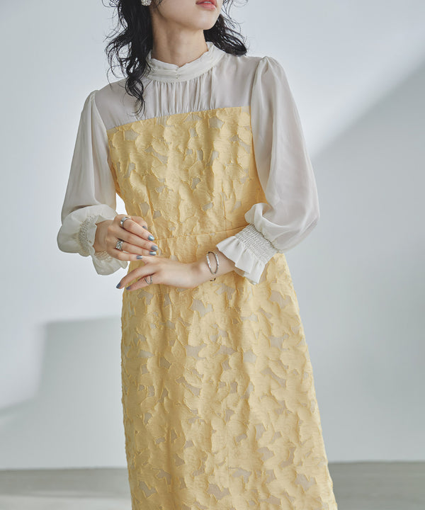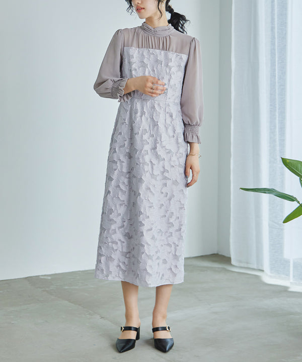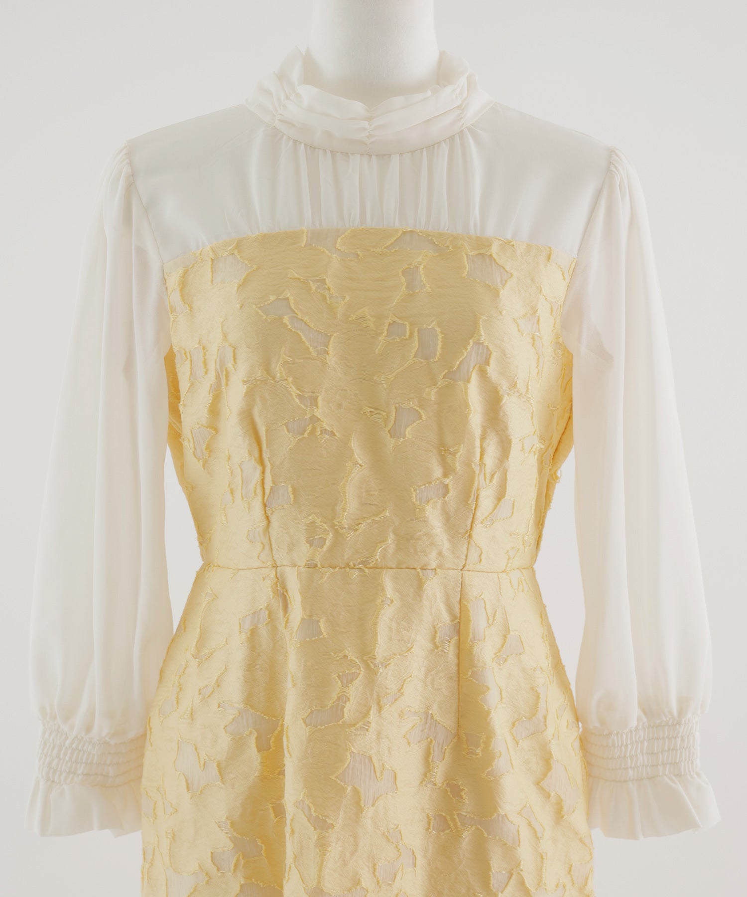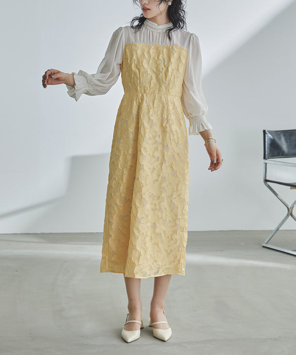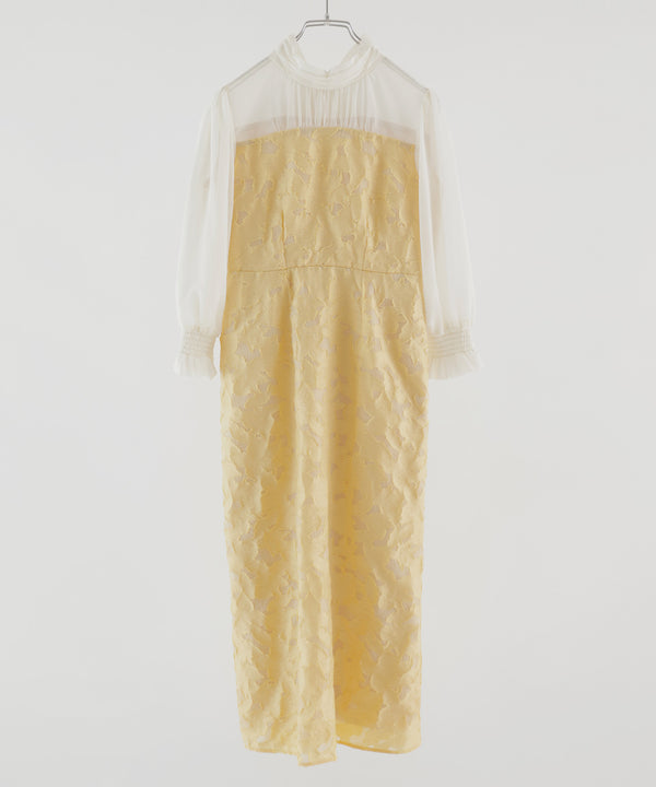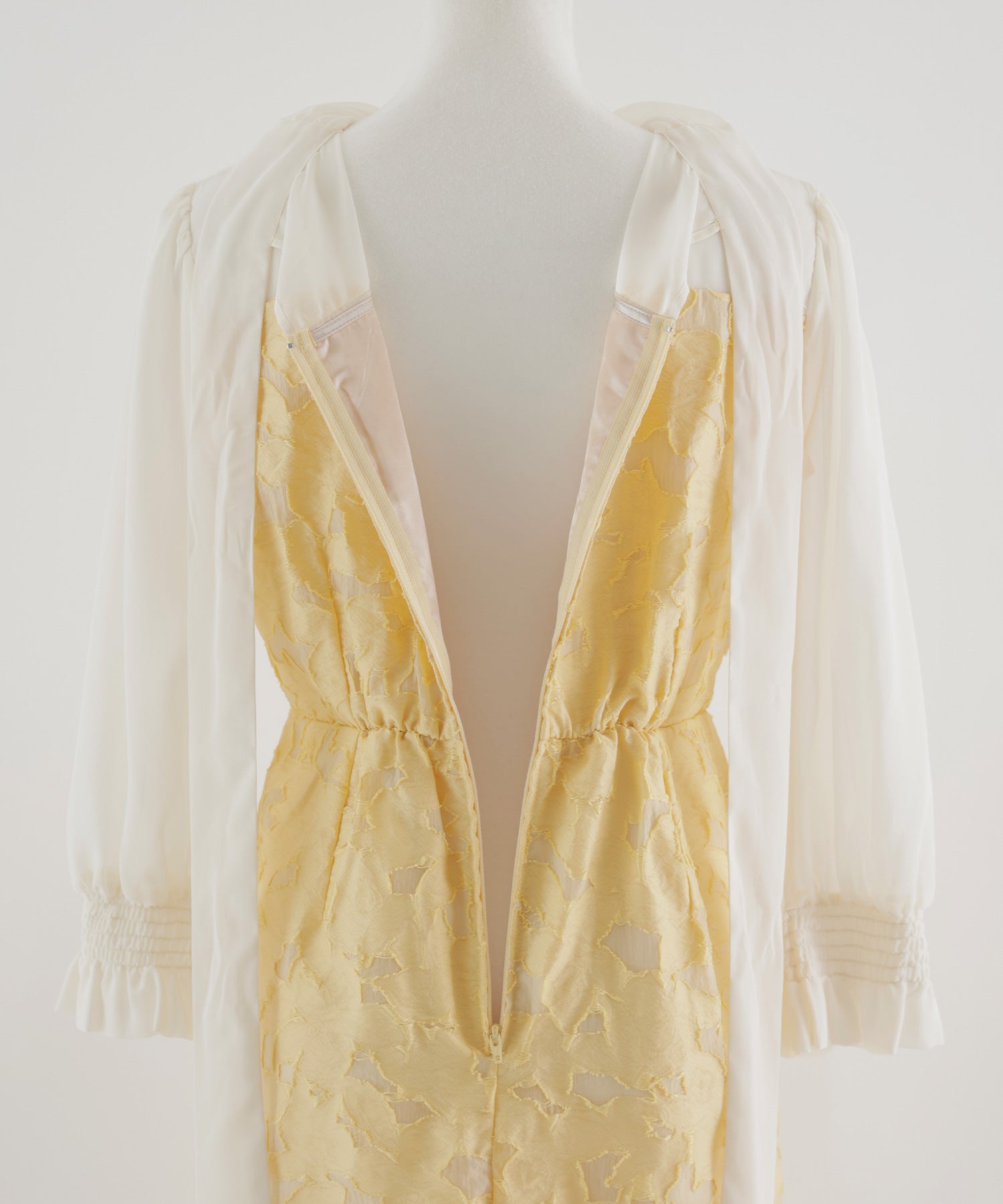Rname 結婚式 ワンピース パーティードレス オパール ジャガード シアー Iライン バックリボン ロング丈 袖あり 長袖 ボリューム袖 ハイネック 柄 他と被らない オケージョン 1.5次会 春夏秋冬 二次会 謝恩会 成人式 同窓会 女子会 お呼ばれ 二の腕カバー 入学式 卒業式 デイリー