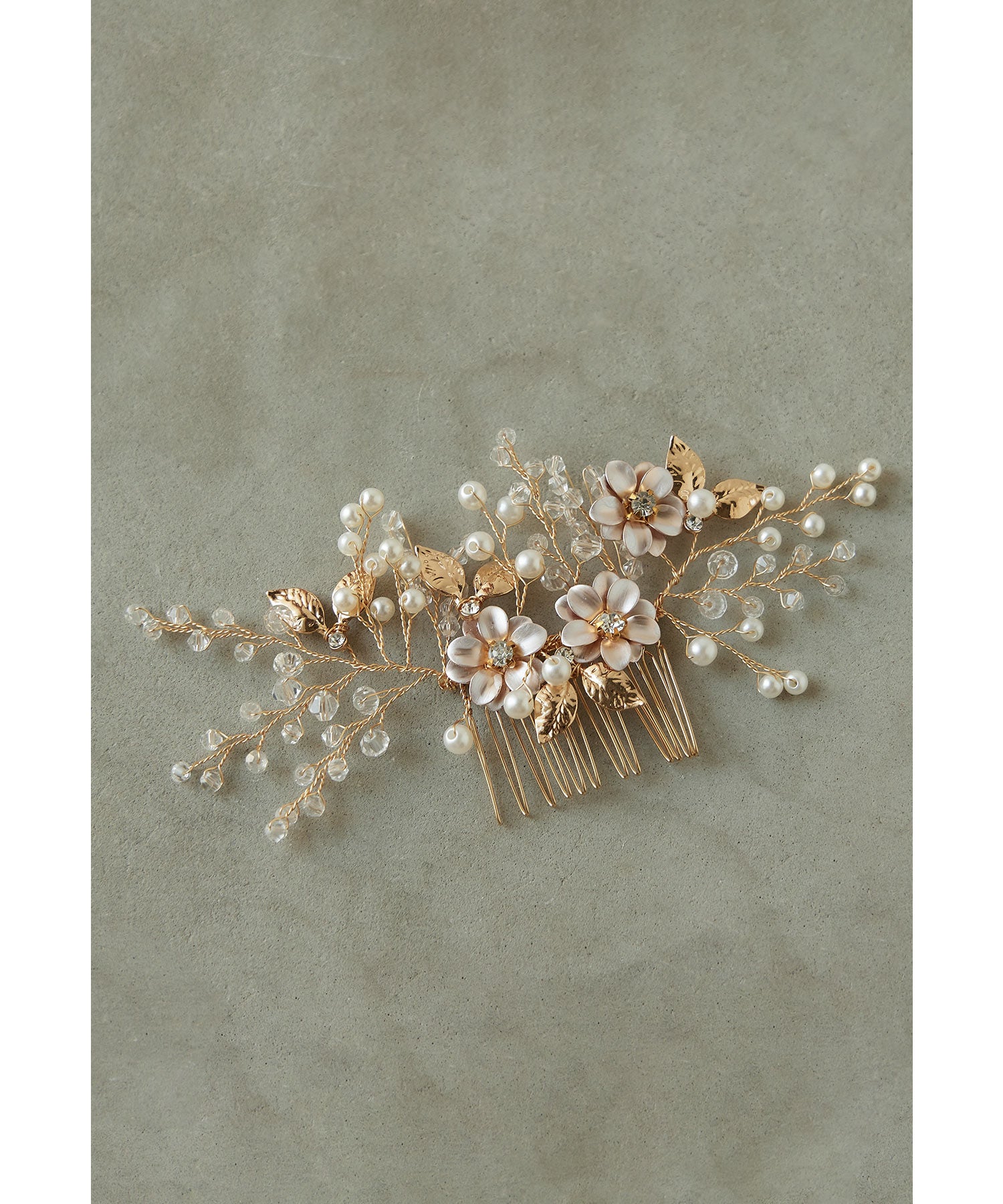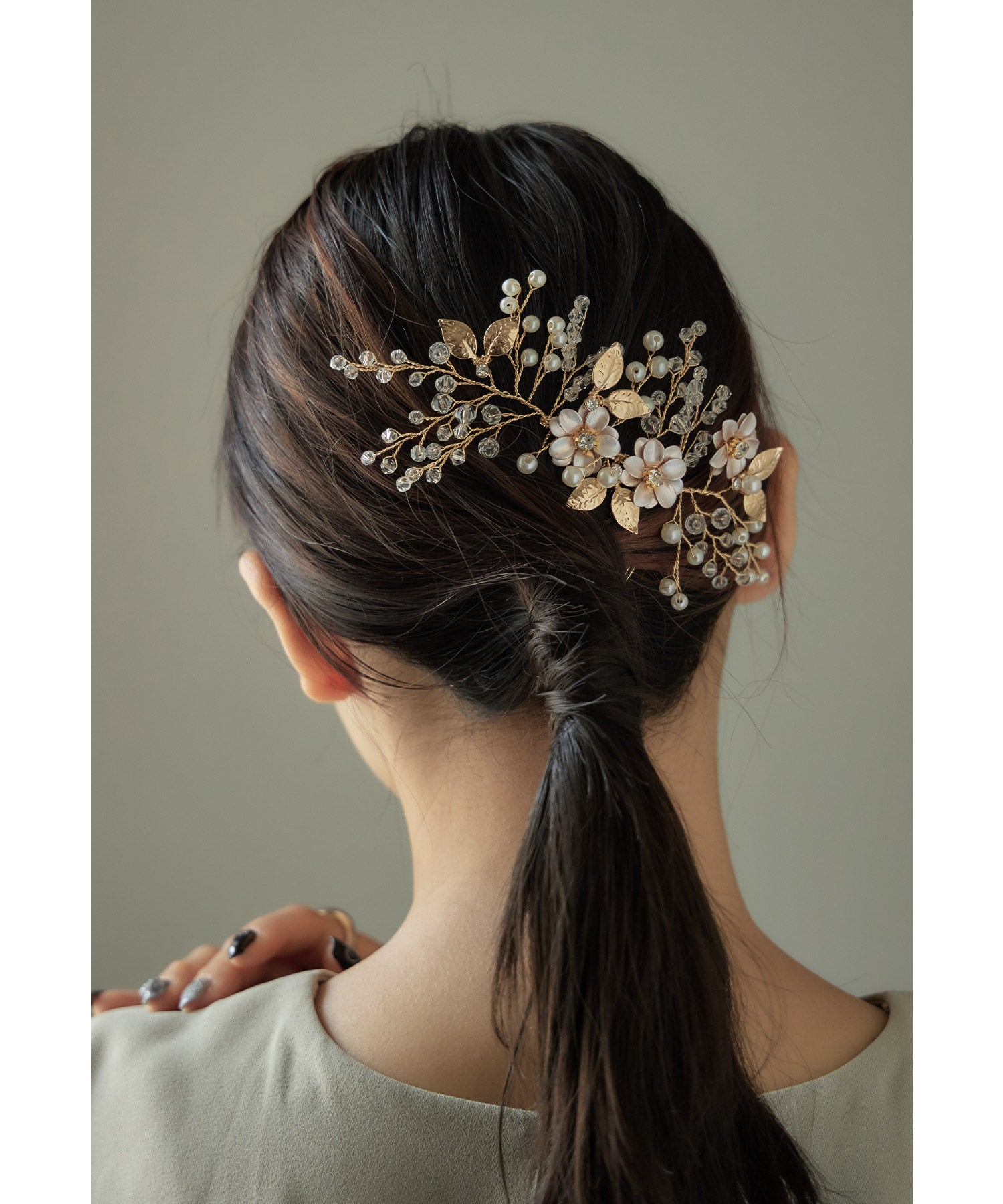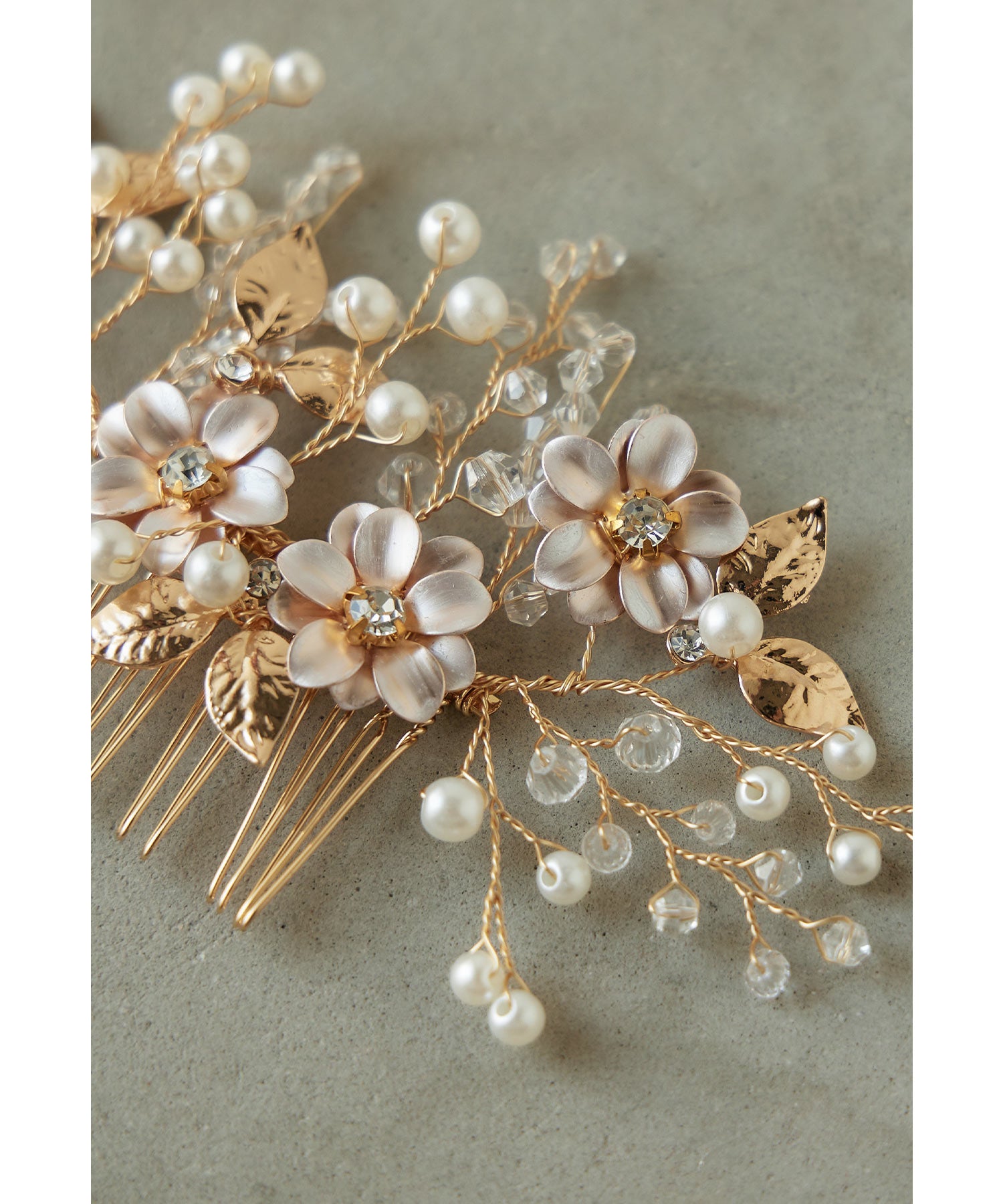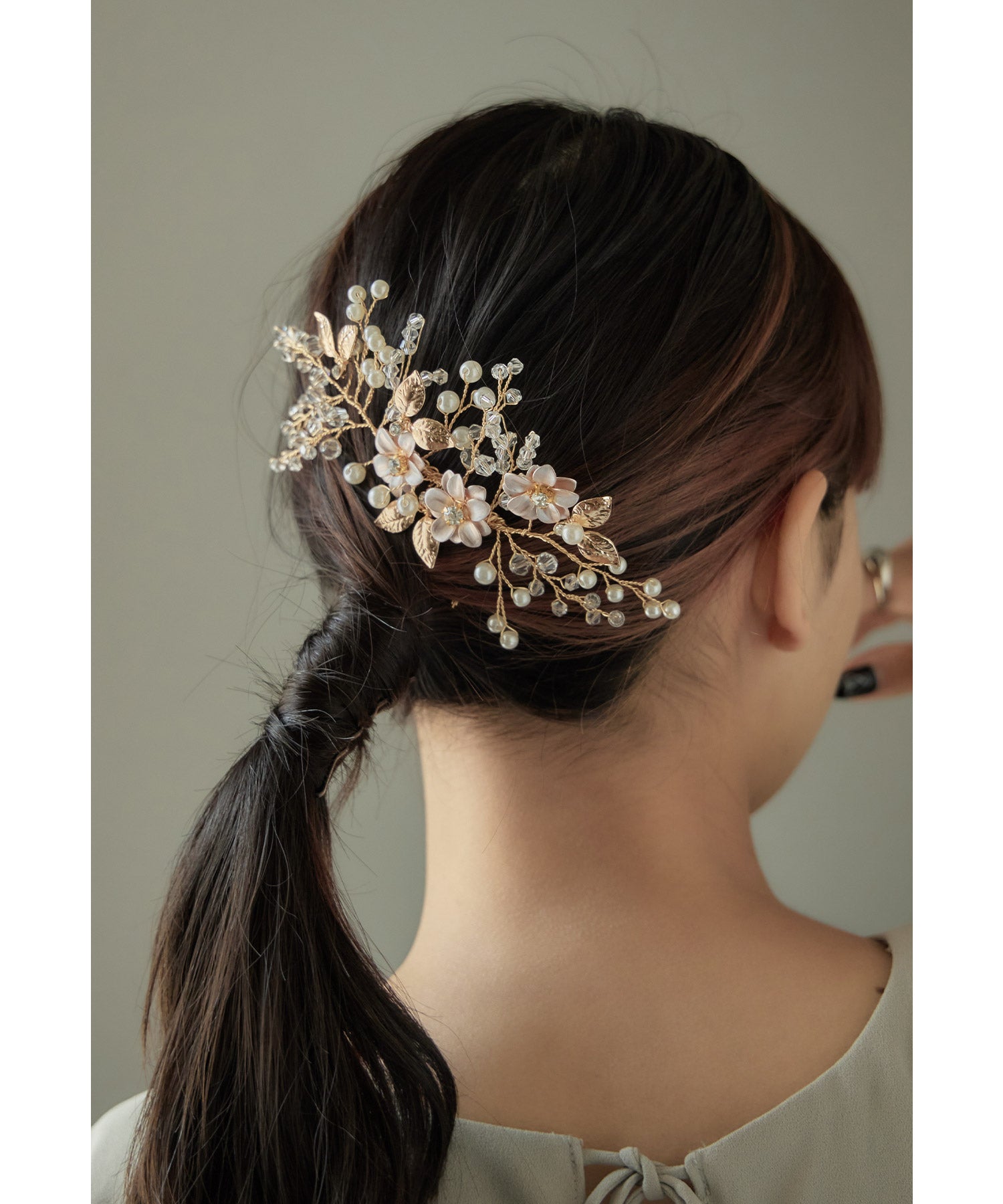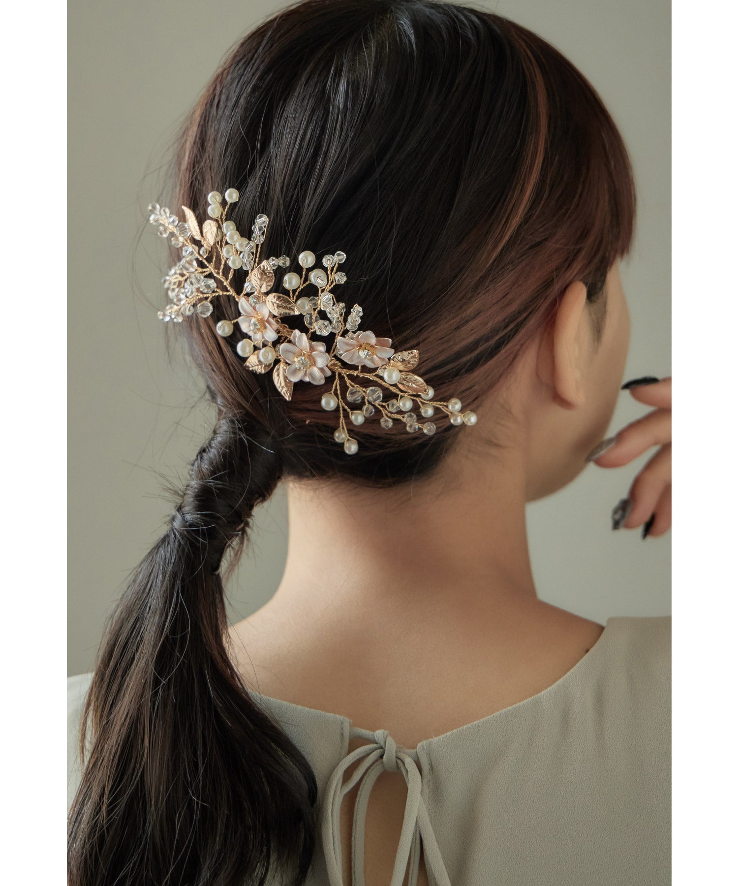 Zname メタリックフラワーパールビーズヘアコーム 結婚式 二次会 ヘアアクセサリー