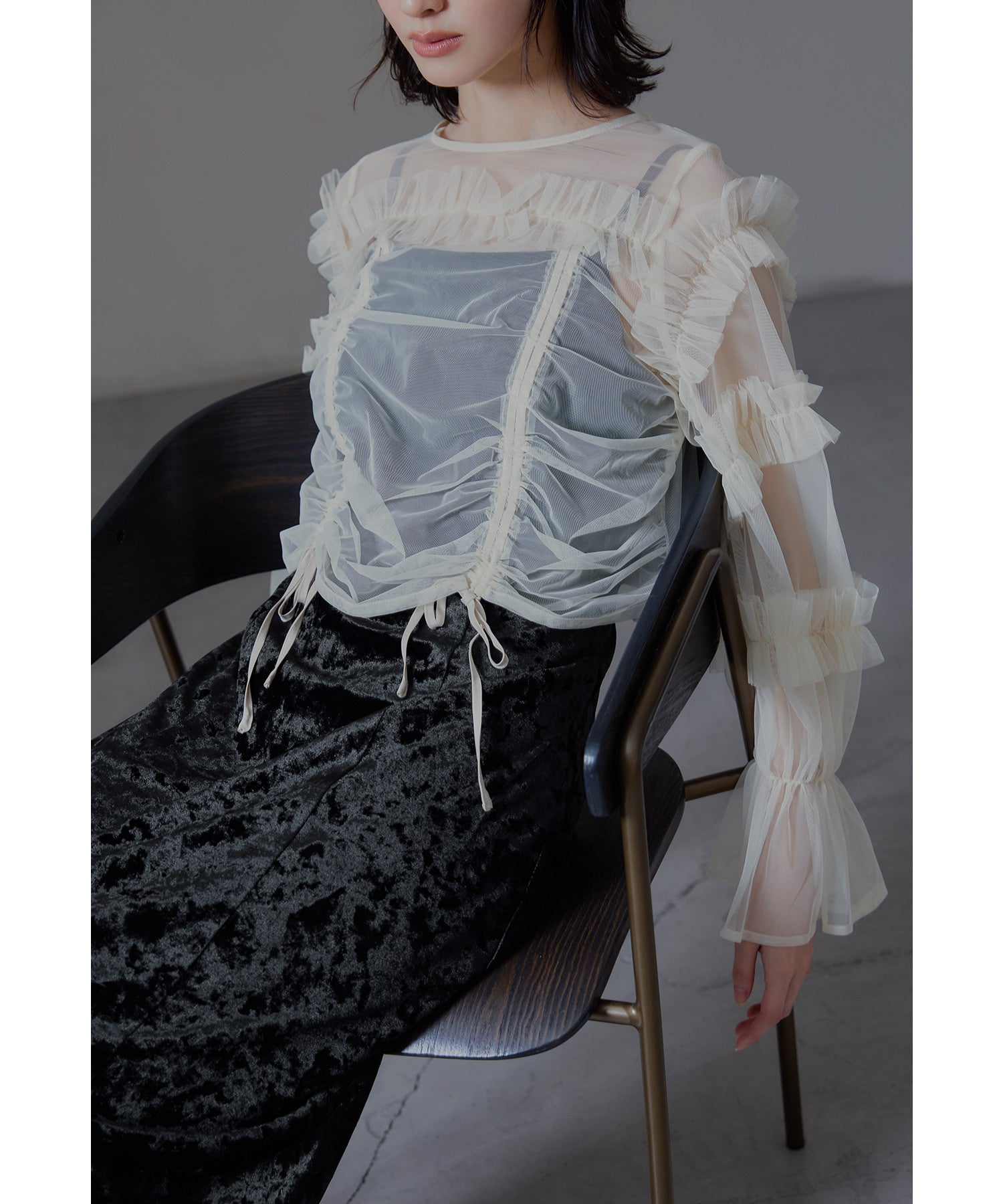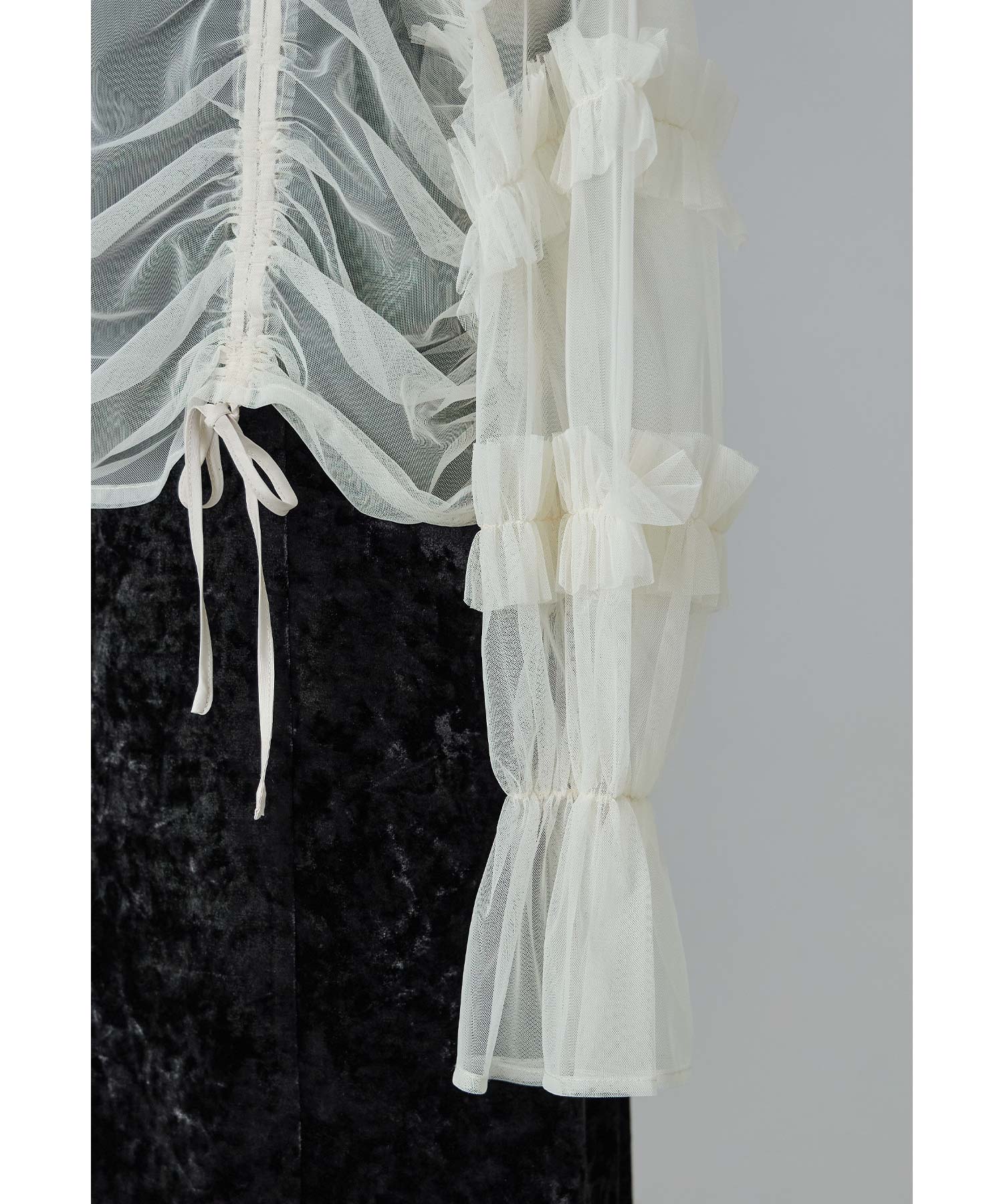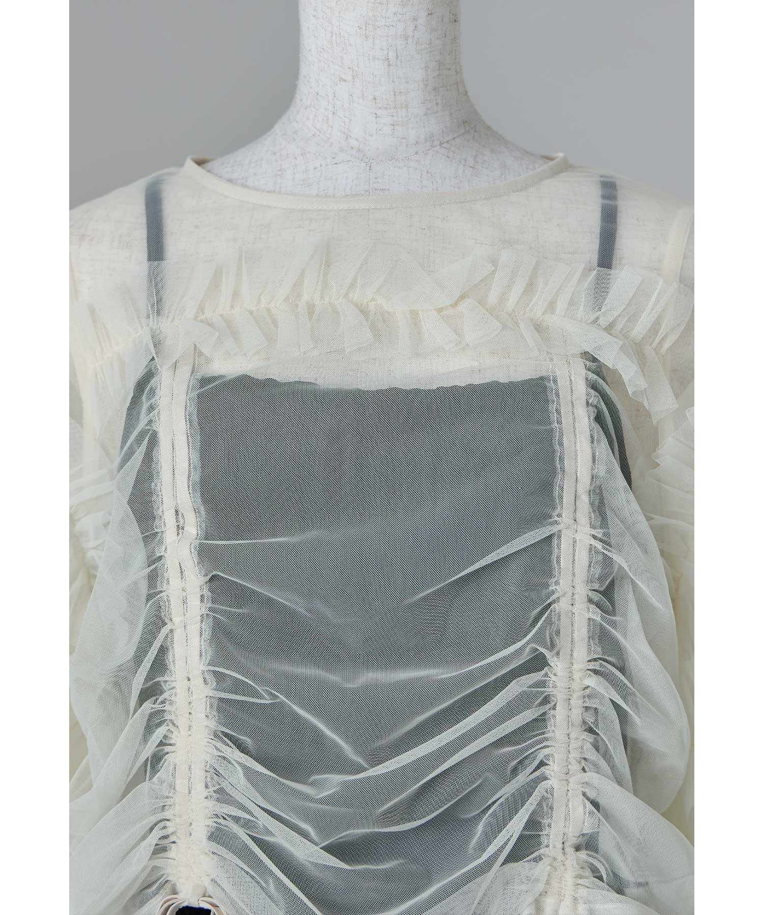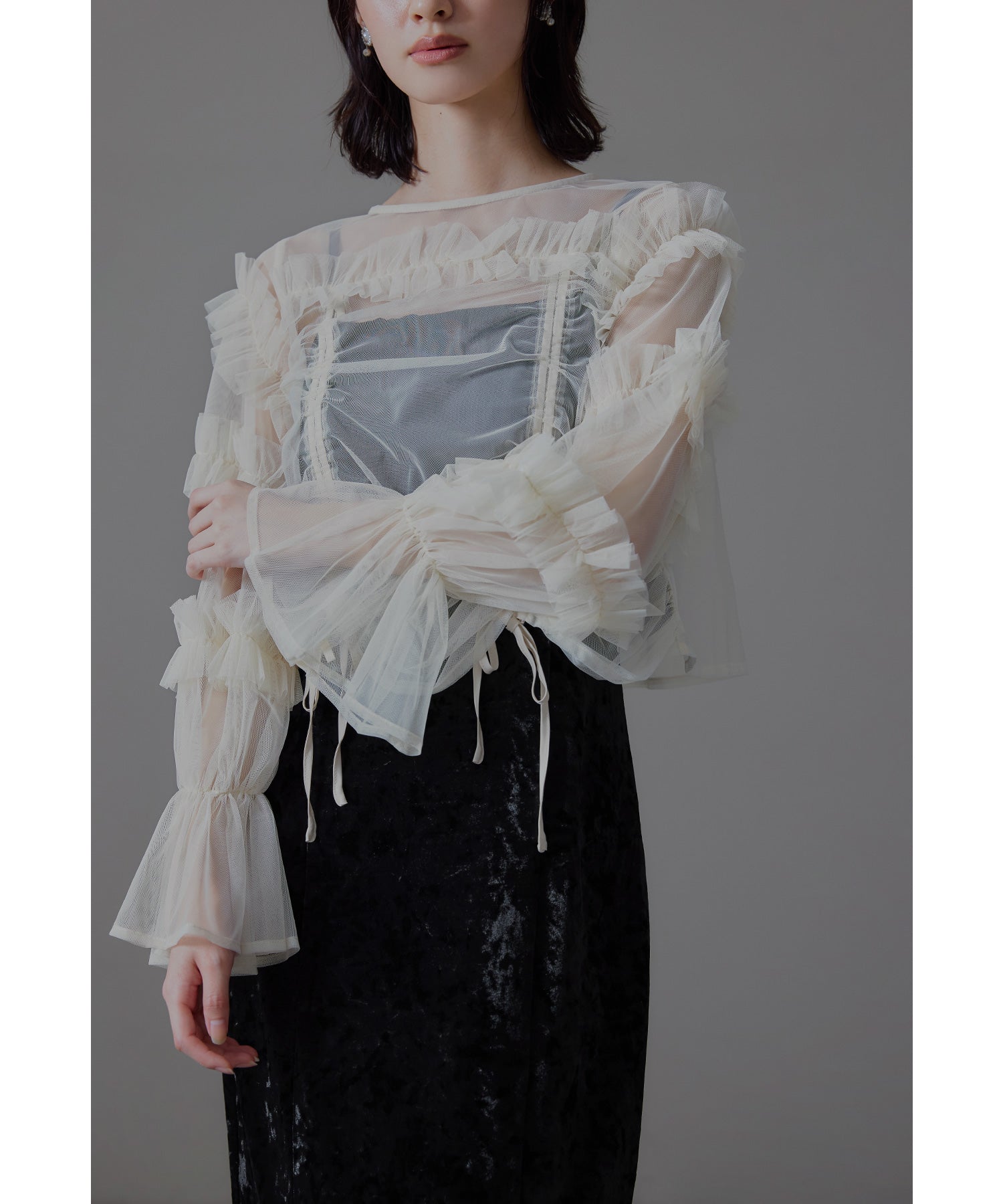 チュールトップスは、ギャザーやフリルをたっぷり施したデザインで
