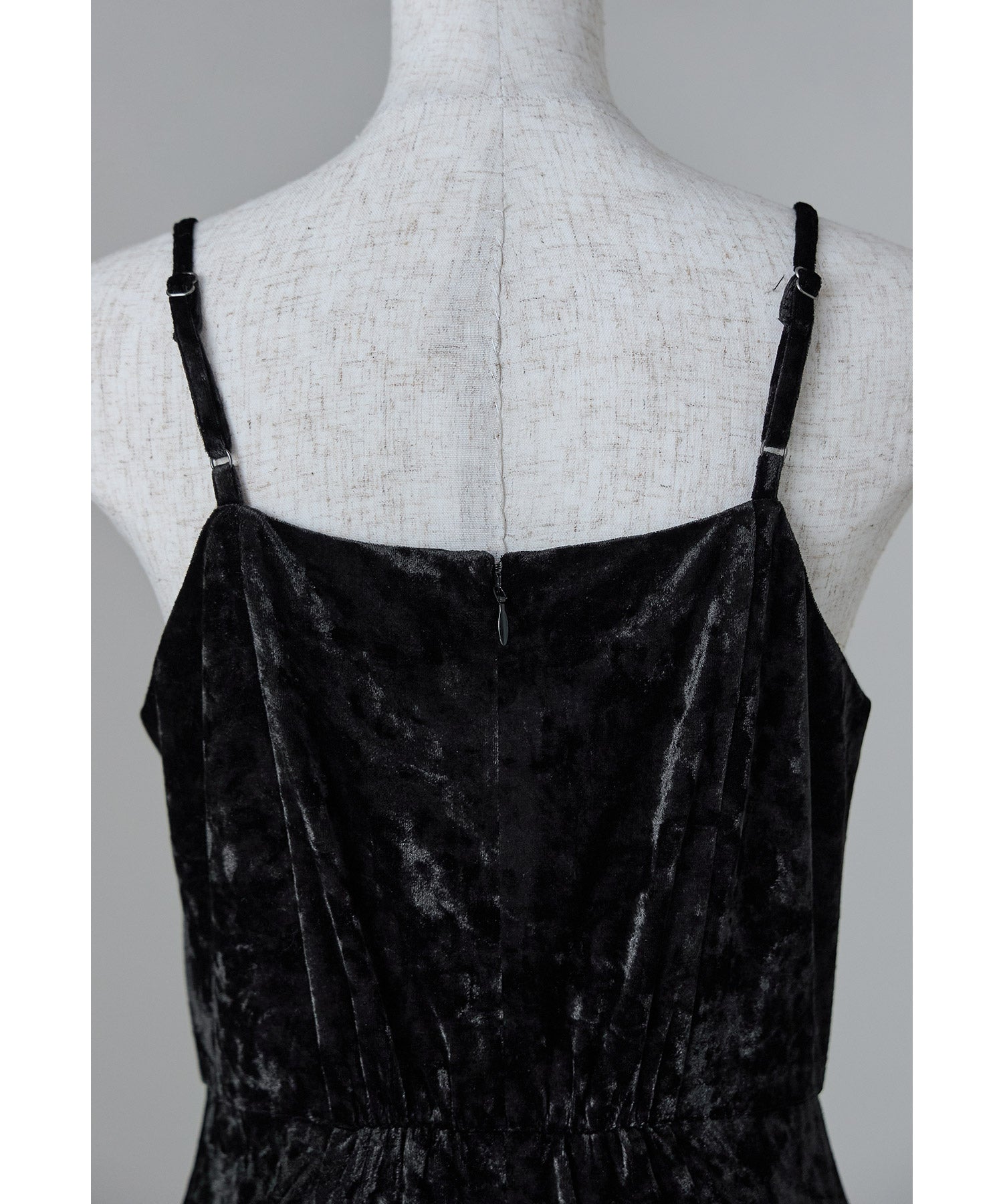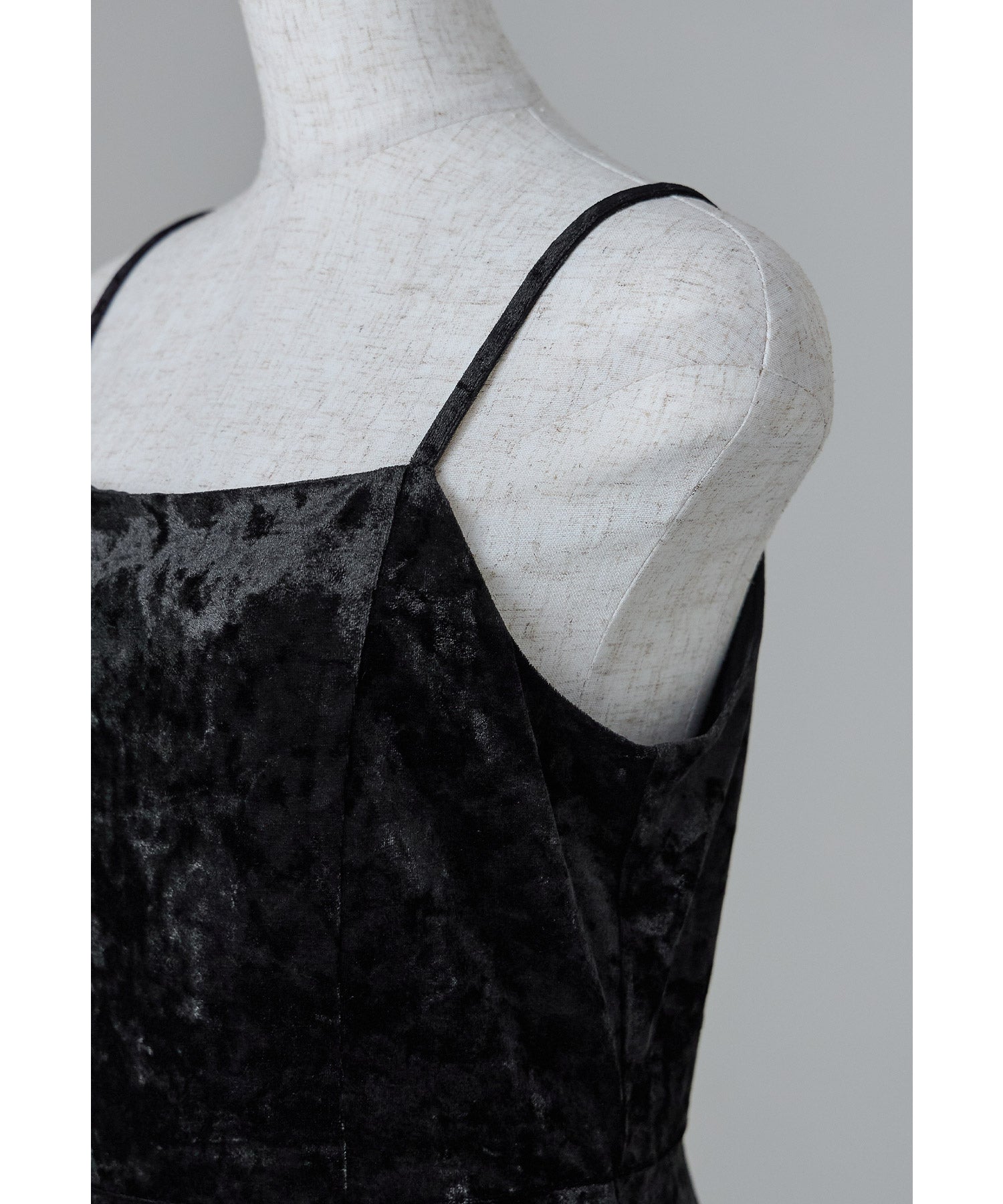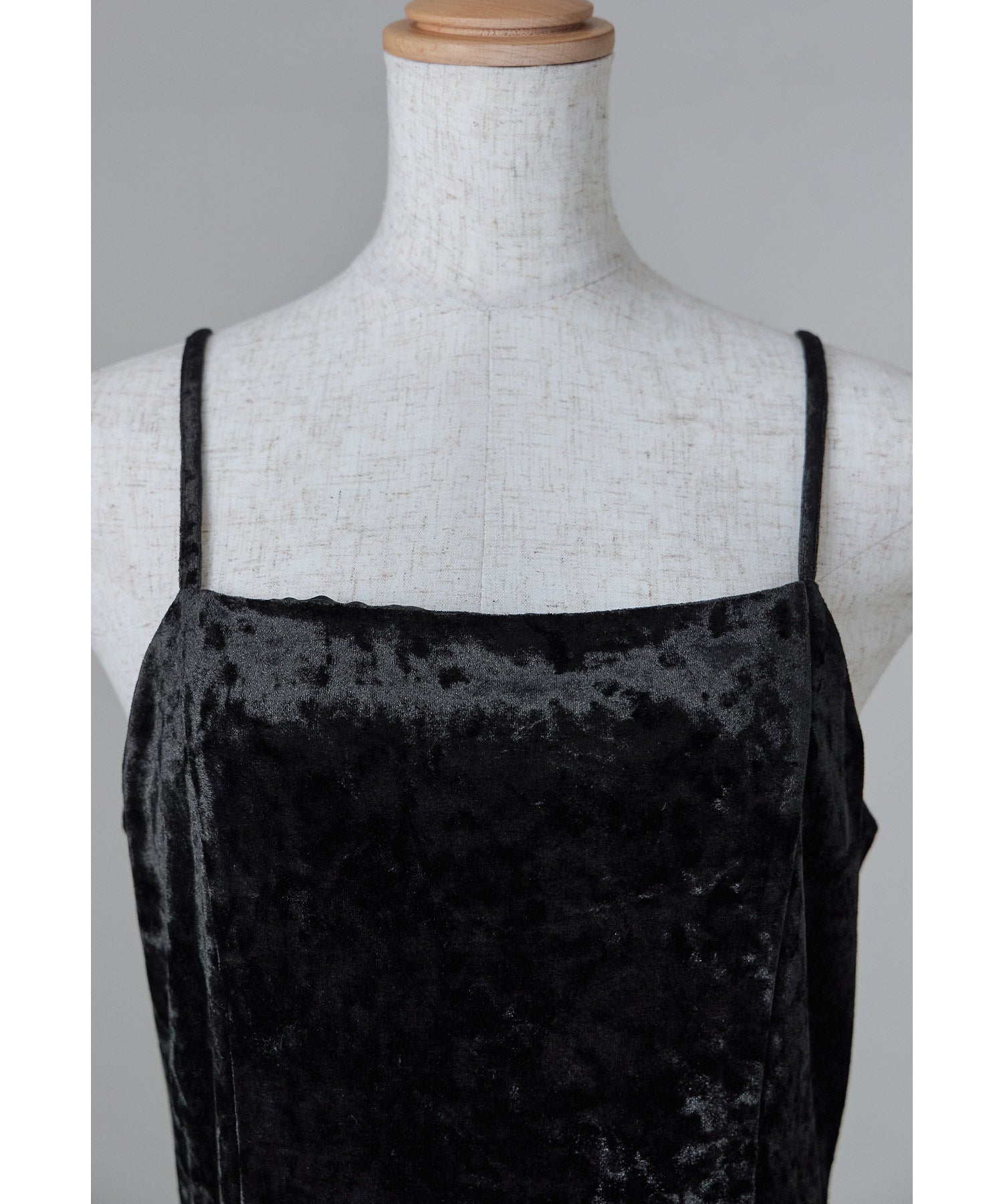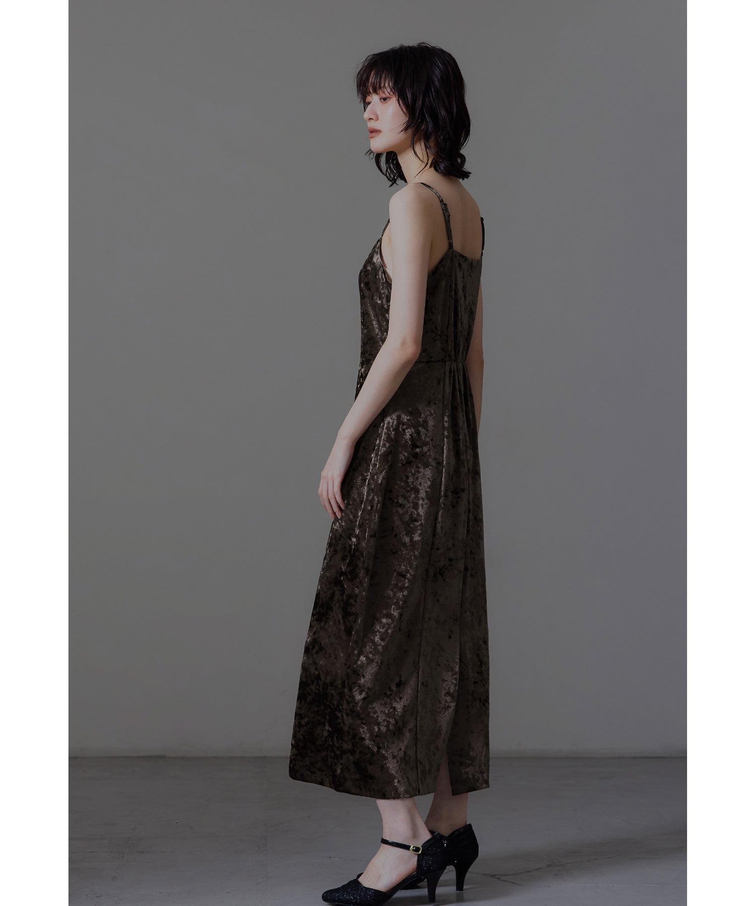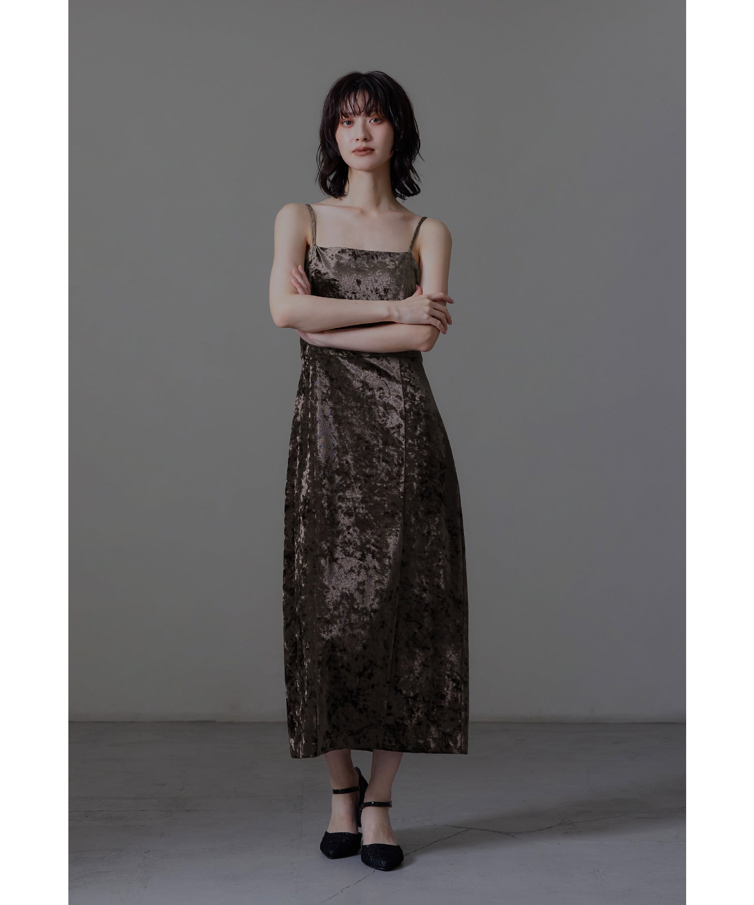 クラッシュベロアのキャミワンピースは、落ち着いた光沢感で上品な雰囲気を演出。