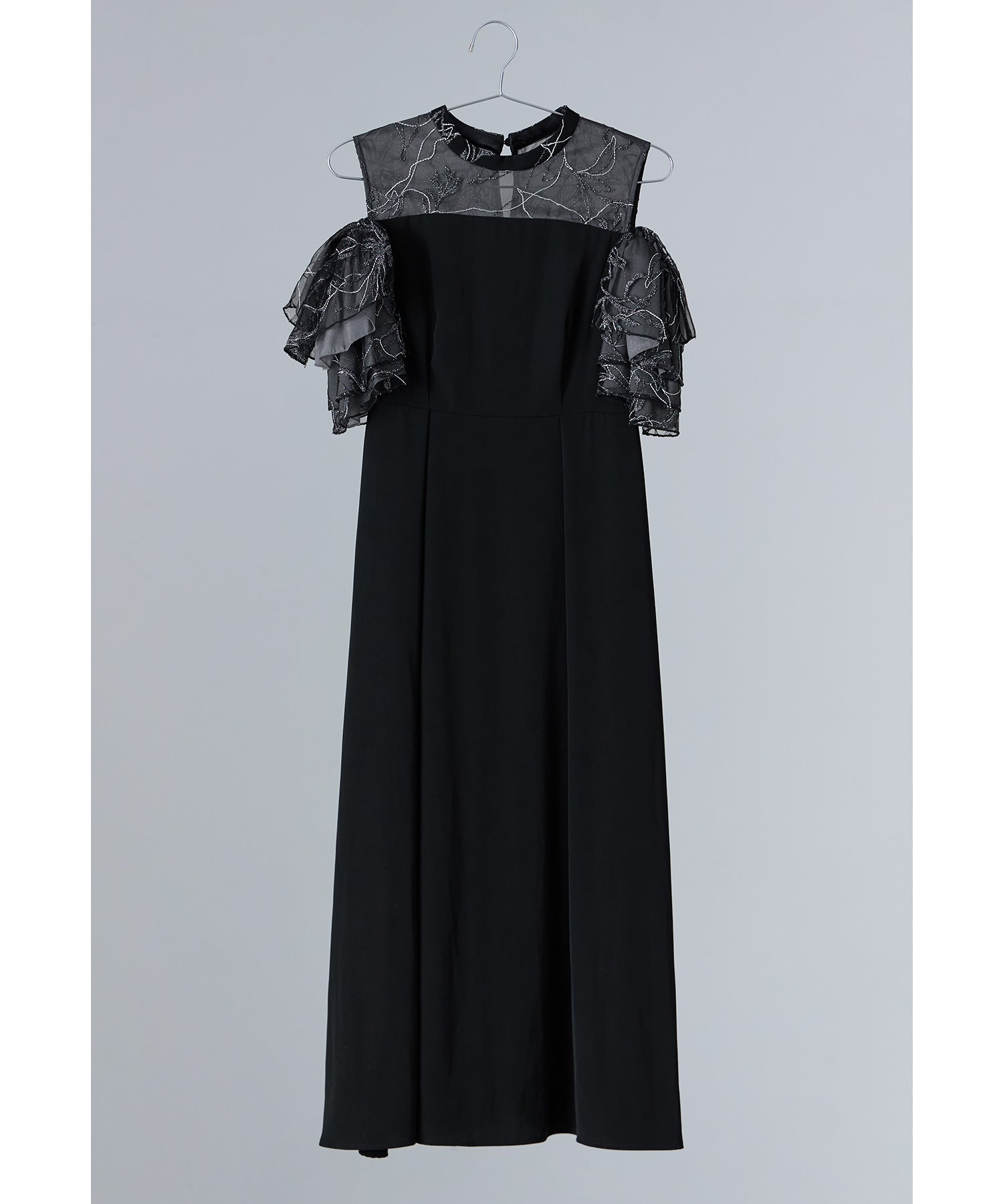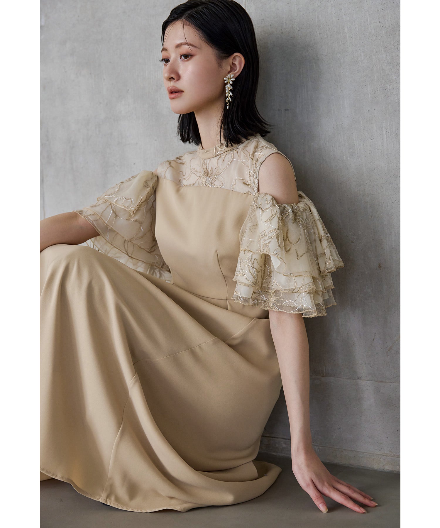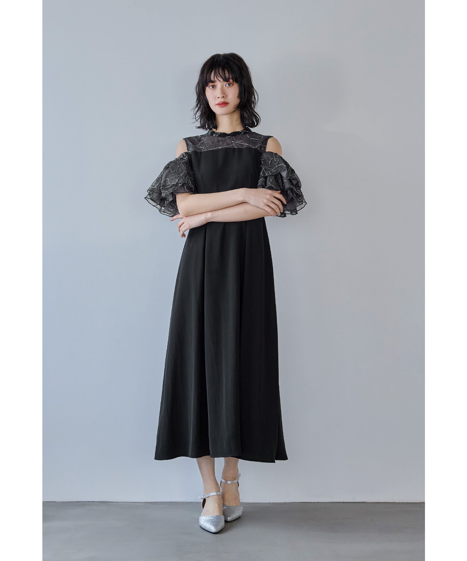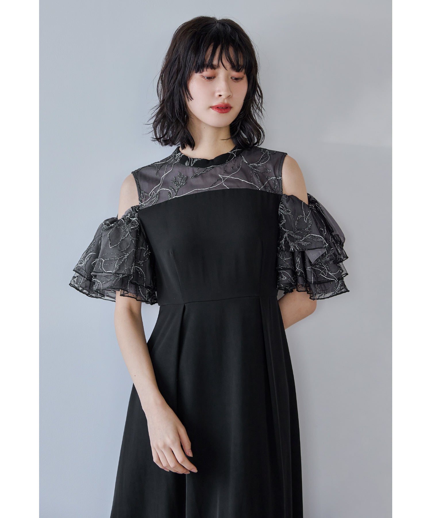 Rname オフショルフリルフラワー刺繍ドレス パーティードレス 結婚式 ワンピース オフショルダー 花柄 チュール シアー タック 半袖 ロング丈 お呼ばれ パーティー 二次会 披露宴 謝恩会 成人式 同窓会 卒業式 フォーマル オケージョンドレス 黒 ブラウン ベージュ ブルーグレー
