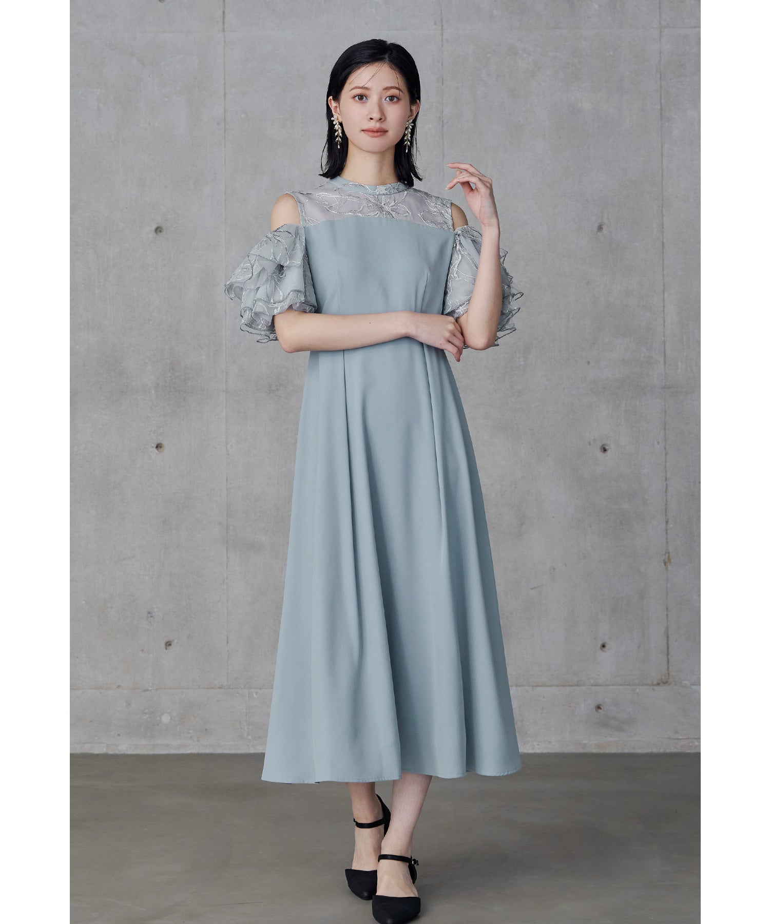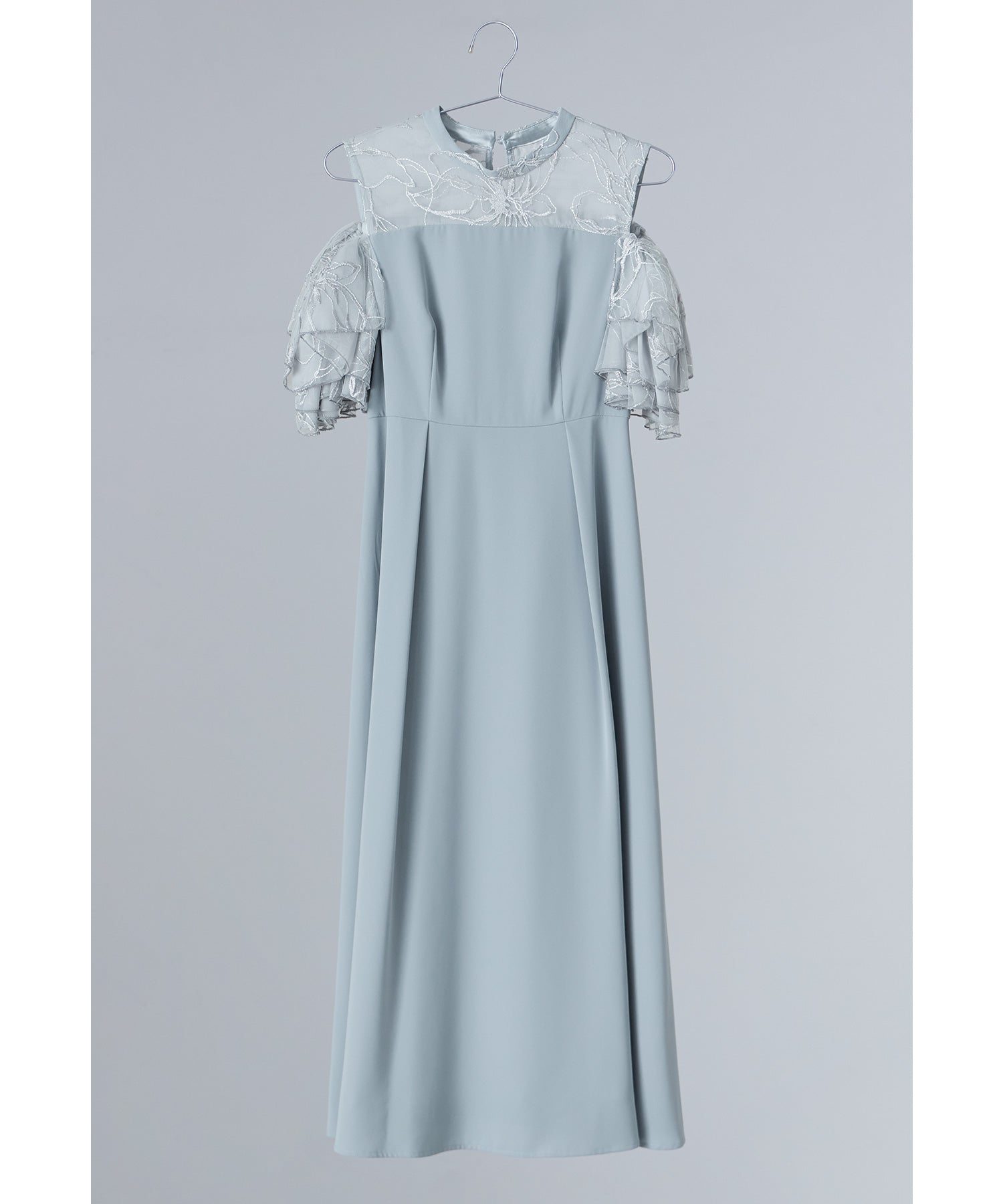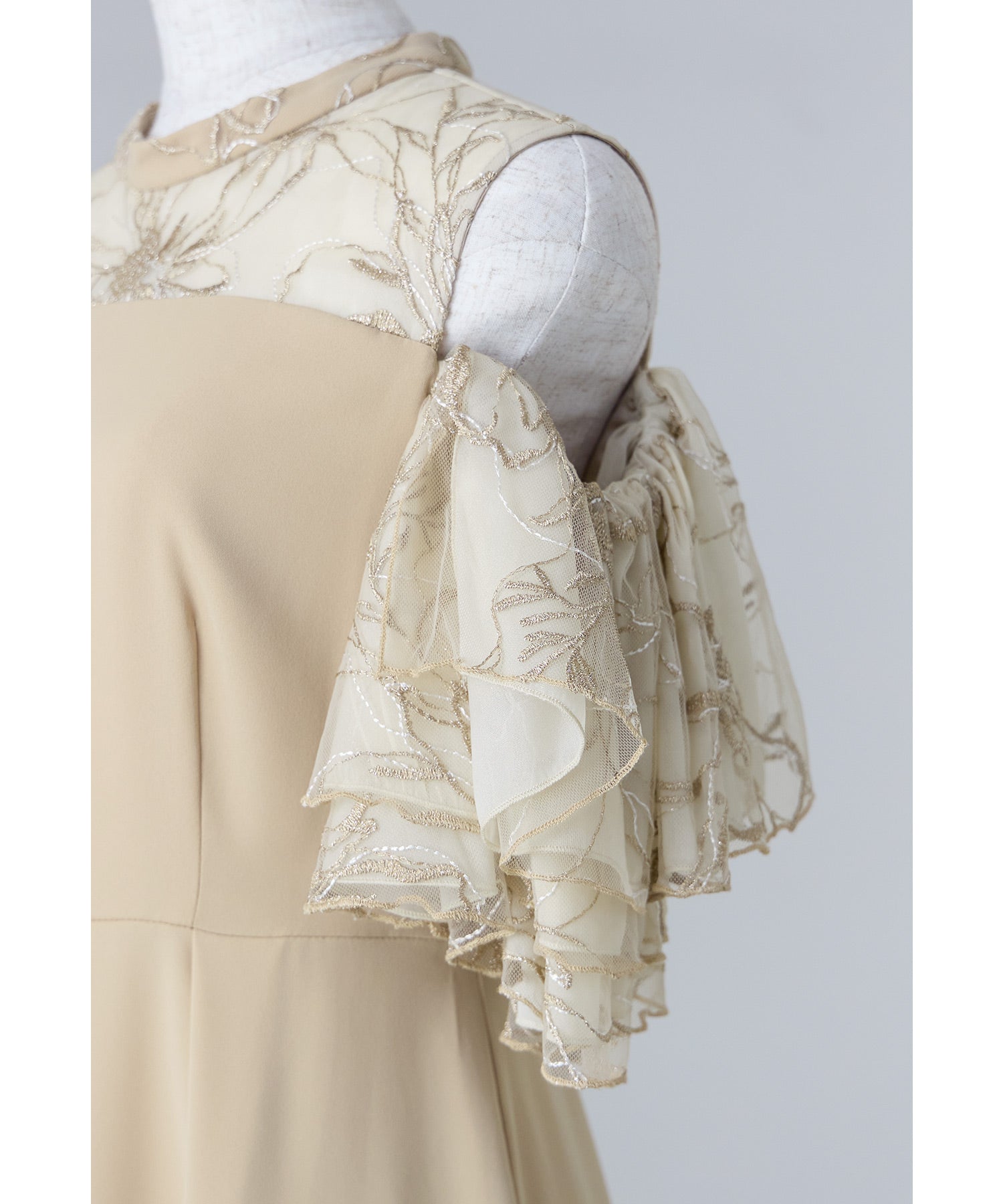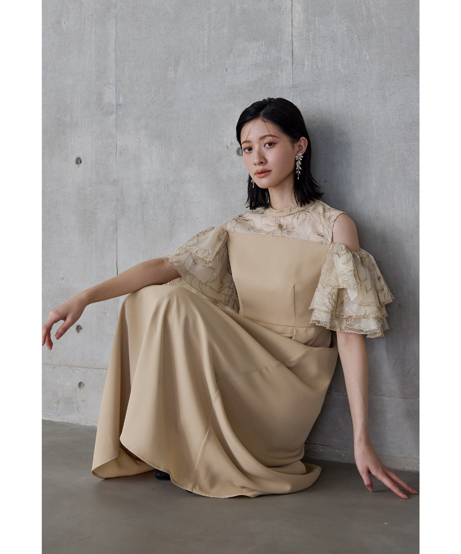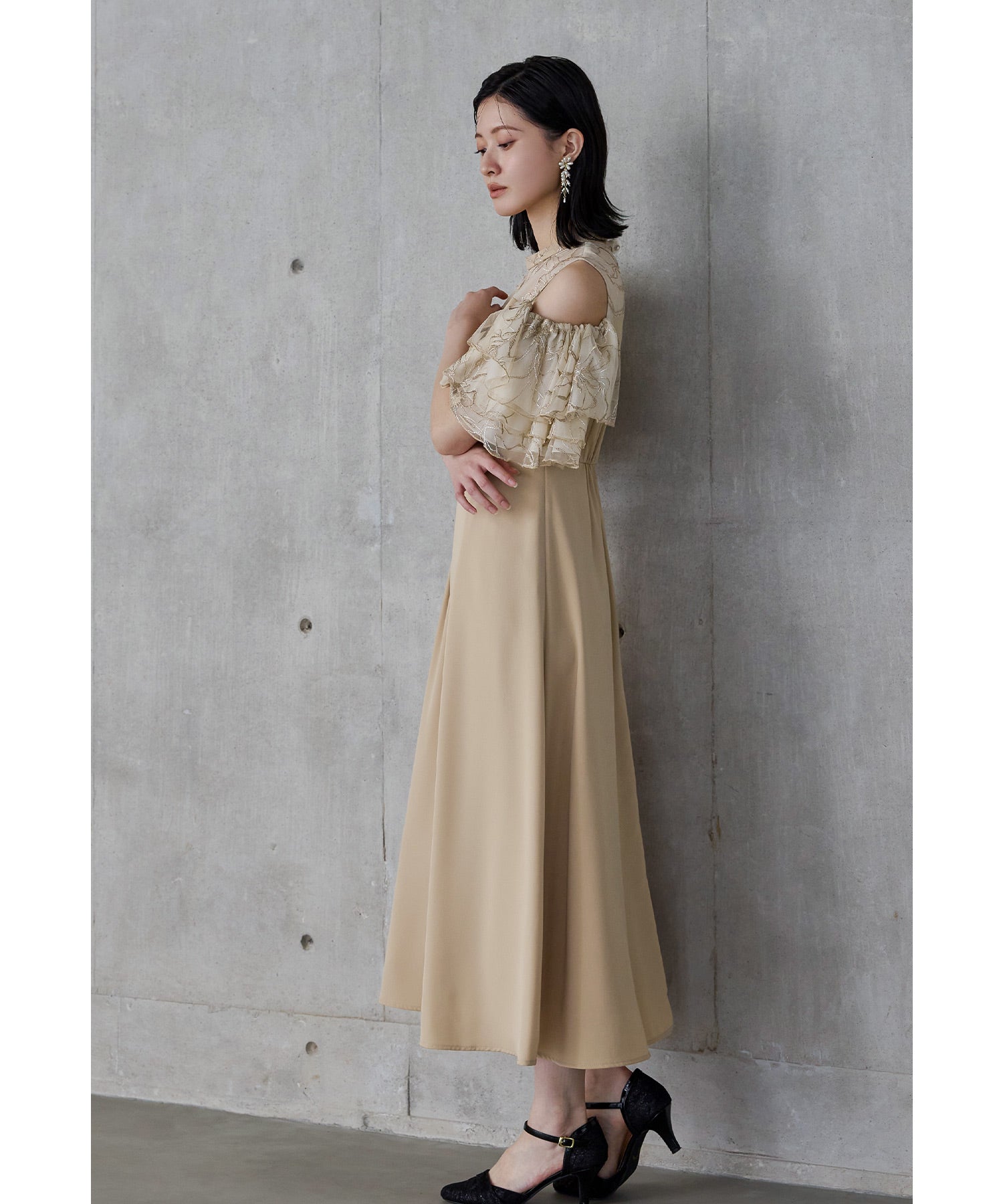 Rname オフショルフリルフラワー刺繍ドレス パーティードレス 結婚式 ワンピース オフショルダー 花柄 チュール シアー タック 半袖 ロング丈 お呼ばれ パーティー 二次会 披露宴 謝恩会 成人式 同窓会 卒業式 フォーマル オケージョンドレス 黒 ブラウン ベージュ ブルーグレー