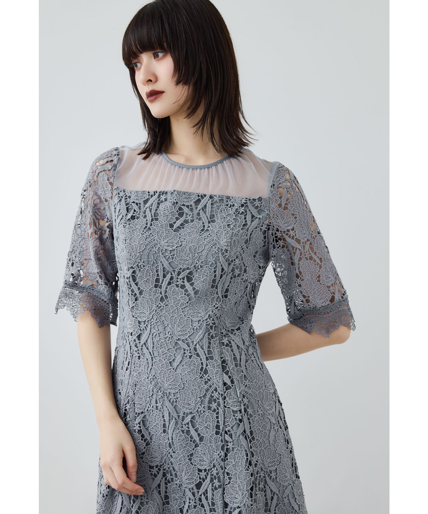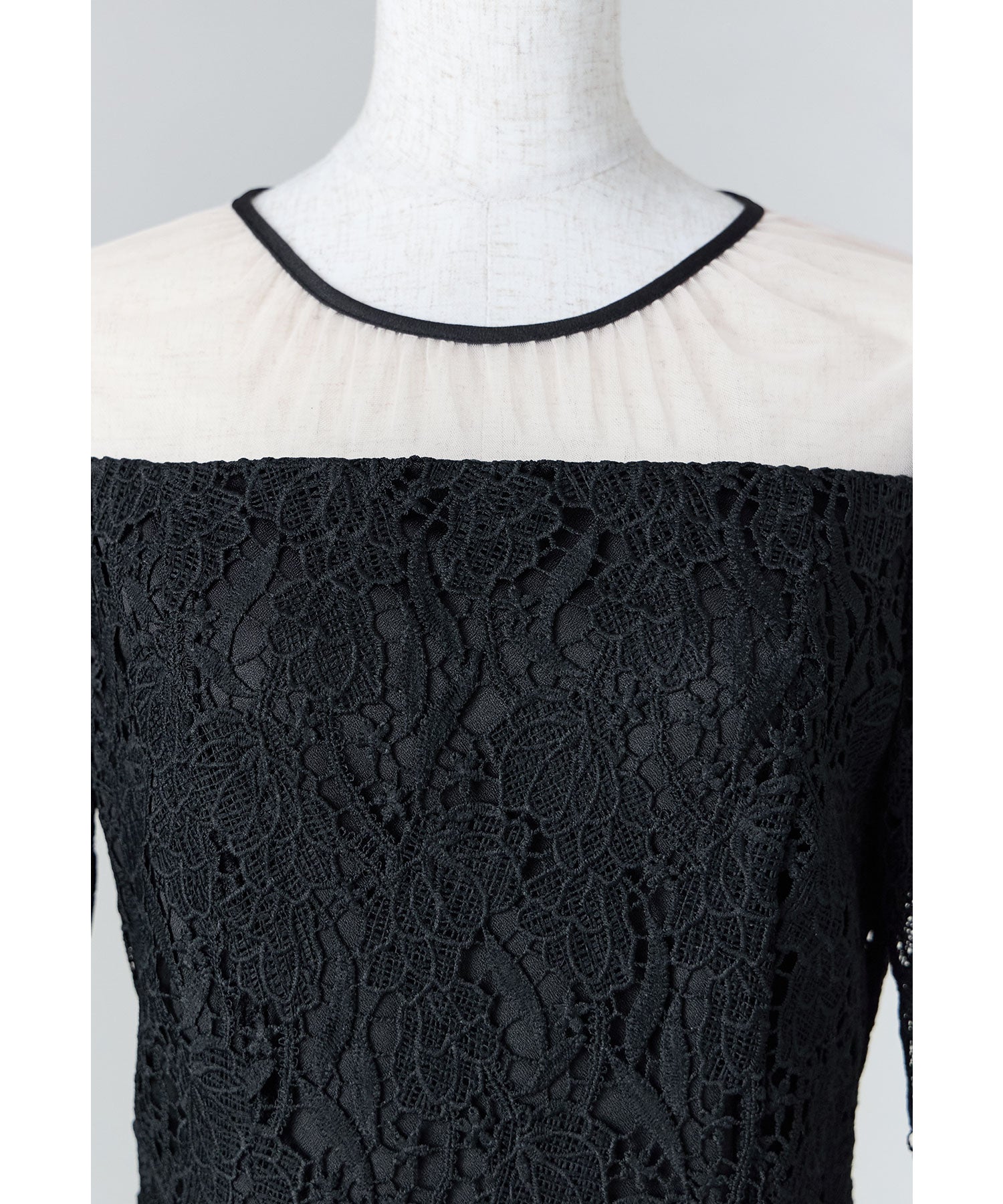 デコルテ部分には程よい透け感のチュール素材を切り替えて