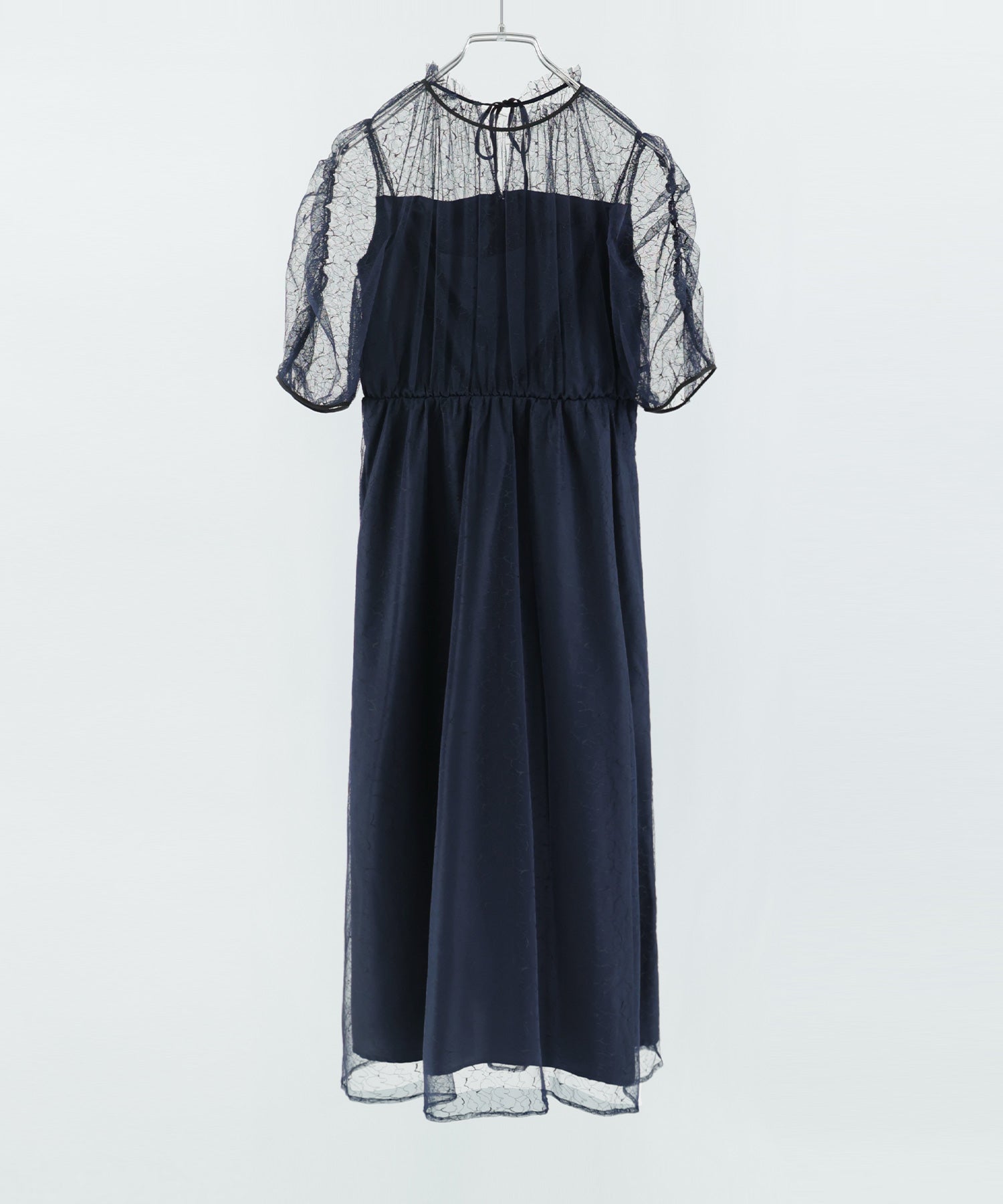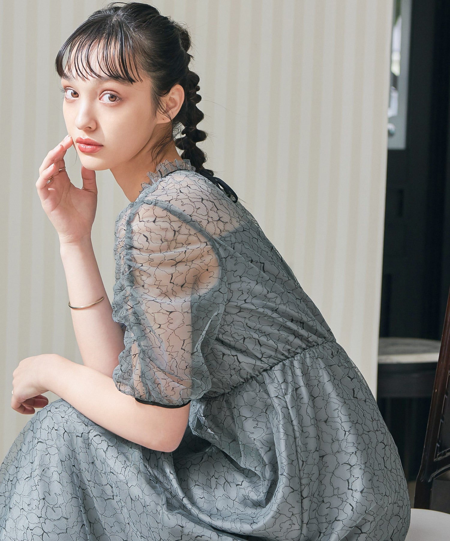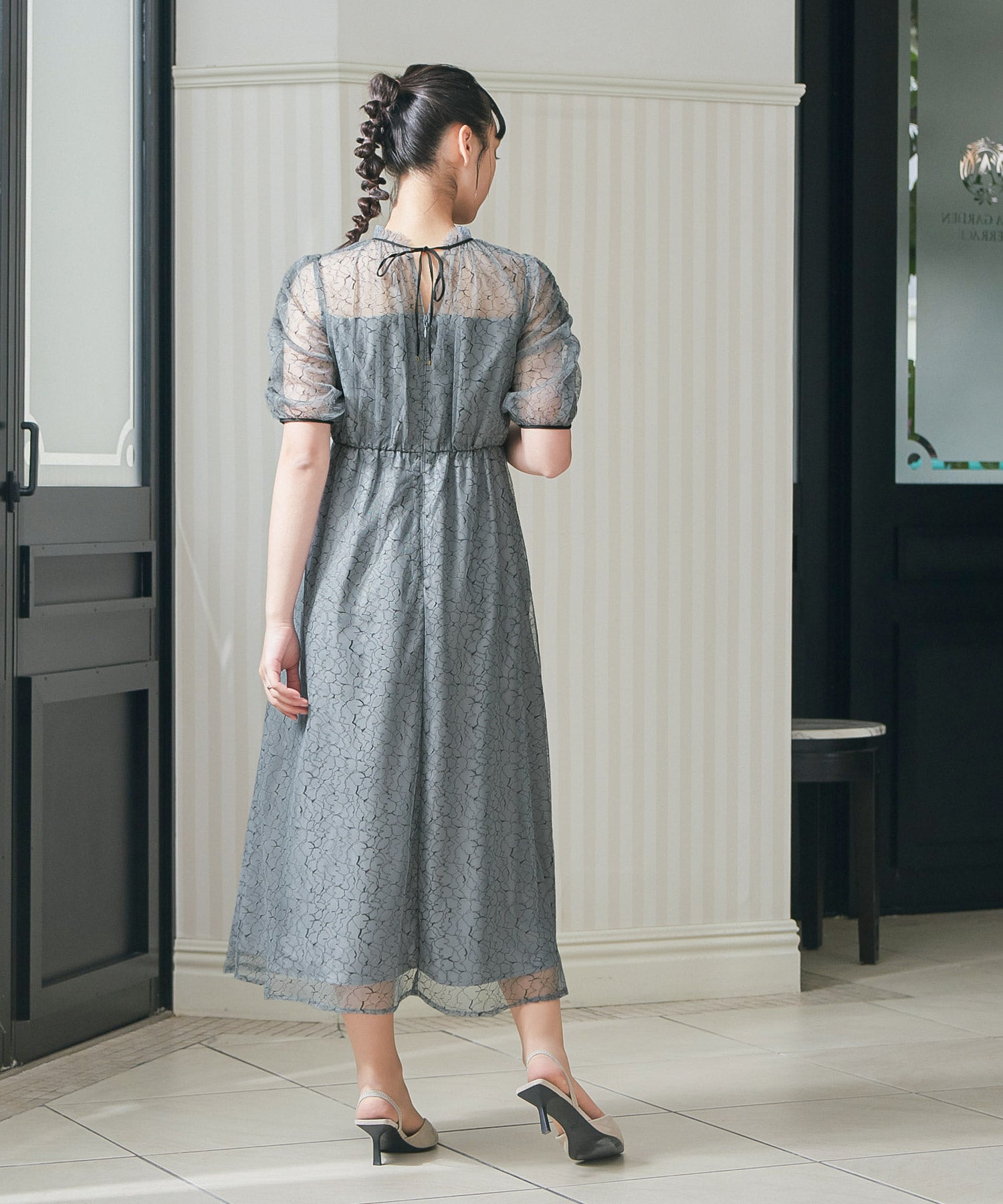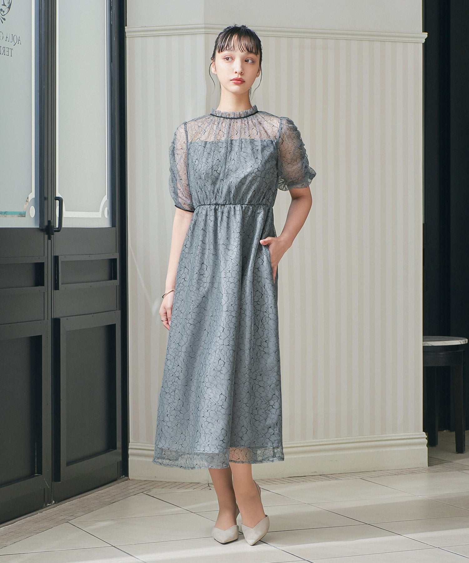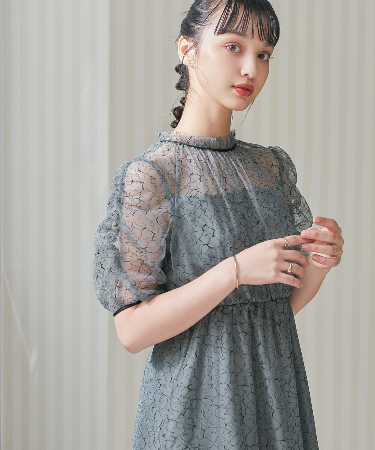 配色レースとギャザーをミックスしたほどよいバランス感が絶妙に大人可愛いパーティードレス。
