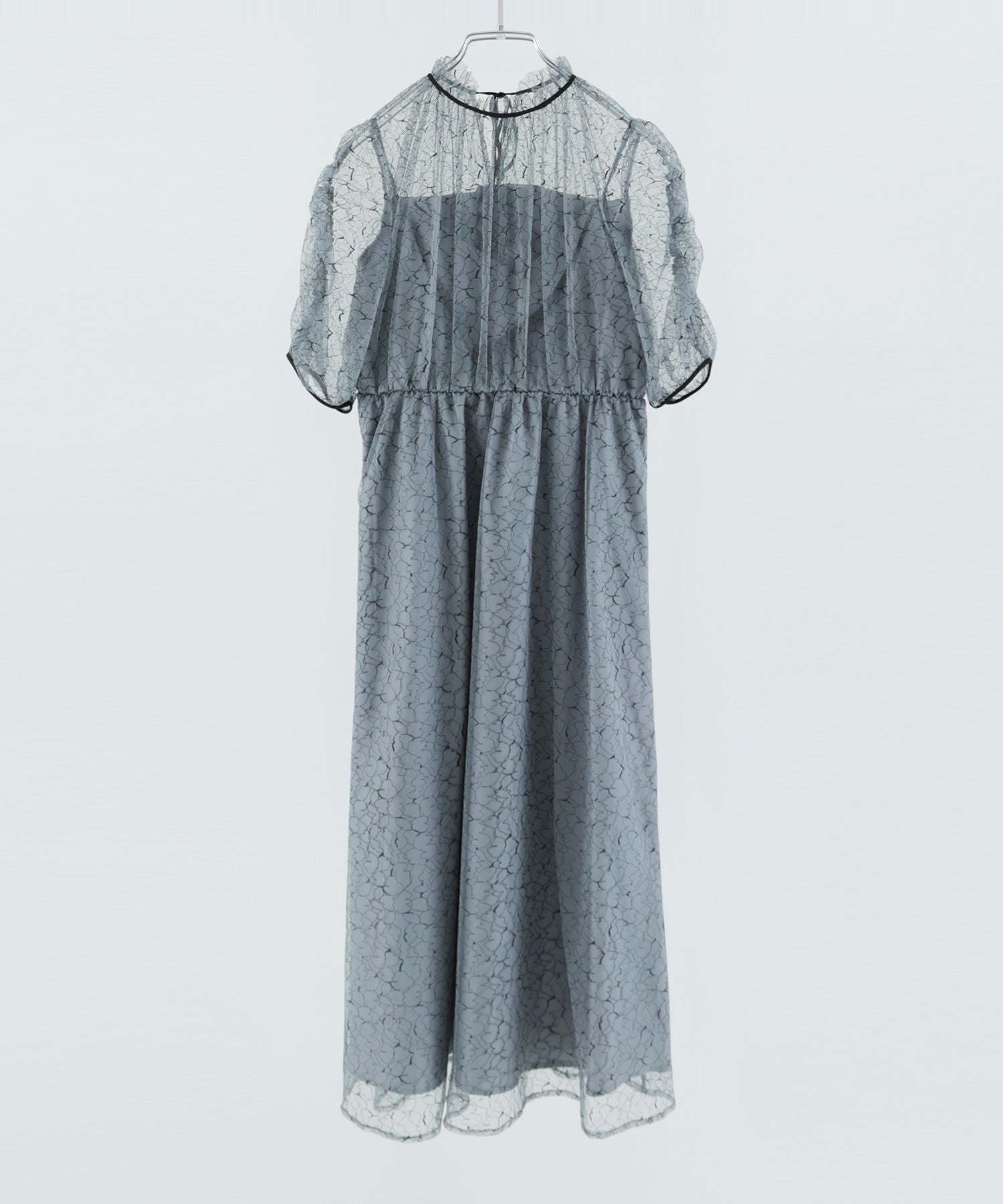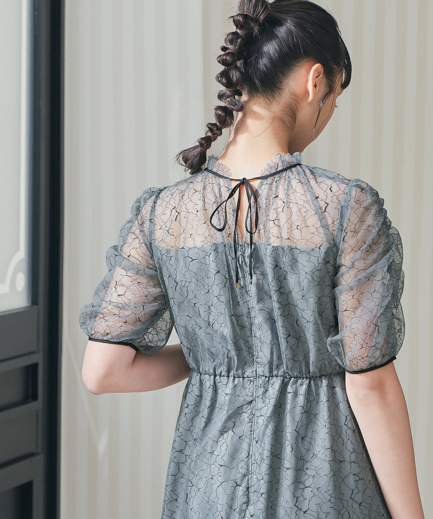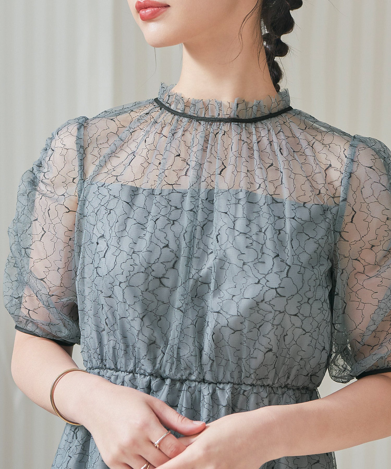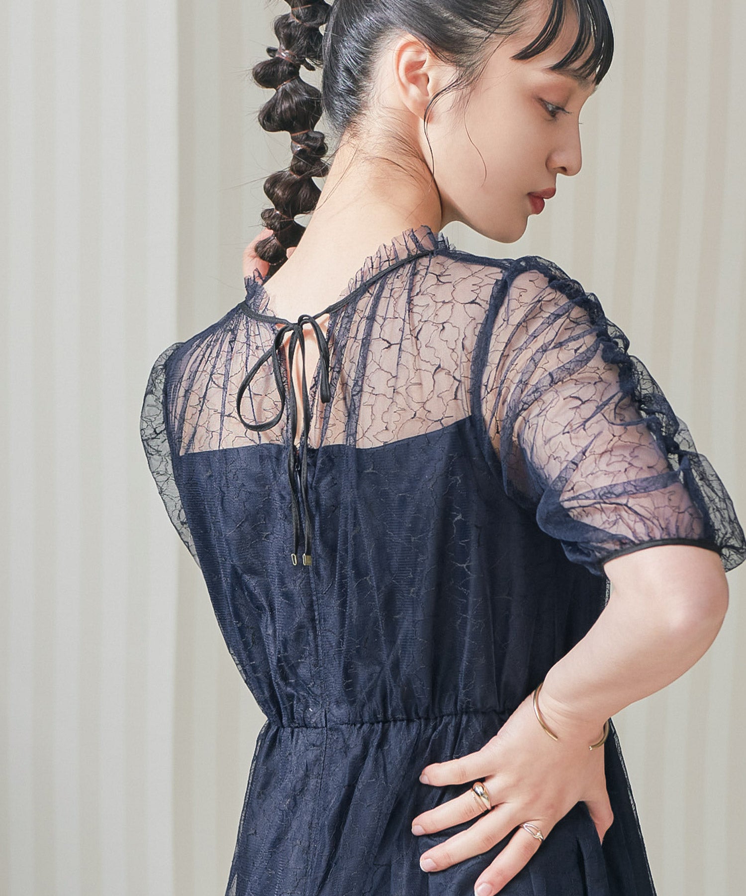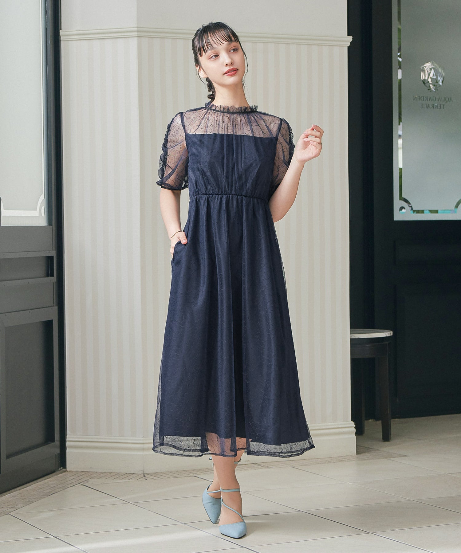 配色レースとギャザーをミックスしたほどよいバランス感が絶妙に大人可愛いパーティードレス。