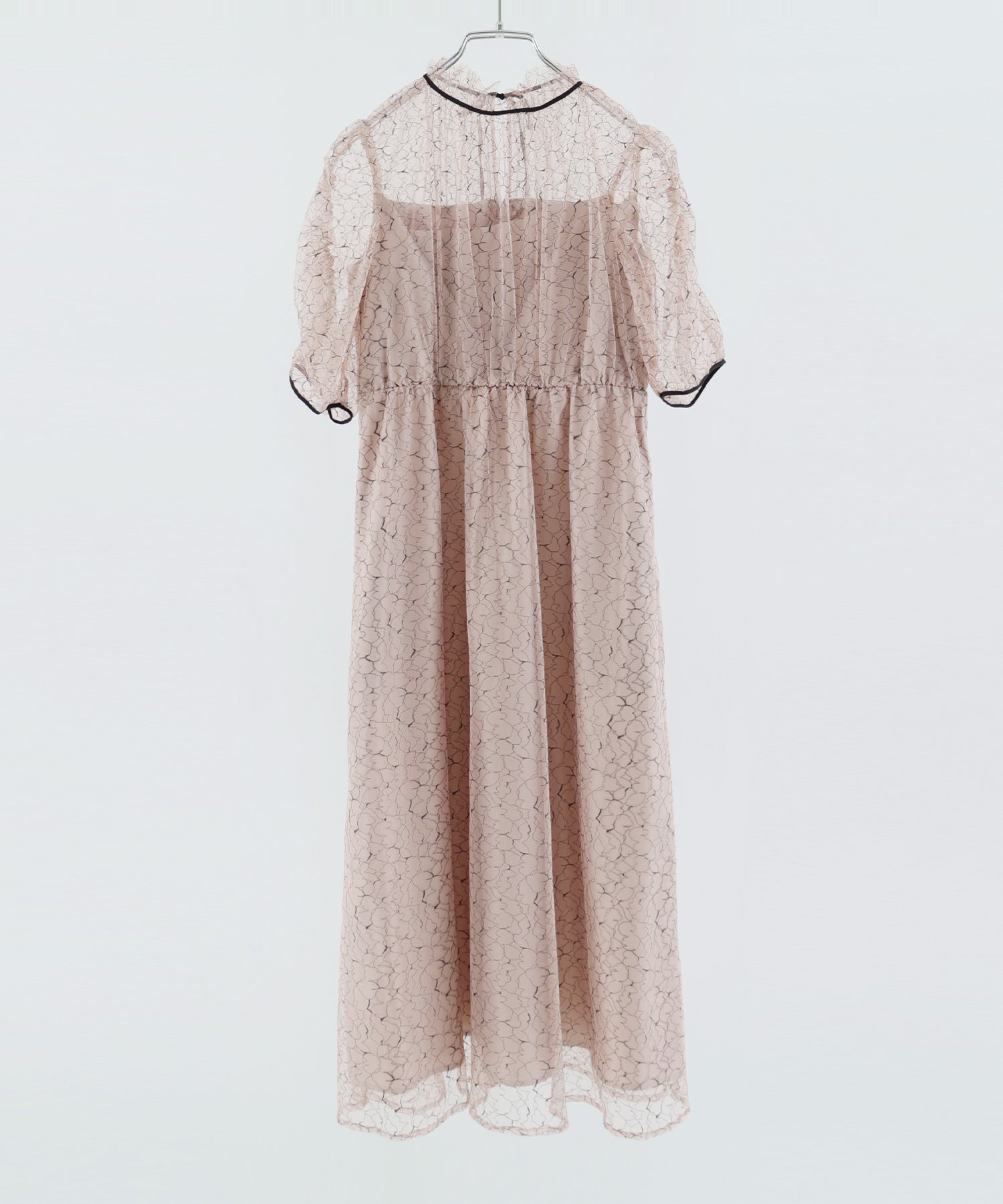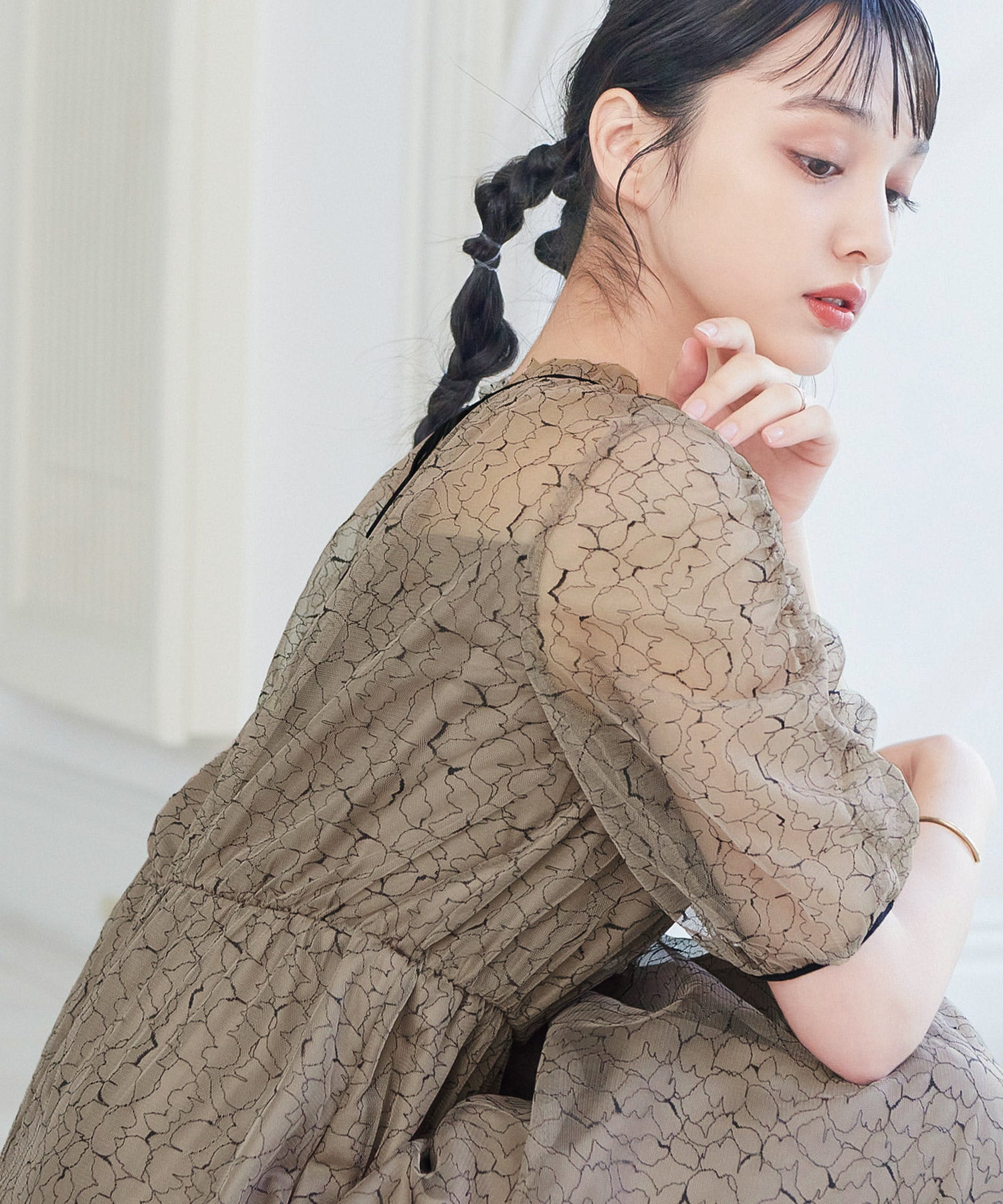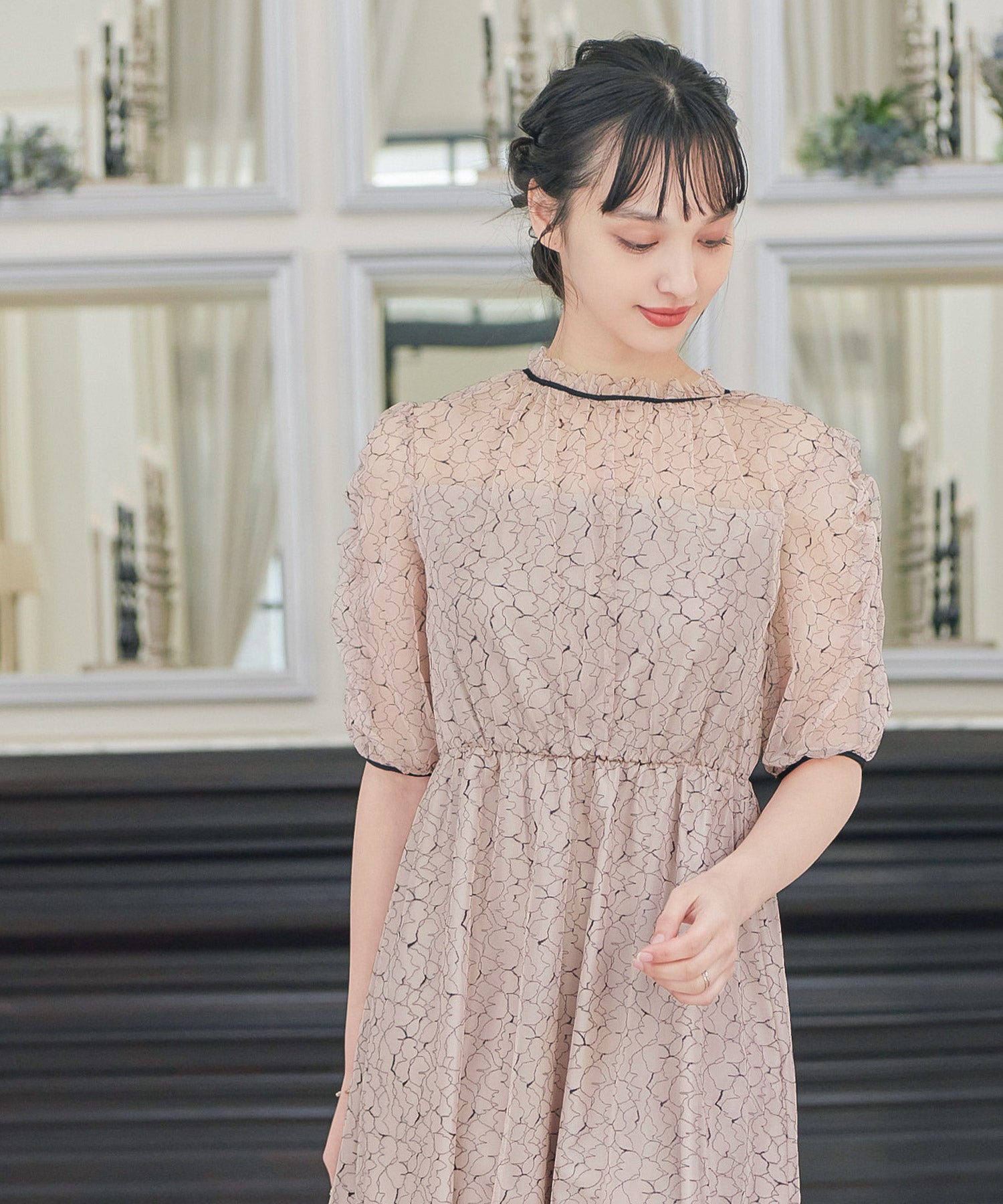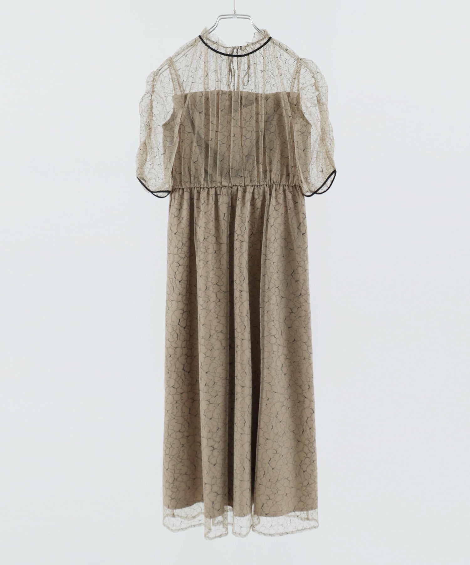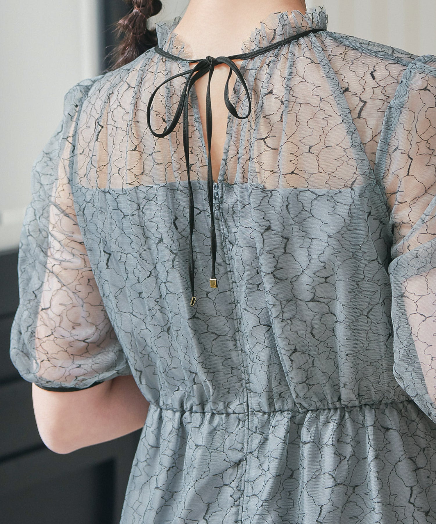 配色レースとギャザーをミックスしたほどよいバランス感が絶妙に大人可愛いパーティードレス。