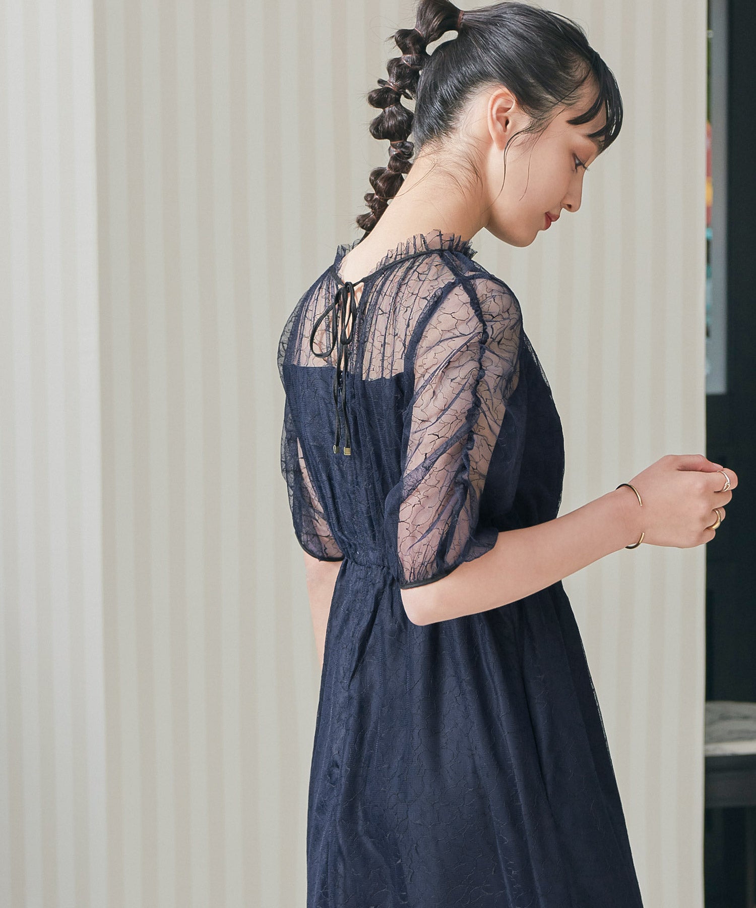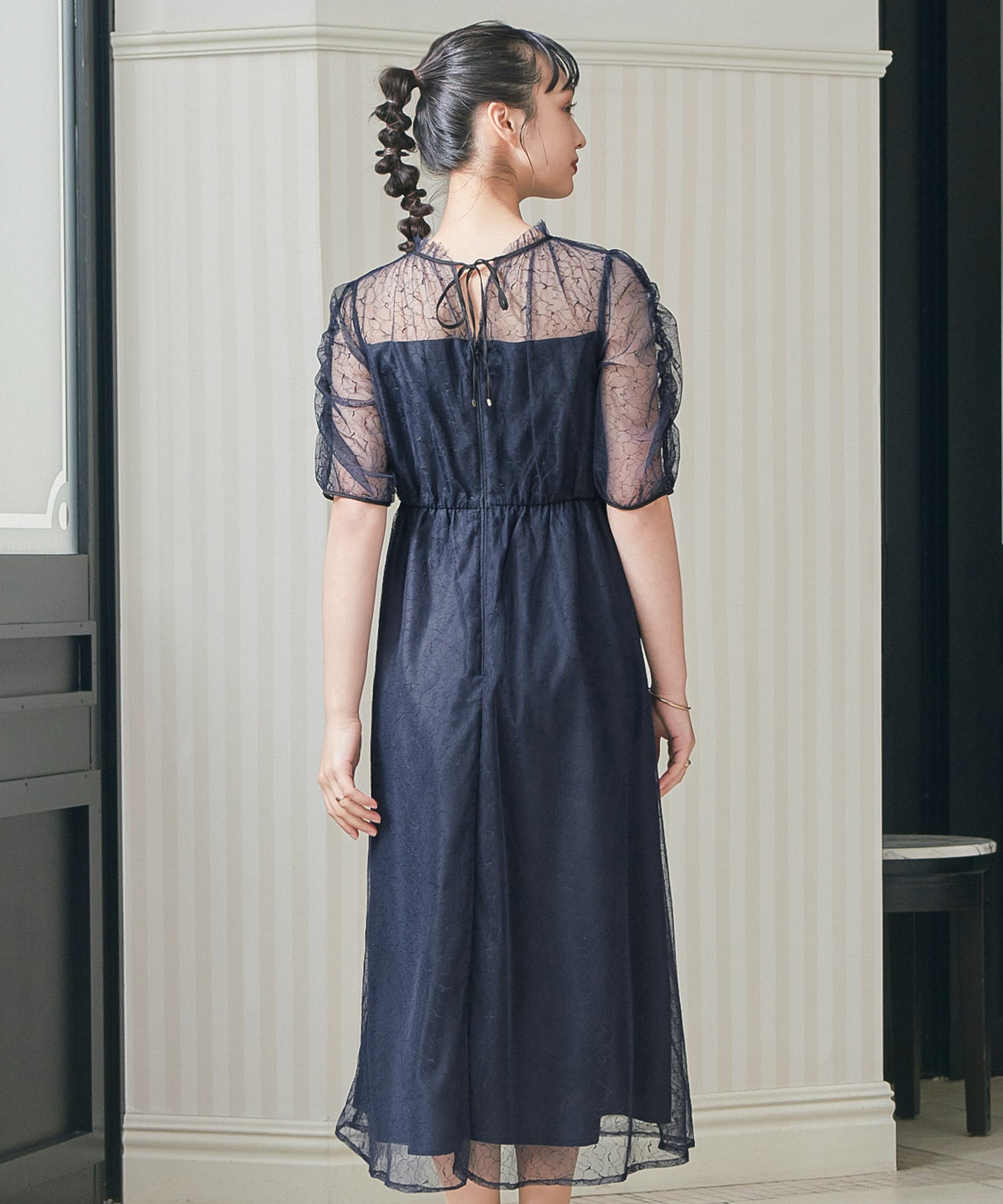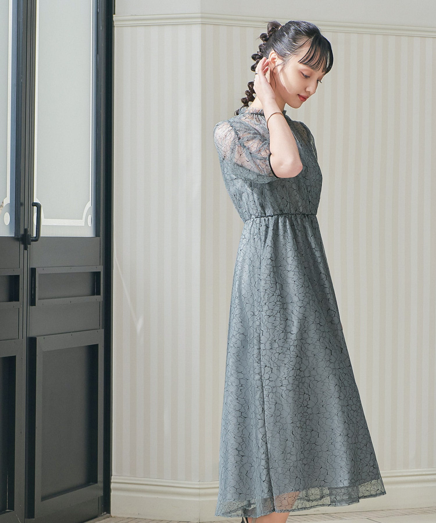 デコルテと袖部分は透け感の美しいふんわりとしたレース、スカート部分はフレアで大人っぽく女性らしさを引き立ててくれます。
