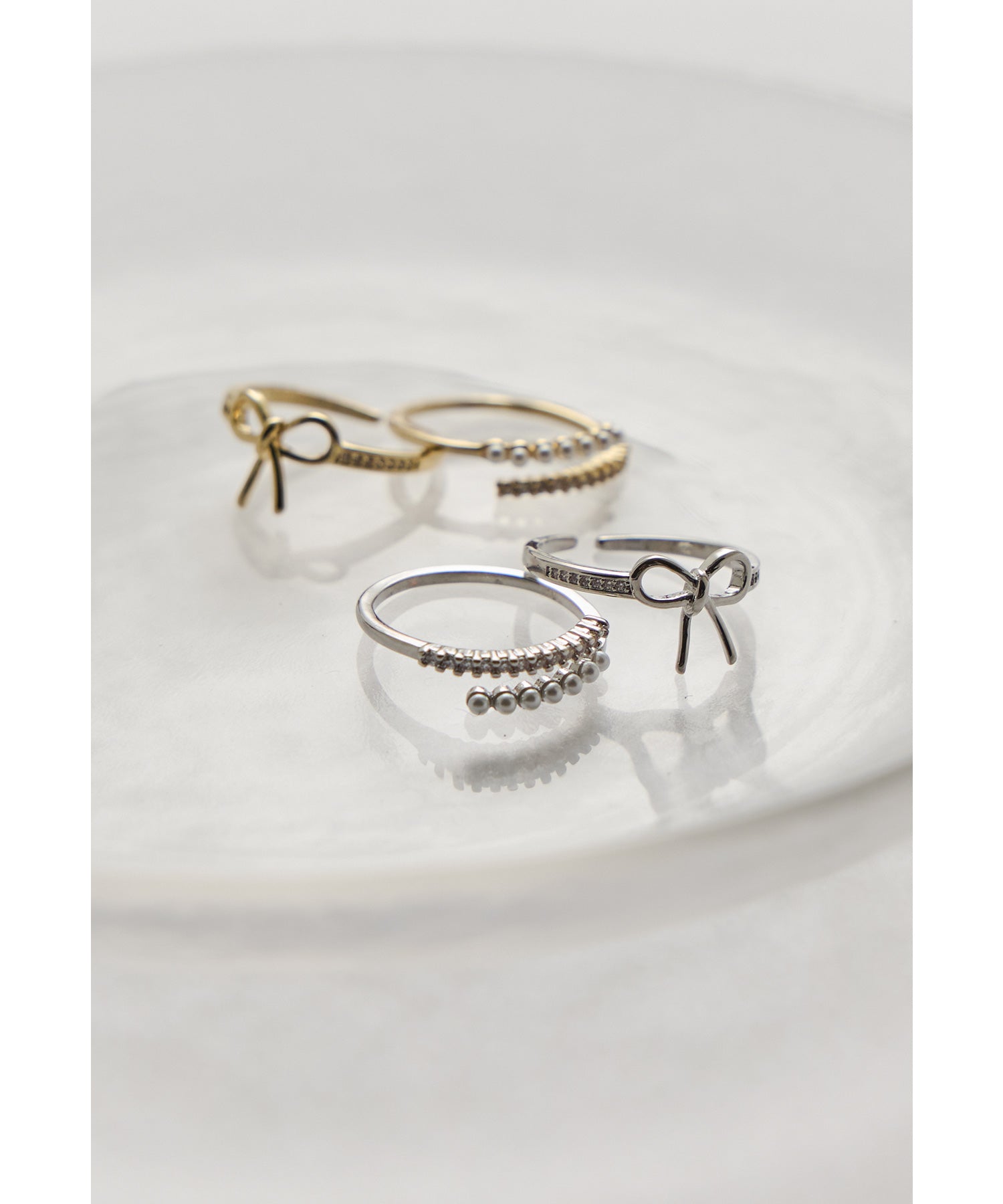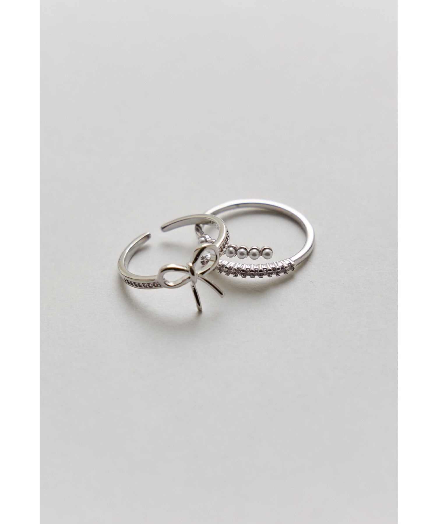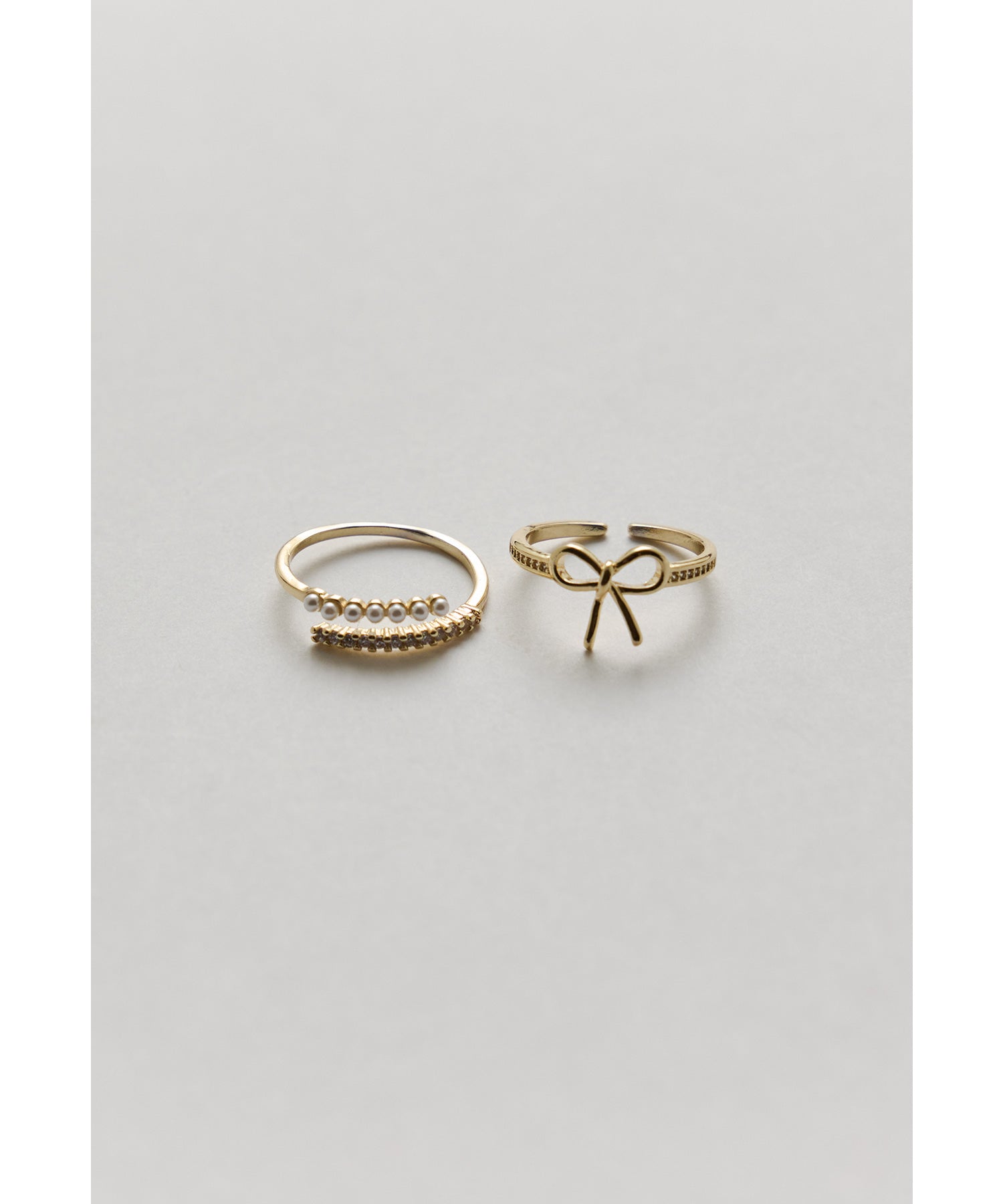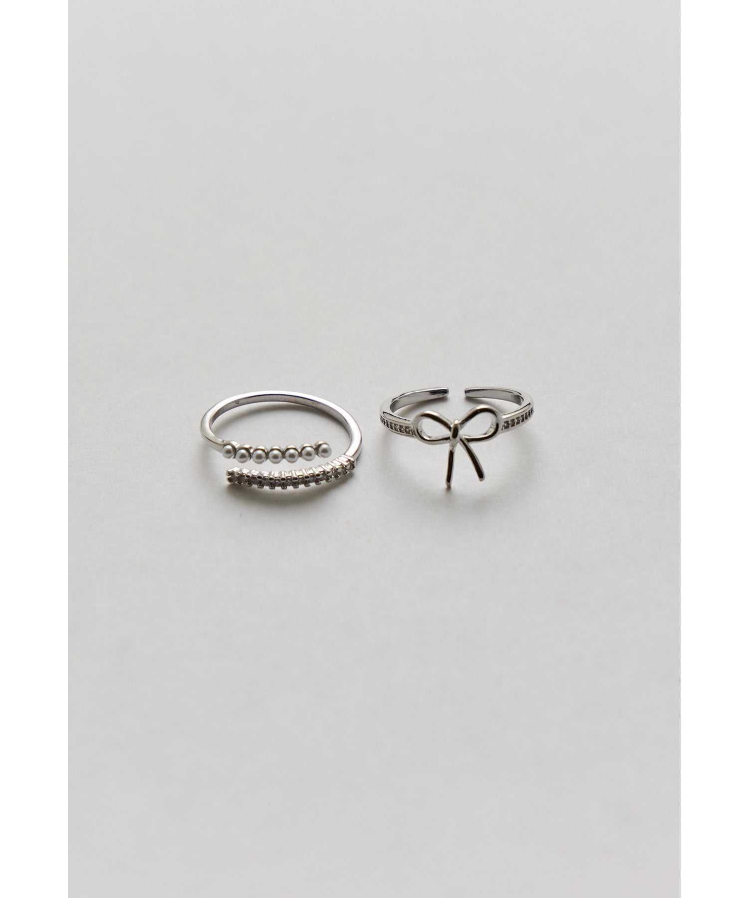 愛らしいリボンモチーフと華奢なパール×ビジューのリング2本セット。