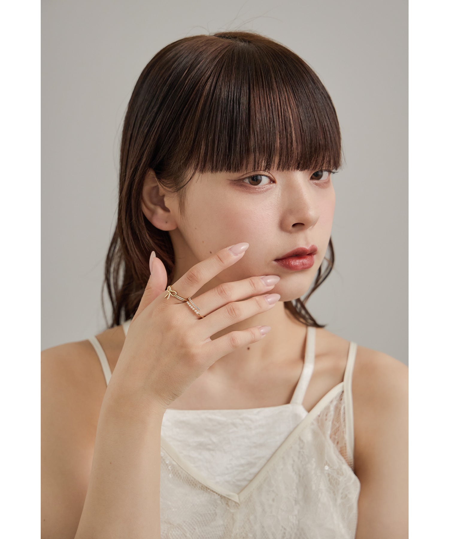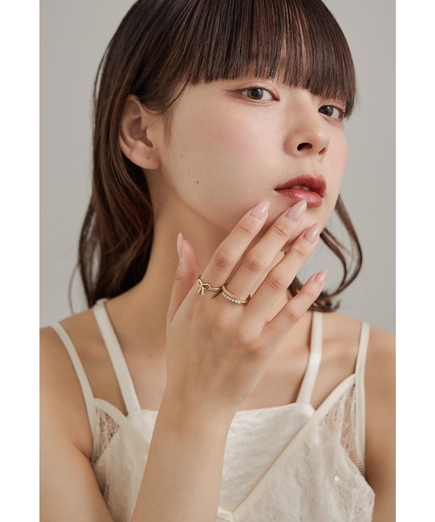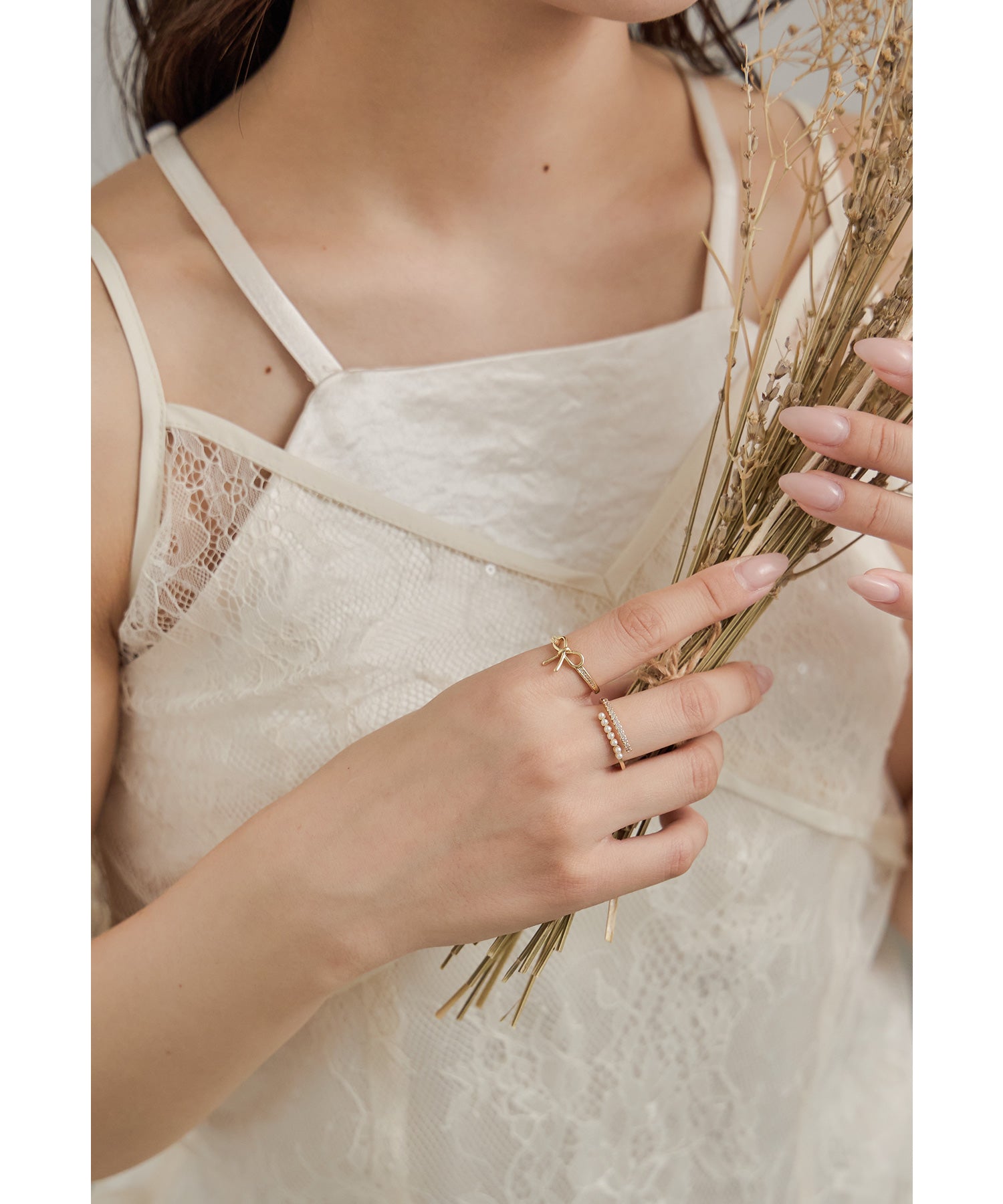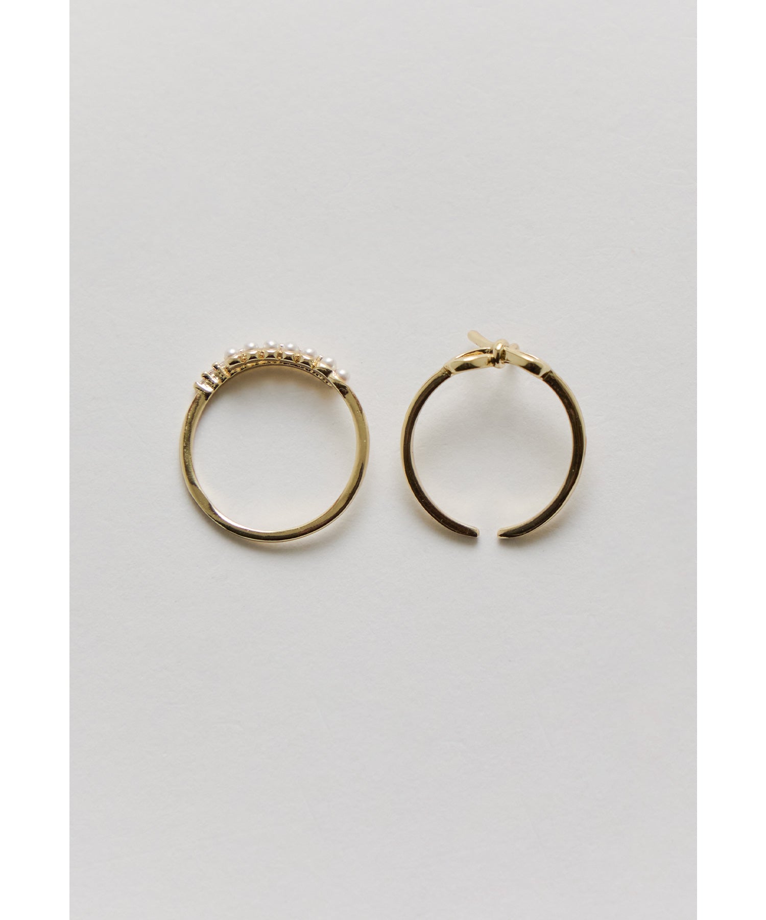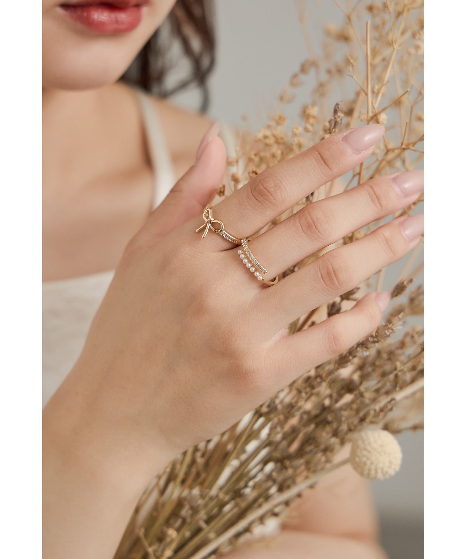 愛らしいリボンモチーフと華奢なパール×ビジューのリング2本セット。
