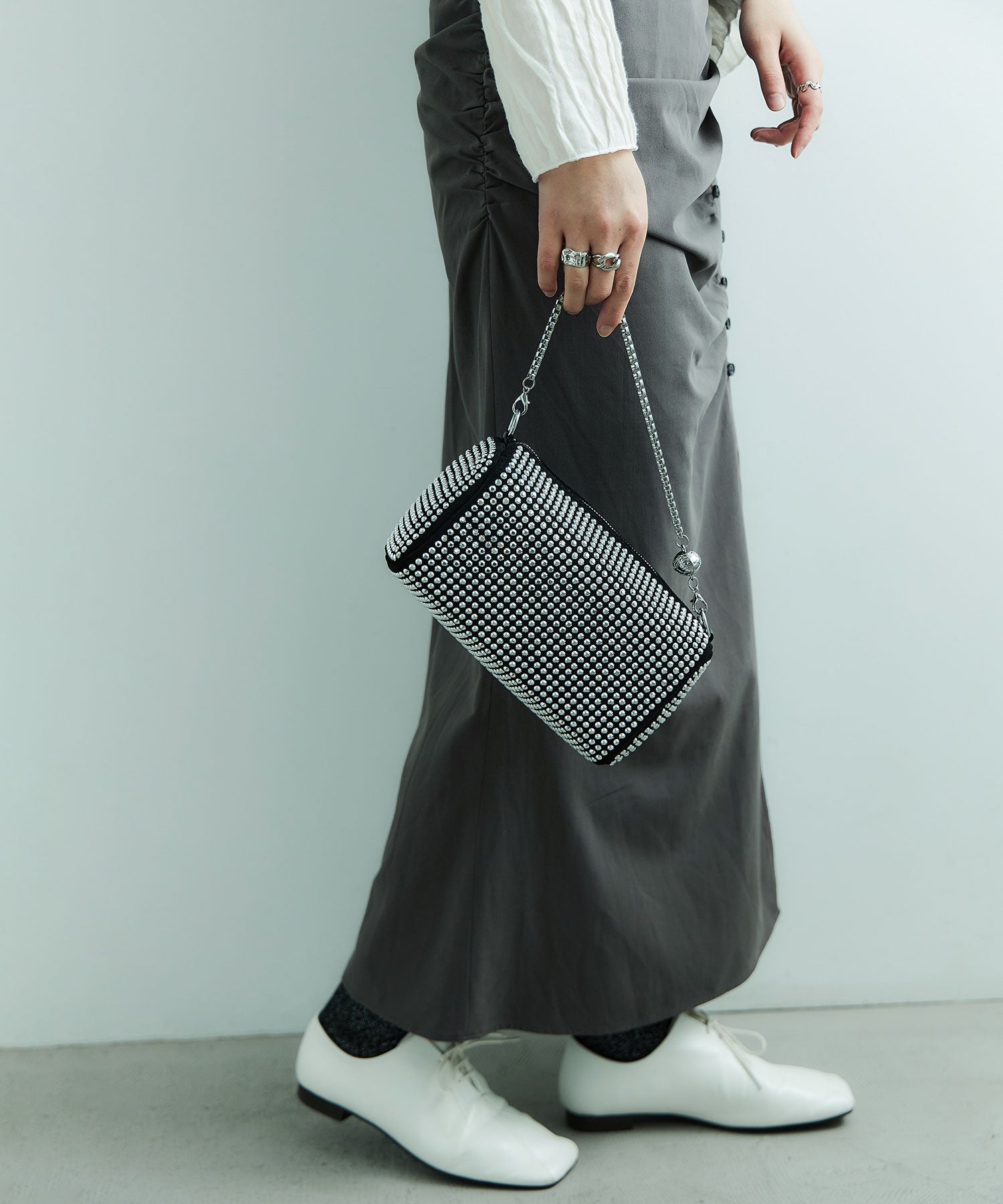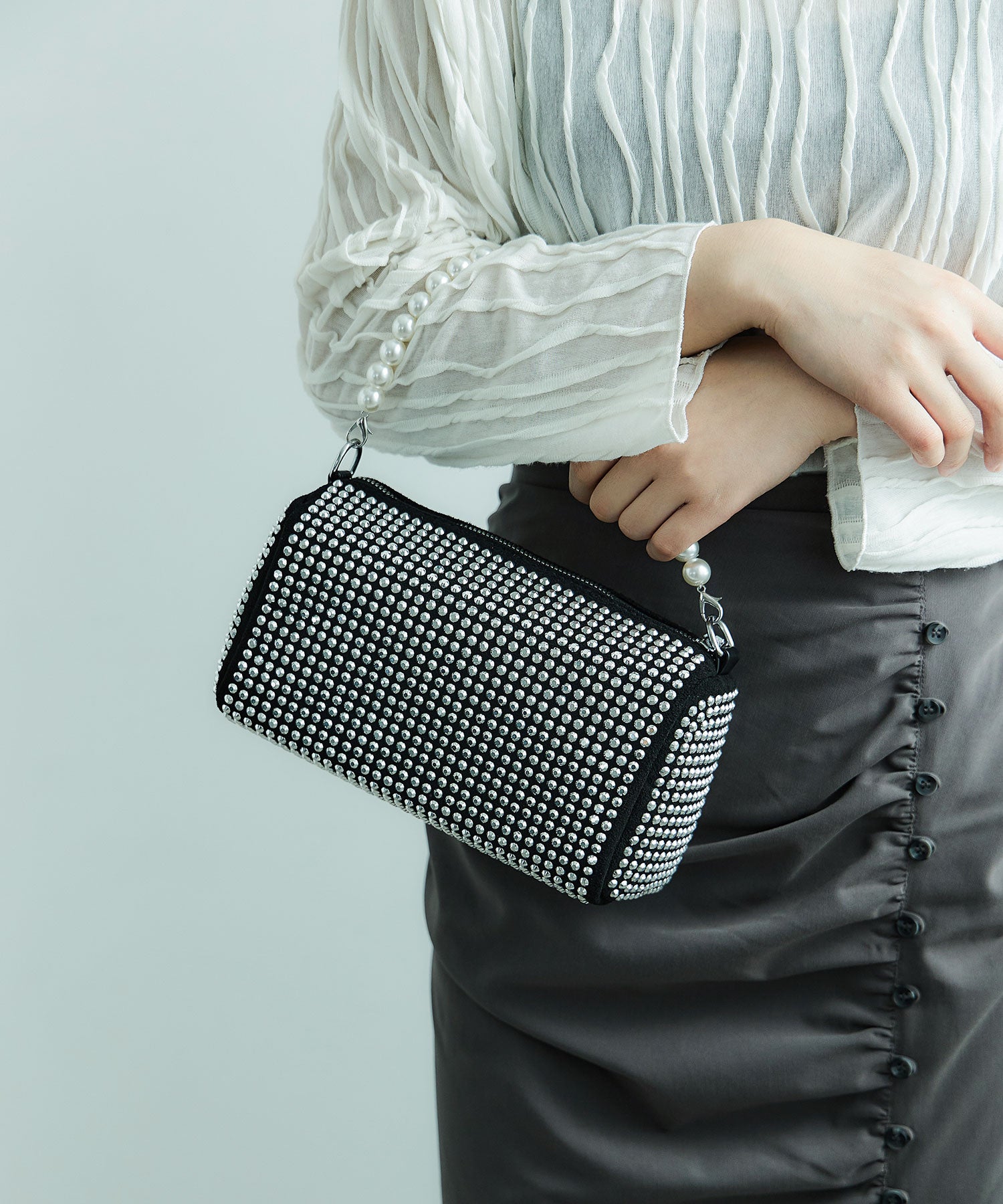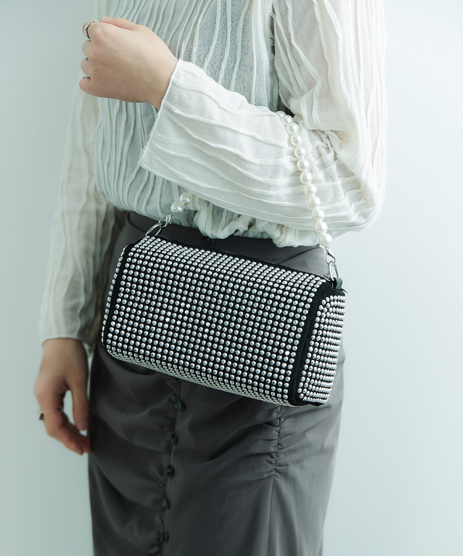 存在感あるアクセサリーのようなパールハンドルボストンバッグ。