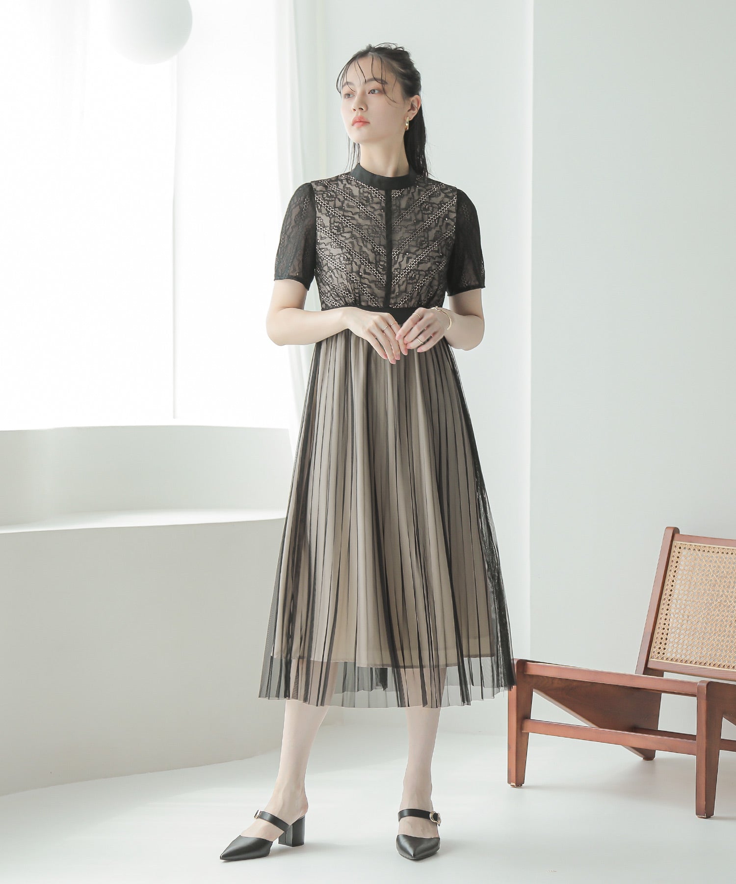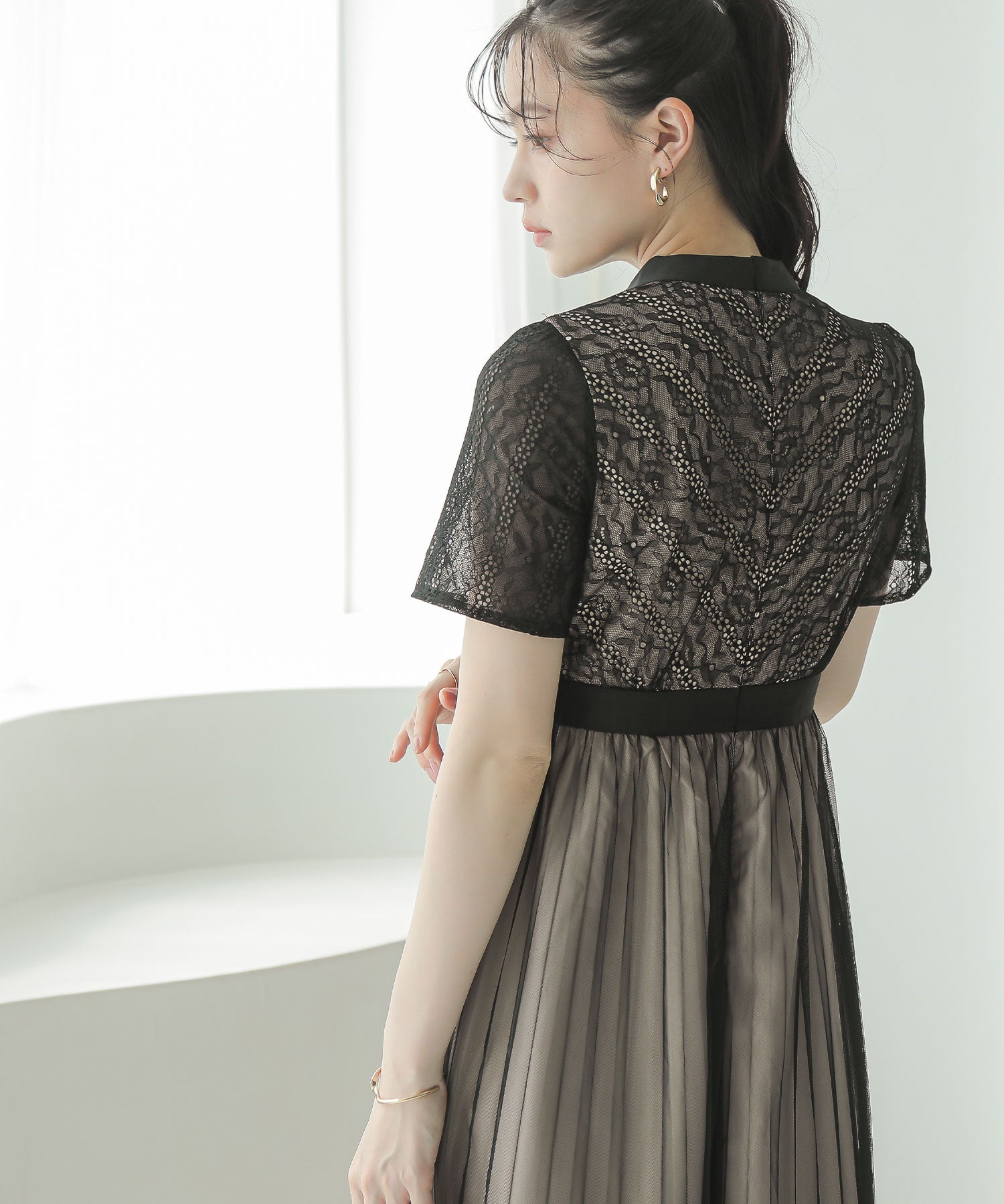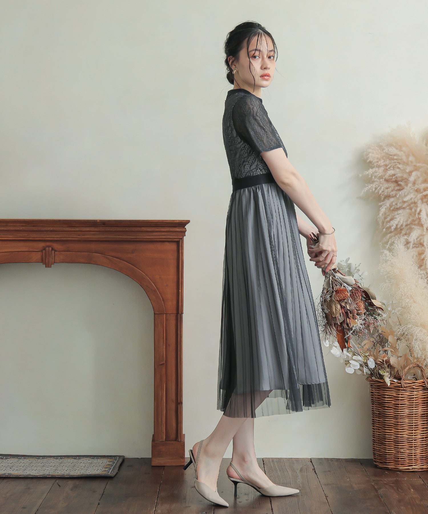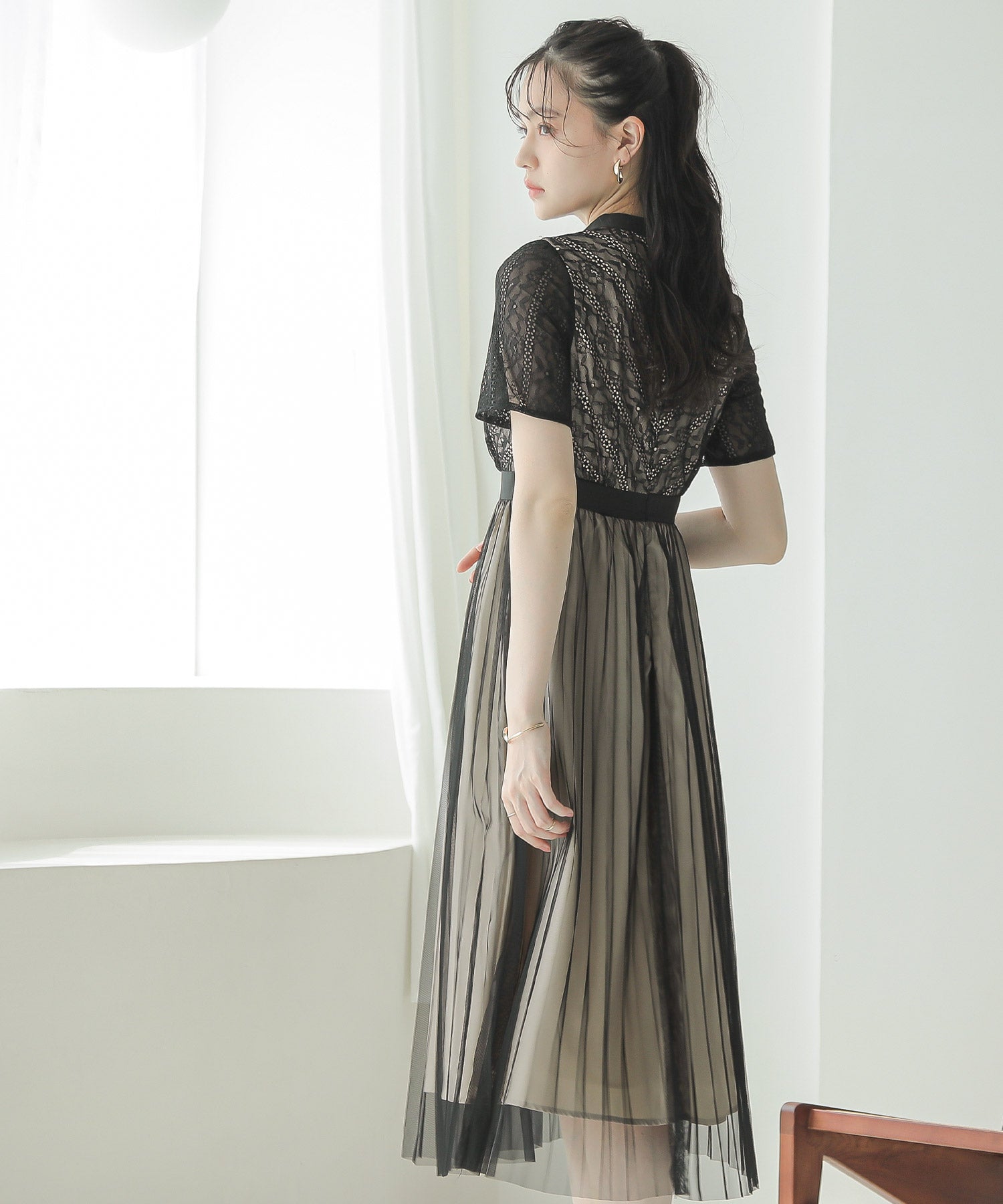 レースの透け感とチュールプリーツが上品なワンピースドレス。
